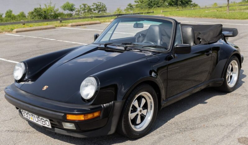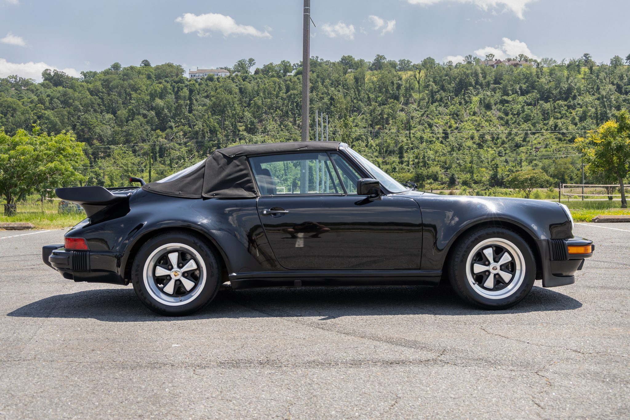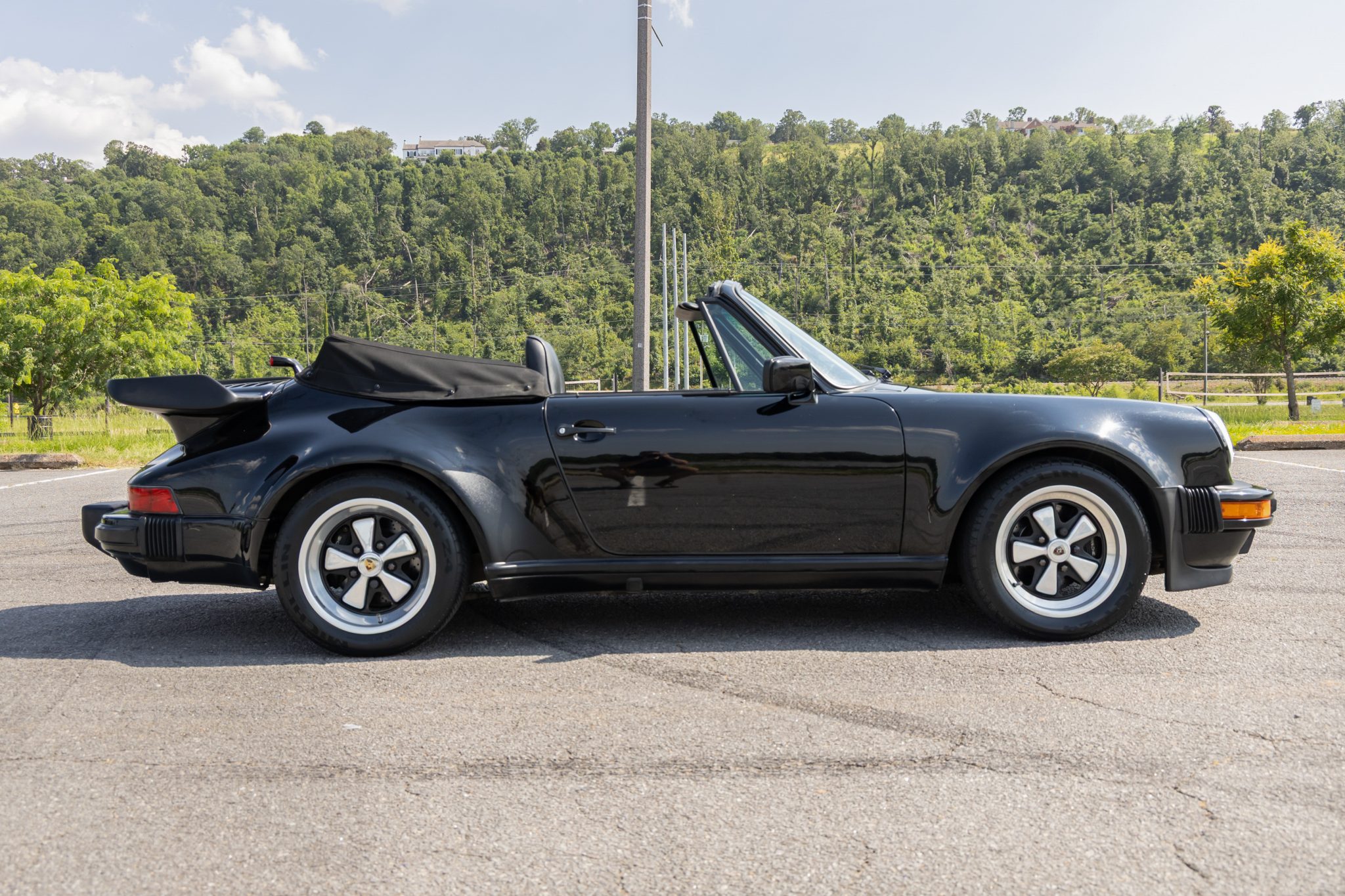 Powered by a turbocharged 3.3-liter flat-six paired with a four-speed manual transaxle, the car is finished in black over black leather upholstery. Equipment includes 16″ Fuchs alloy wheels, four-wheel cross-drilled and ventilated disc brakes, a limited-slip differential, a black soft top, power-adjustable seats, and a Blaupunkt cassette stereo.