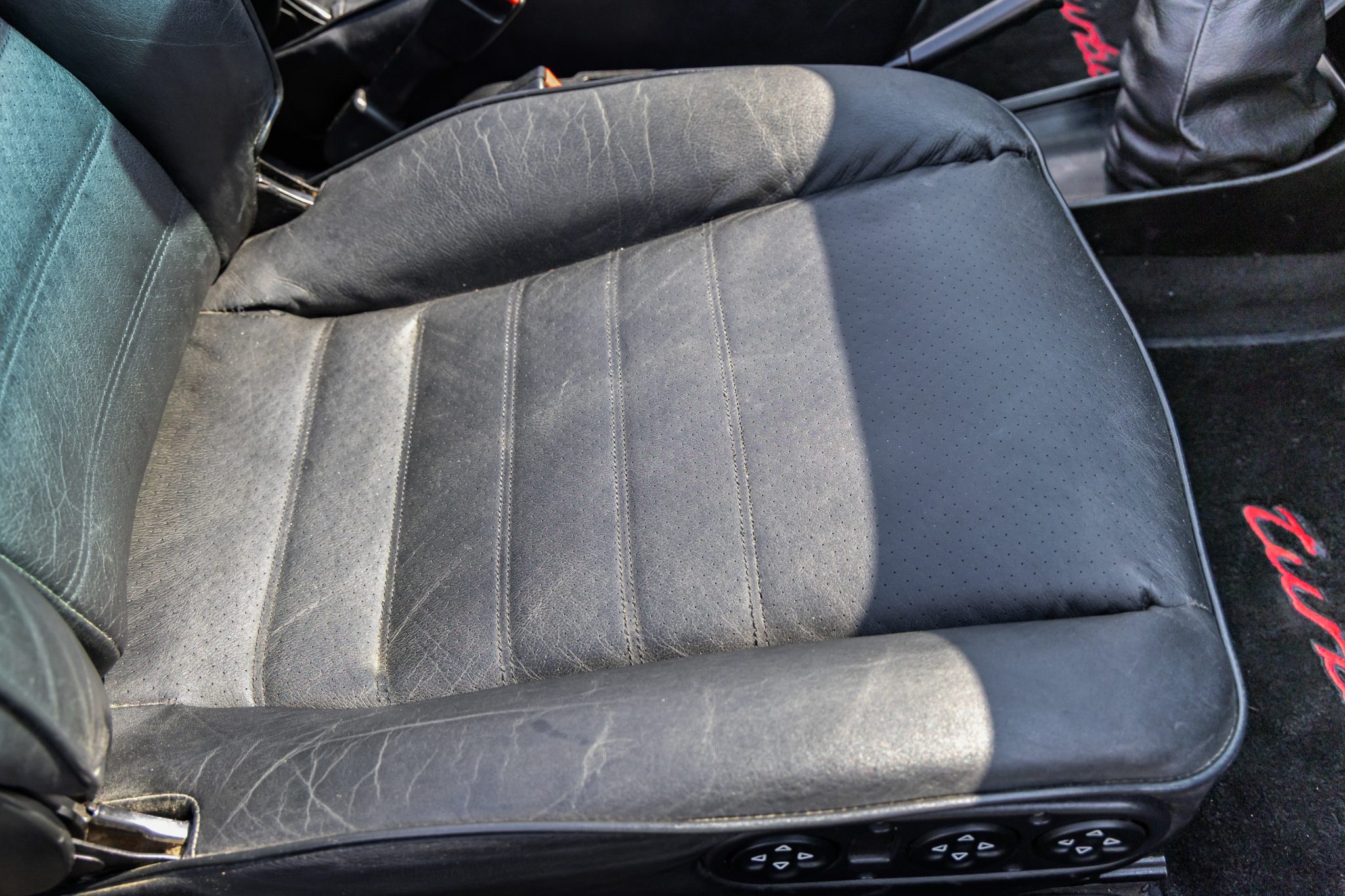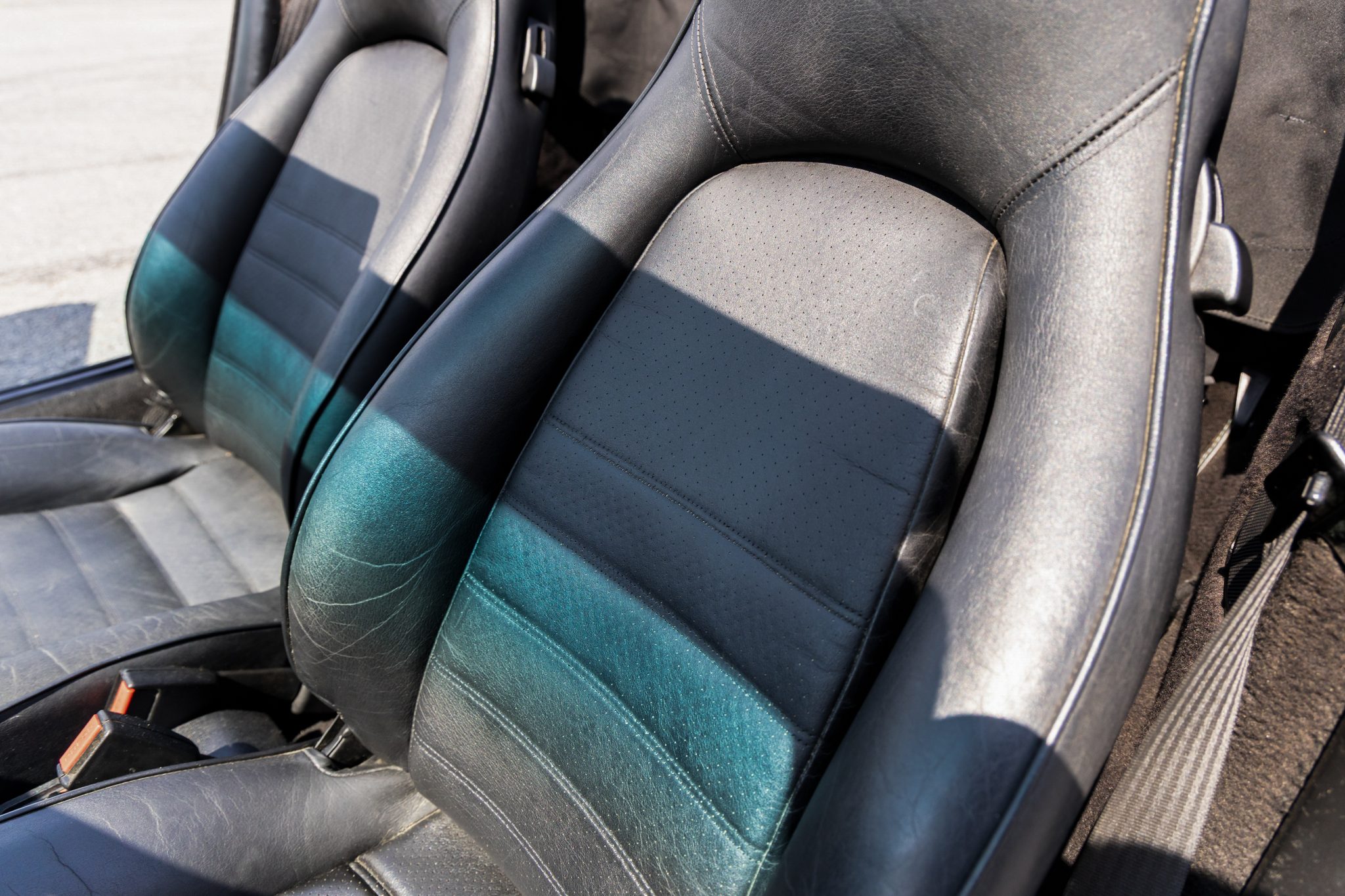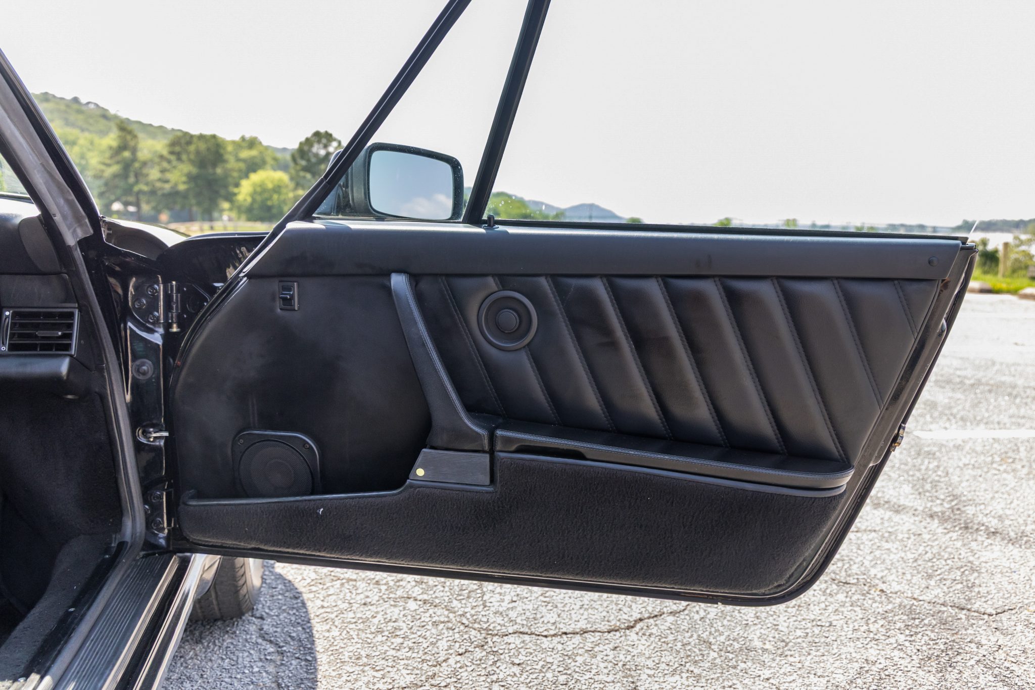 Powered by a turbocharged 3.3-liter flat-six paired with a four-speed manual transaxle, the car is finished in black over black leather upholstery. Equipment includes 16″ Fuchs alloy wheels, four-wheel cross-drilled and ventilated disc brakes, a limited-slip differential, a black soft top, power-adjustable seats, and a Blaupunkt cassette stereo.