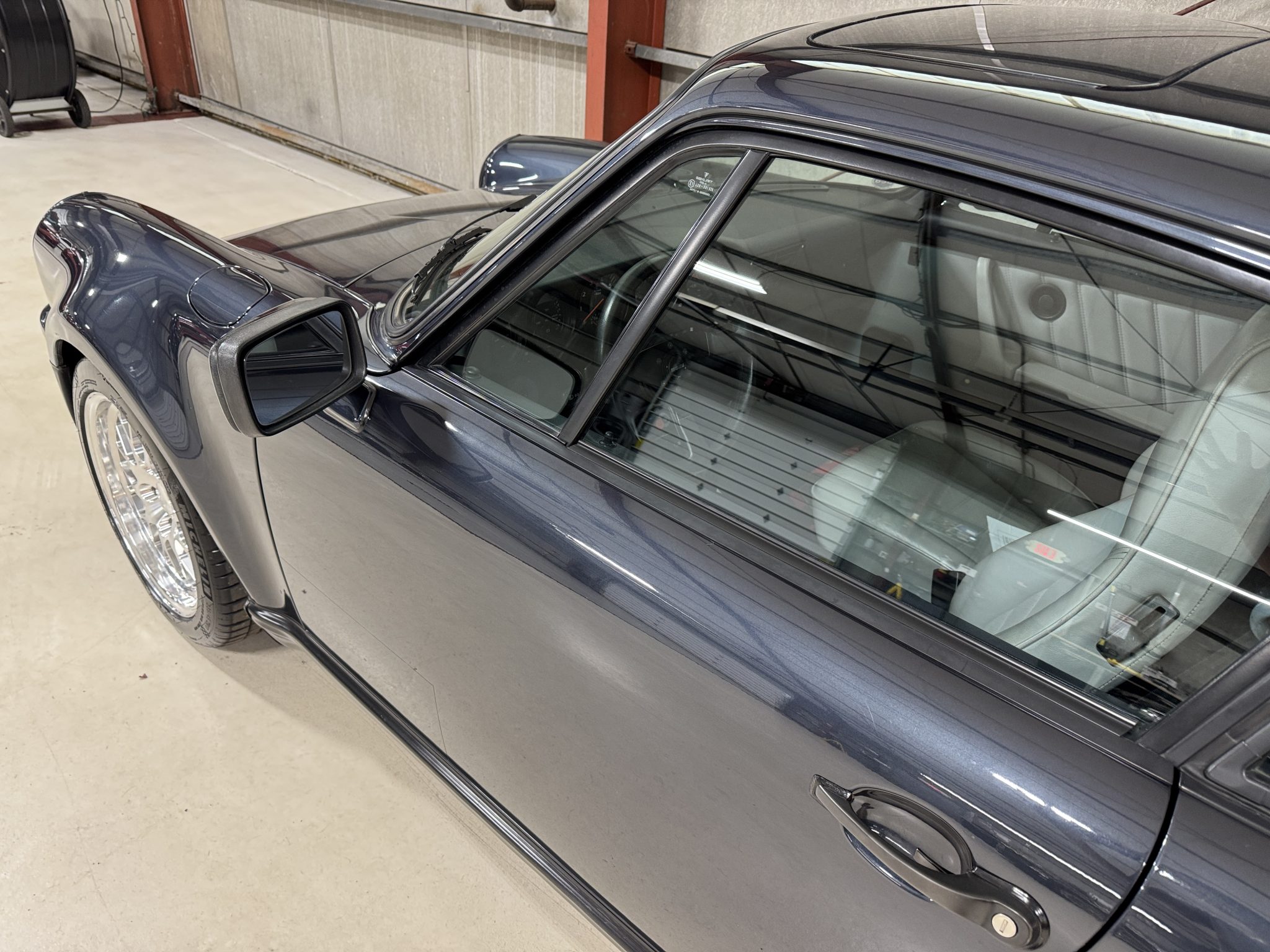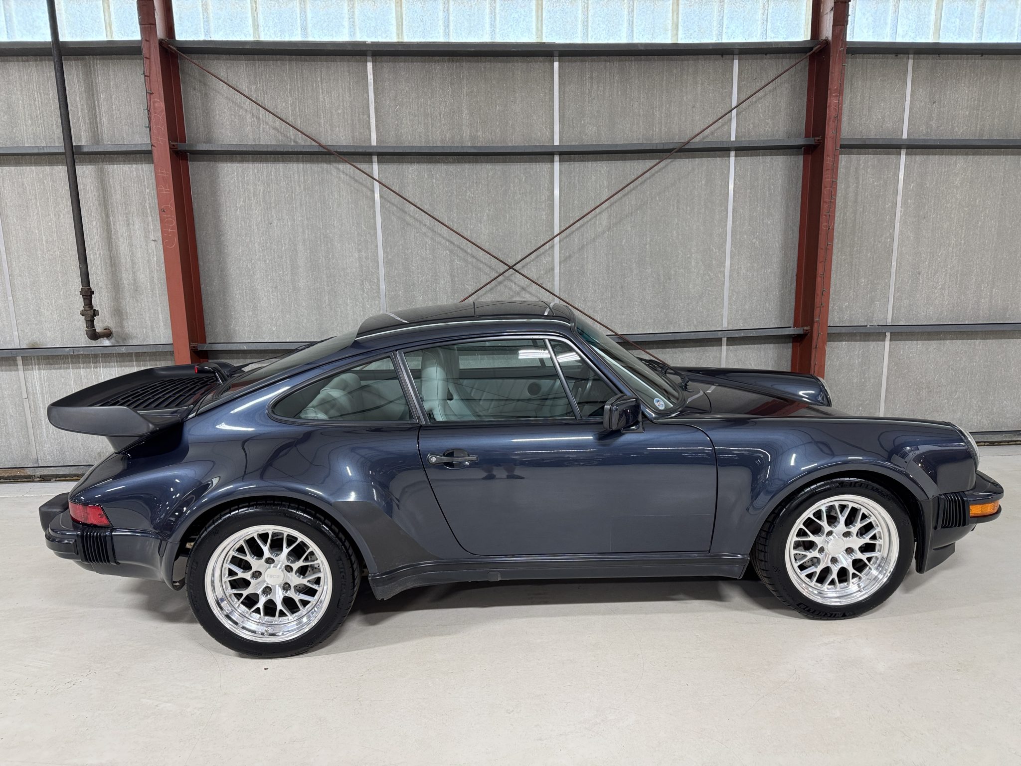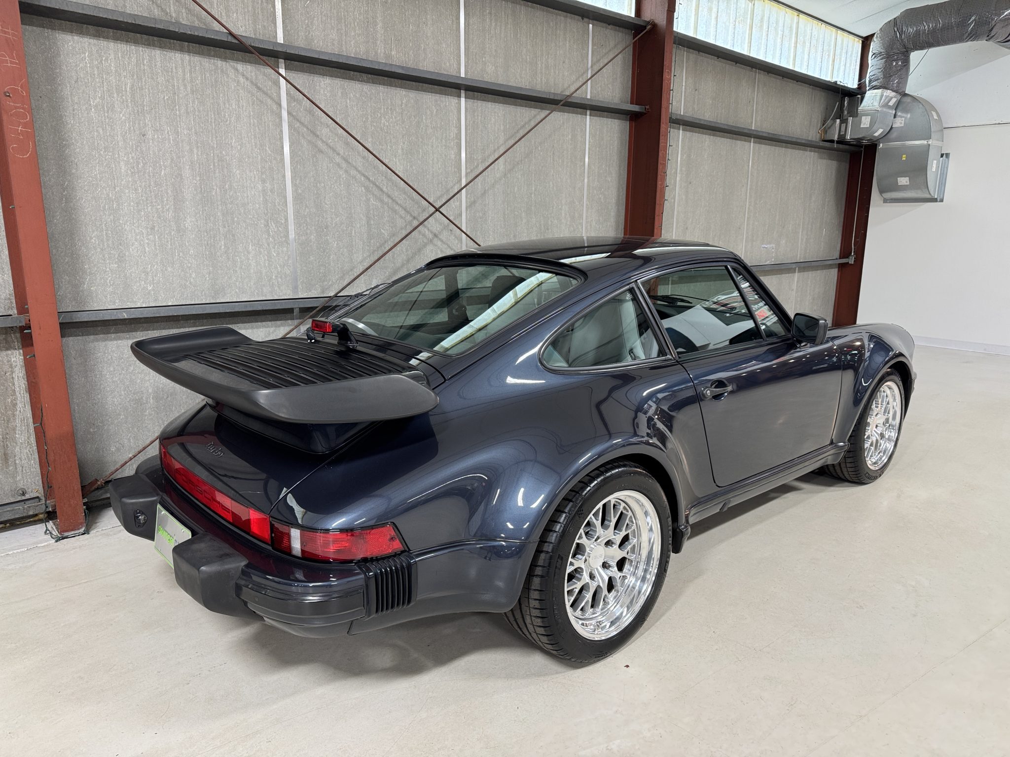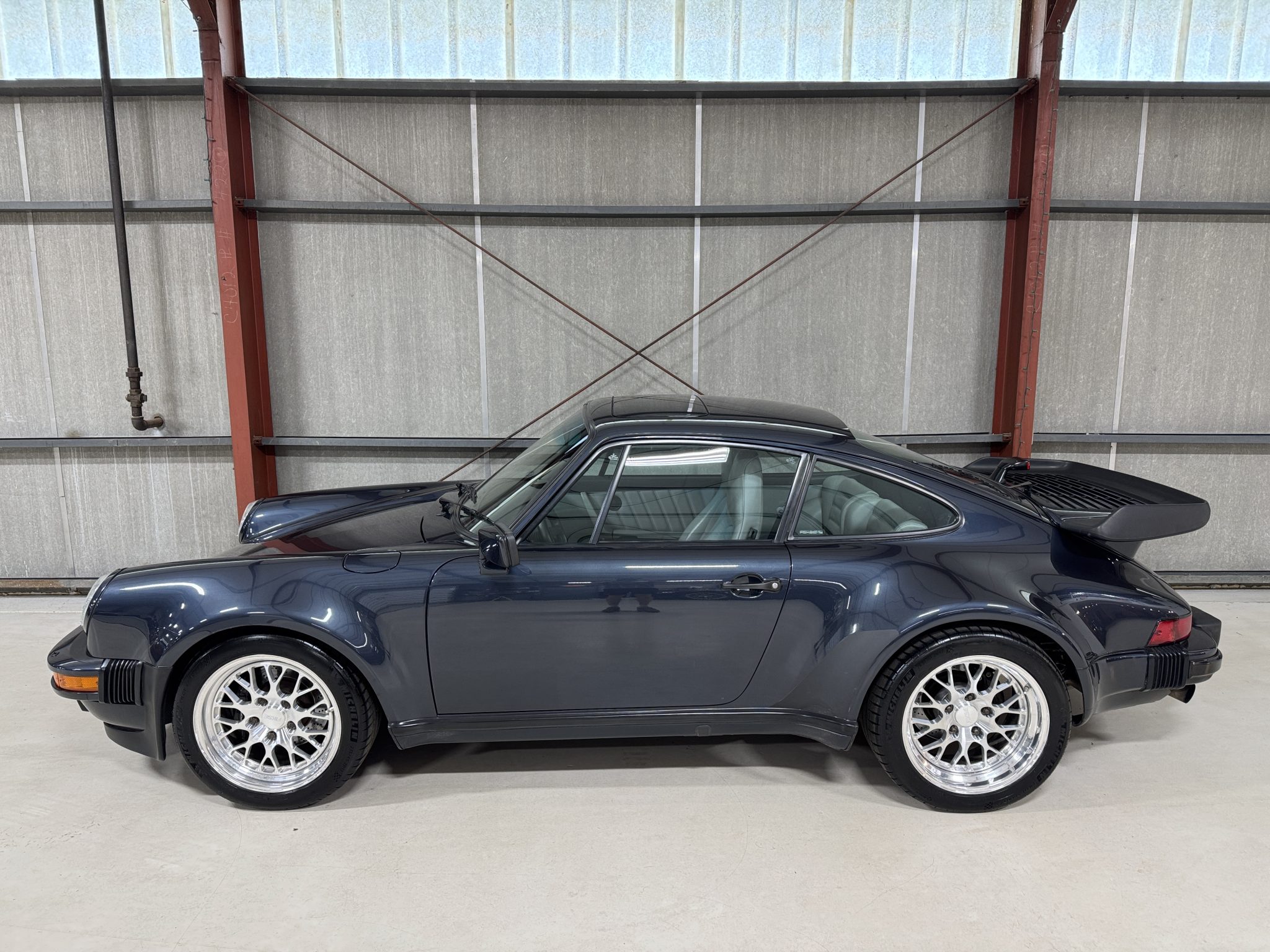 This 1987 Porsche 911 Turbo coupe is finished in metallic blue over gray leather upholstery and is powered by a turbocharged 3.3-liter flat-six that has been modified with a K27 turbocharger, an Andial fuel-enrichment system, and an aftermarket intercooler, airbox, exhaust, and camshafts. Shifting is through a four-speed manual transaxle with a WEVO shifter, and further equipment includes a limited-slip differential, revised suspension components, and staggered-width 17” Fikse wheels along with a sunroof, a tea tray rear spoiler, a MOMO steering wheel, a Blaupunkt cassette stereo, and power-adjustable front seats.
