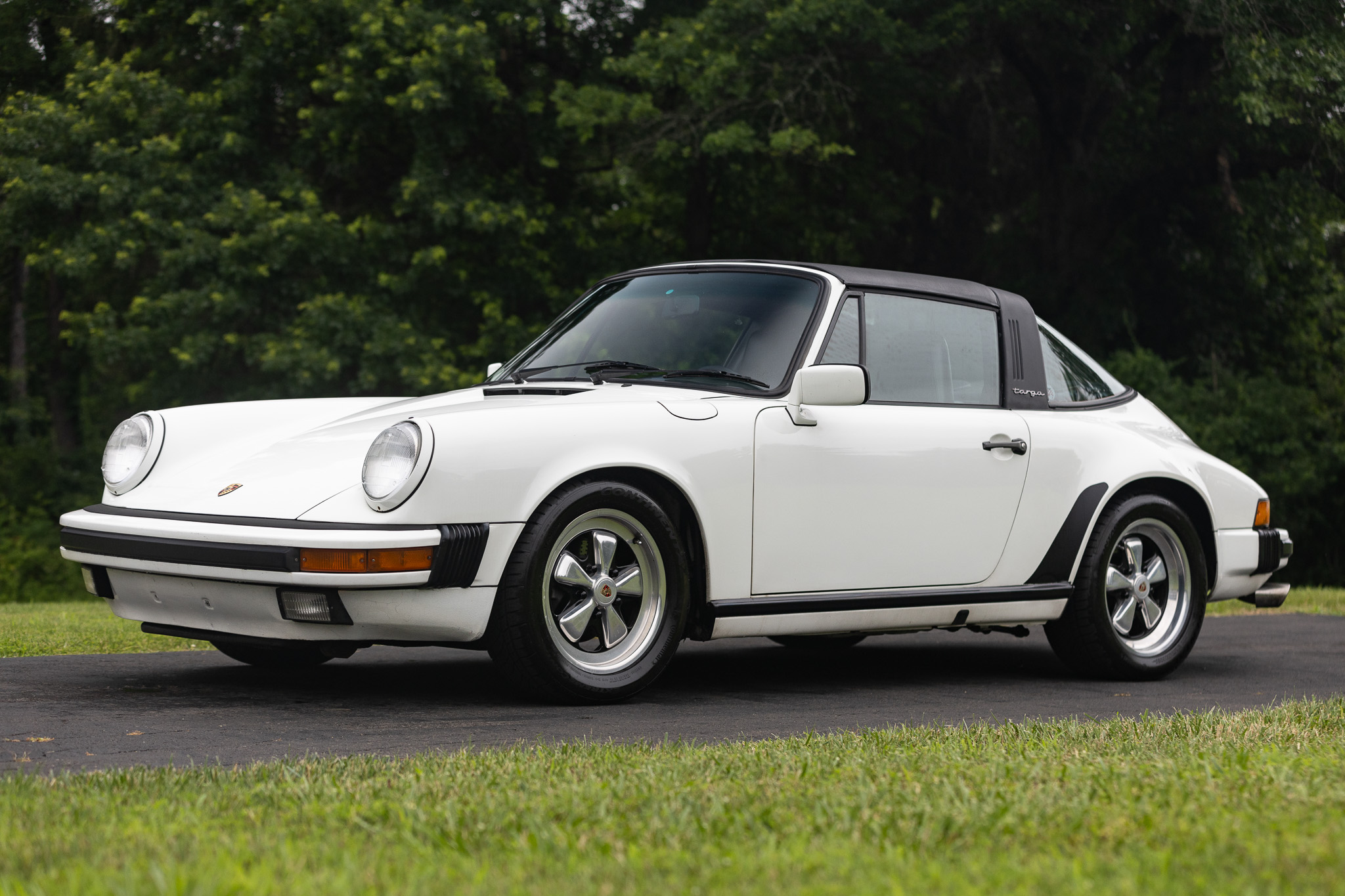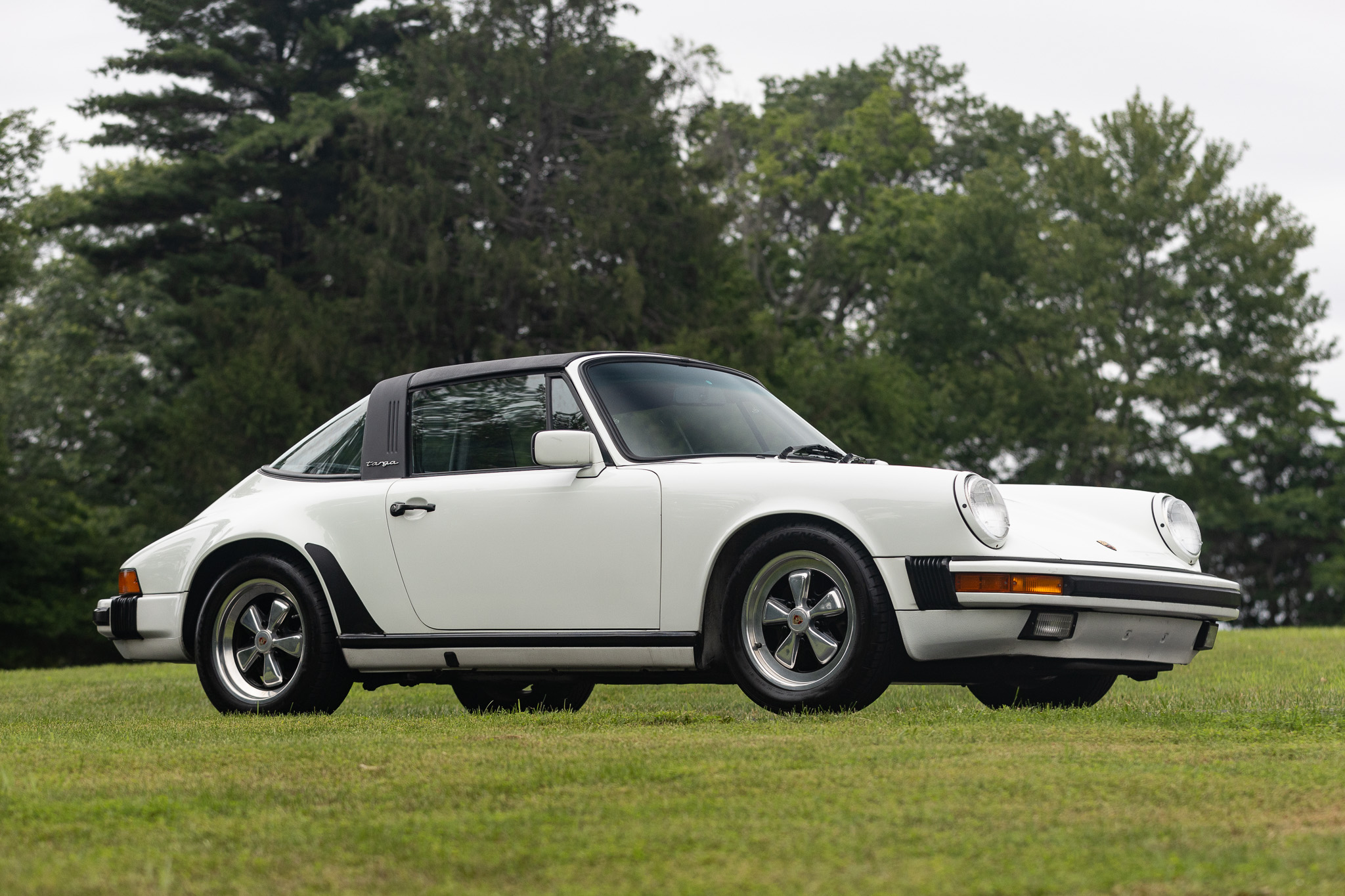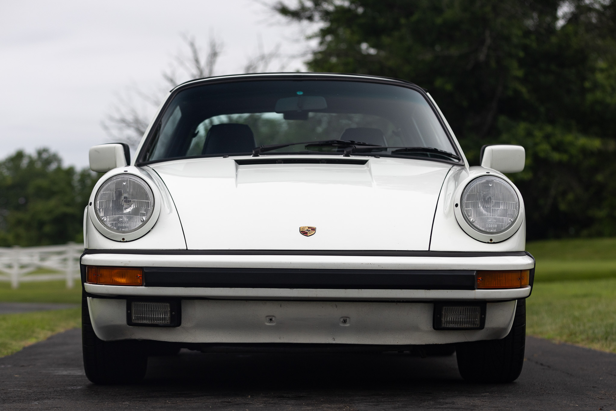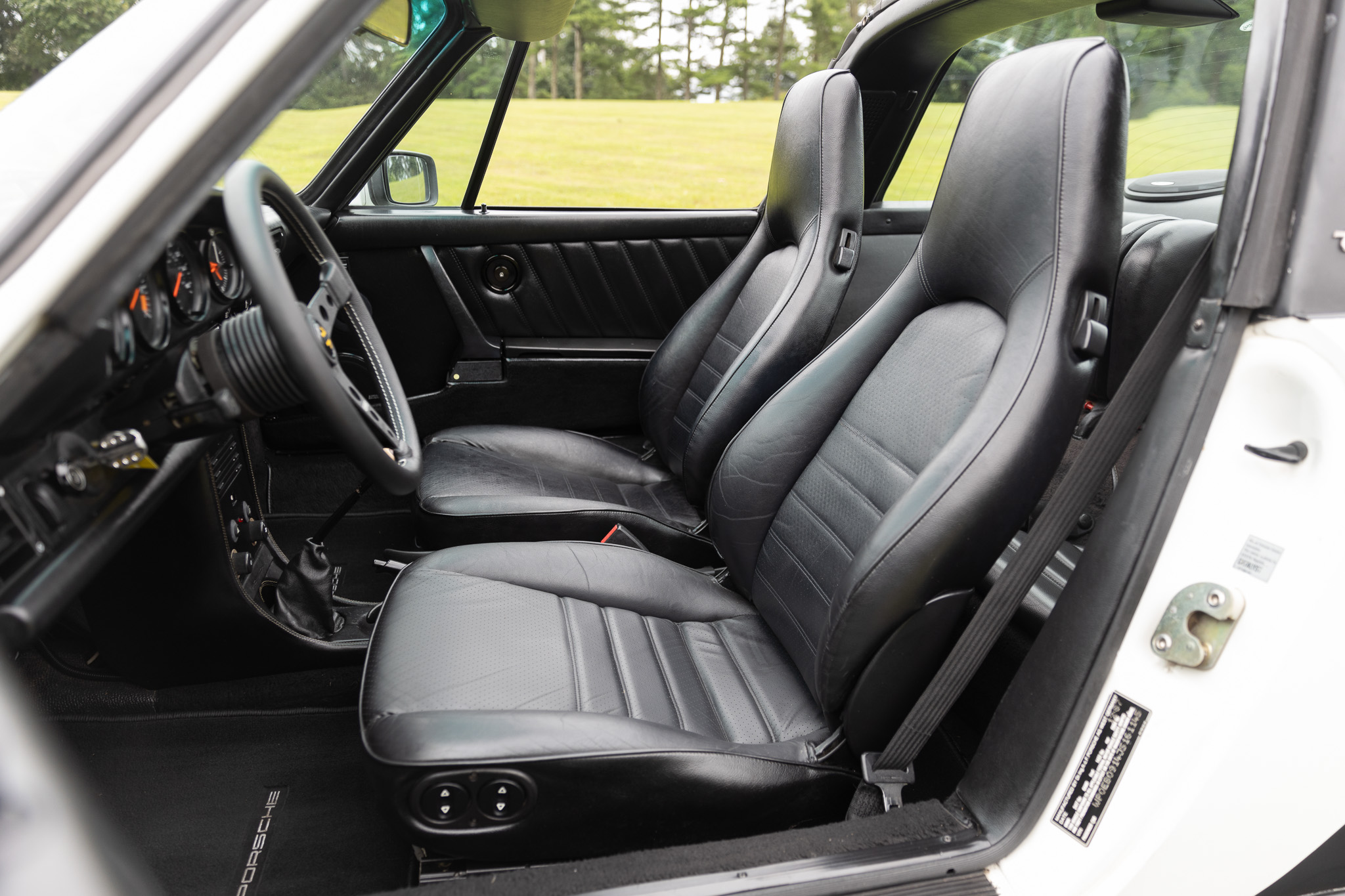 This 1988 Porsche 911 Carrera Targa is finished in Grand Prix White over black leather and is powered by a 3.2-liter flat-six paired with a G50 five-speed manual transaxle. It features a Steve Wong ECU chip, a Fabspeed exhaust, and a cat-bypass pipe along with a lowered suspension, 16” Fuchs wheels, and drilled brake rotors. Additional equipment includes a MOMO Prototipo steering wheel, a wood shift knob, metal pedals, and a Porsche Classic stereo linked to aftermarket speakers.