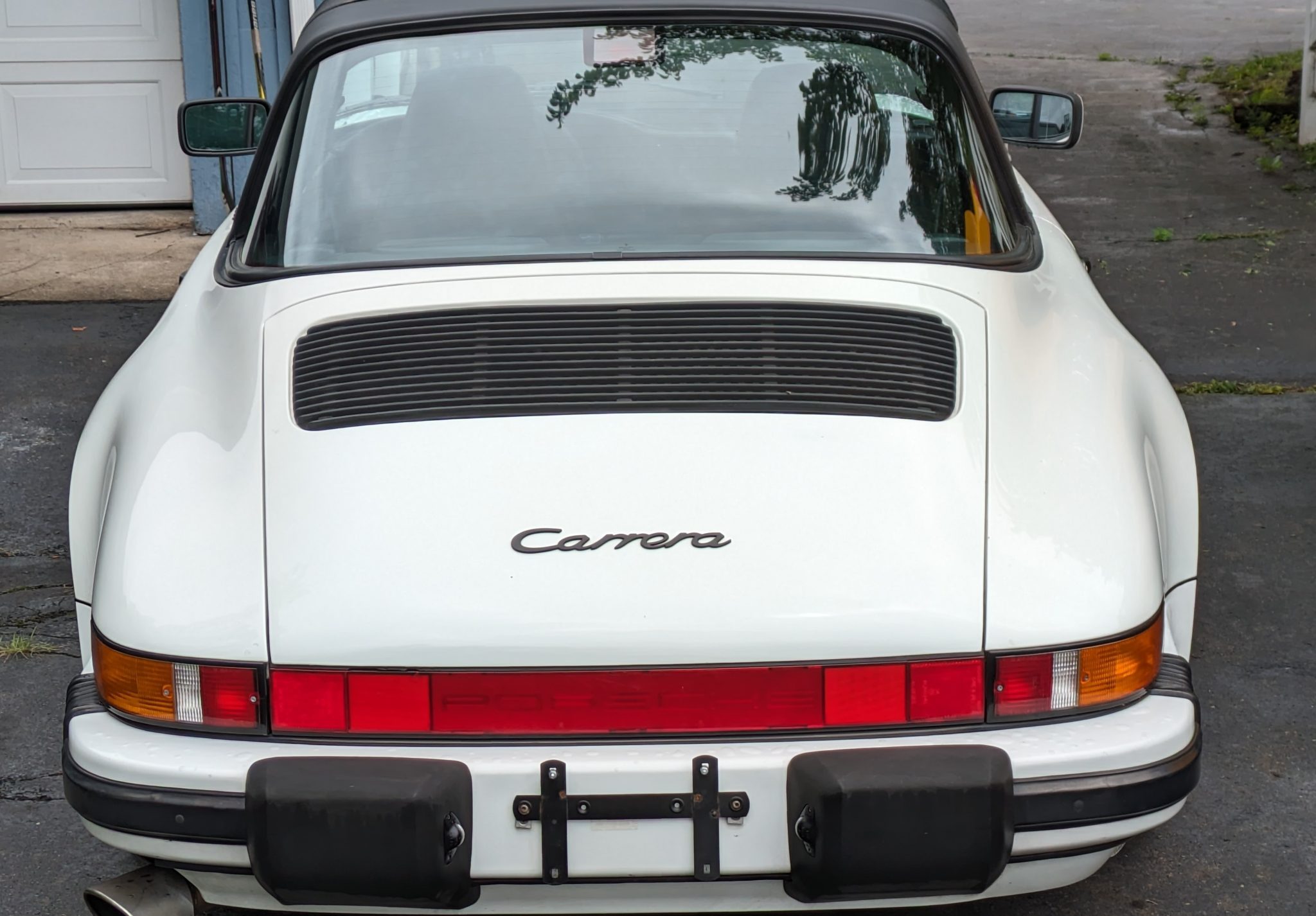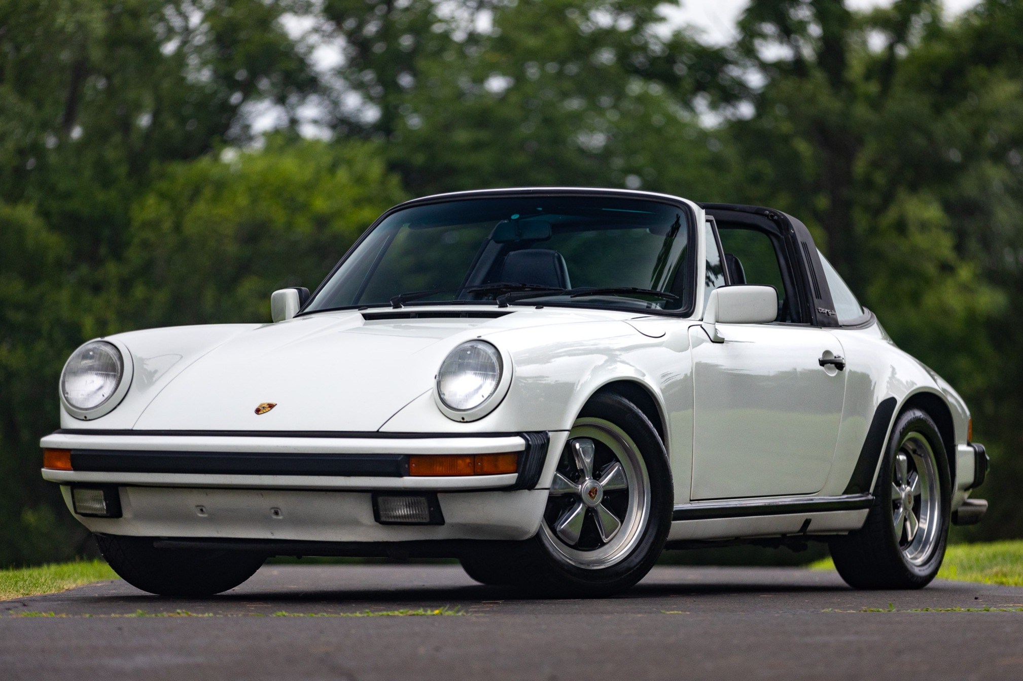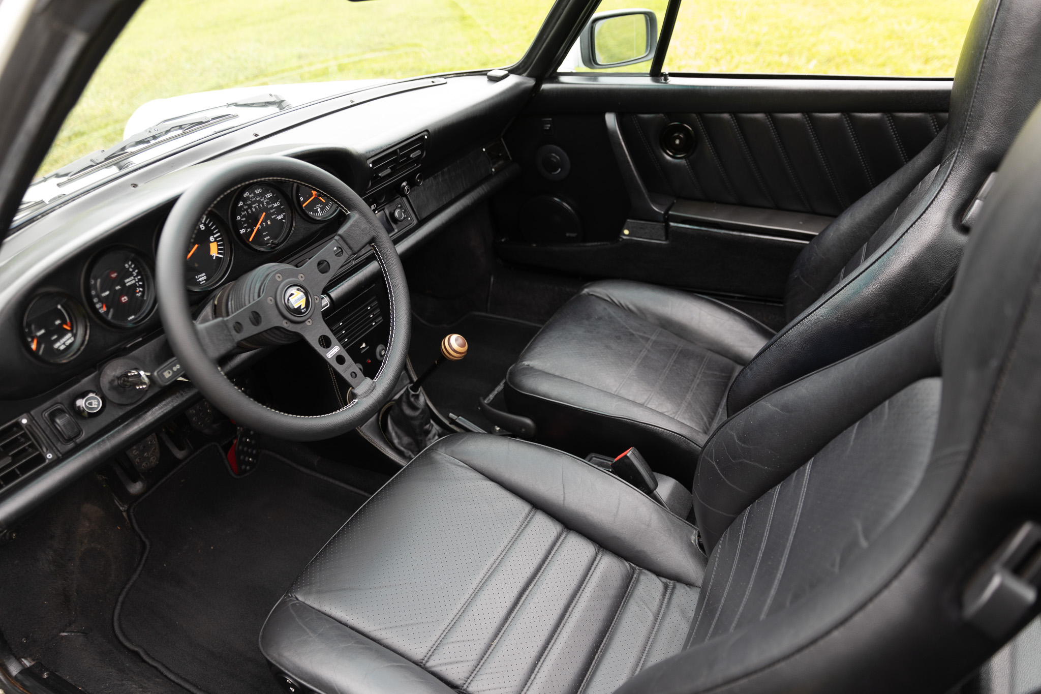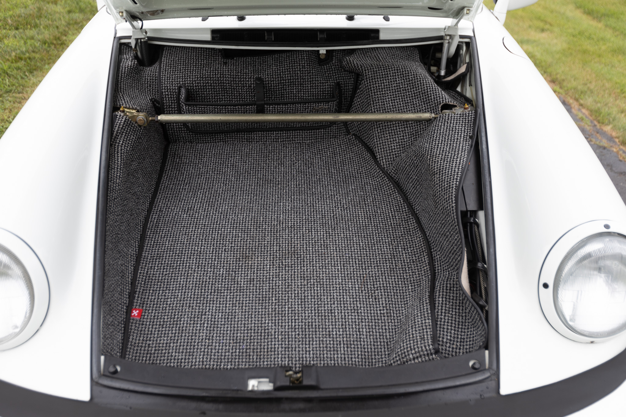 This 1988 Porsche 911 Carrera Targa is finished in Grand Prix White over black leather and is powered by a 3.2-liter flat-six paired with a G50 five-speed manual transaxle. It features a Steve Wong ECU chip, a Fabspeed exhaust, and a cat-bypass pipe along with a lowered suspension, 16” Fuchs wheels, and drilled brake rotors. Additional equipment includes a MOMO Prototipo steering wheel, a wood shift knob, metal pedals, and a Porsche Classic stereo linked to aftermarket speakers.