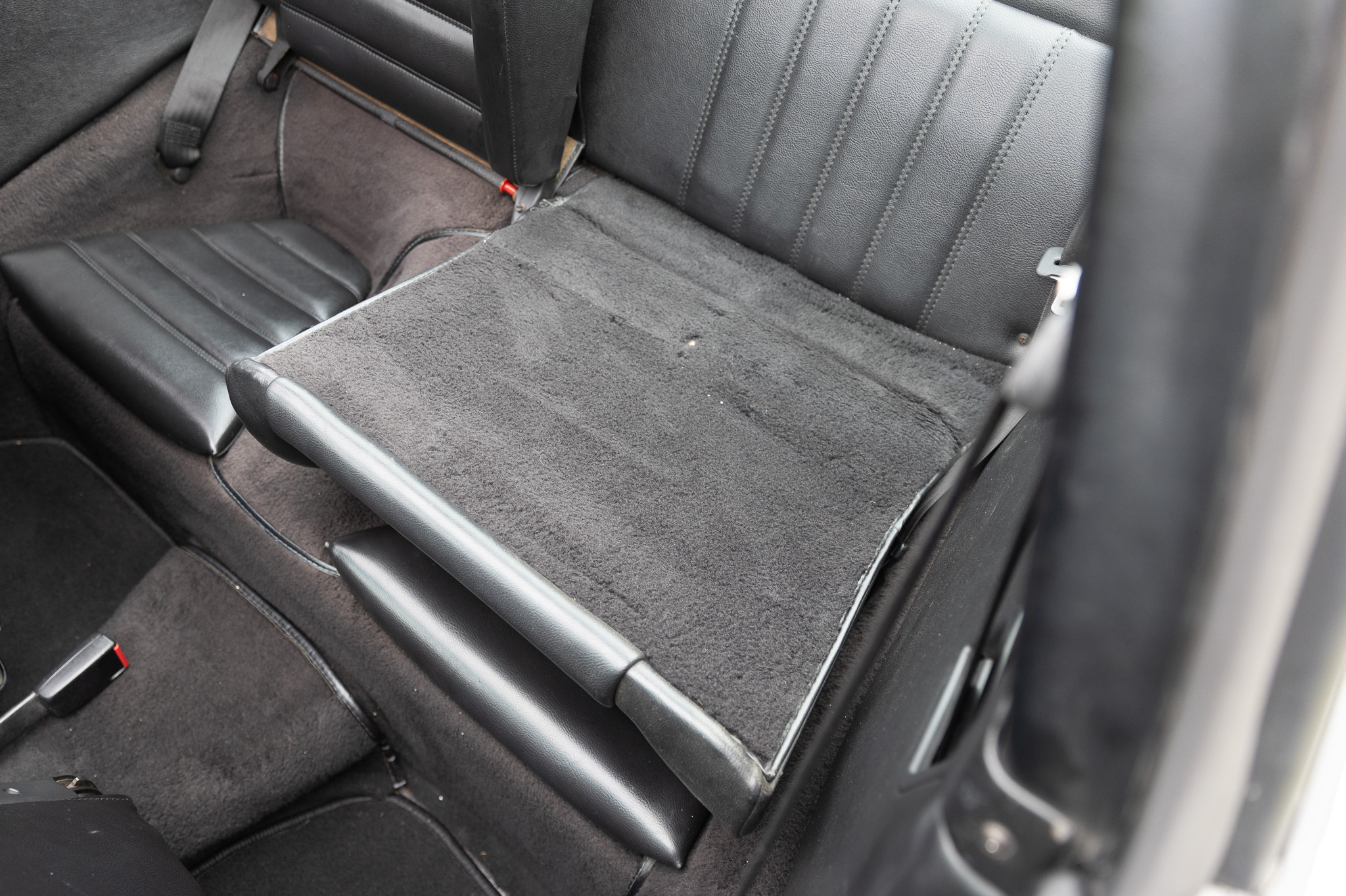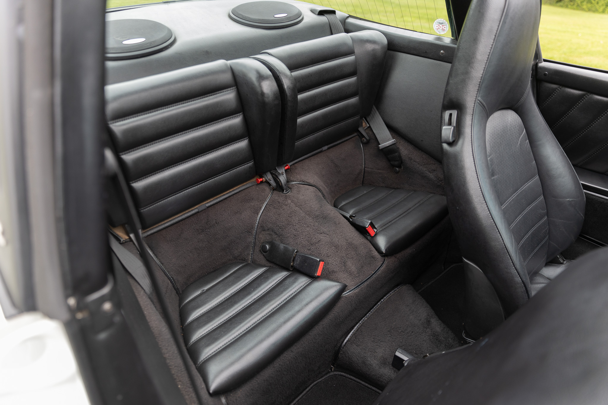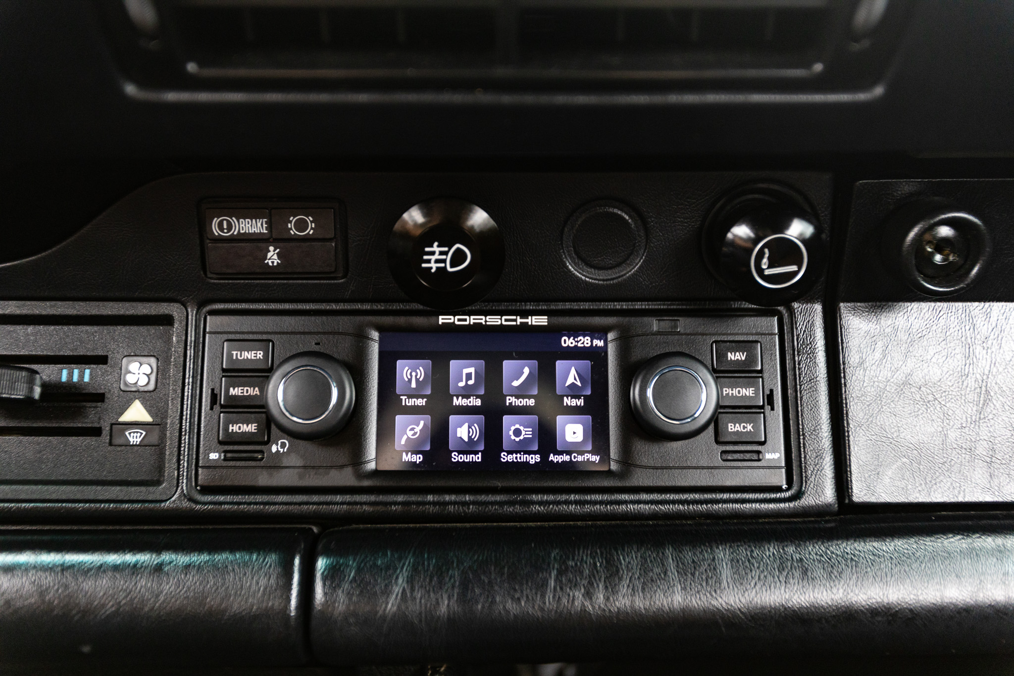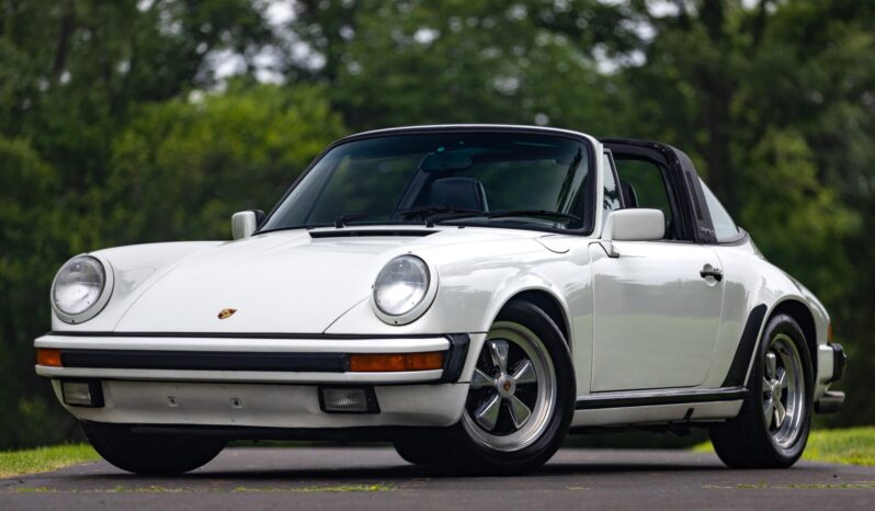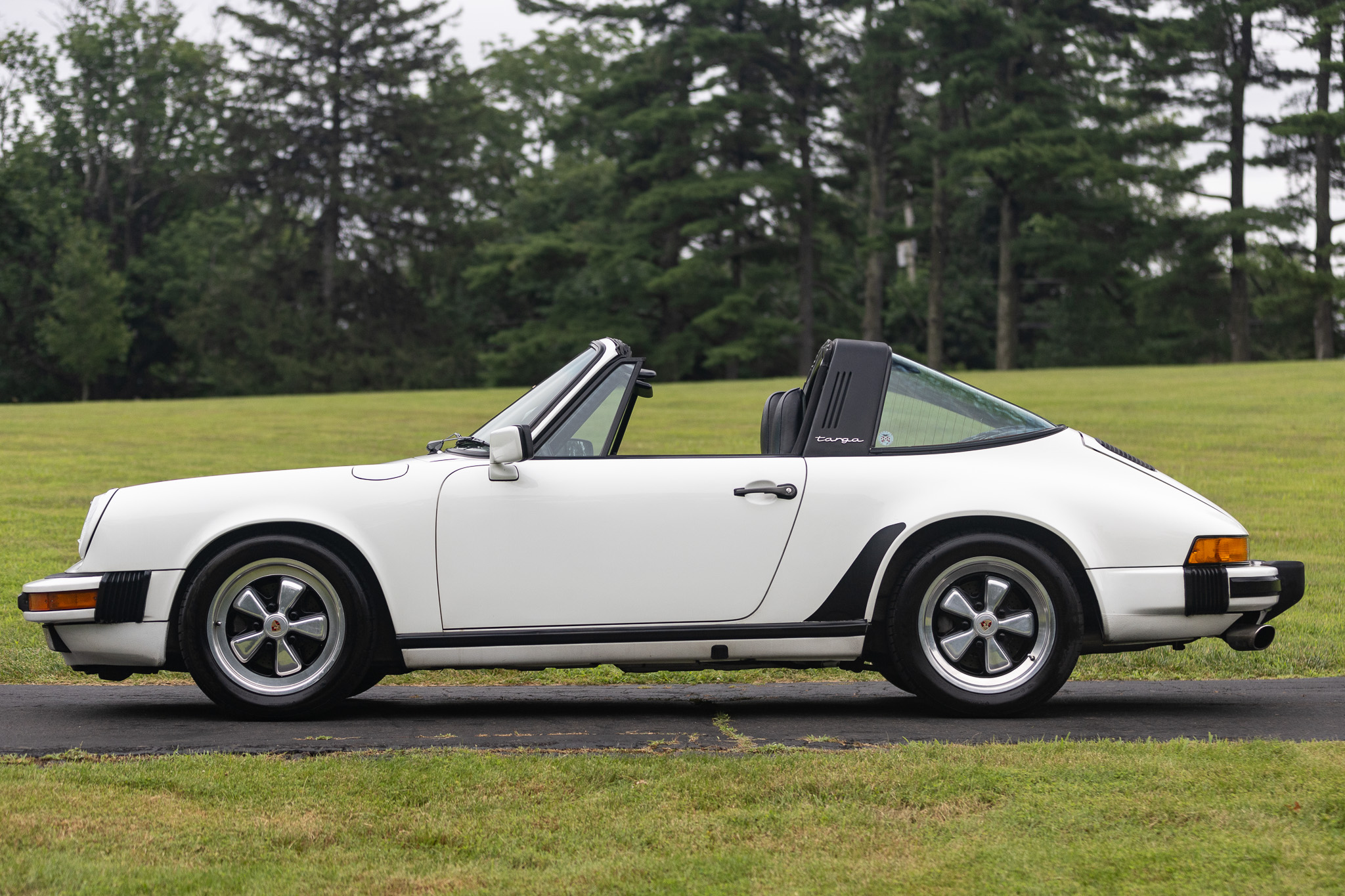 This 1988 Porsche 911 Carrera Targa is finished in Grand Prix White over black leather and is powered by a 3.2-liter flat-six paired with a G50 five-speed manual transaxle. It features a Steve Wong ECU chip, a Fabspeed exhaust, and a cat-bypass pipe along with a lowered suspension, 16” Fuchs wheels, and drilled brake rotors. Additional equipment includes a MOMO Prototipo steering wheel, a wood shift knob, metal pedals, and a Porsche Classic stereo linked to aftermarket speakers.