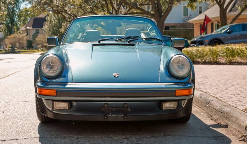 Power is from a turbocharged 3.3-liter flat-six paired with a five-speed G50 manual transaxle and a limited-slip differential, and equipment includes a tea-tray rear spoiler, a black soft top, 16″ BBS wheels, four-wheel cross-drilled and ventilated disc brakes, a Linen leather interior, heated front seats, an Alpine-Porsche CD-2 radio, a JVC compact-disc changer, and air conditioning. This 930 Turbo cabriolet shows 50k miles