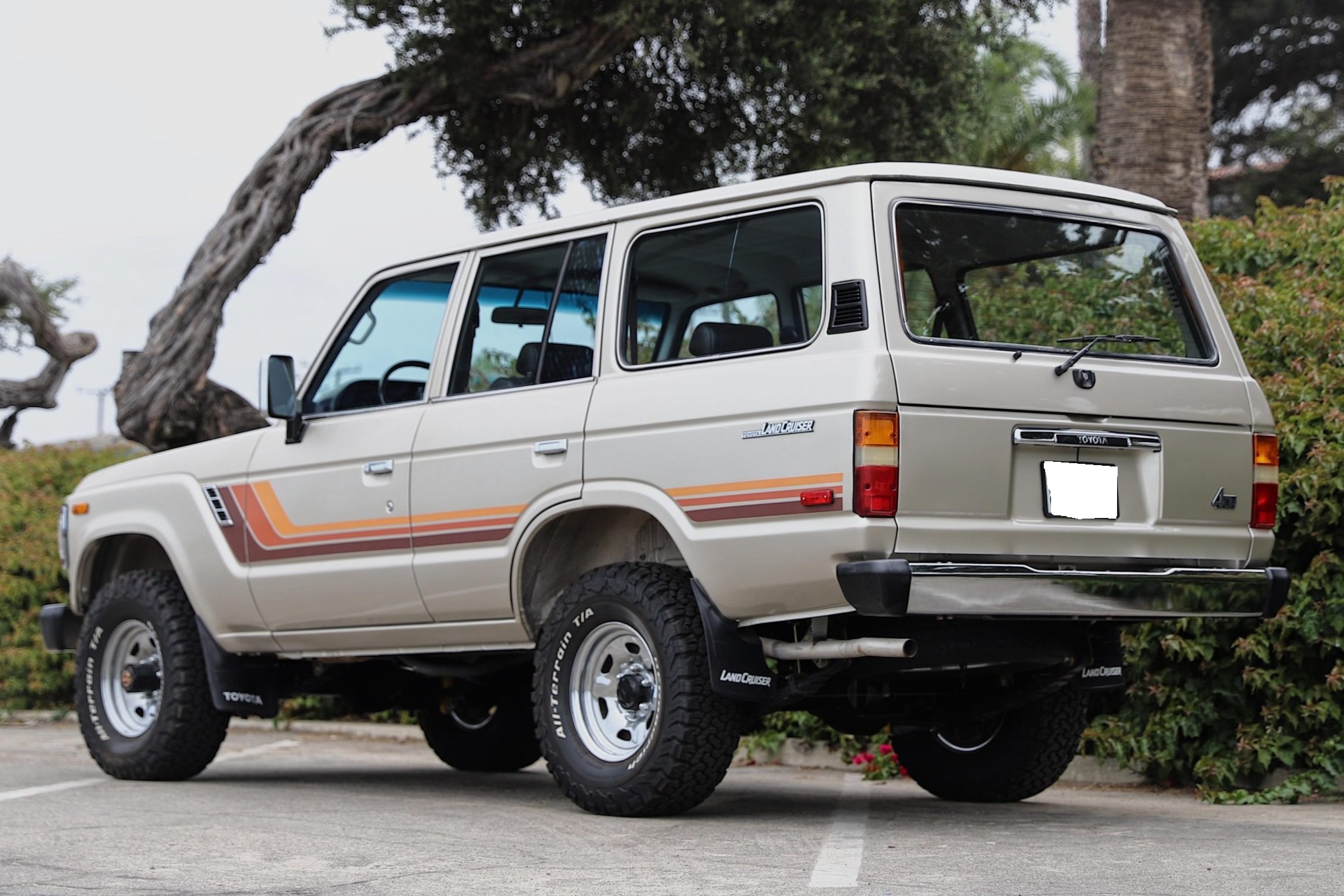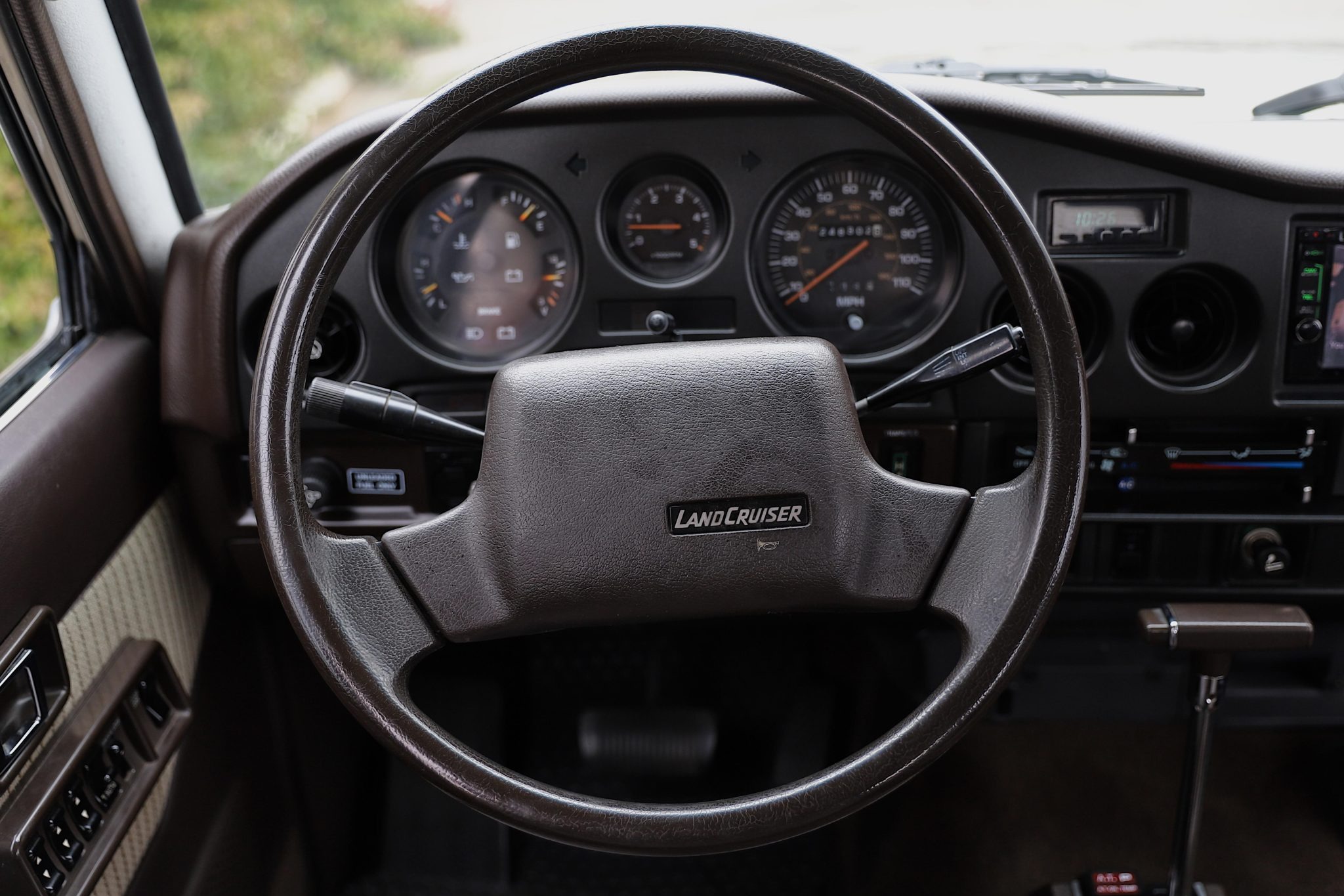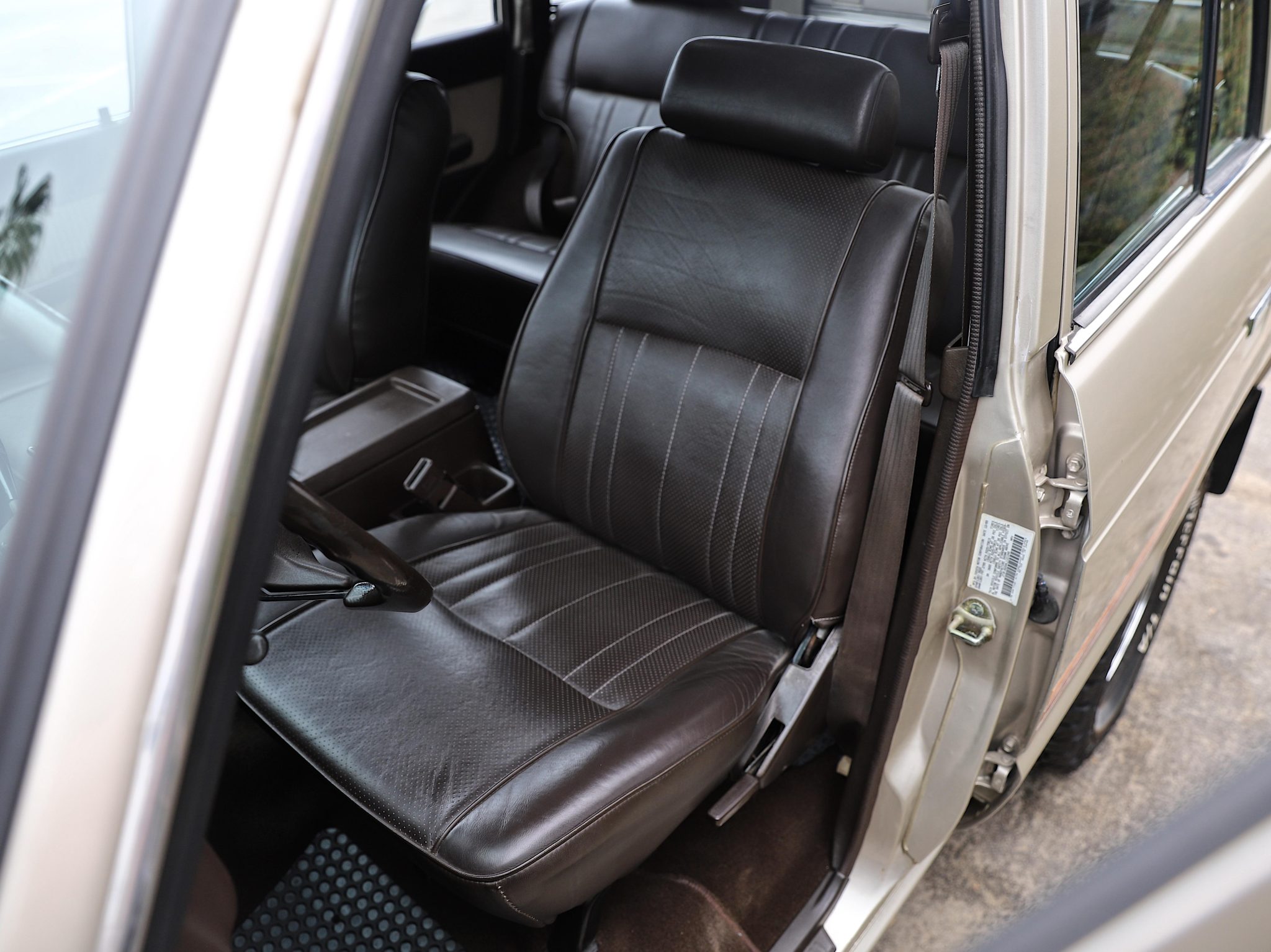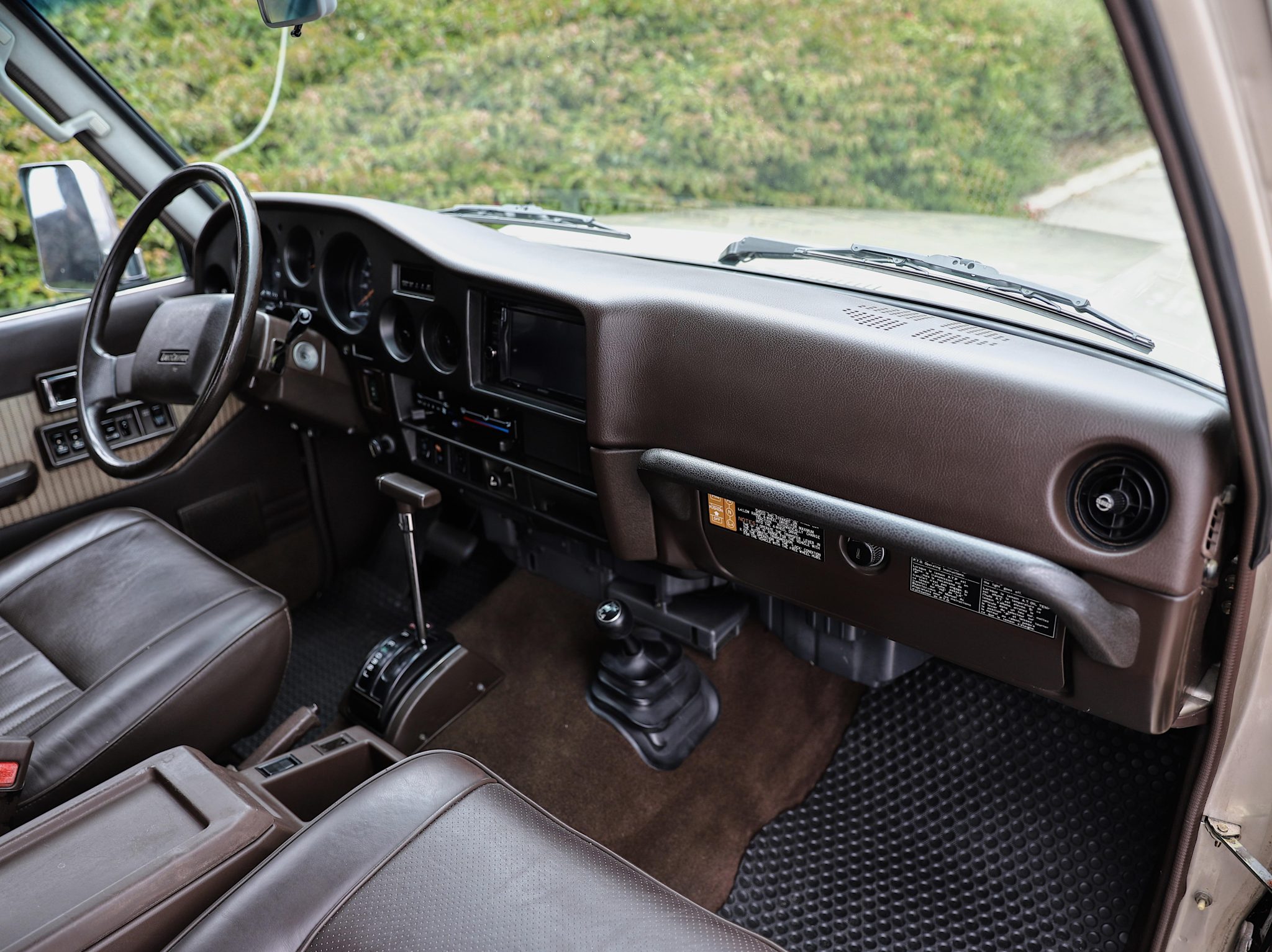 Finished in Beige Metallic over brown upholstery, the truck is powered by a 4.0L 3F-E inline-six linked with a four-speed automatic transmission and a two-speed transfer case. Equipment includes electronic fuel injection, power steering, manually locking front hubs, an Old Man Emu 2″ suspension lift, front disc brakes, 15″ steel wheels, 31″ BFGoodrich tires, chrome bumpers, air conditioning, power windows, a rearview camera, and Kenwood touchscreen infotainment.