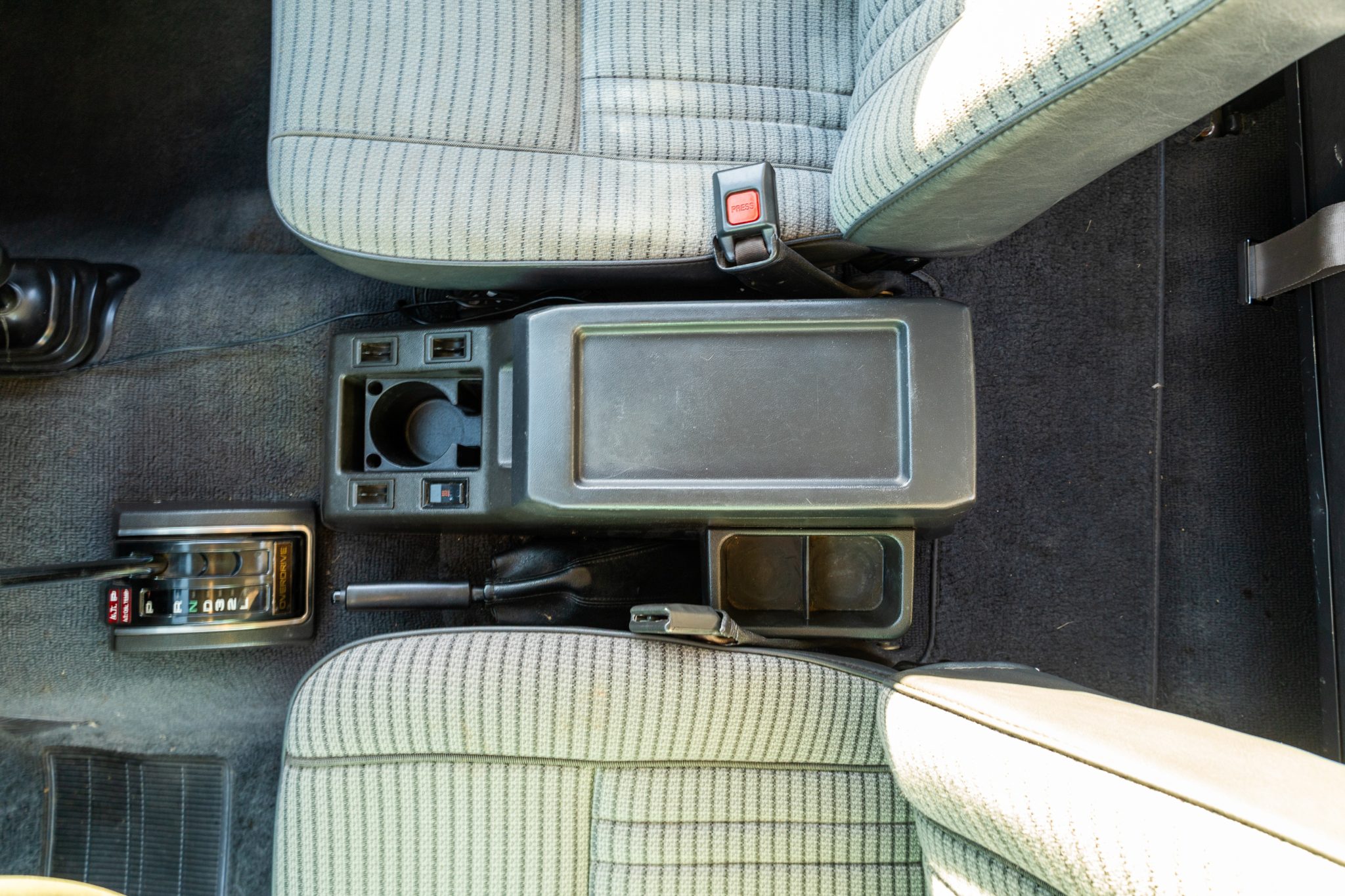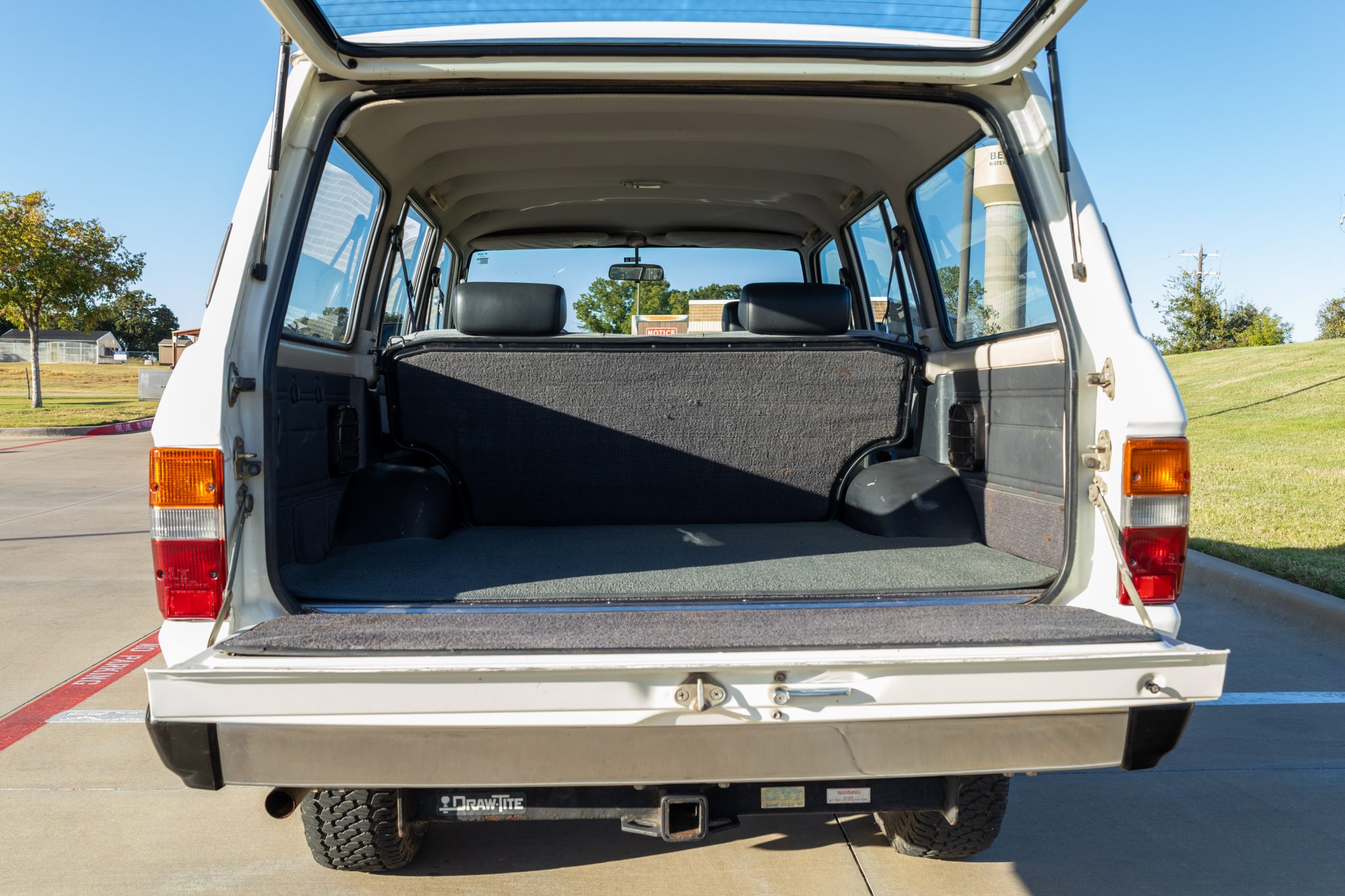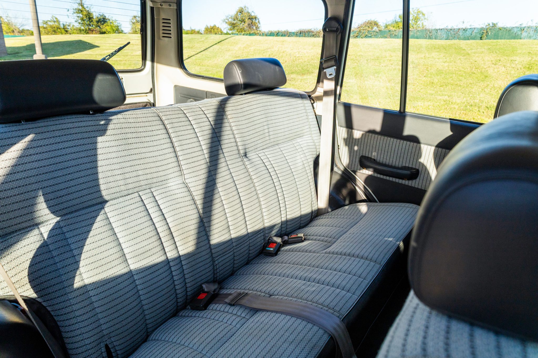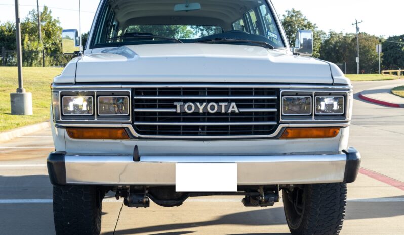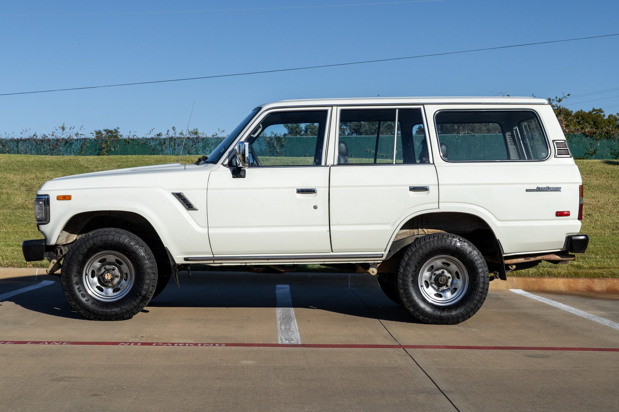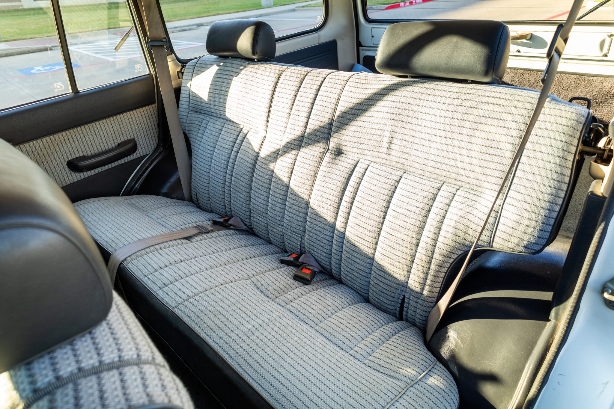 It is finished in white over striped gray cloth and powered by a 4.0L 3F-E inline-six linked with a four-speed automatic transmission and a two-speed transfer case. Equipment includes LED lighting, 15″ chrome wheels, Old Man Emu 2″ lift springs, air conditioning, power windows, and a Sony touchscreen head unit with a backup camera.