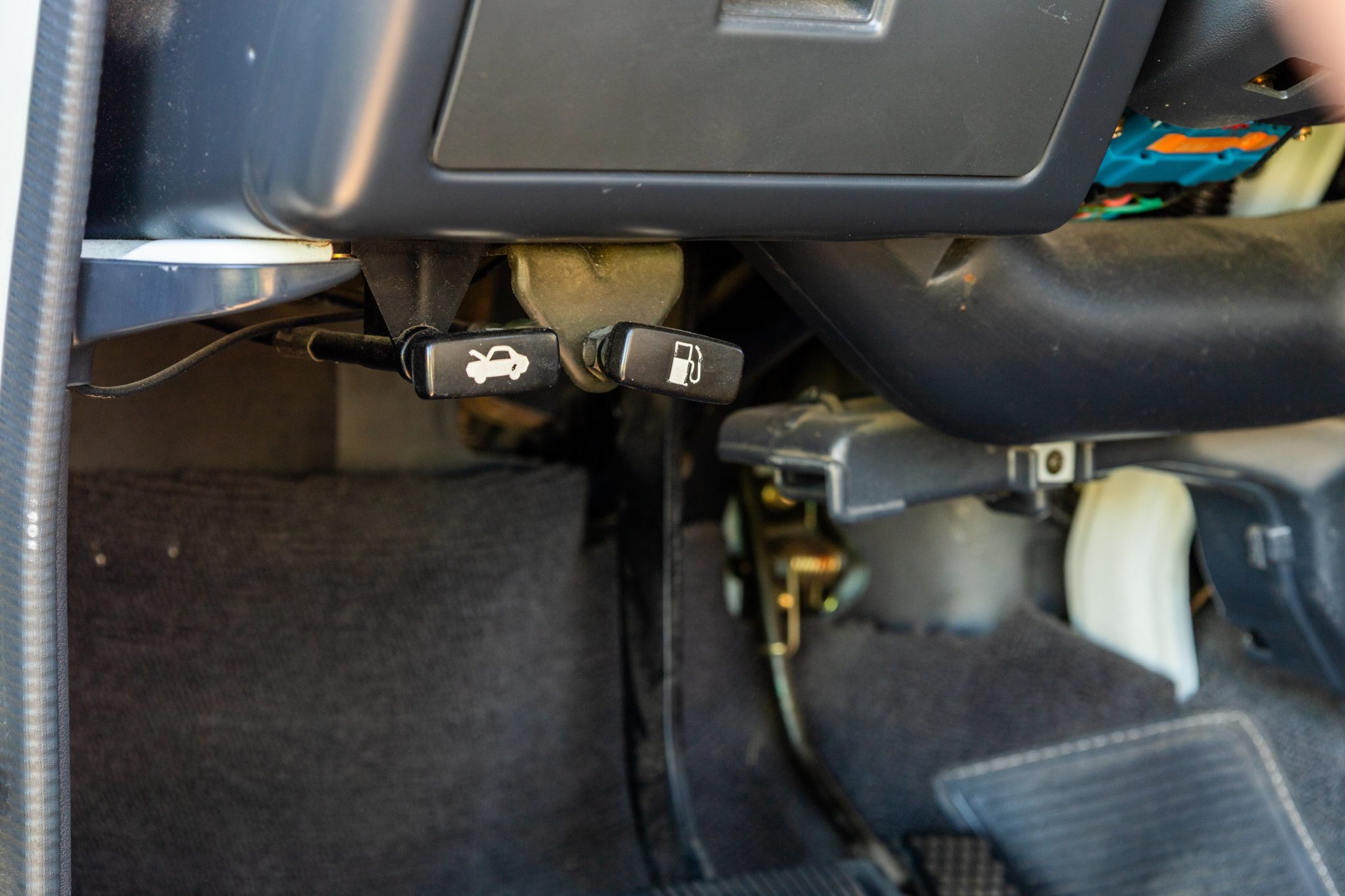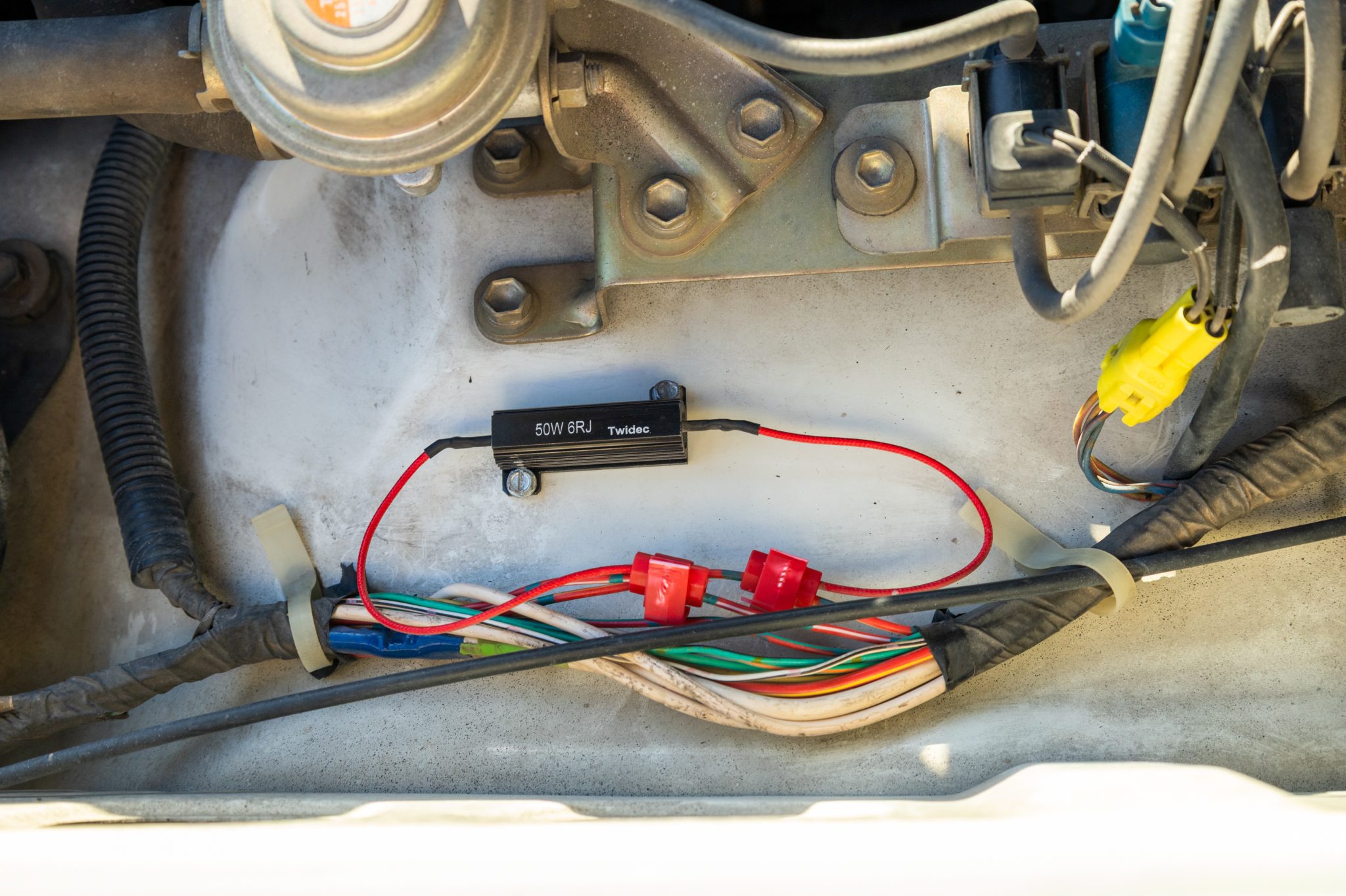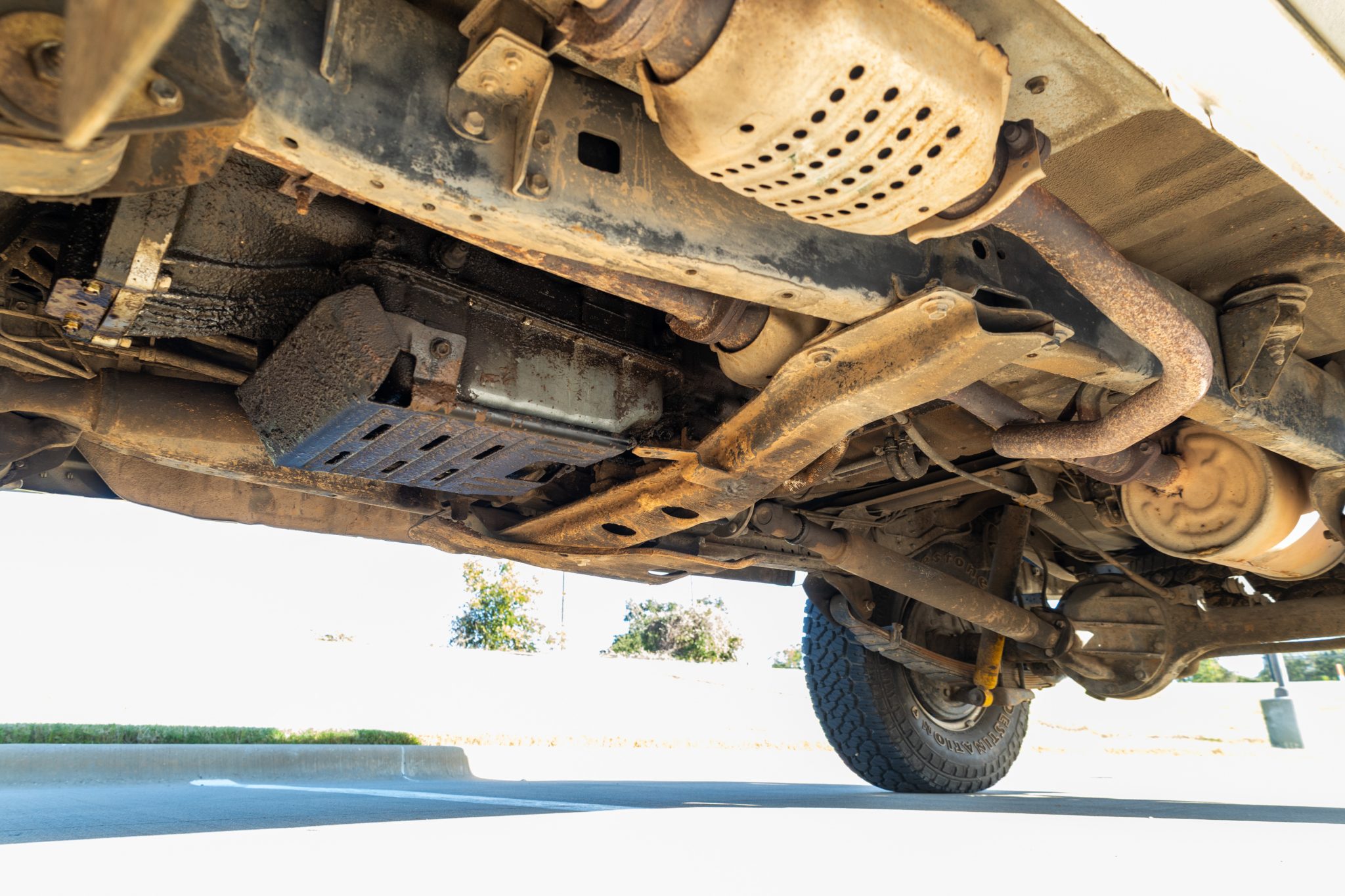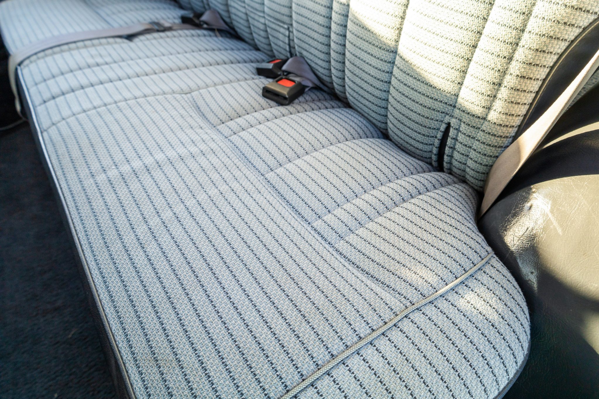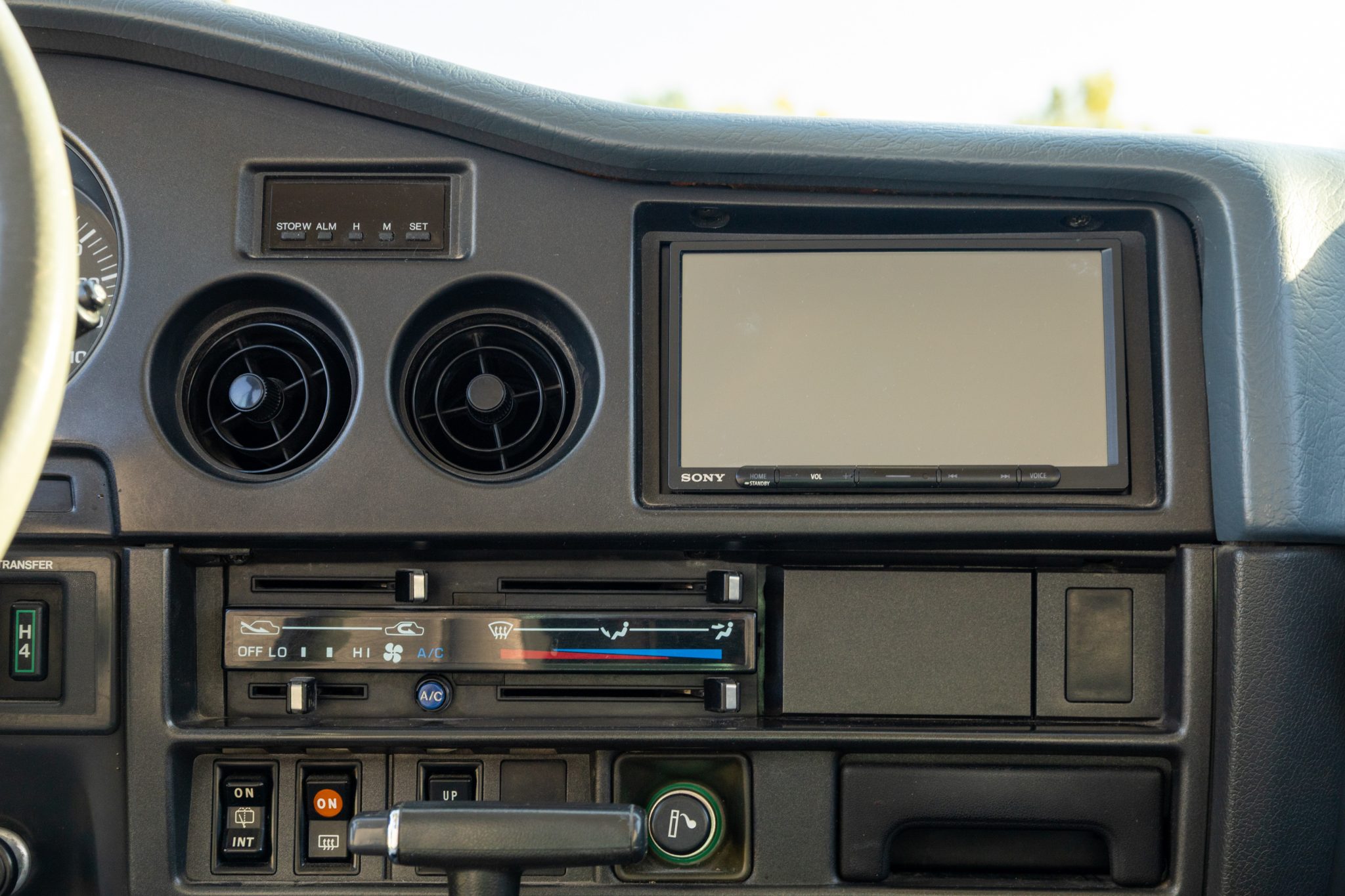 It is finished in white over striped gray cloth and powered by a 4.0L 3F-E inline-six linked with a four-speed automatic transmission and a two-speed transfer case. Equipment includes LED lighting, 15″ chrome wheels, Old Man Emu 2″ lift springs, air conditioning, power windows, and a Sony touchscreen head unit with a backup camera.