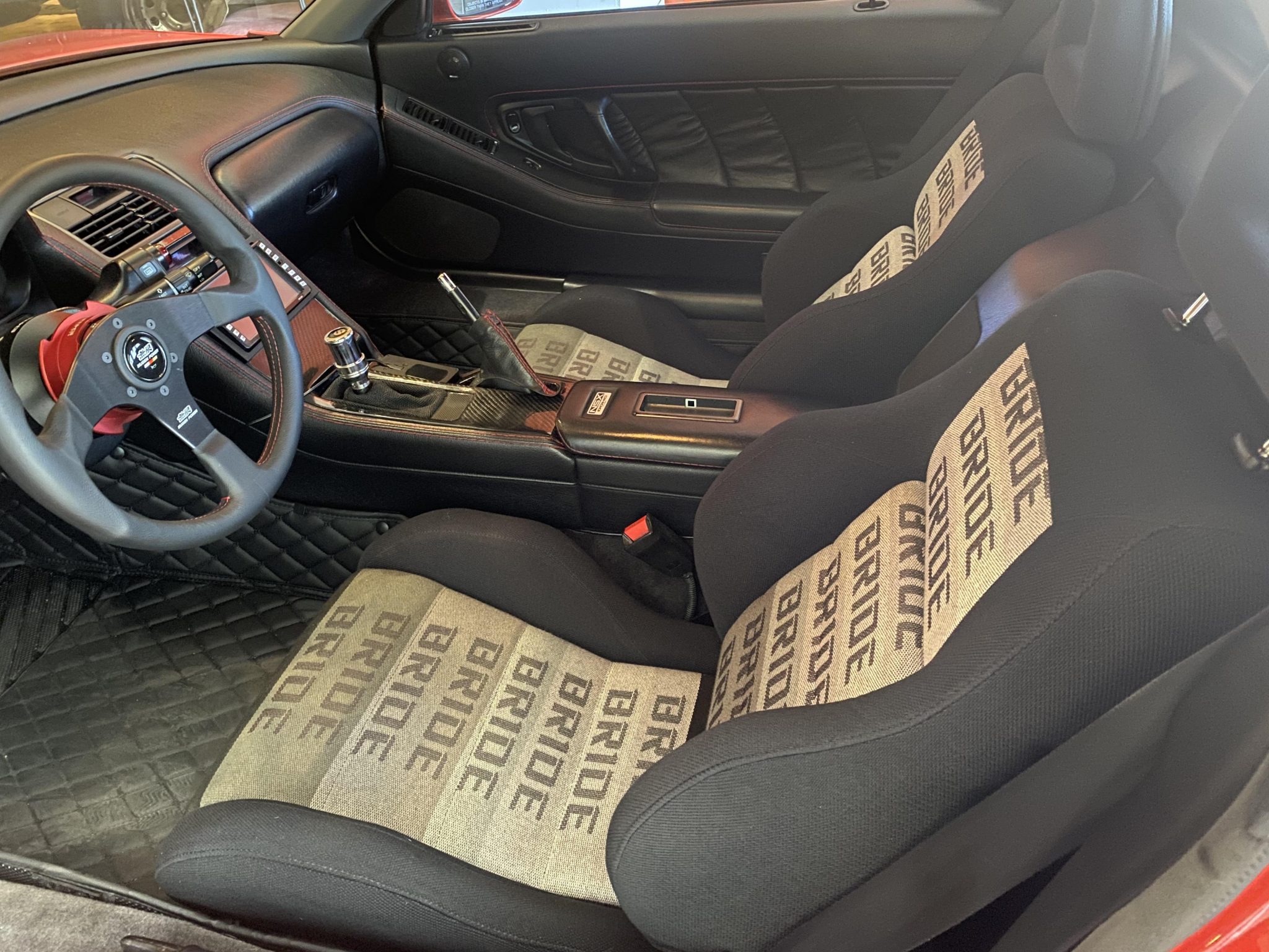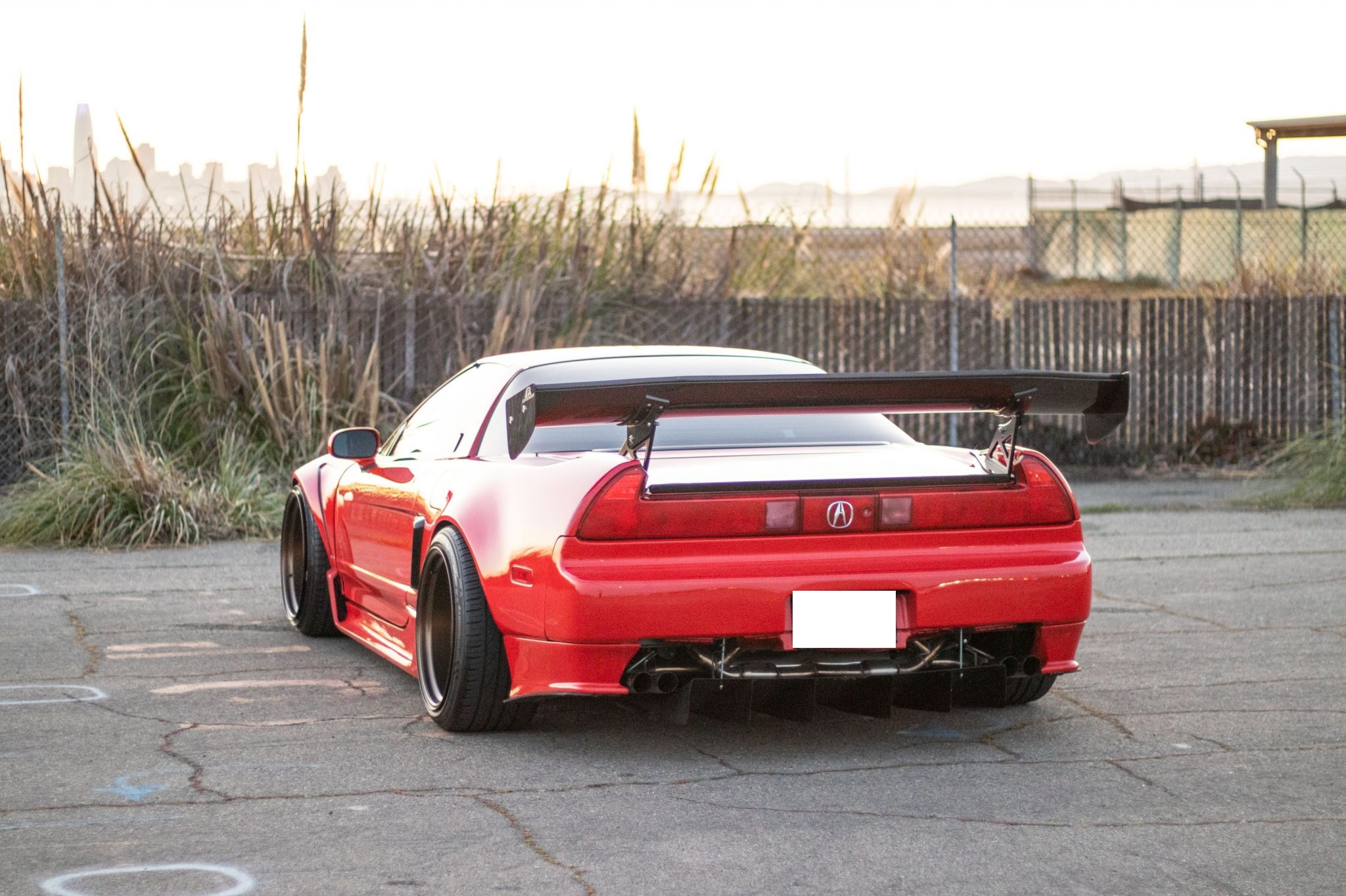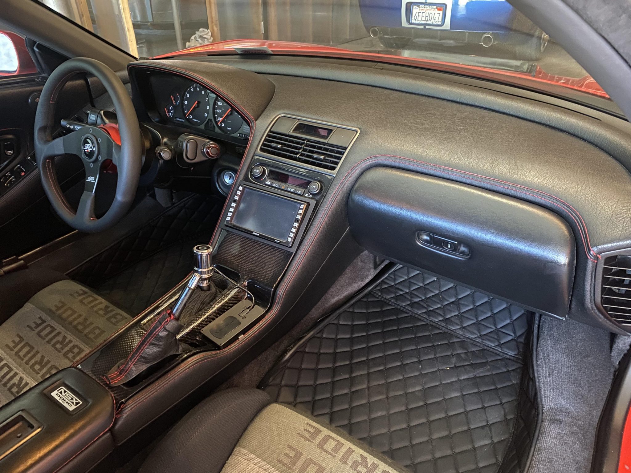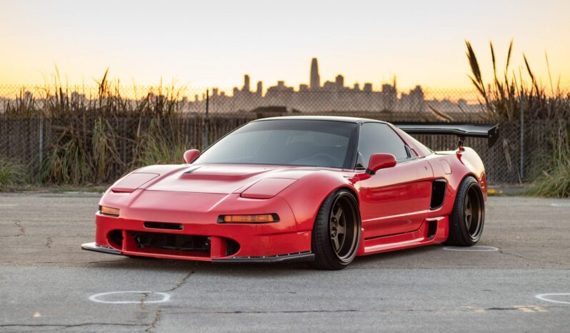 This 1991 Acura NSX is finished in red over a black interior and has been modified with an aluminum Downforce widebody kit and a custom air suspension system. The mid-mounted 3.0L VTEC V6 sends power to the rear wheels via a five-speed manual transaxle and a limited-slip differential. The interior features a Mugen steering wheel, an NRG quick-release hub, carbon-fiber trim, an Eclipse head unit, a backup camera, and Bride reclining seats. Additional equipment includes a carbon-fiber airbox, a Pride Exhaust system, a Difflow rear diffuser, an APR Performance carbon-fiber rear wing, and forged Volk TE37V wheels.