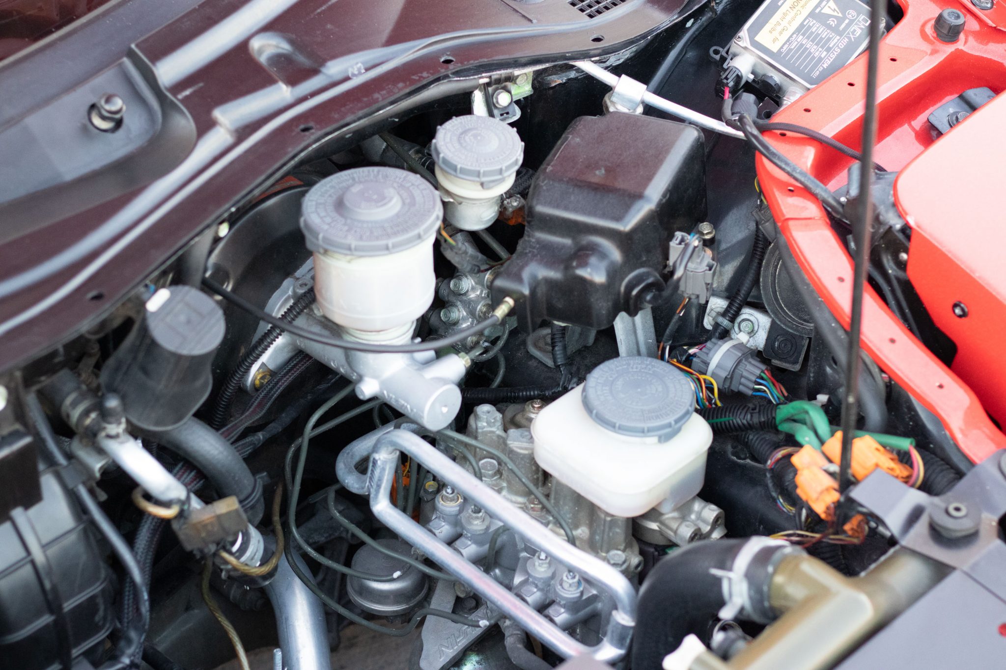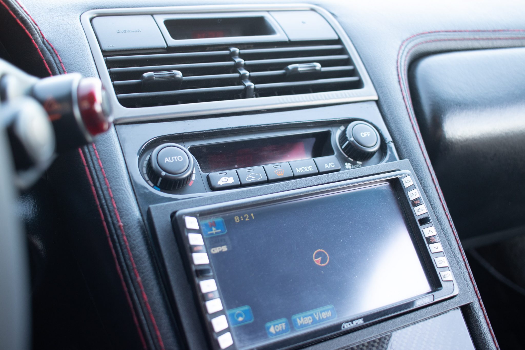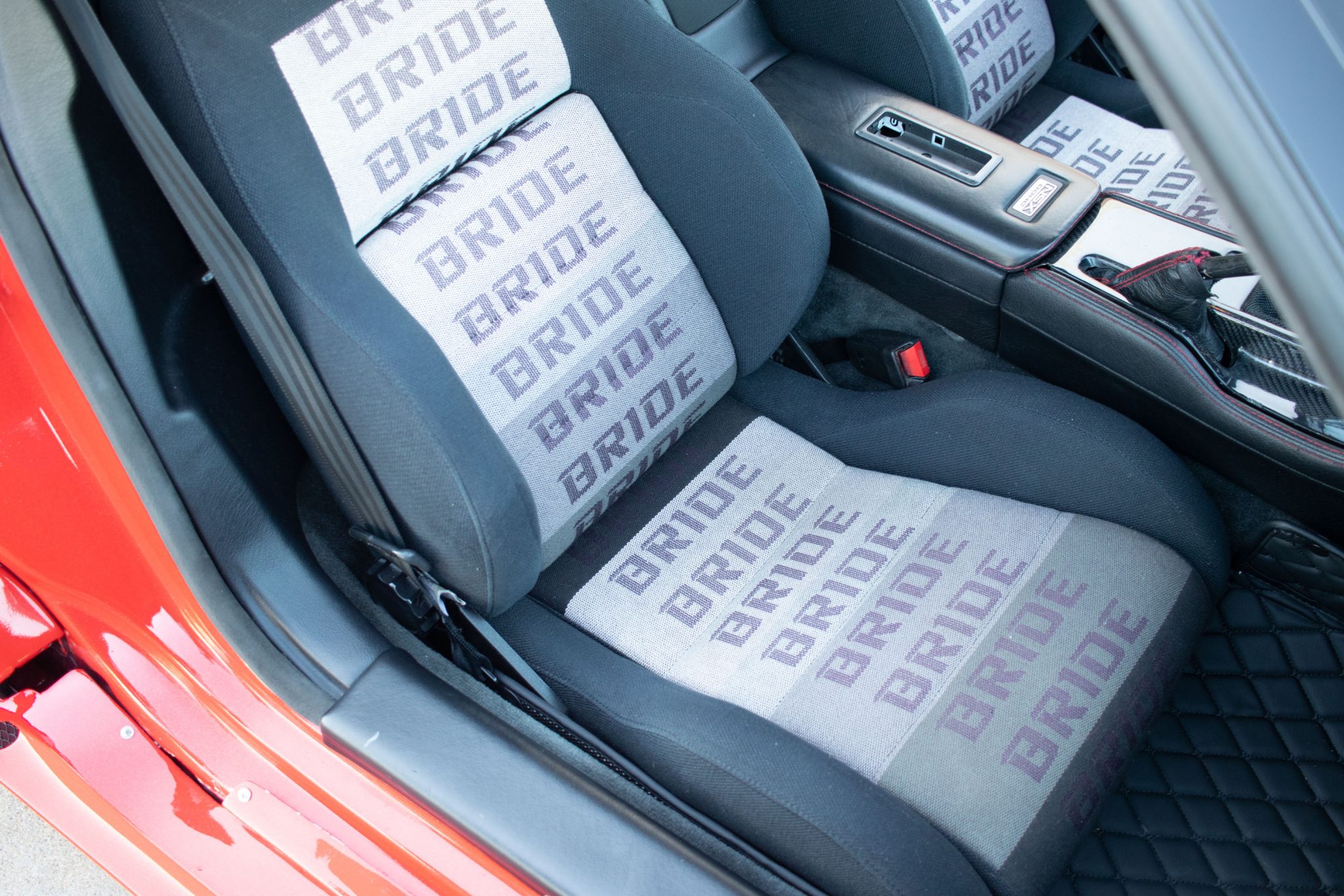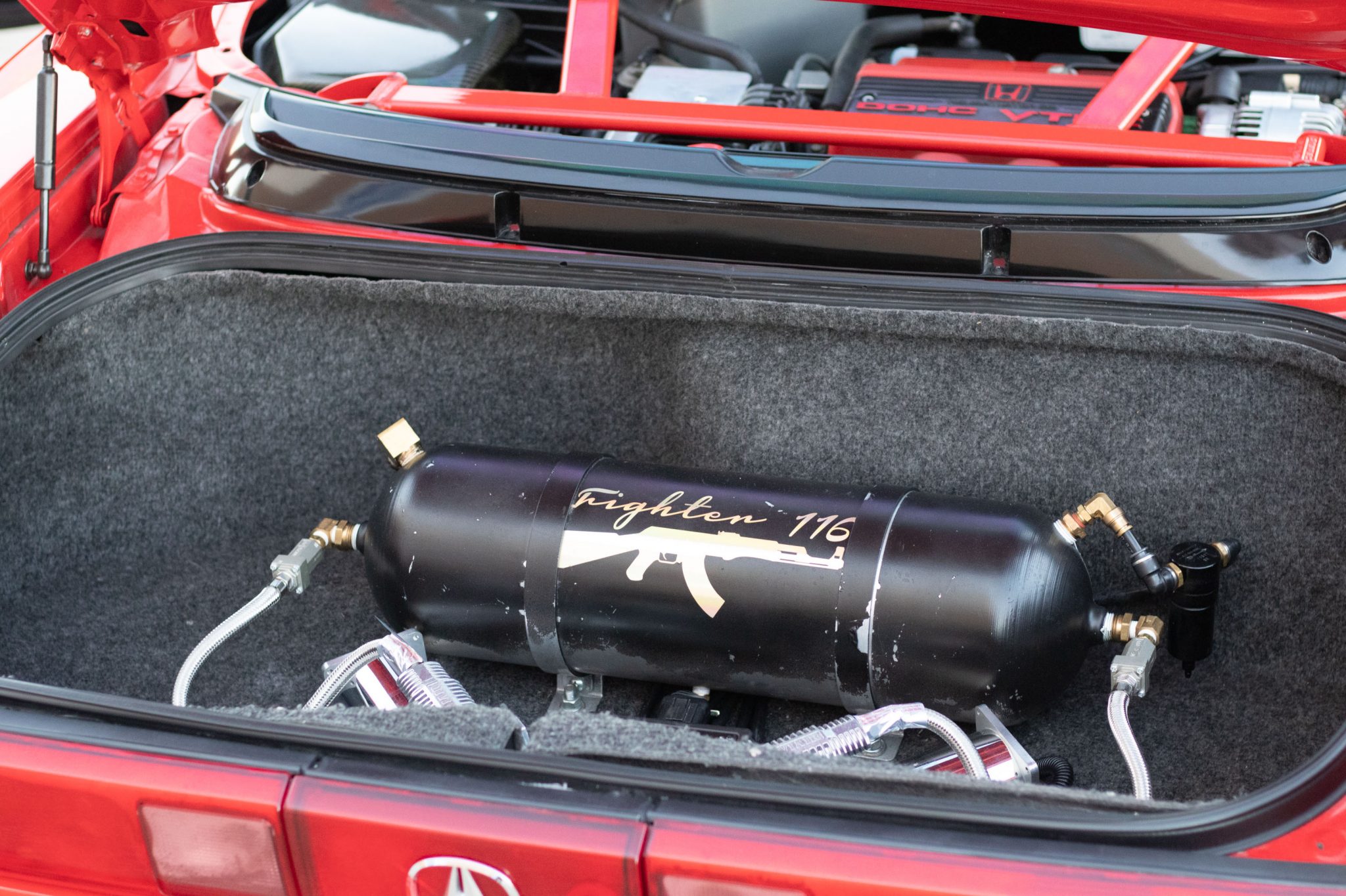 This 1991 Acura NSX is finished in red over a black interior and has been modified with an aluminum Downforce widebody kit and a custom air suspension system. The mid-mounted 3.0L VTEC V6 sends power to the rear wheels via a five-speed manual transaxle and a limited-slip differential. The interior features a Mugen steering wheel, an NRG quick-release hub, carbon-fiber trim, an Eclipse head unit, a backup camera, and Bride reclining seats. Additional equipment includes a carbon-fiber airbox, a Pride Exhaust system, a Difflow rear diffuser, an APR Performance carbon-fiber rear wing, and forged Volk TE37V wheels.