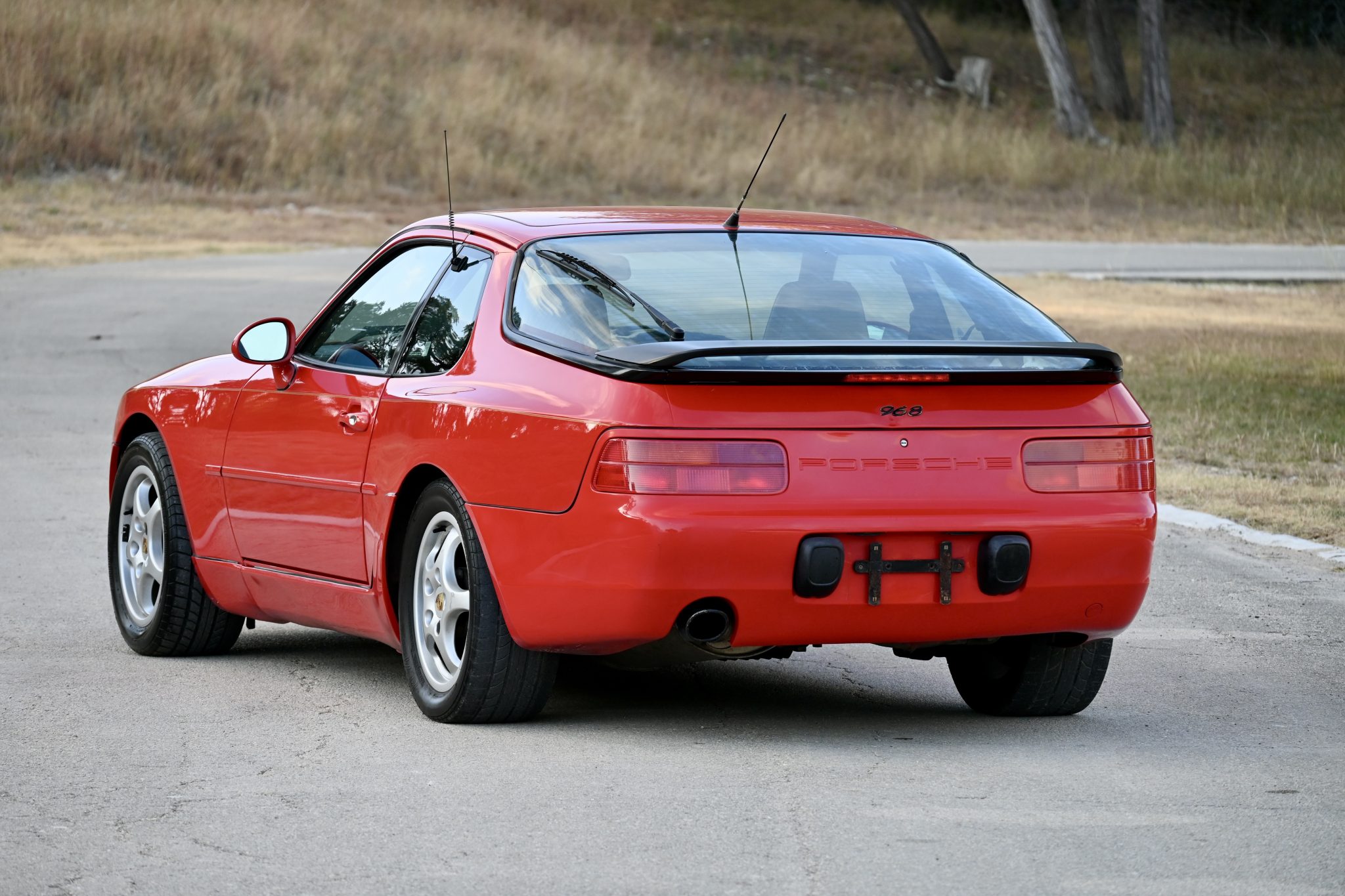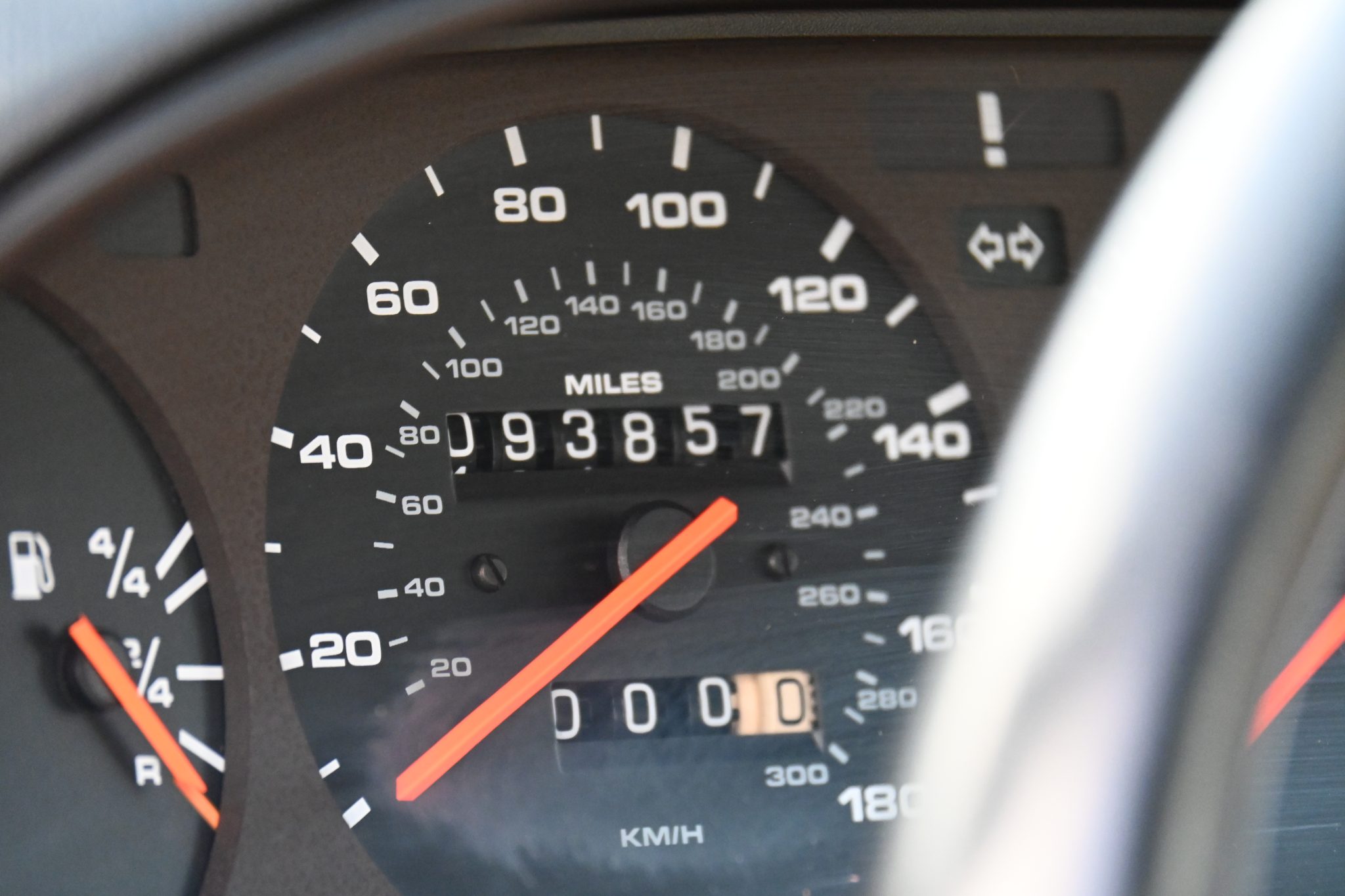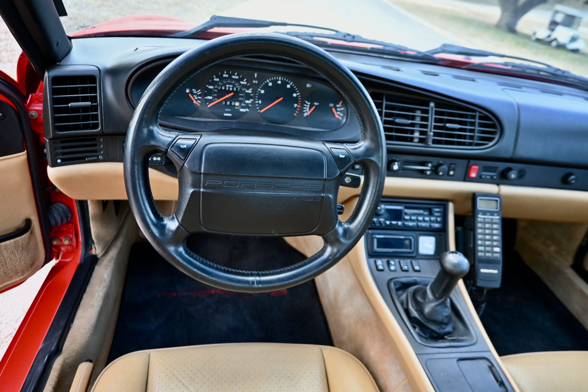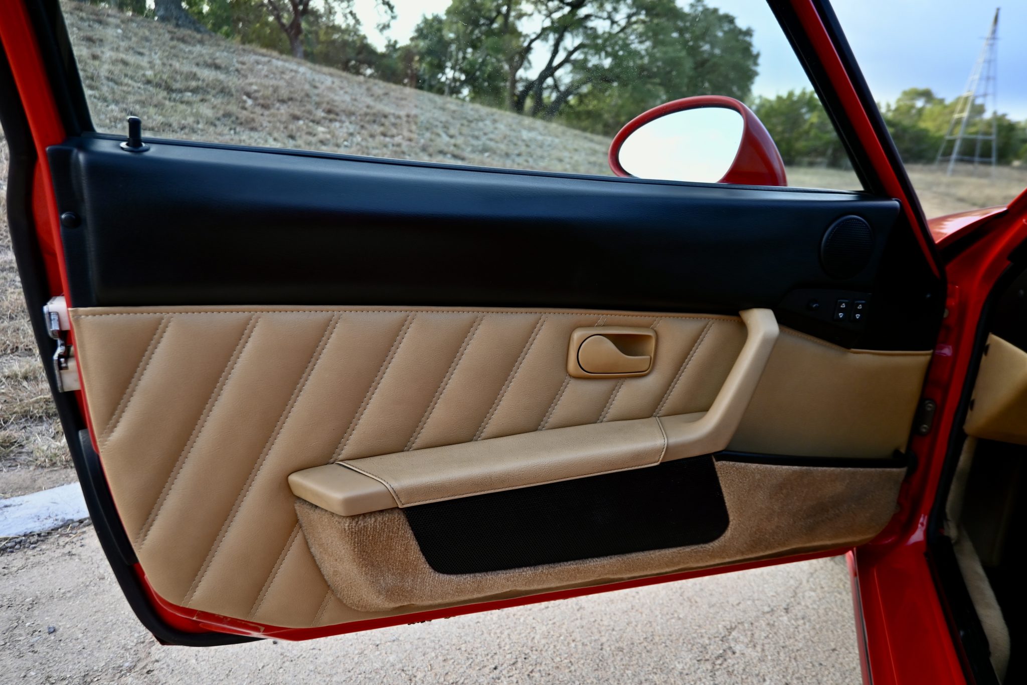 Powered by a 3.0-liter inline-four paired with a six-speed manual transaxle and a limited-slip differential, the car is finished in Guards Red over Cashmere leather upholstery. Equipment includes 16″ five-spoke alloy wheels, a sunroof, cruise control, a cassette stereo, and power-adjustable front seats.