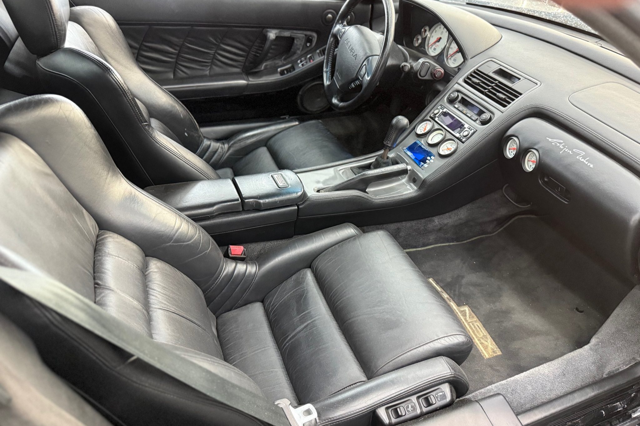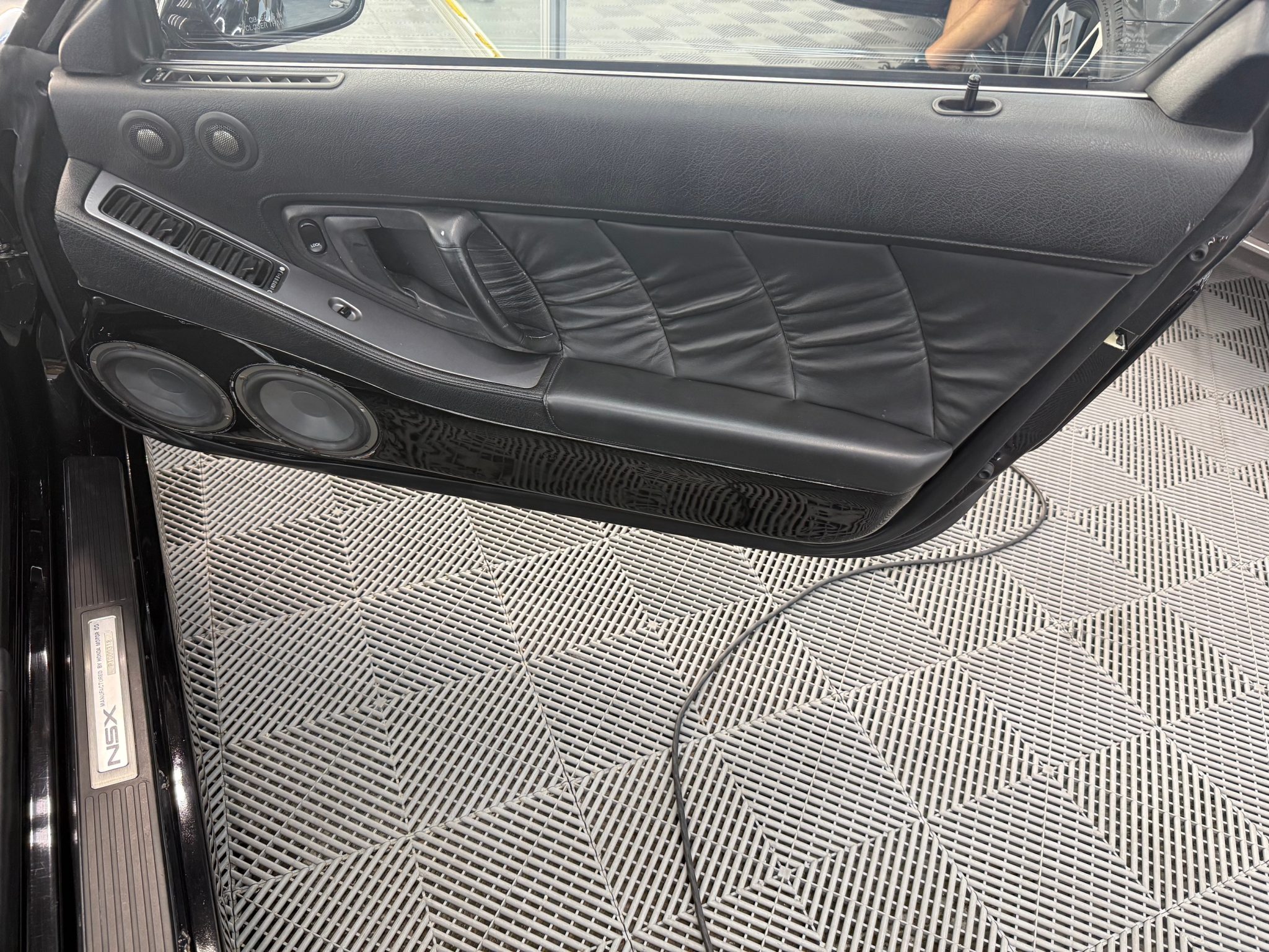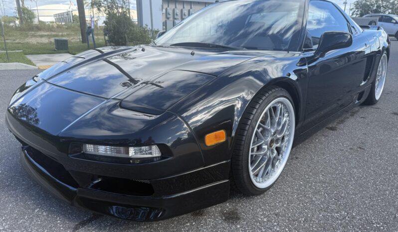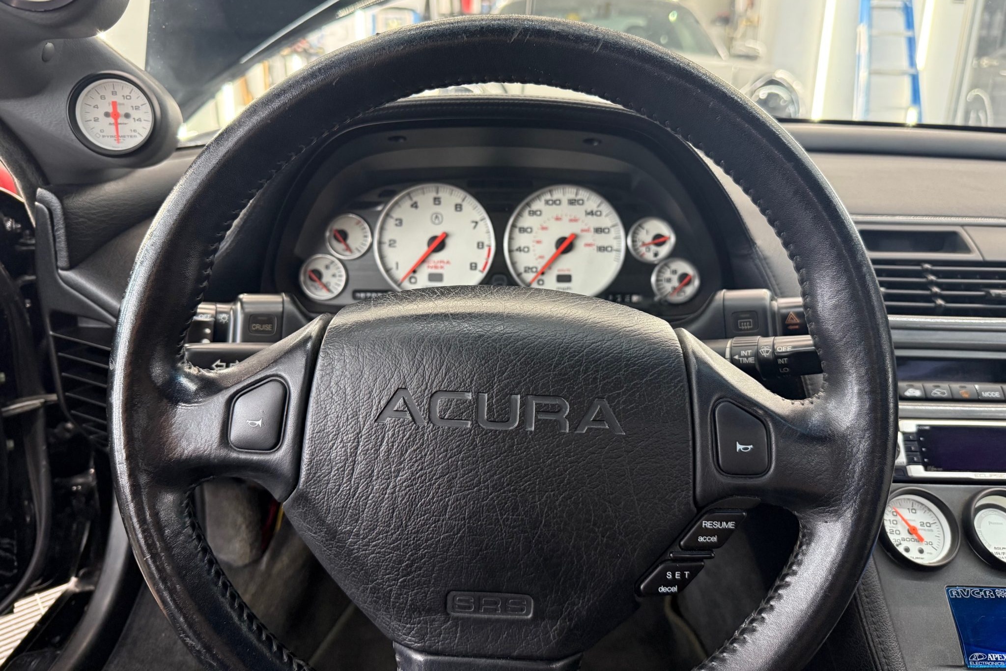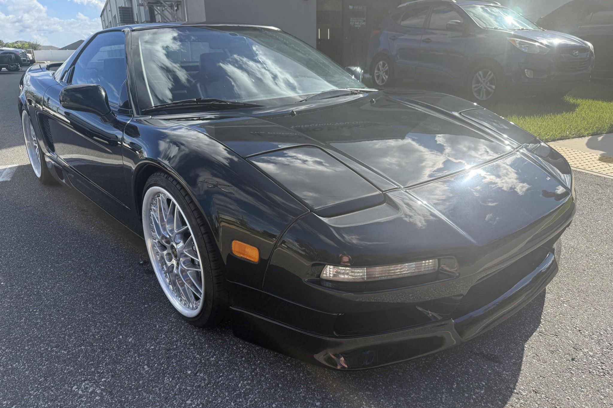 This 1993 Acura NSX has been fitted with aftermarket suspension, braking, fueling, audio, and exhaust components, and its 3.0-liter VTEC V6 has been rebuilt and fitted with a turbocharger kit. The body has been refinished in black, and further modifications include an Apexi Air Flow Converter (AFC), a Clutch Masters kevlar clutch, a nitrous kit, 18″ and 19″ Enkei multi-piece wheels, and auxiliary gauges. The car was optioned from the factory with a five-speed manual transaxle, black leather upholstery, a limited-slip differential, pop-up headlights, power-adjustable seats, automatic climate control, and cruise control.