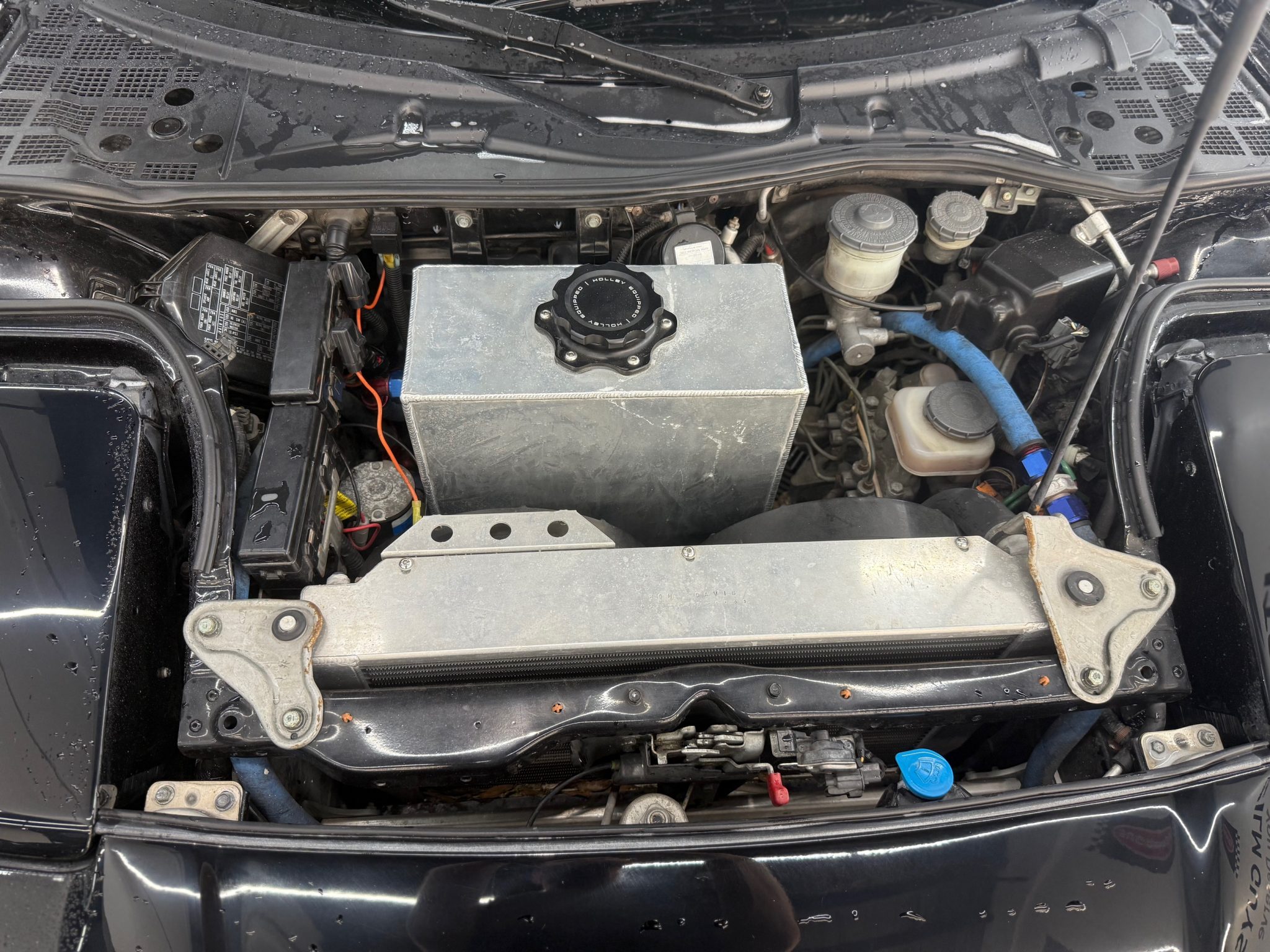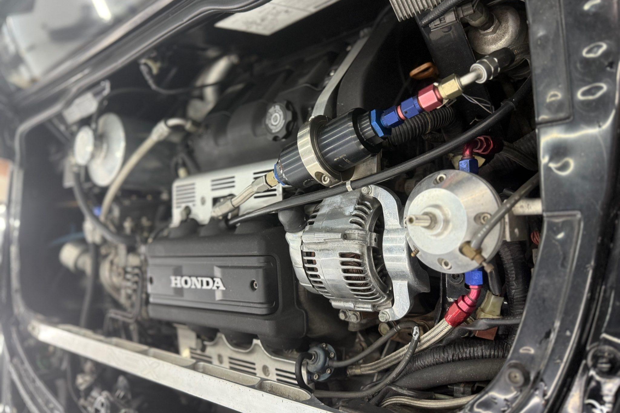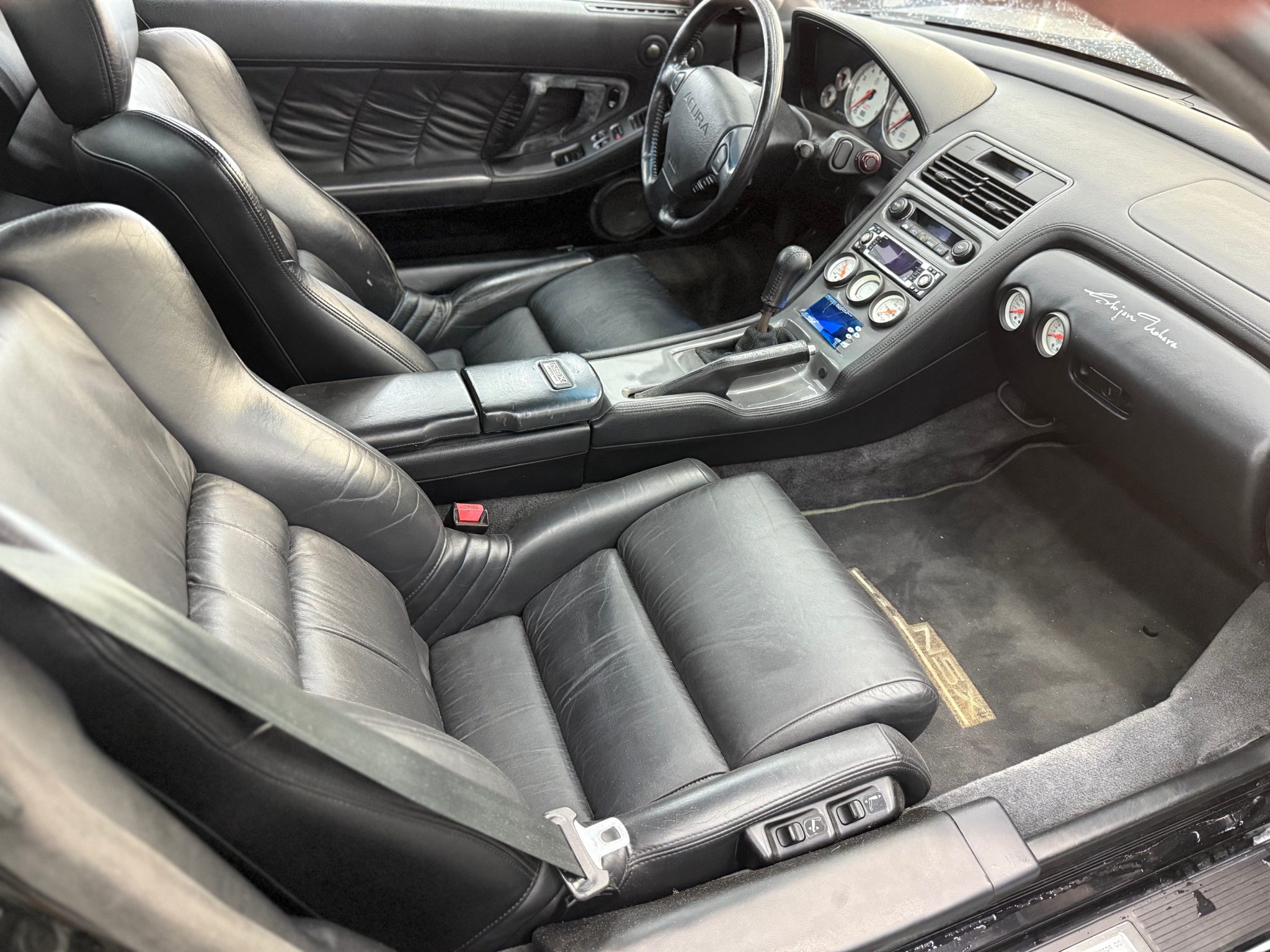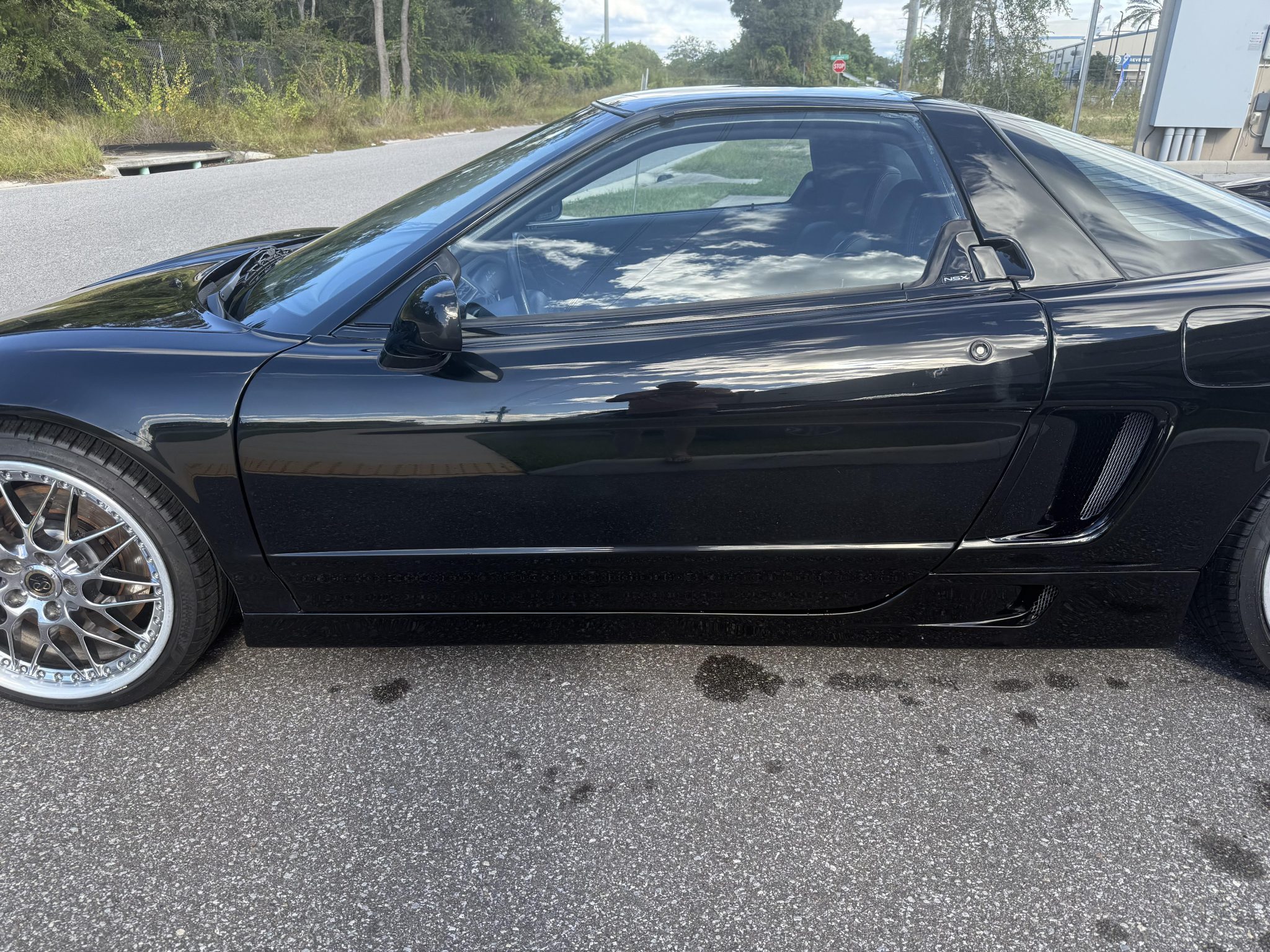 This 1993 Acura NSX has been fitted with aftermarket suspension, braking, fueling, audio, and exhaust components, and its 3.0-liter VTEC V6 has been rebuilt and fitted with a turbocharger kit. The body has been refinished in black, and further modifications include an Apexi Air Flow Converter (AFC), a Clutch Masters kevlar clutch, a nitrous kit, 18″ and 19″ Enkei multi-piece wheels, and auxiliary gauges. The car was optioned from the factory with a five-speed manual transaxle, black leather upholstery, a limited-slip differential, pop-up headlights, power-adjustable seats, automatic climate control, and cruise control.