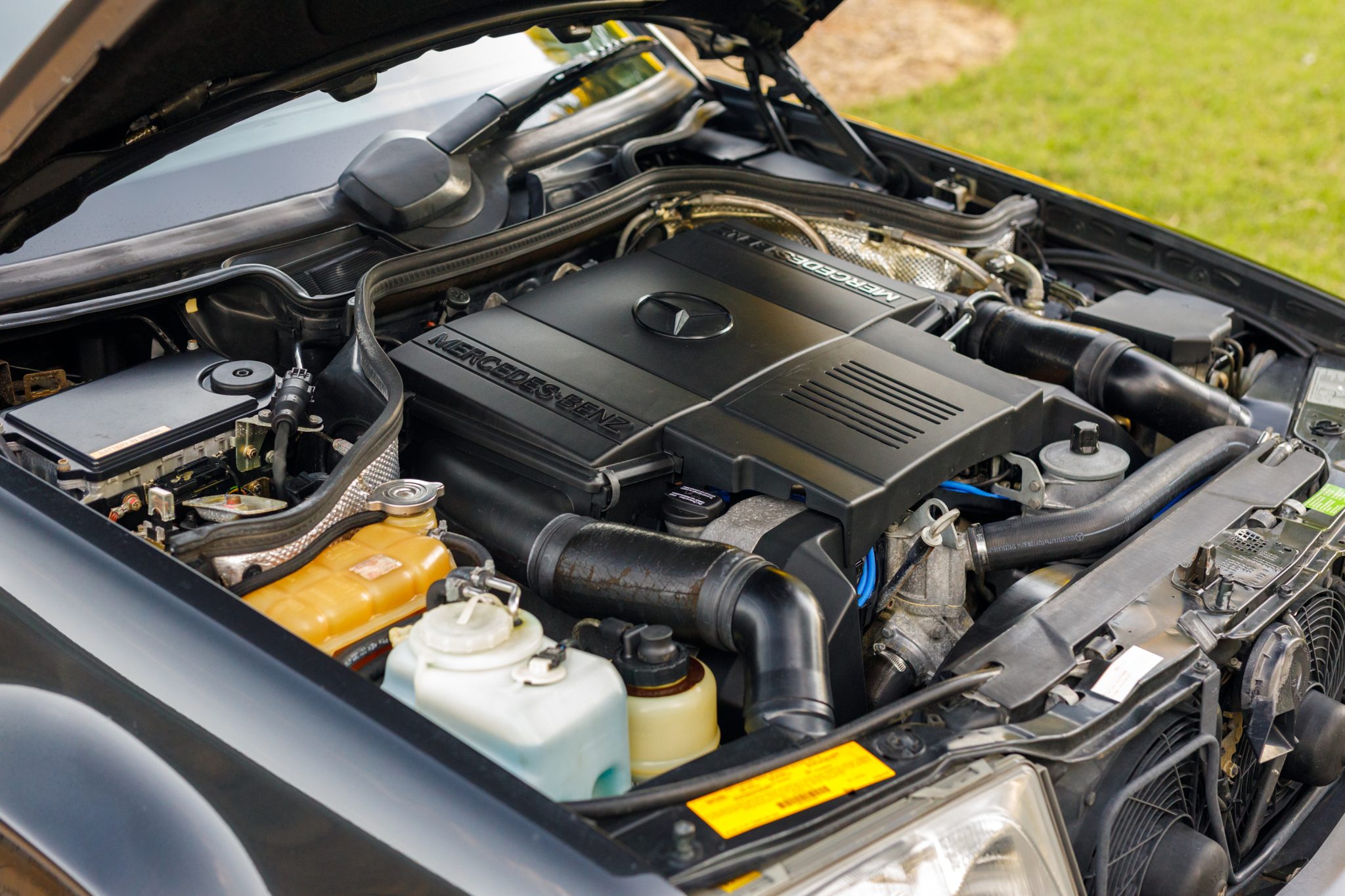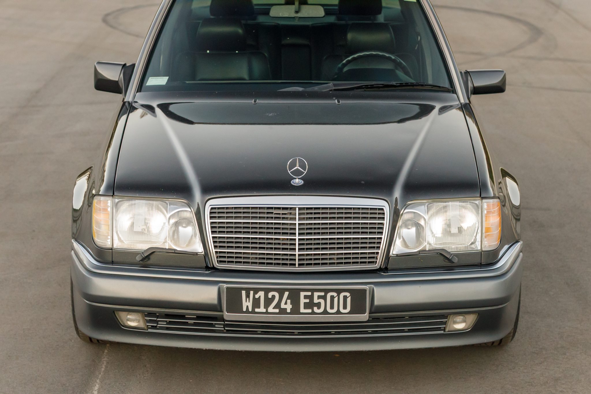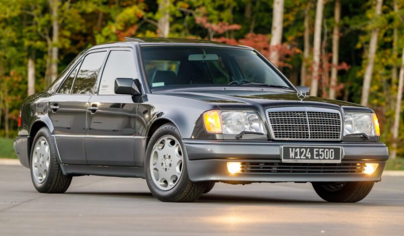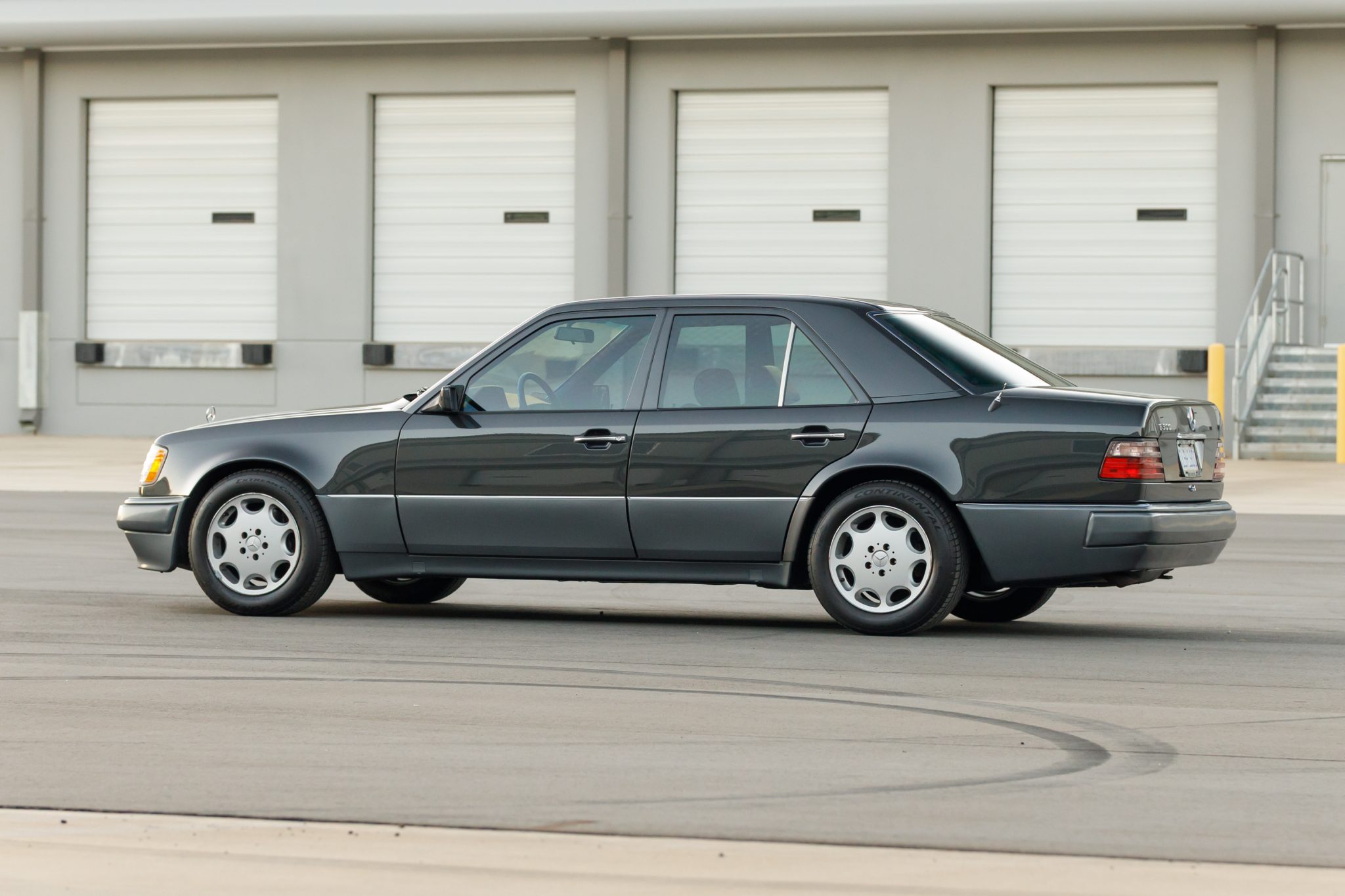 This 1994 Mercedes-Benz E500 is finished in Black Pearl Metallic over black leather upholstery and is powered by a 5.0-liter M119 V8 paired with a four-speed automatic transmission. Equipment includes a power sunroof, fog lights, self-leveling rear suspension, Automatic Slip Control, heated power-adjustable front seats, automatic climate control, a Continental Bluetooth stereo, and cruise control.