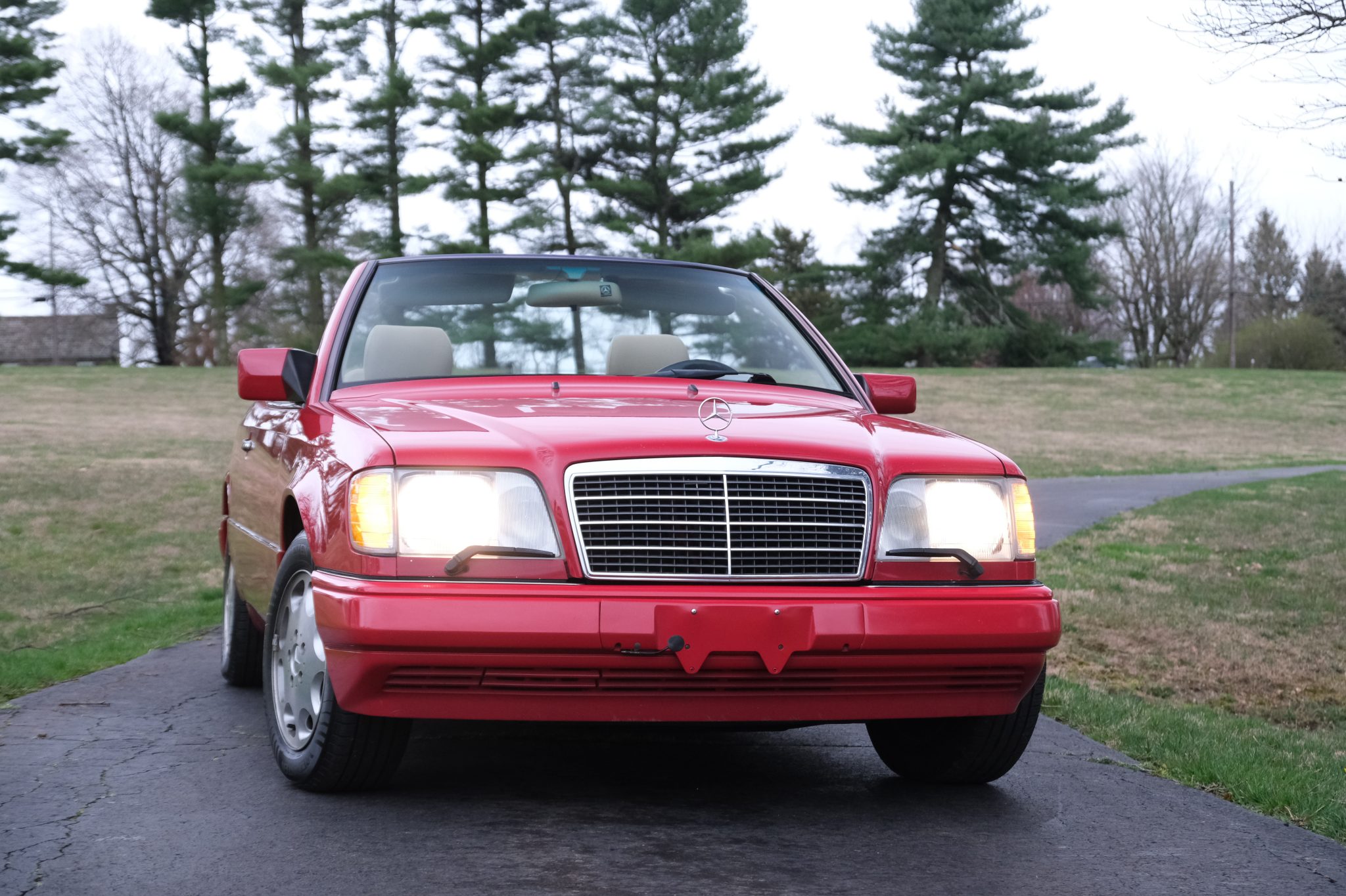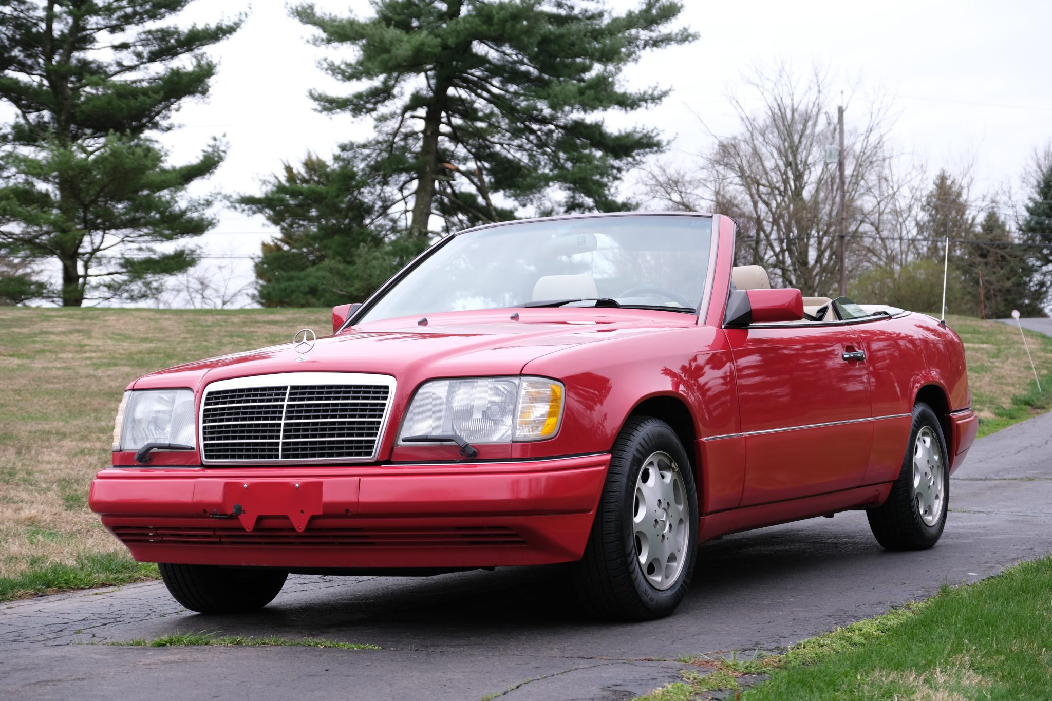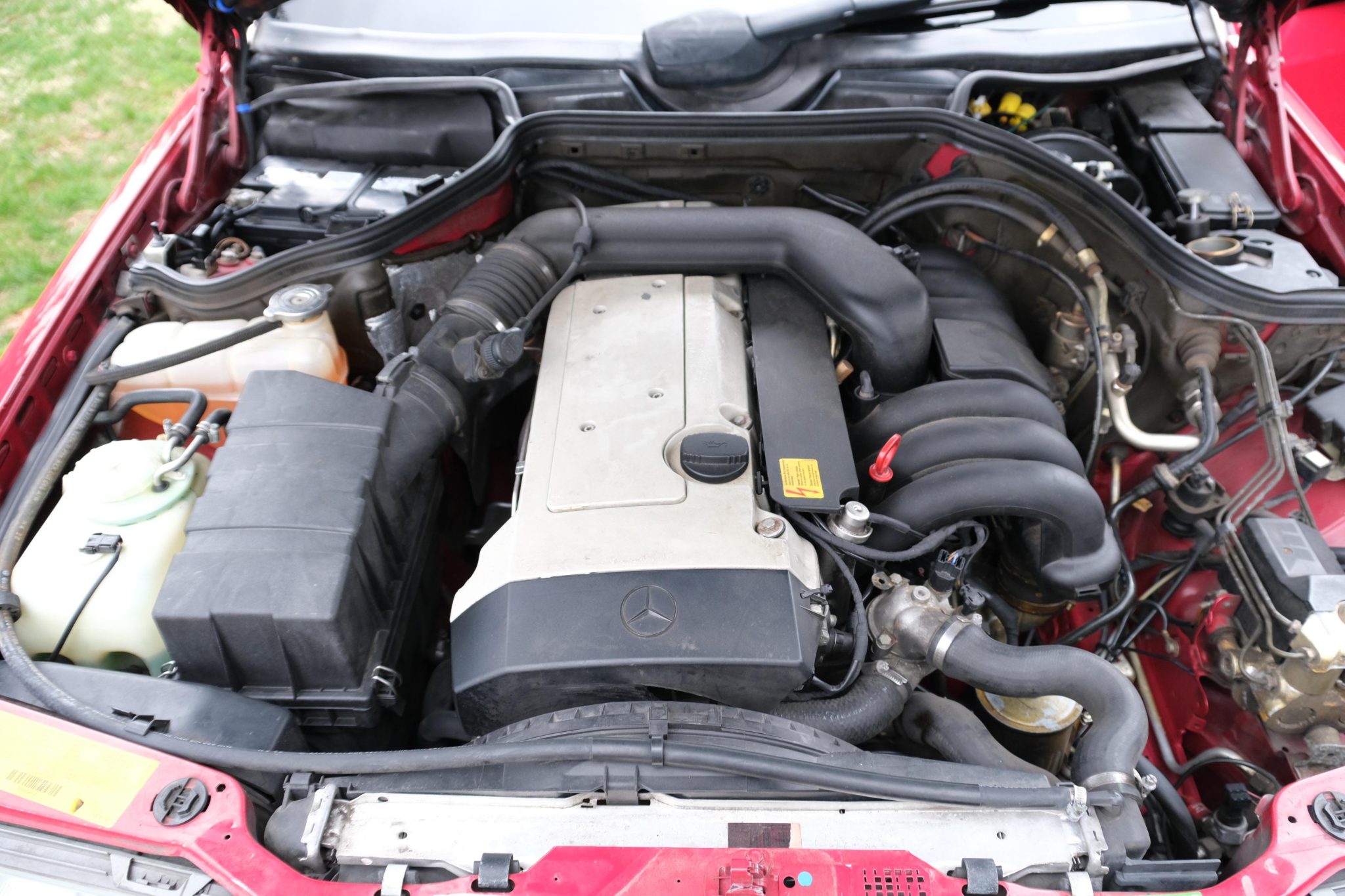 Finished in red with a black soft top over beige leather upholstery, it has 15″ alloy wheels, heated and power-adjustable front seats, automatic climate control, and a cassette stereo. Power comes from a 3.2-liter M104 inline-six paired with a four-speed automatic transmission