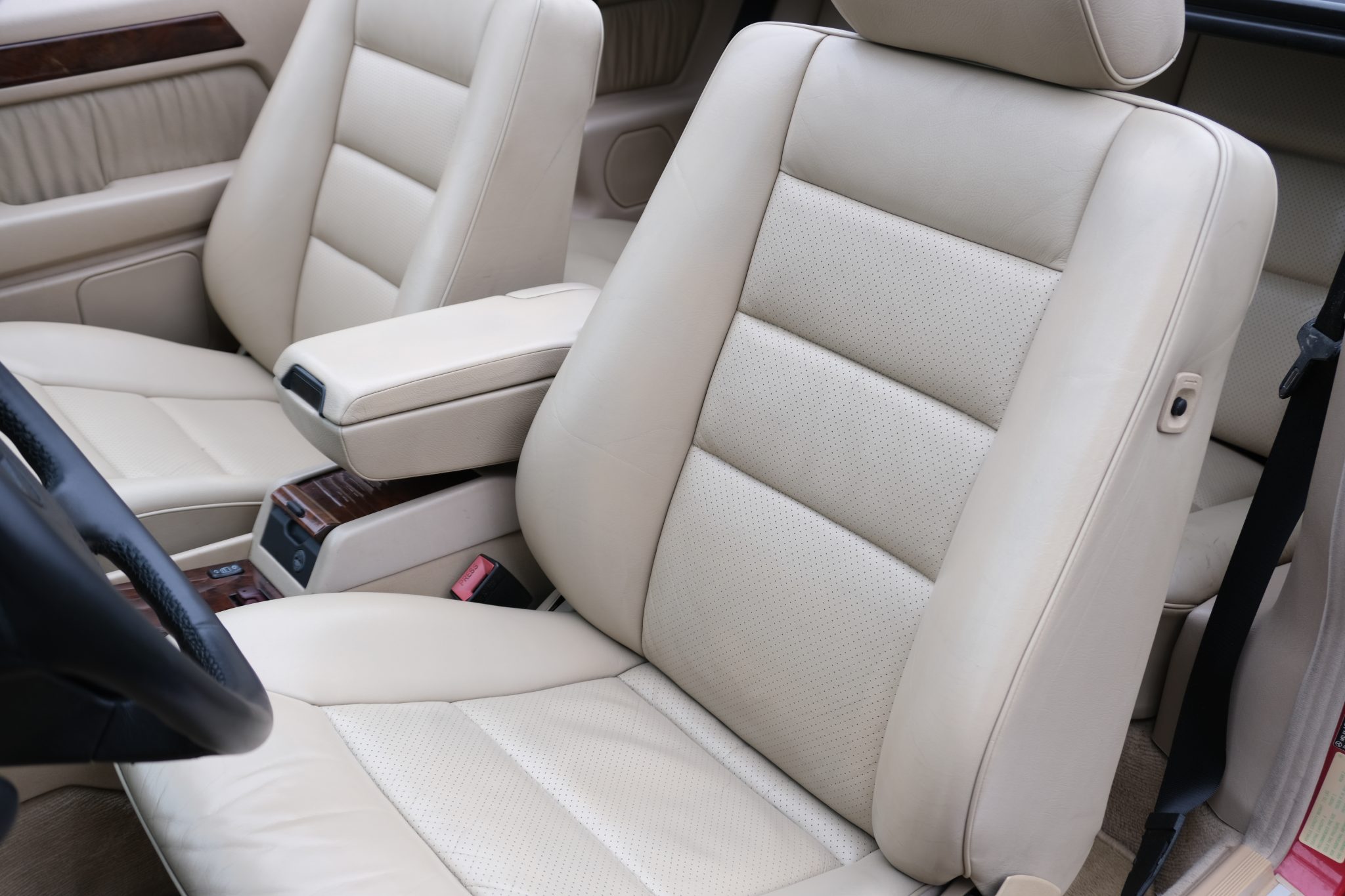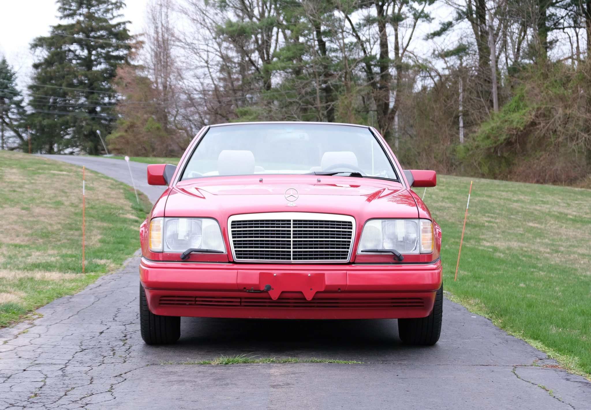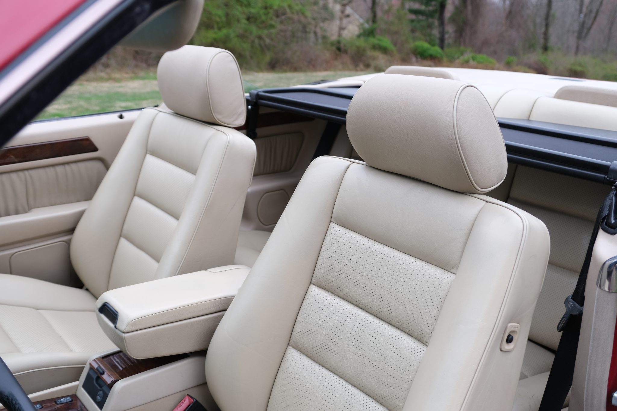 Finished in red with a black soft top over beige leather upholstery, it has 15″ alloy wheels, heated and power-adjustable front seats, automatic climate control, and a cassette stereo. Power comes from a 3.2-liter M104 inline-six paired with a four-speed automatic transmission