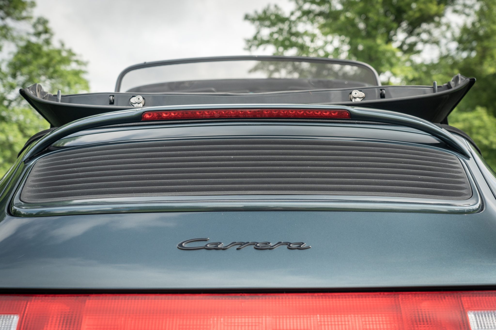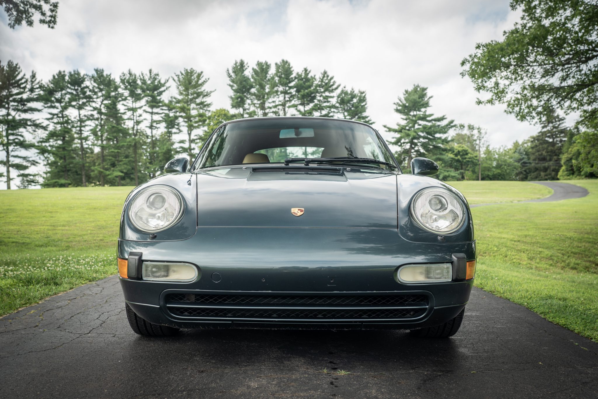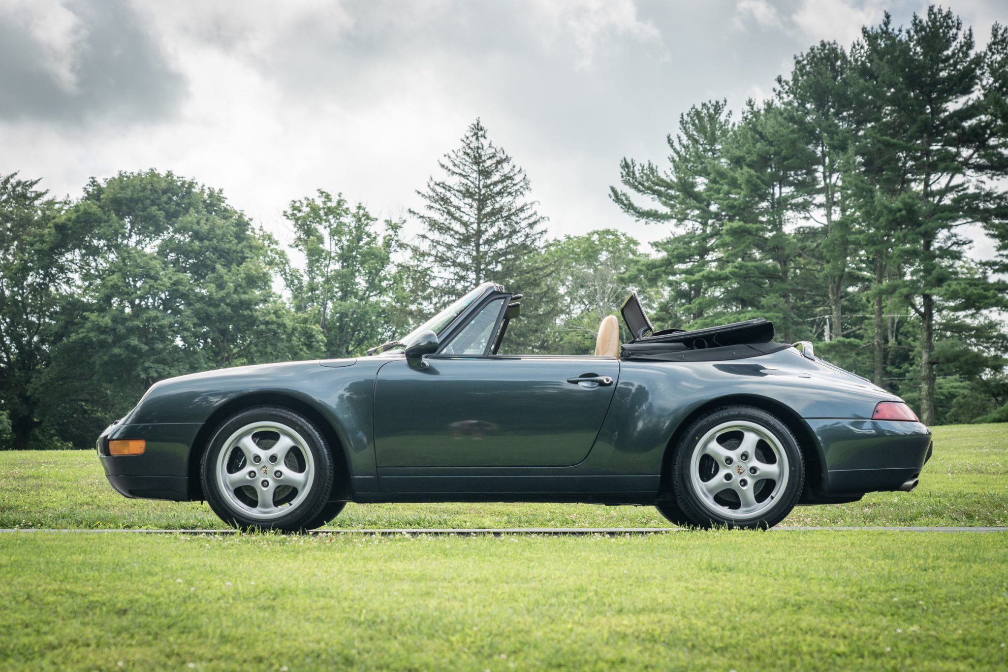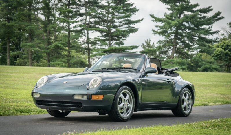 This 1995 Porsche 911 Carrera cabriolet is finished in Aventurine Green Metallic over Cashmere Beige leather and is powered by an air-cooled 3.6L flat-six mated to a six-speed manual transaxle and a limited-slip differential. Equipment includes a replacement black soft top, an Automatic Braking Differential (ABD), a wind deflector, an onboard computer, cruise control, 17″ Cup II wheels, front seats with powered height adjustment, and a Becker-Porsche cassette stereo paired with a trunk-mounted CD changer.