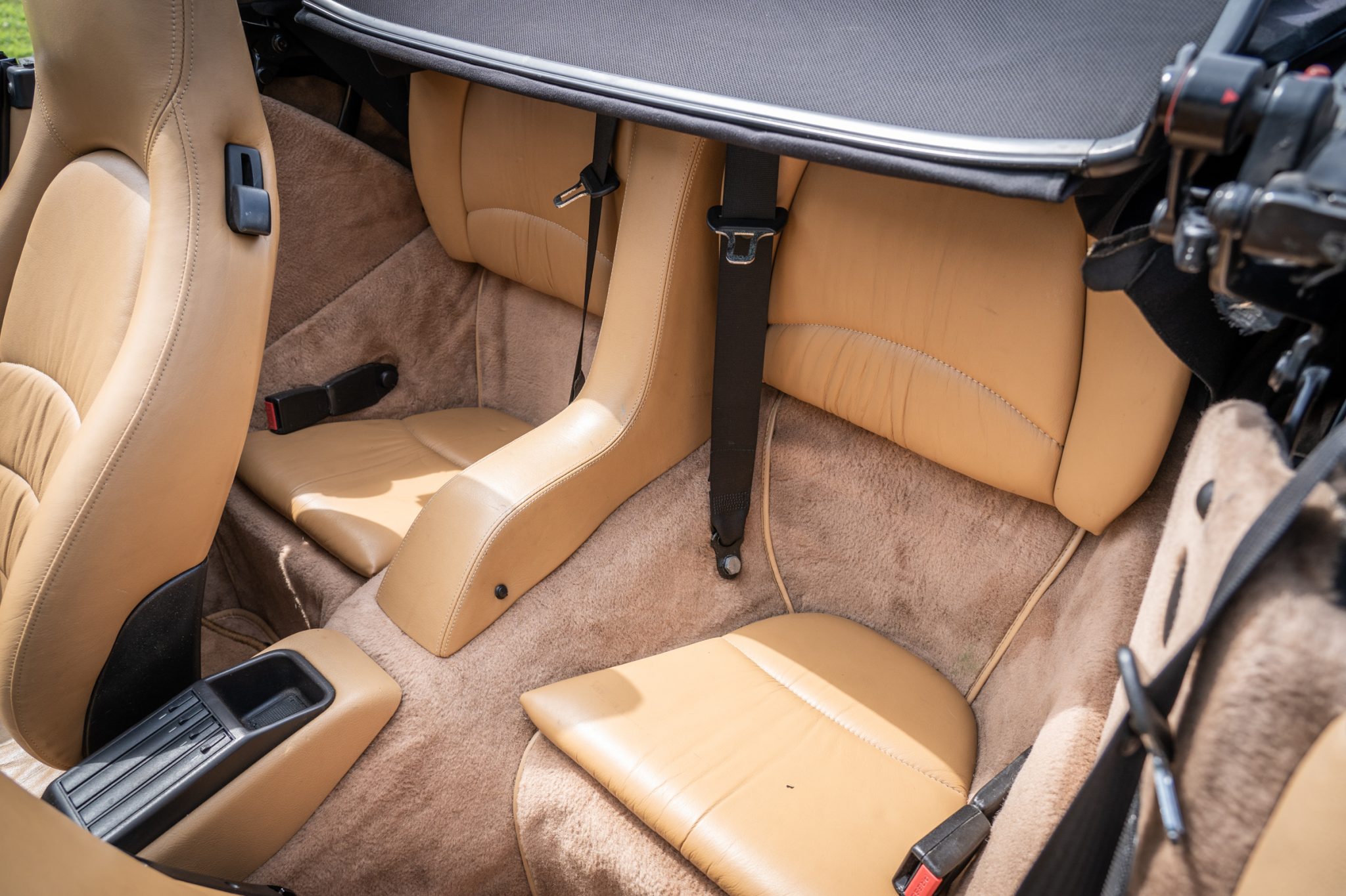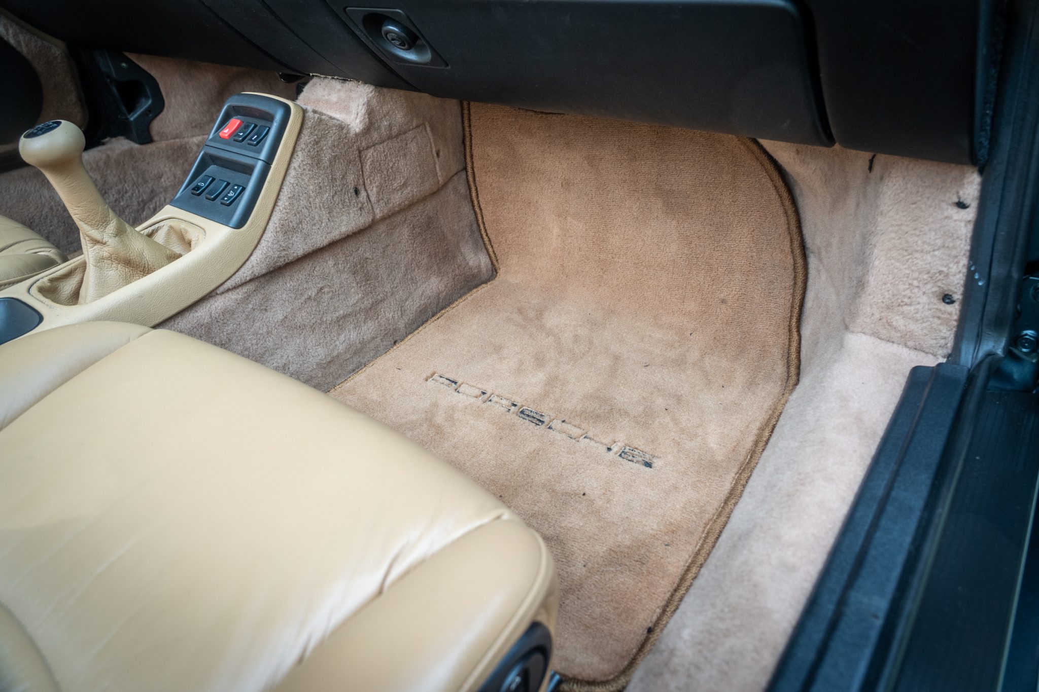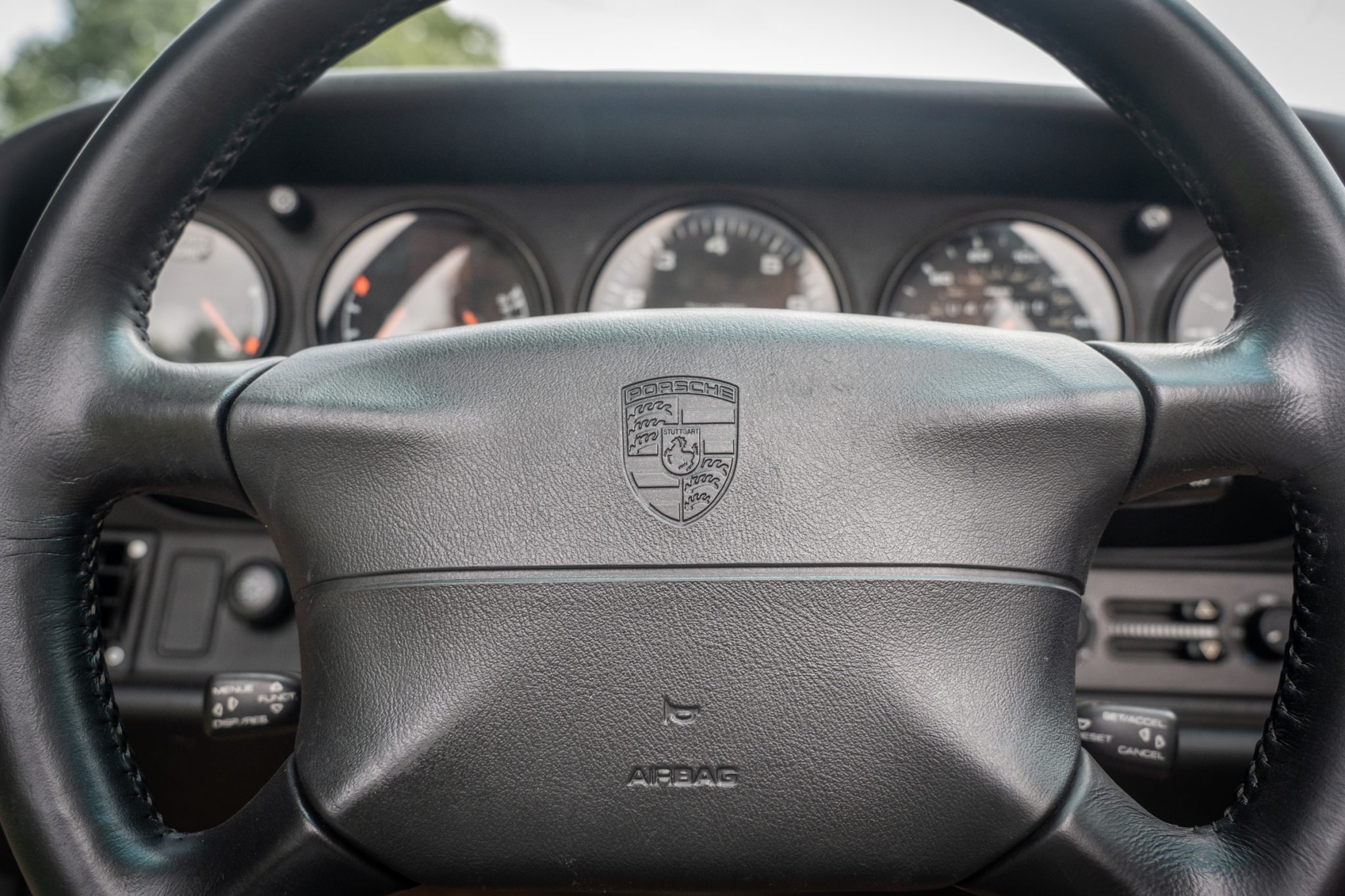 This 1995 Porsche 911 Carrera cabriolet is finished in Aventurine Green Metallic over Cashmere Beige leather and is powered by an air-cooled 3.6L flat-six mated to a six-speed manual transaxle and a limited-slip differential. Equipment includes a replacement black soft top, an Automatic Braking Differential (ABD), a wind deflector, an onboard computer, cruise control, 17″ Cup II wheels, front seats with powered height adjustment, and a Becker-Porsche cassette stereo paired with a trunk-mounted CD changer.