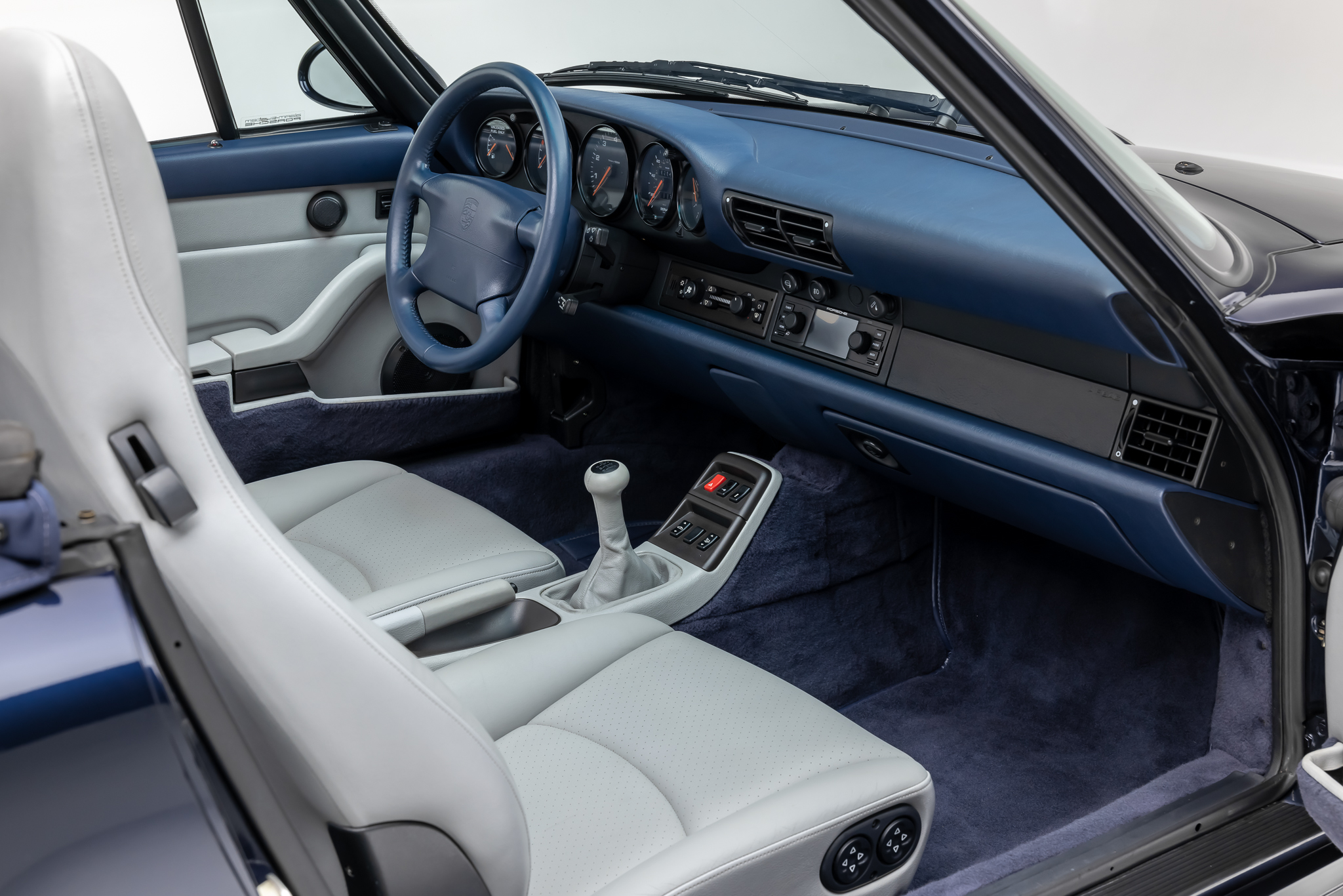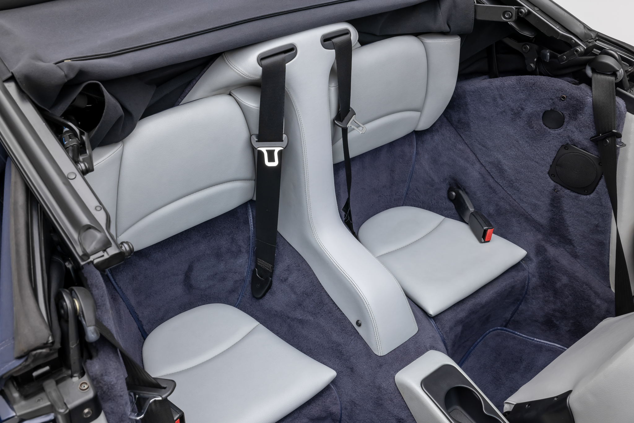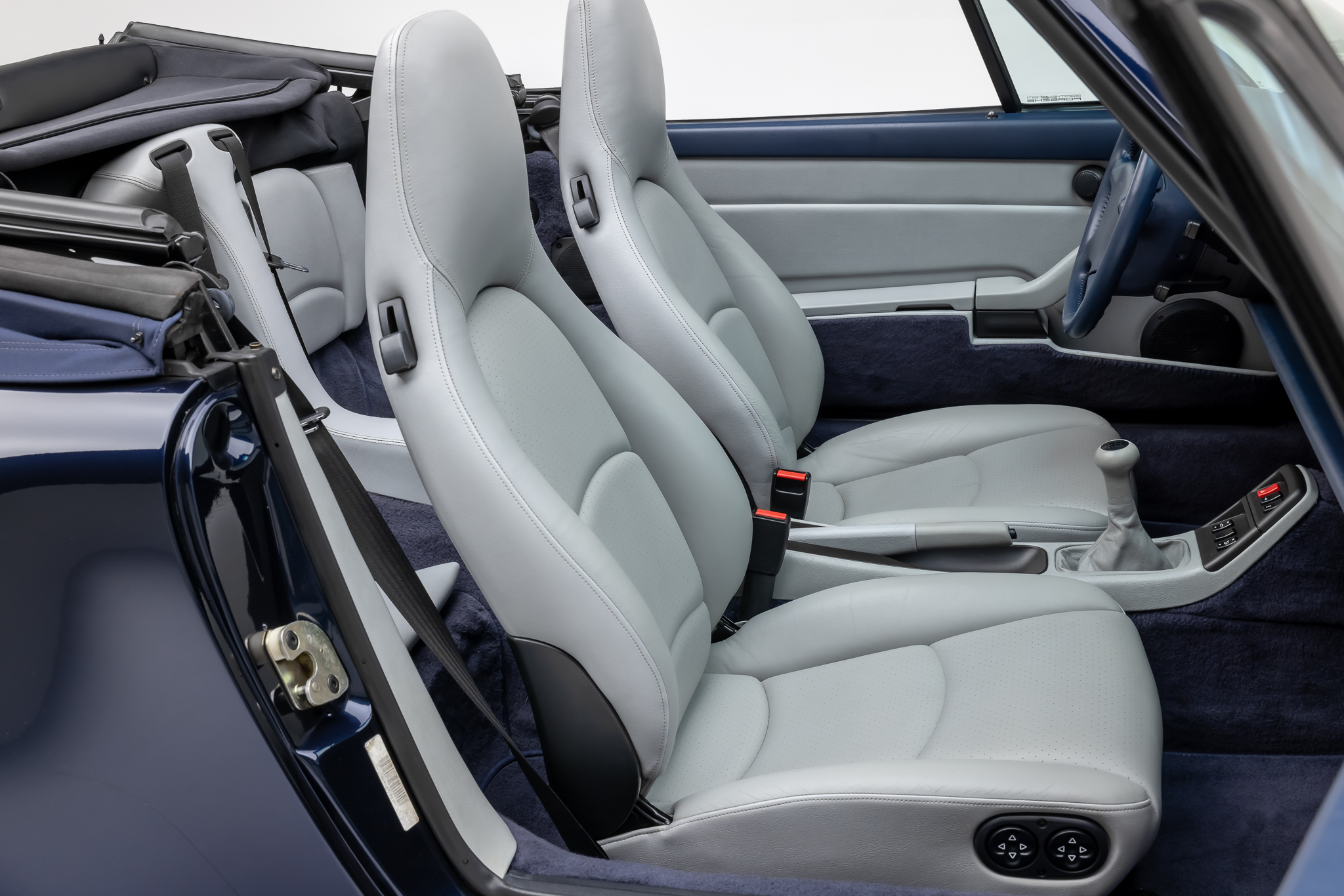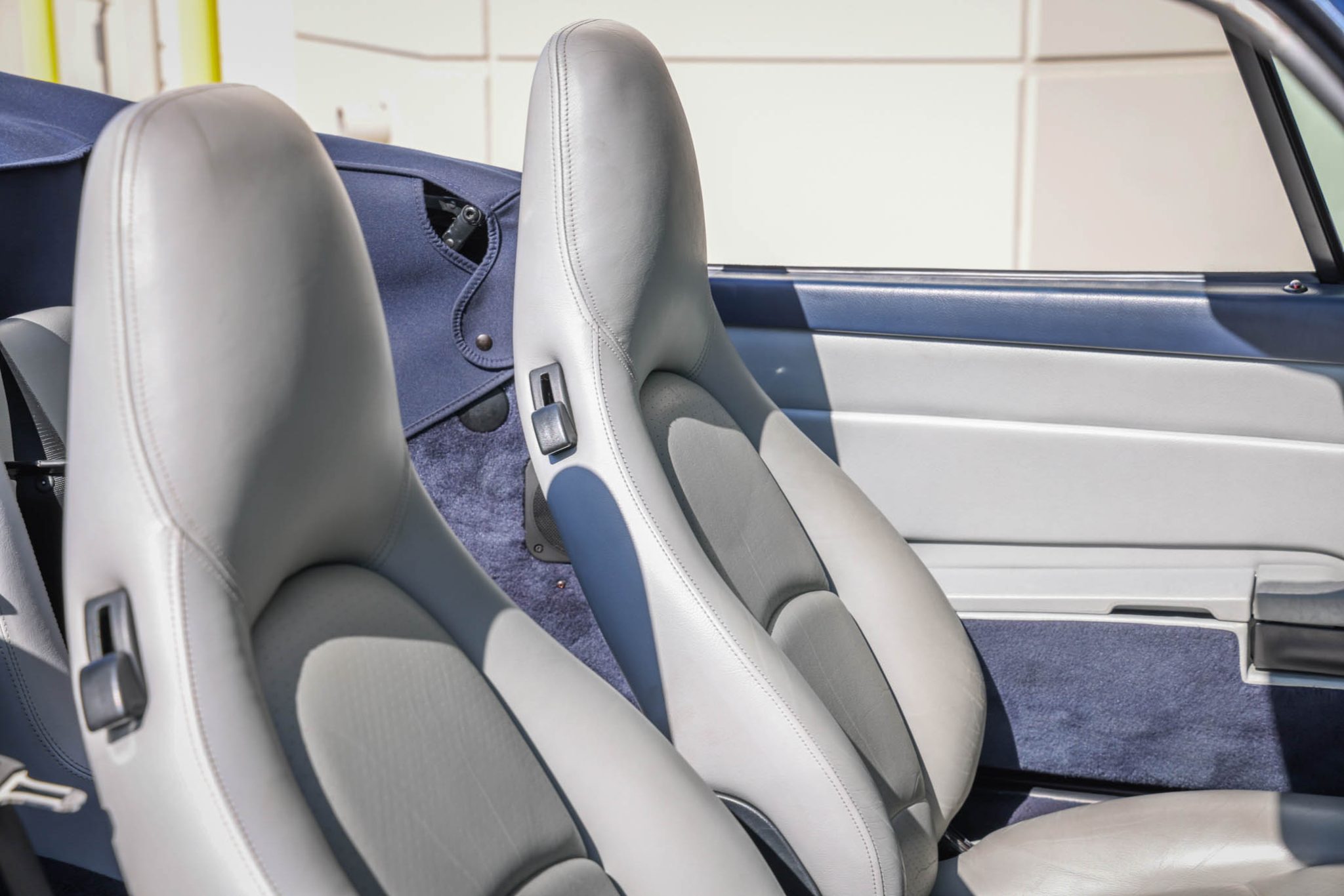 Finished in Midnight Blue Metallic over Marble Grey partial leather upholstery, the car is powered by a 3.6-liter flat-six paired with a six-speed manual transaxle. Additional equipment includes 17″ Cup II wheels, a blue soft top, headlight washers, power-adjustable front seats, air conditioning, cruise control, and a PCCM infotainment unit with Bluetooth.