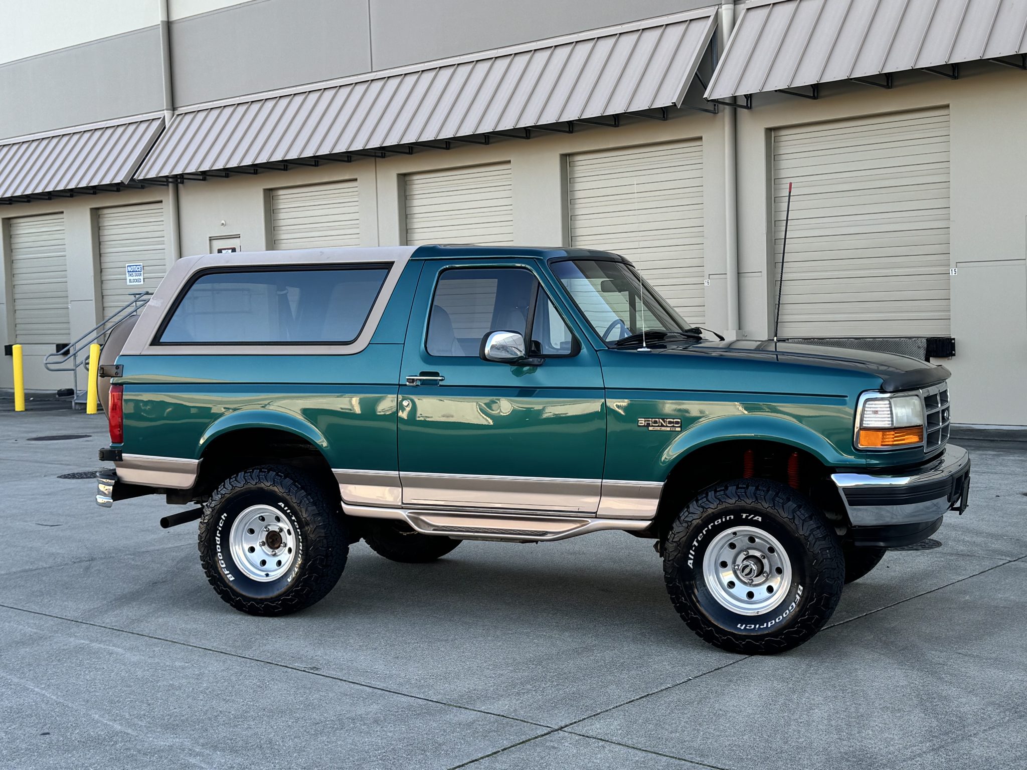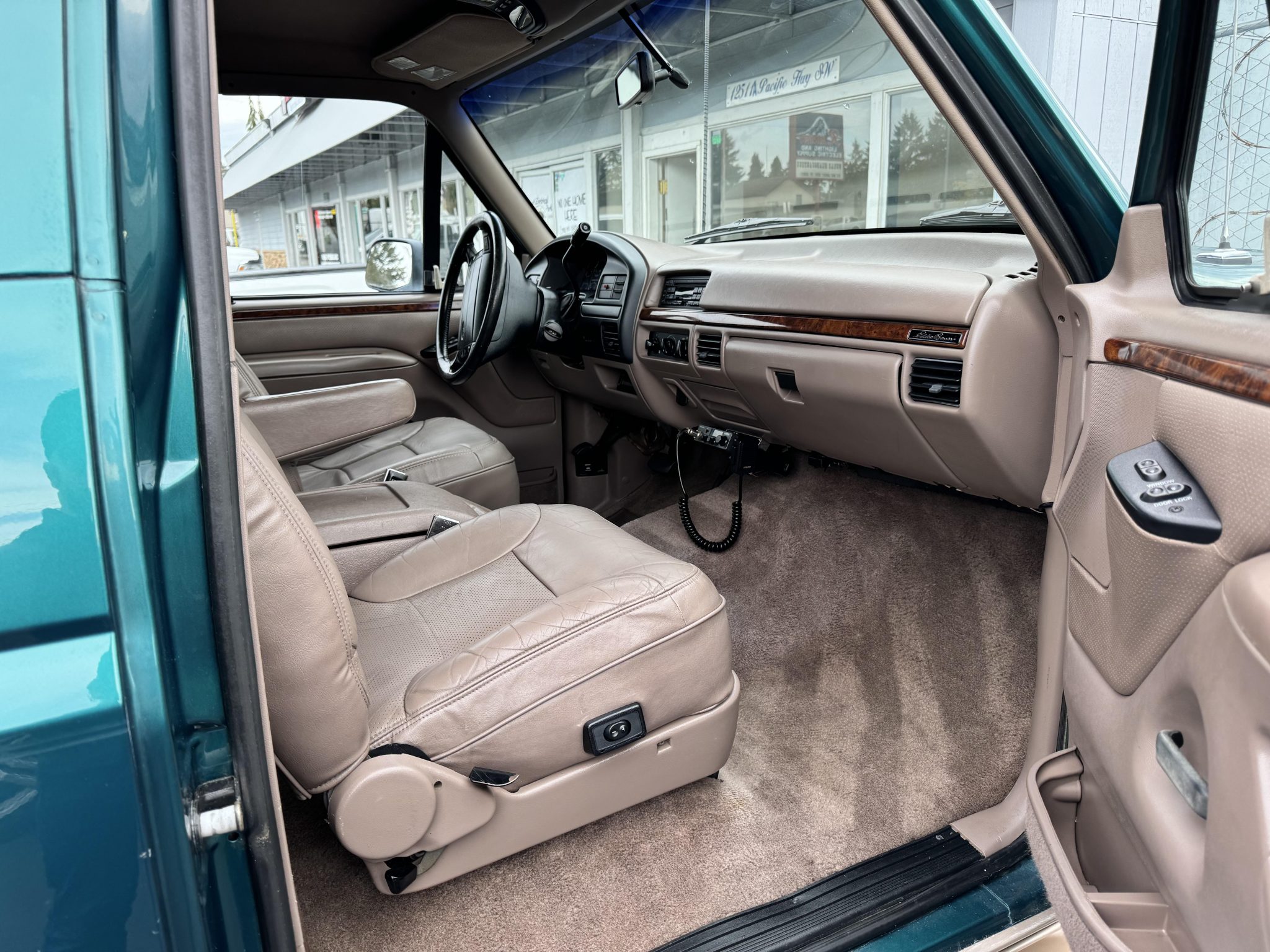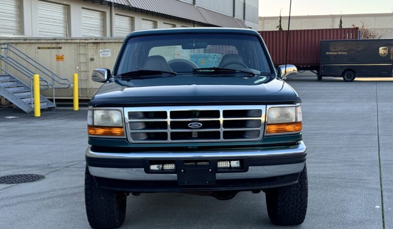 This 1996 Ford Bronco Eddie Bauer is powered by a 5.8-liter V8 linked with a four-speed automatic transmission and a dual-range transfer case. The truck is finished in Pacific Green Clearcoat Metallic and Light Saddle Clearcoat Metallic over Medium Mocha leather and is equipped with manually locking front hubs, aftermarket 15″ aluminum wheels, a lift kit, a CD stereo, power windows, a power tailgate window, and air conditioning. It has 114k miles