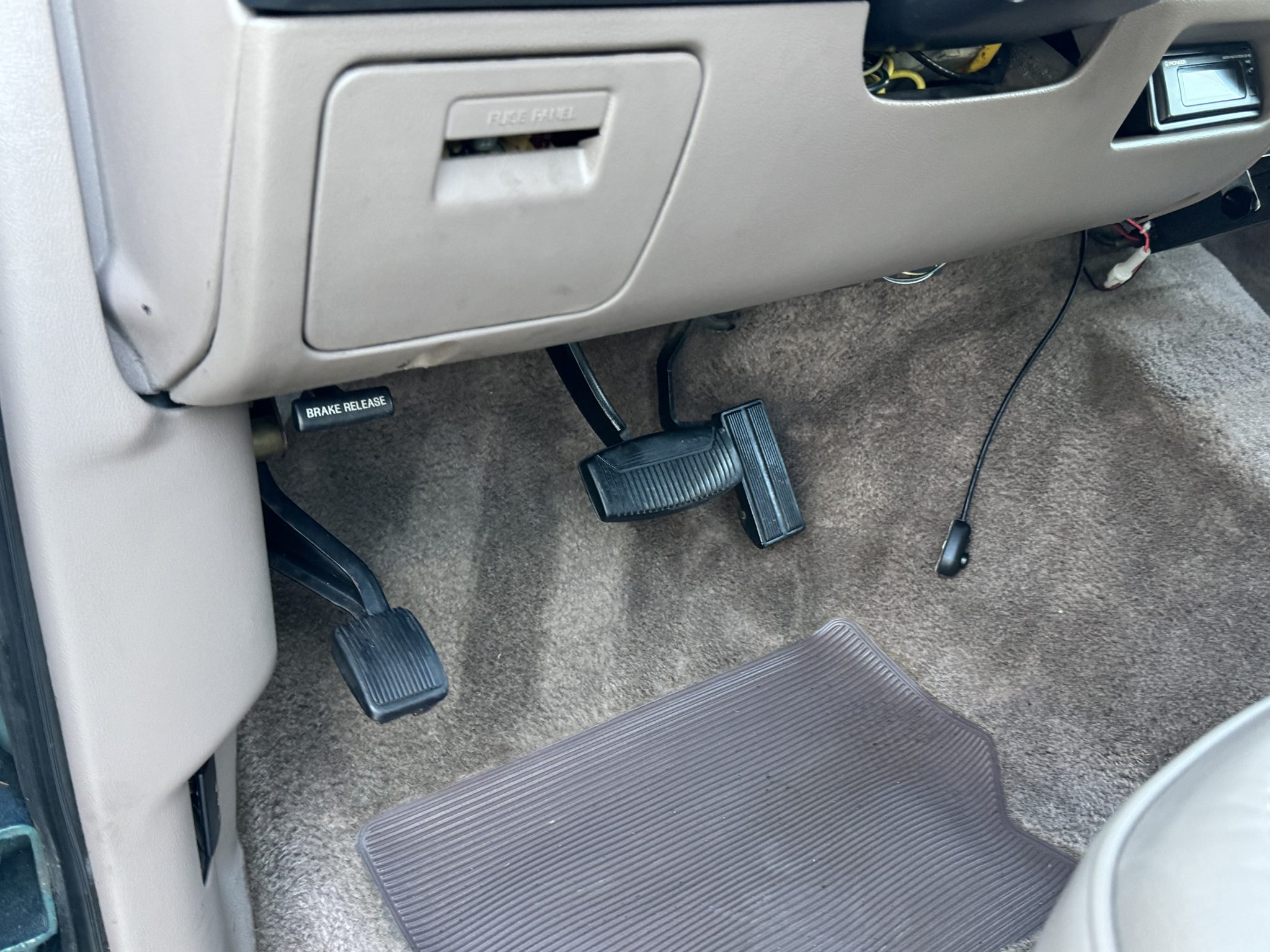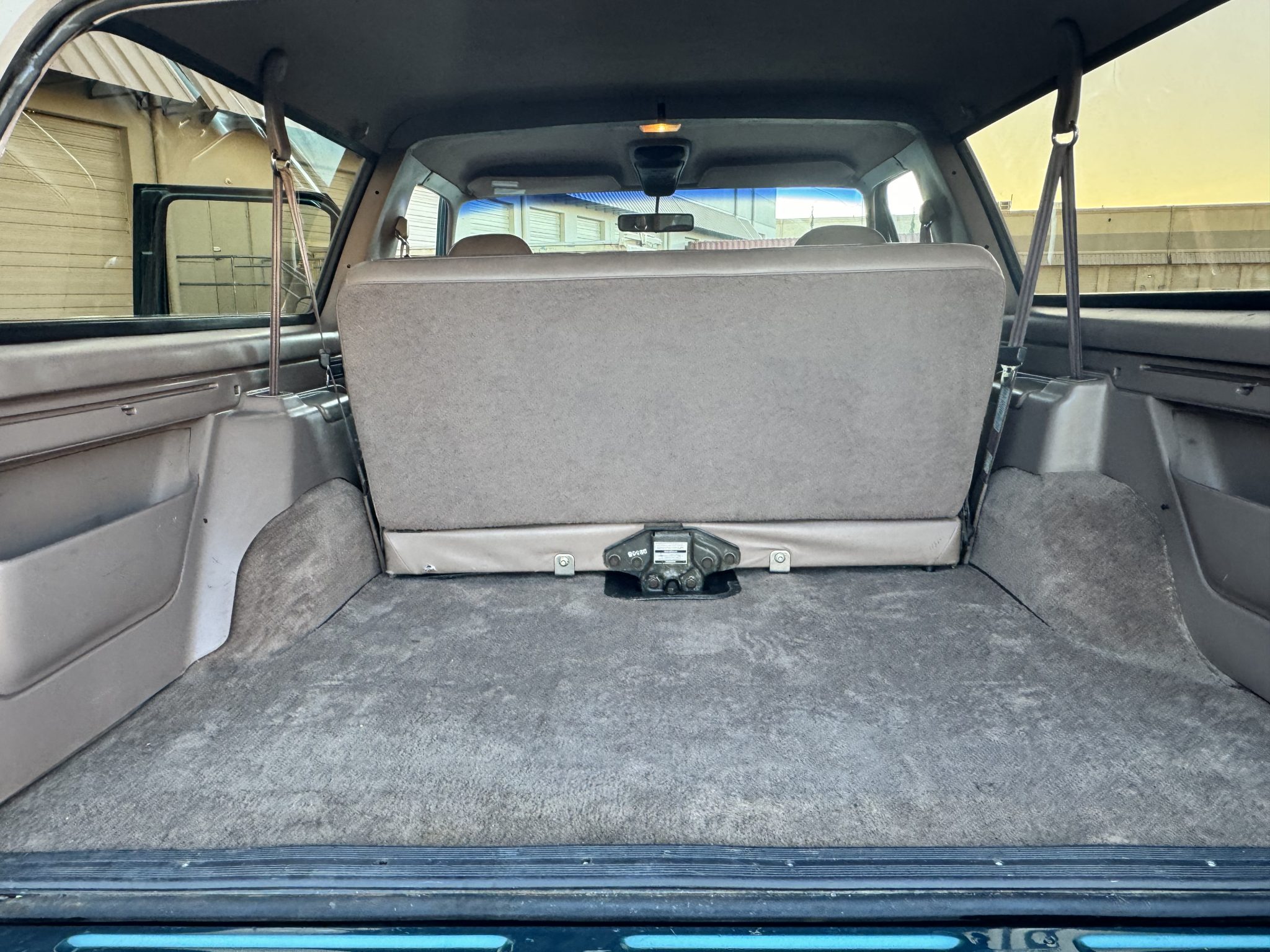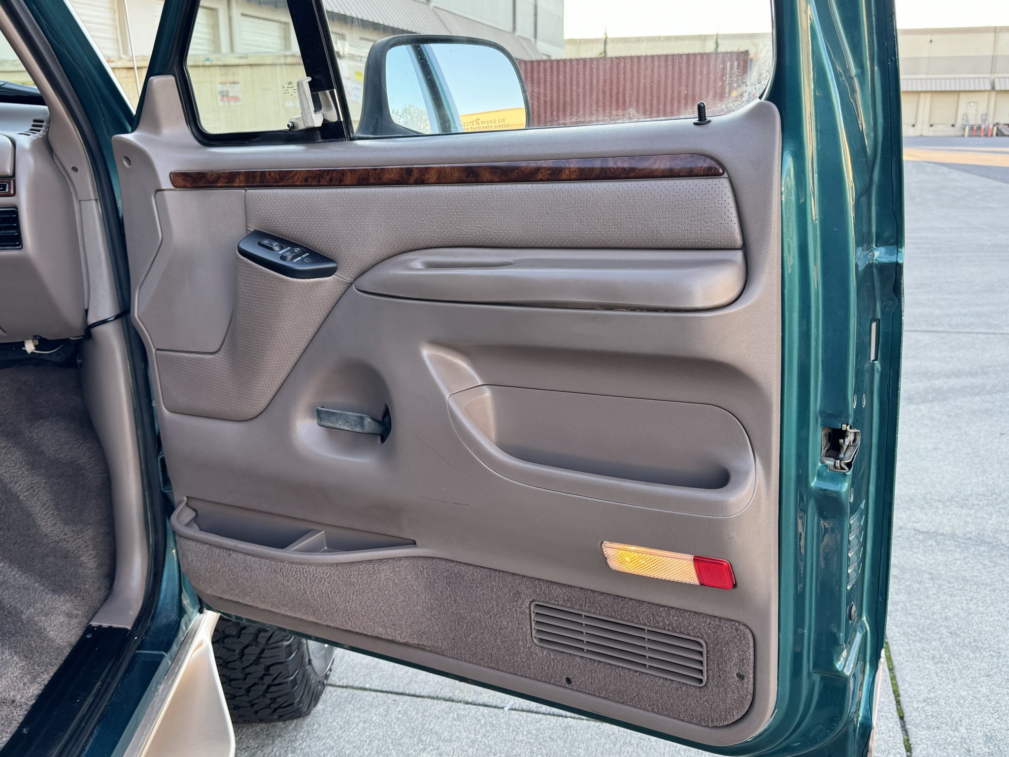 This 1996 Ford Bronco Eddie Bauer is powered by a 5.8-liter V8 linked with a four-speed automatic transmission and a dual-range transfer case. The truck is finished in Pacific Green Clearcoat Metallic and Light Saddle Clearcoat Metallic over Medium Mocha leather and is equipped with manually locking front hubs, aftermarket 15″ aluminum wheels, a lift kit, a CD stereo, power windows, a power tailgate window, and air conditioning. It has 114k miles