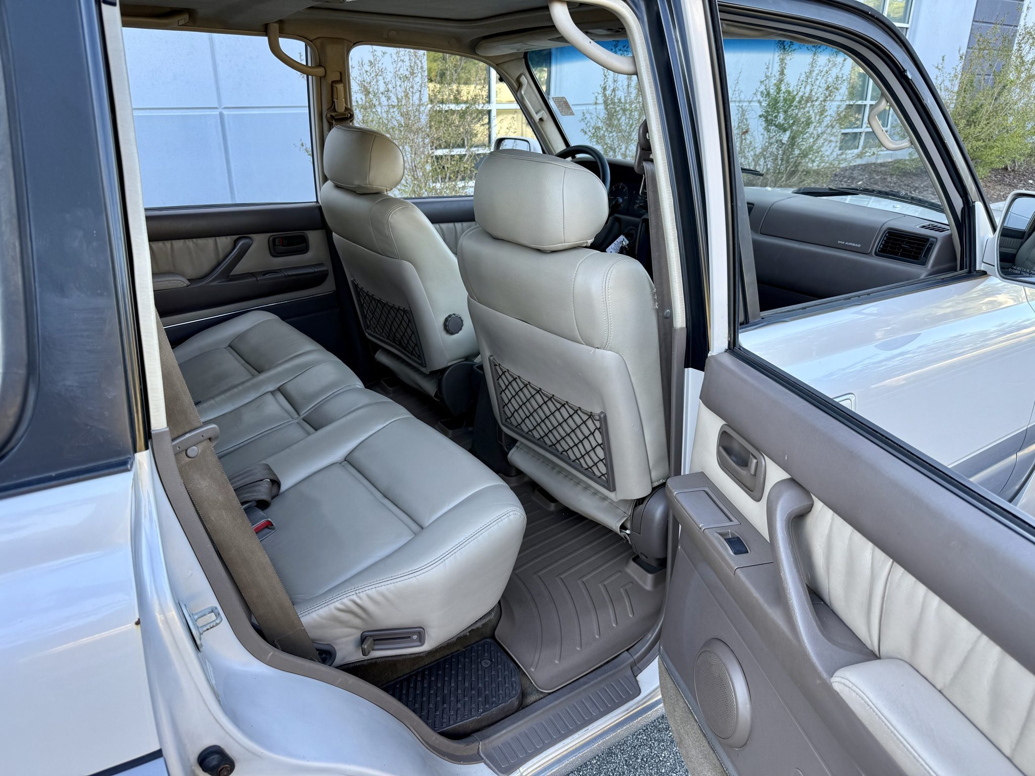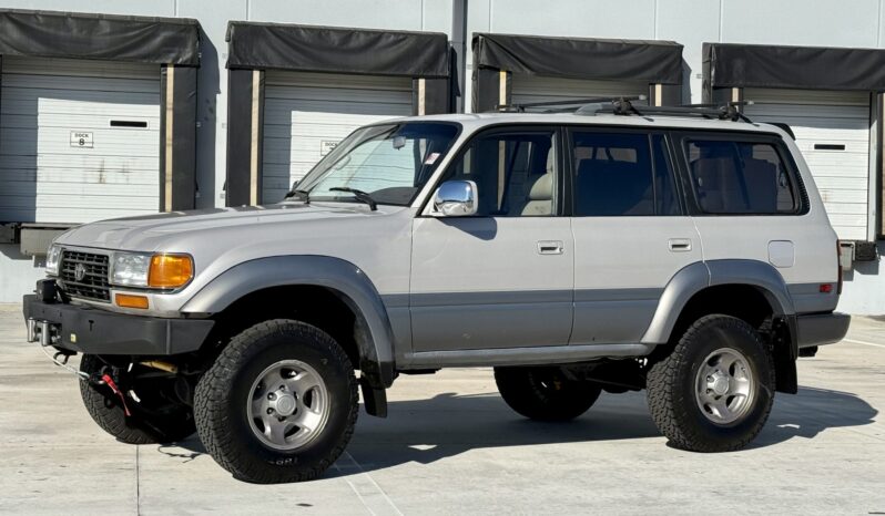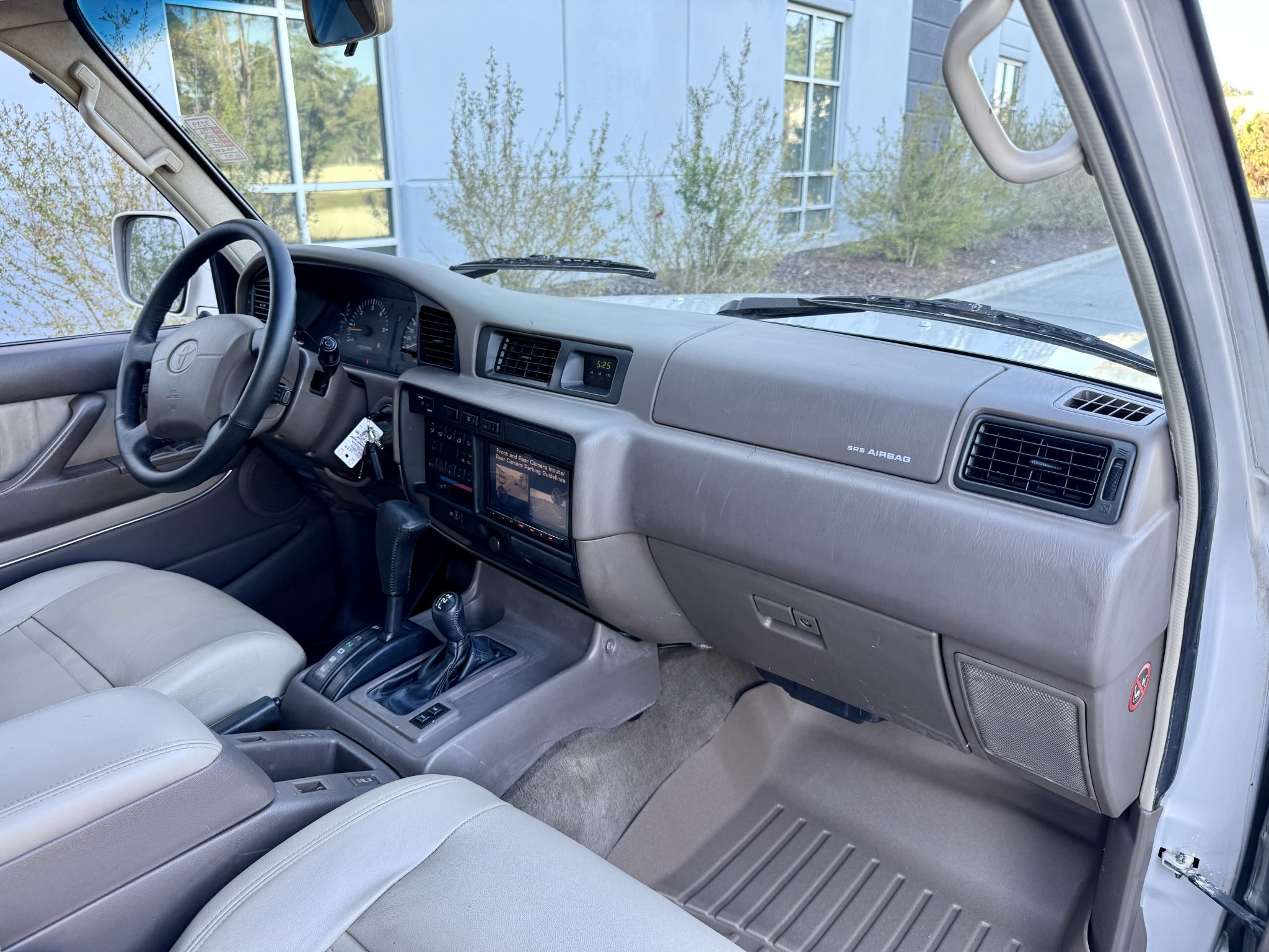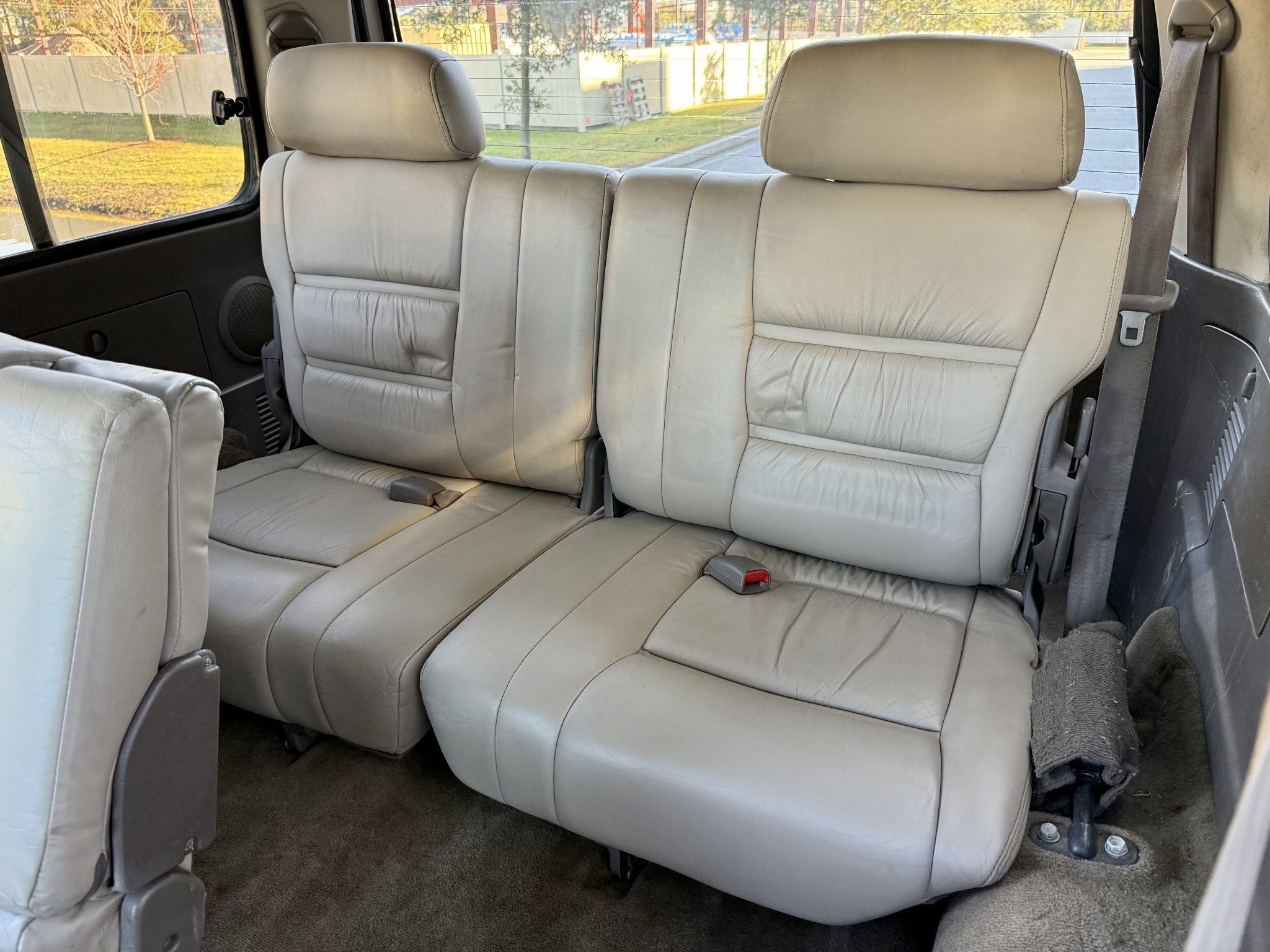 Finished in Desert Dune Pearl and Moonglow over aftermarket beige leather, the truck is powered by a 4.5L 1FZ-FE inline-six linked with a four-speed automatic transmission, a dual-range transfer case, and locking front, center, and rear differentials. It also has a receiver hitch, a rear wind deflector, a sunroof, a roof rack, a TJM front bumper, a Smittybilt winch, an Old Man Emu 3″ suspension lift kit, 16″ wheels, automatic climate control, cruise control, a digital clock, WeatherTech floor mats, power-adjustable front seats, folding third-row seats, and a Kenwood touchscreen stereo with Bluetooth connectivity.
