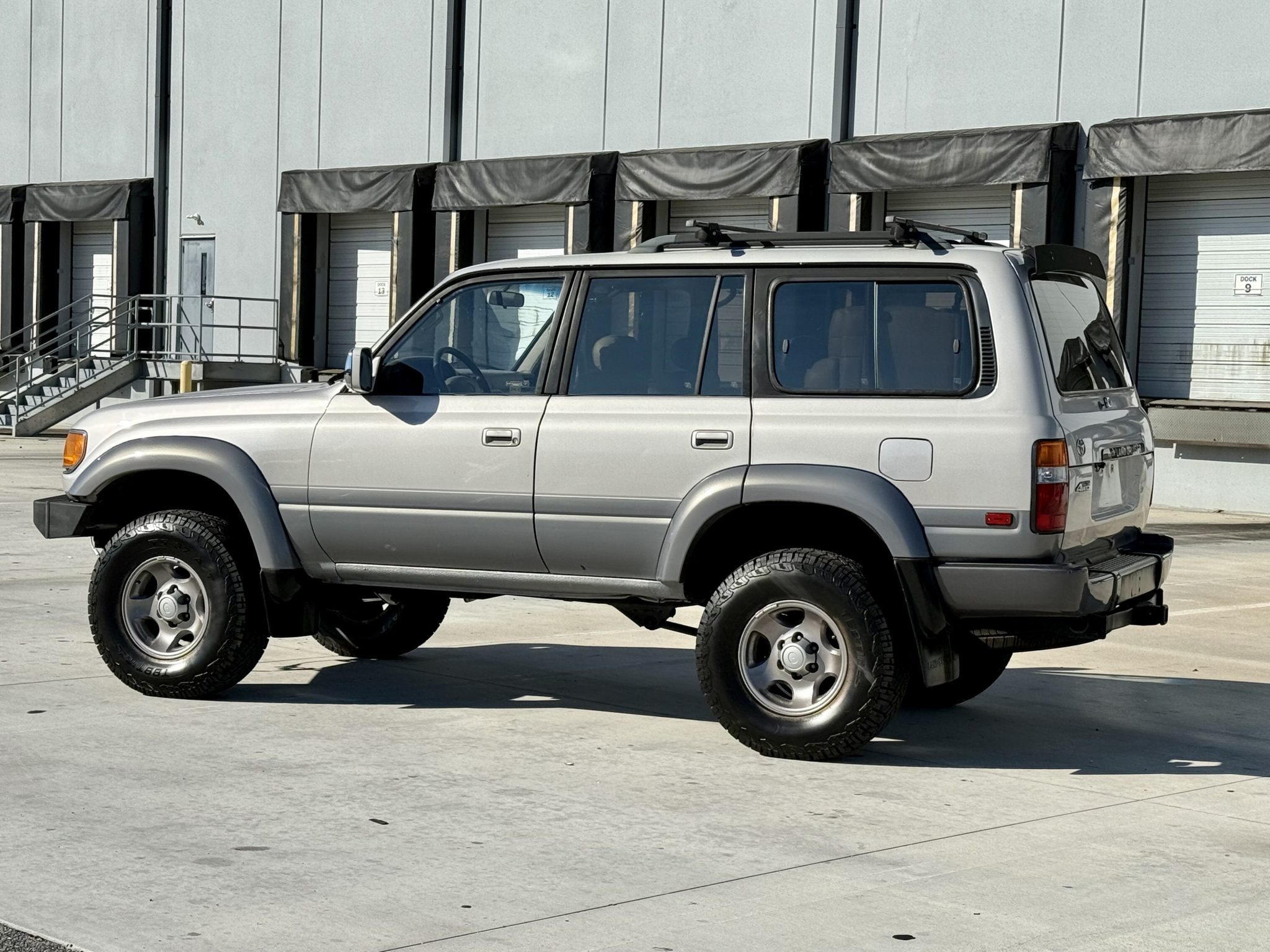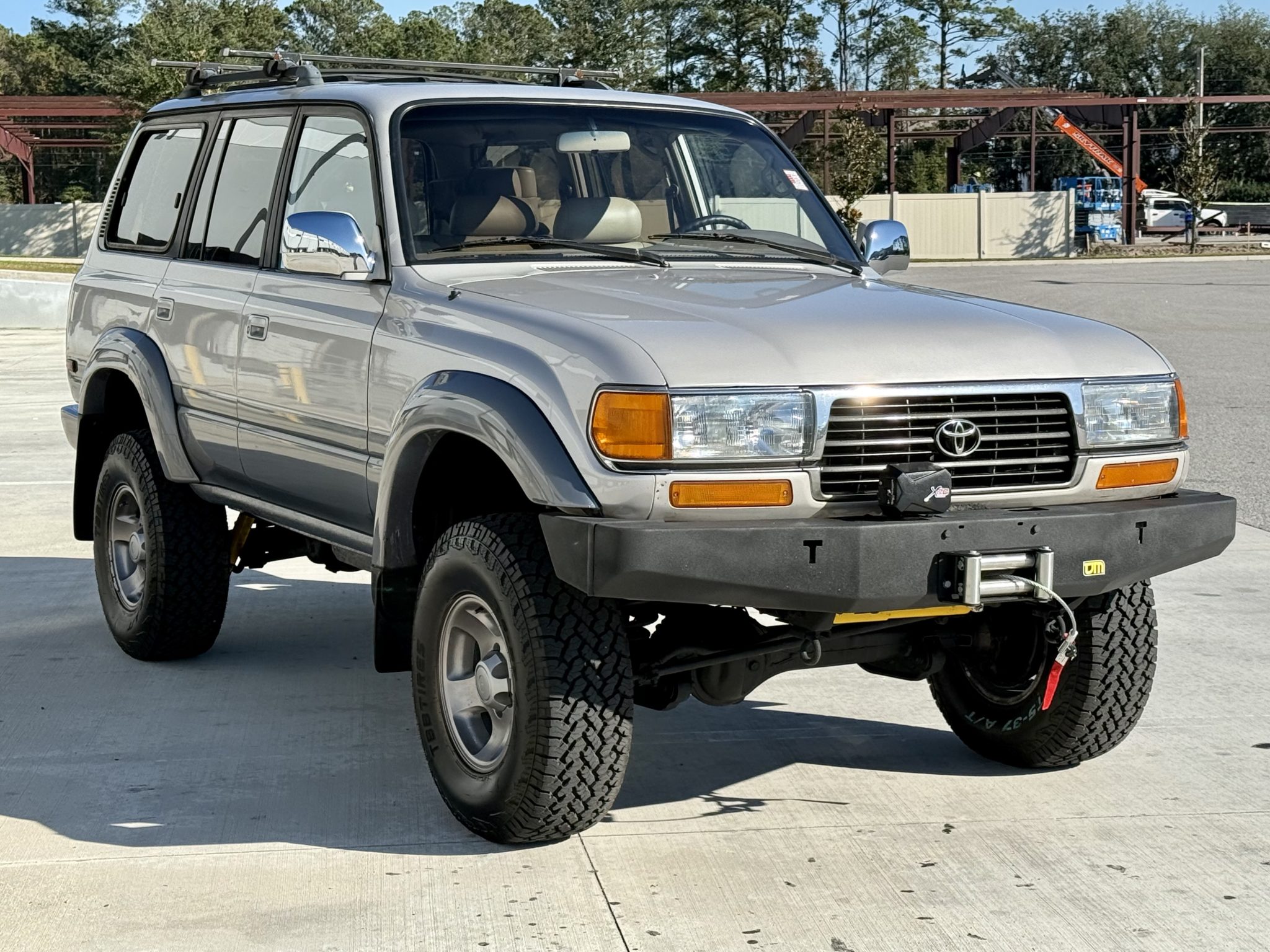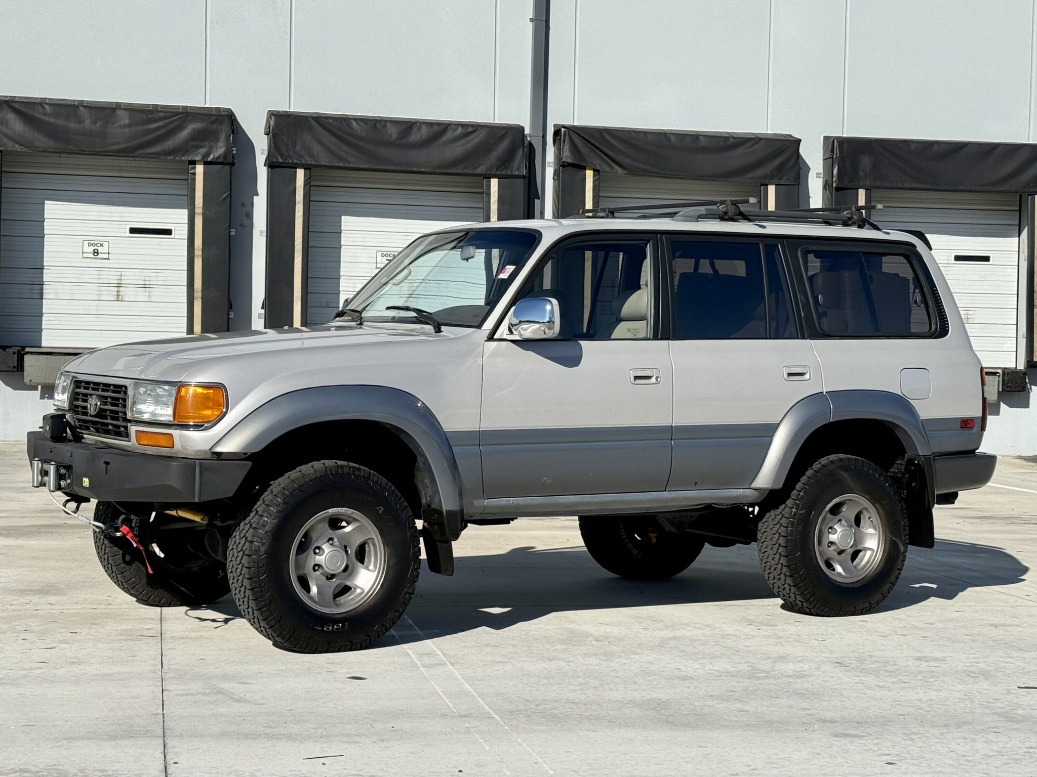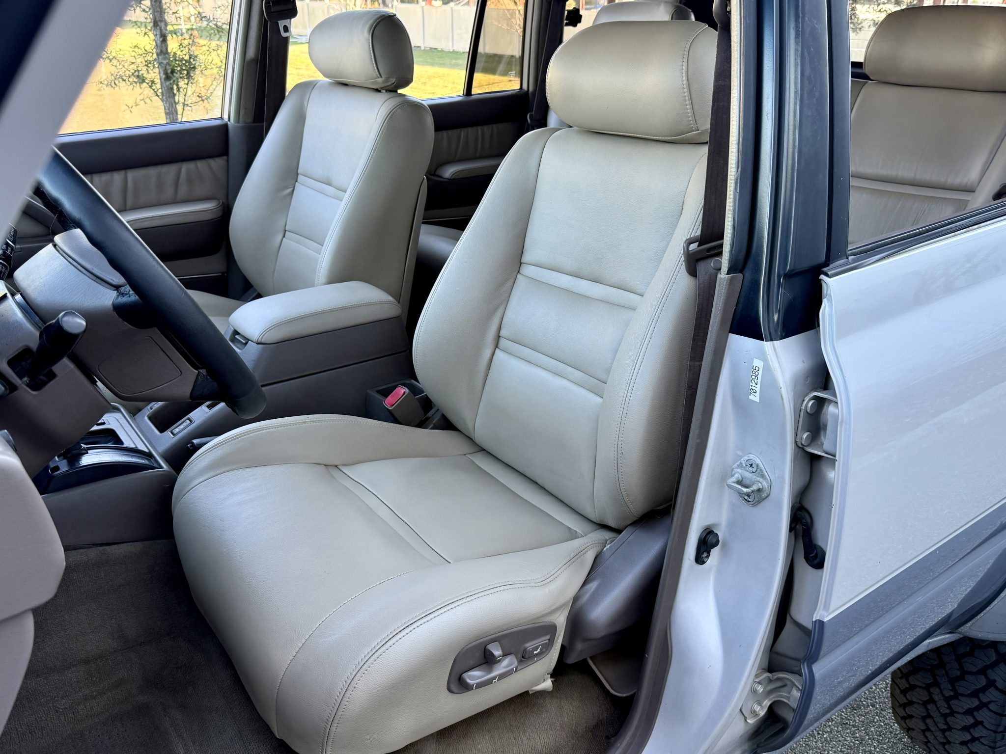 Finished in Desert Dune Pearl and Moonglow over aftermarket beige leather, the truck is powered by a 4.5L 1FZ-FE inline-six linked with a four-speed automatic transmission, a dual-range transfer case, and locking front, center, and rear differentials. It also has a receiver hitch, a rear wind deflector, a sunroof, a roof rack, a TJM front bumper, a Smittybilt winch, an Old Man Emu 3″ suspension lift kit, 16″ wheels, automatic climate control, cruise control, a digital clock, WeatherTech floor mats, power-adjustable front seats, folding third-row seats, and a Kenwood touchscreen stereo with Bluetooth connectivity.