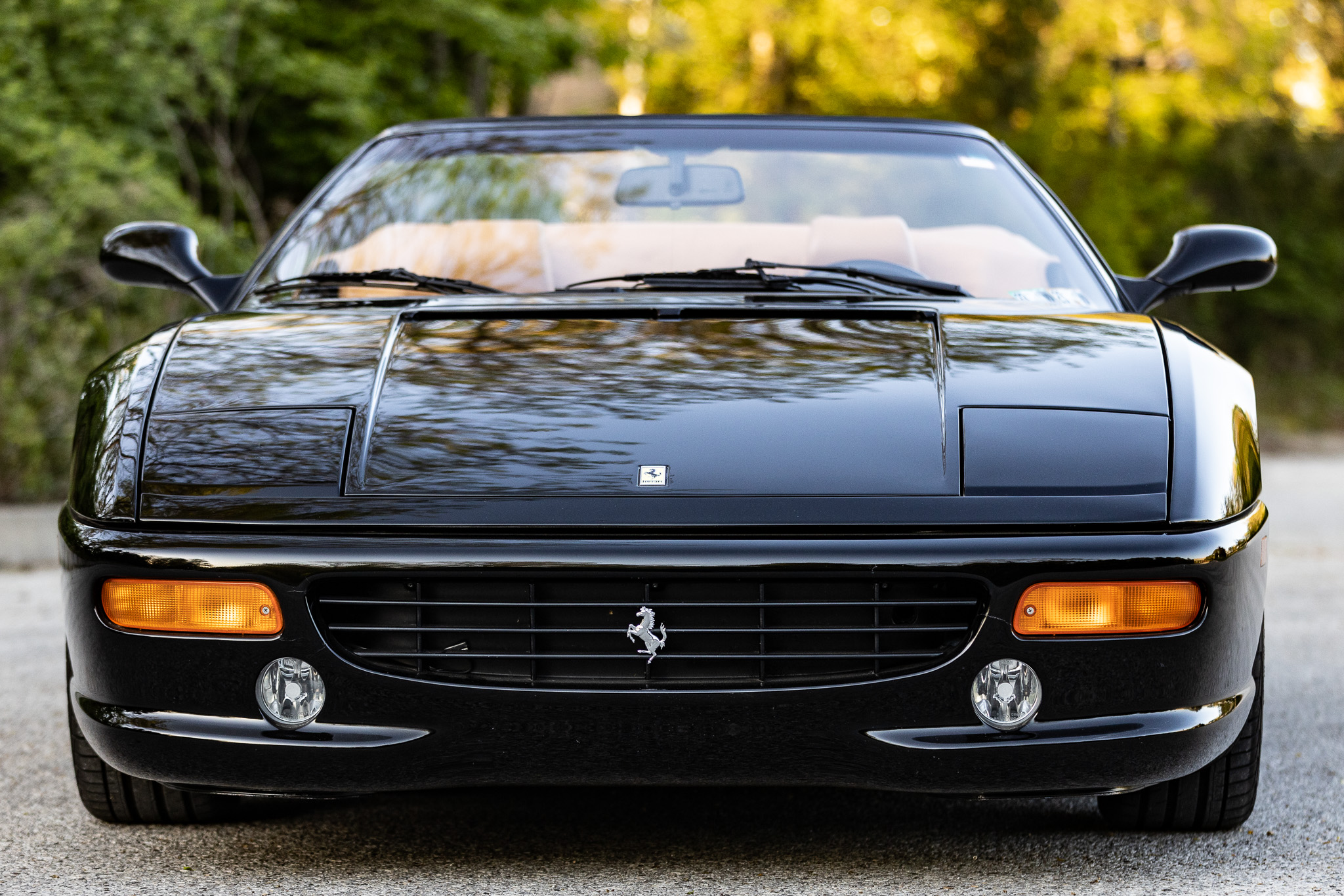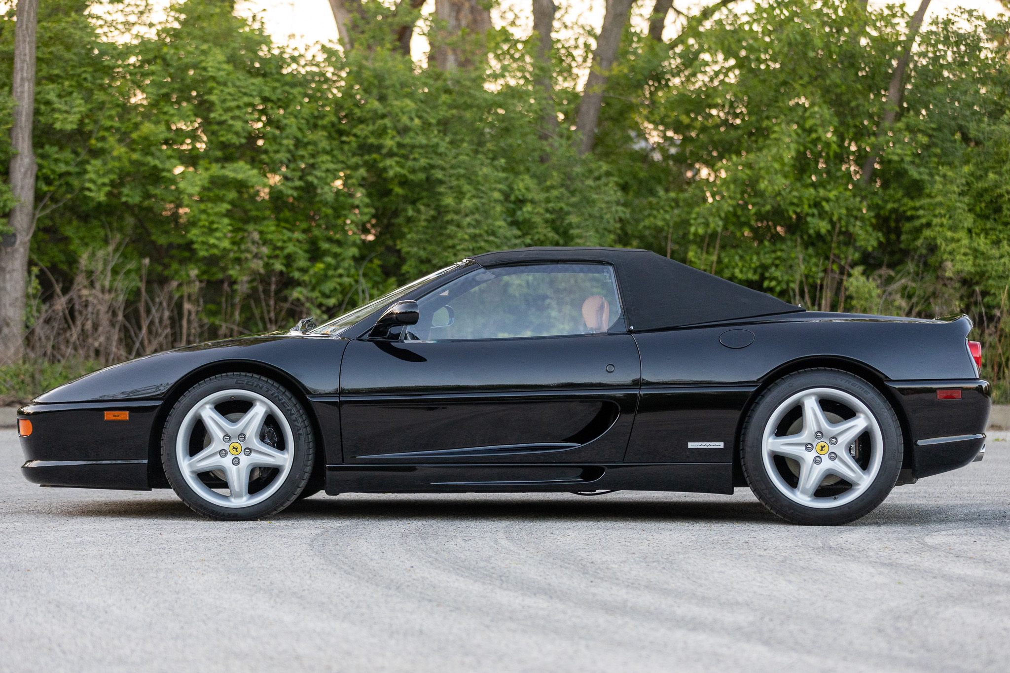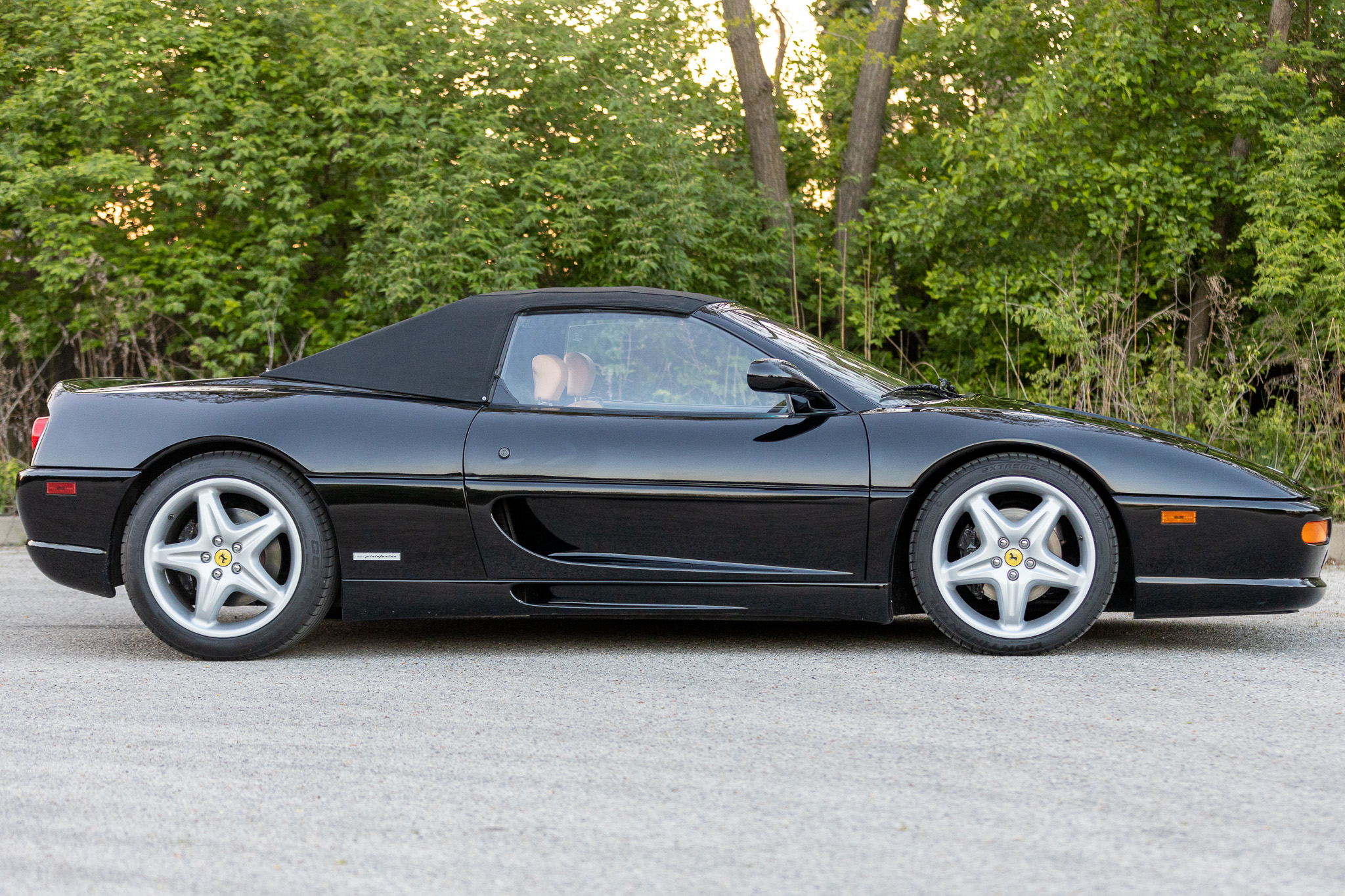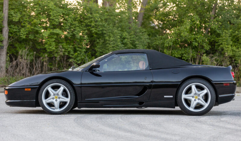 This 1997 Ferrari F355 Spider is finished in black over beige leather and is powered by a 3.5-liter DOHC V8 linked with a gated six-speed manual transaxle and a limited-slip differential. Equipment includes a black soft top, 18″ five-spoke magnesium wheels, pop-up headlights, and a Kenwood stereo hooked to a modified sound system.