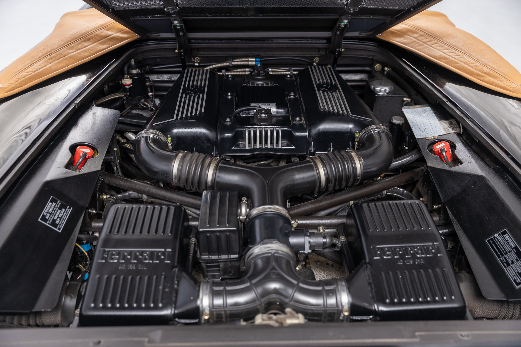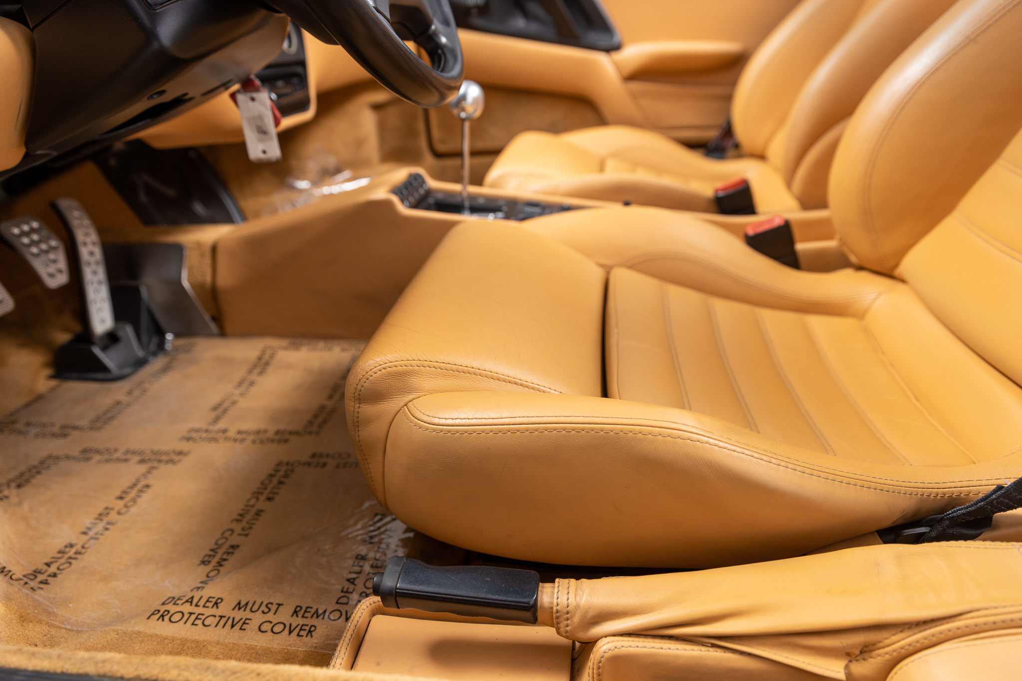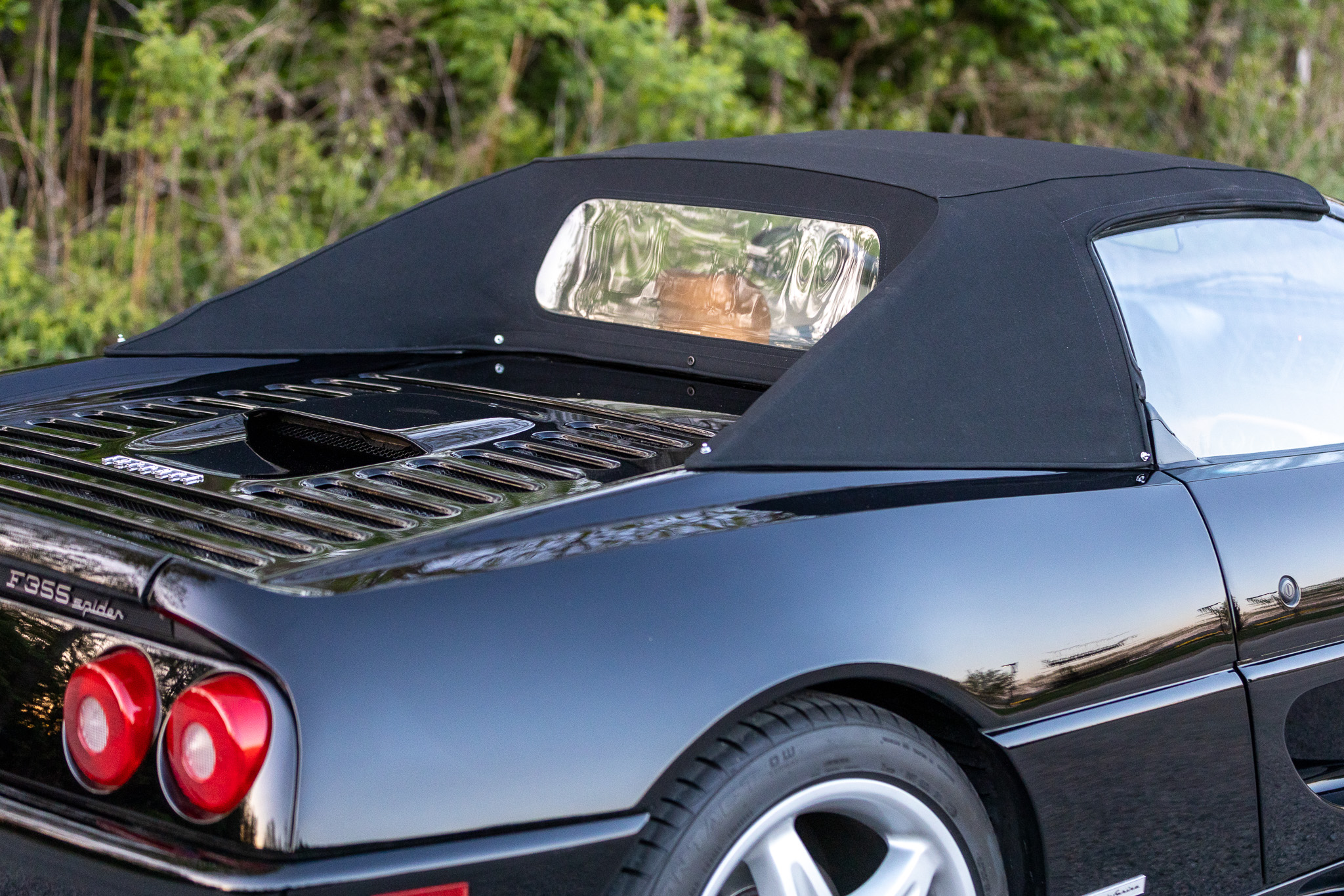 This 1997 Ferrari F355 Spider is finished in black over beige leather and is powered by a 3.5-liter DOHC V8 linked with a gated six-speed manual transaxle and a limited-slip differential. Equipment includes a black soft top, 18″ five-spoke magnesium wheels, pop-up headlights, and a Kenwood stereo hooked to a modified sound system.