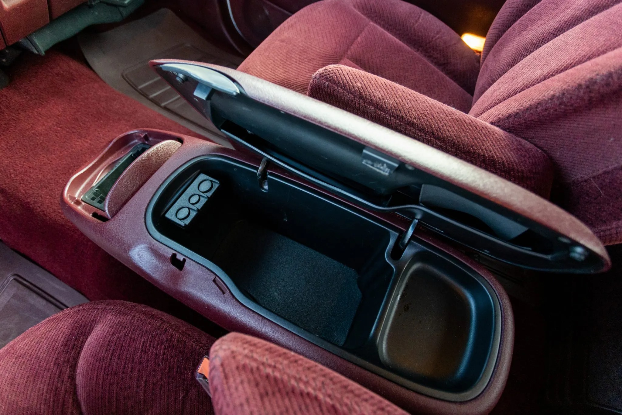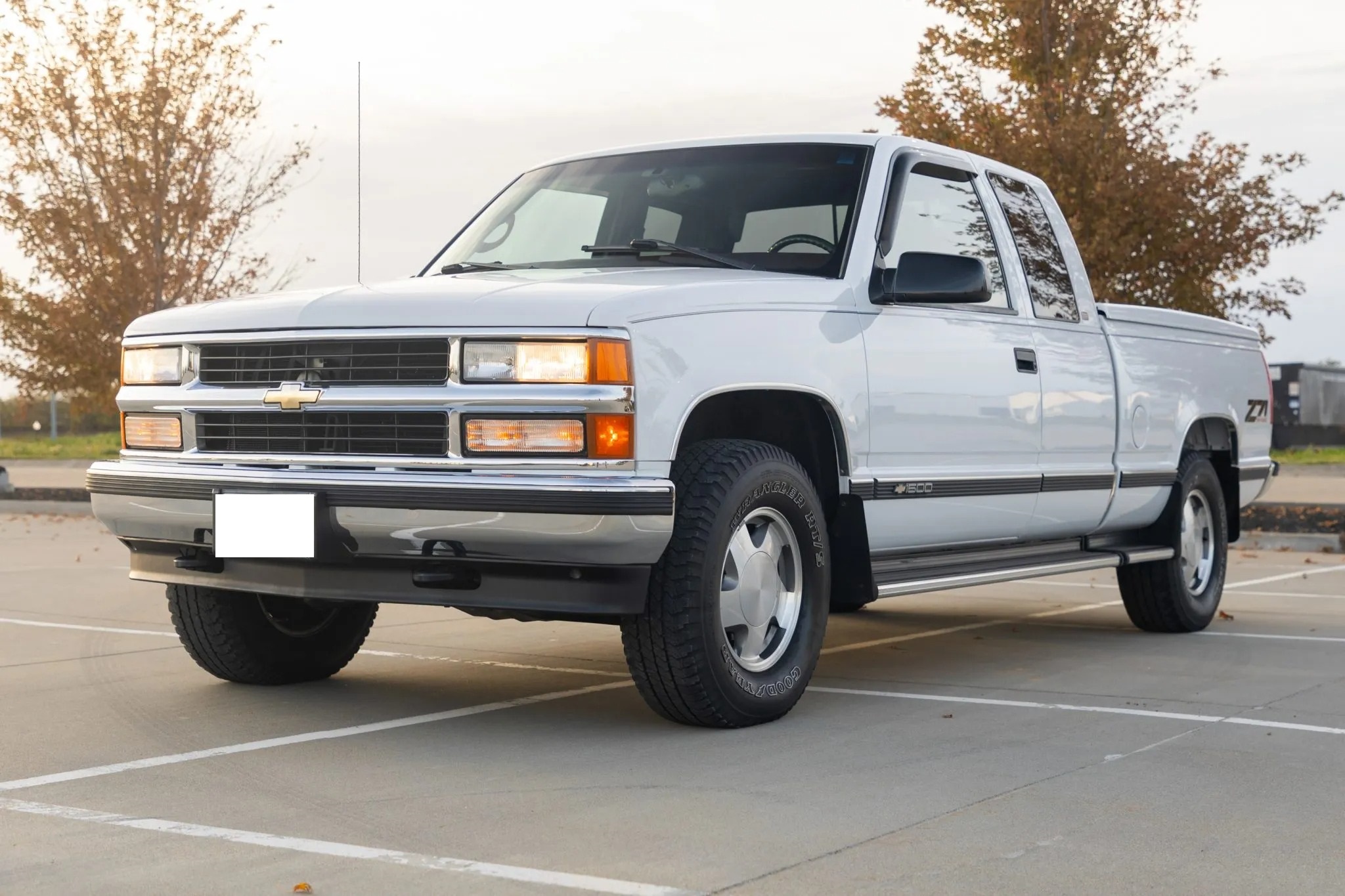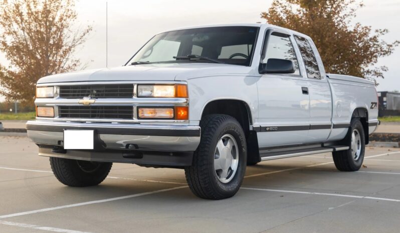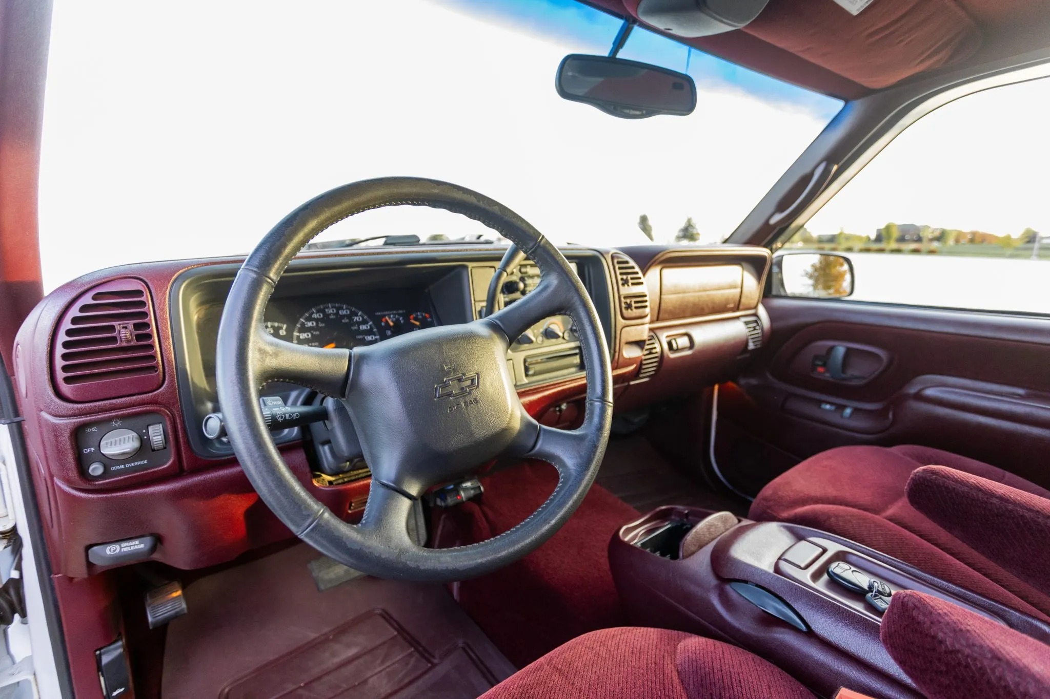 The truck is finished in Summit White over red cloth, and power is provided by a 5.7-liter V8 linked with a four-speed automatic transmission, a dual-range transfer case, and a locking rear differential. Features include running boards, a Leer tonneau cover, a receiver hitch, 16″ five-spoke alloy wheels, power-adjustable front bucket seats, a cassette stereo, a CD player, cruise control, an aftermarket trailer brake controller, and air conditioning. This GMT400 pickup shows 41k miles, and it is now offered with the owner’s manual, service records