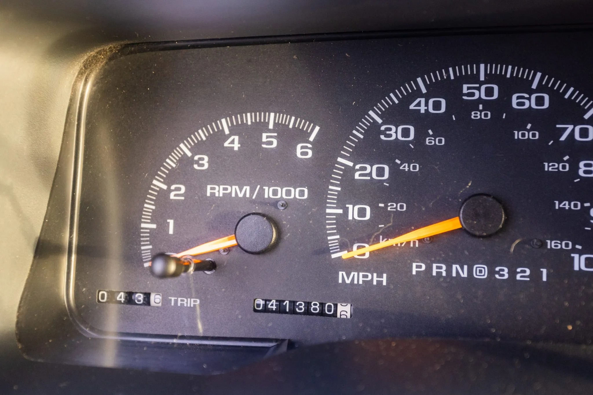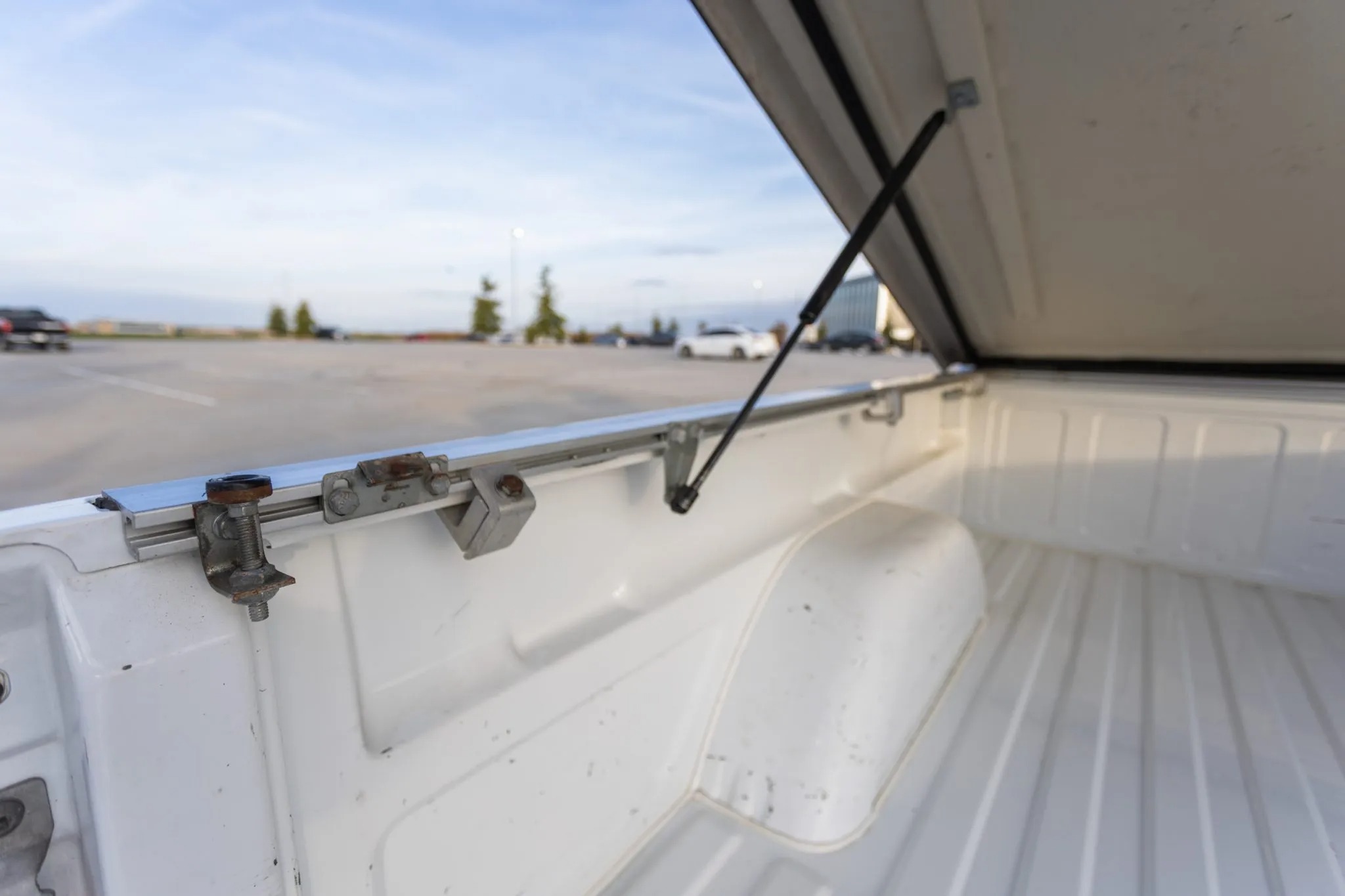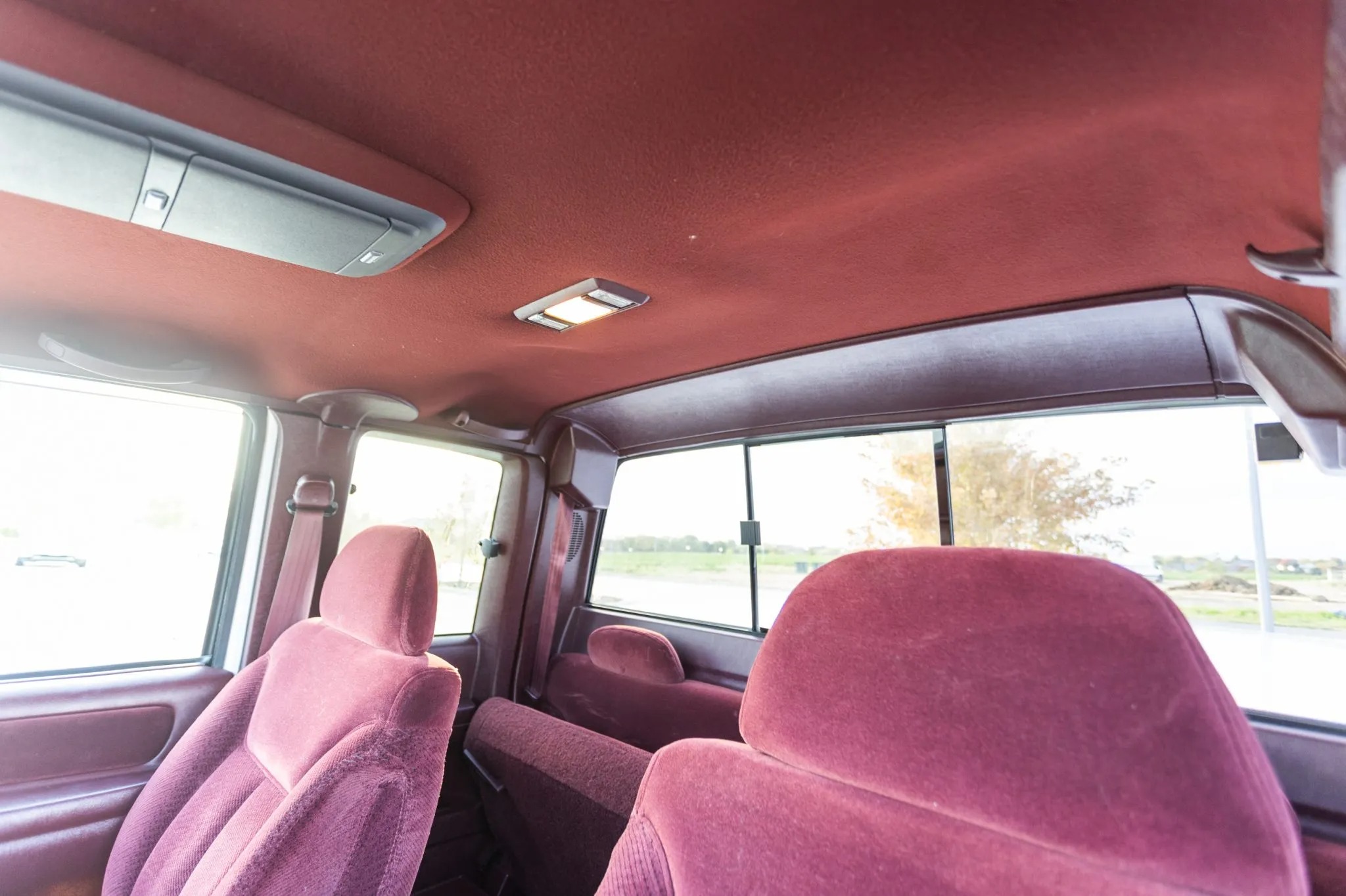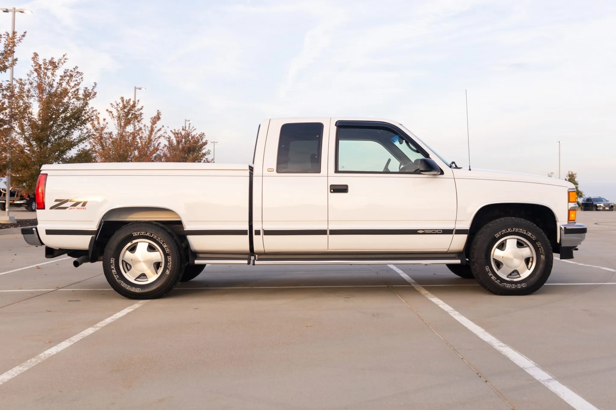 The truck is finished in Summit White over red cloth, and power is provided by a 5.7-liter V8 linked with a four-speed automatic transmission, a dual-range transfer case, and a locking rear differential. Features include running boards, a Leer tonneau cover, a receiver hitch, 16″ five-spoke alloy wheels, power-adjustable front bucket seats, a cassette stereo, a CD player, cruise control, an aftermarket trailer brake controller, and air conditioning. This GMT400 pickup shows 41k miles, and it is now offered with the owner’s manual, service records