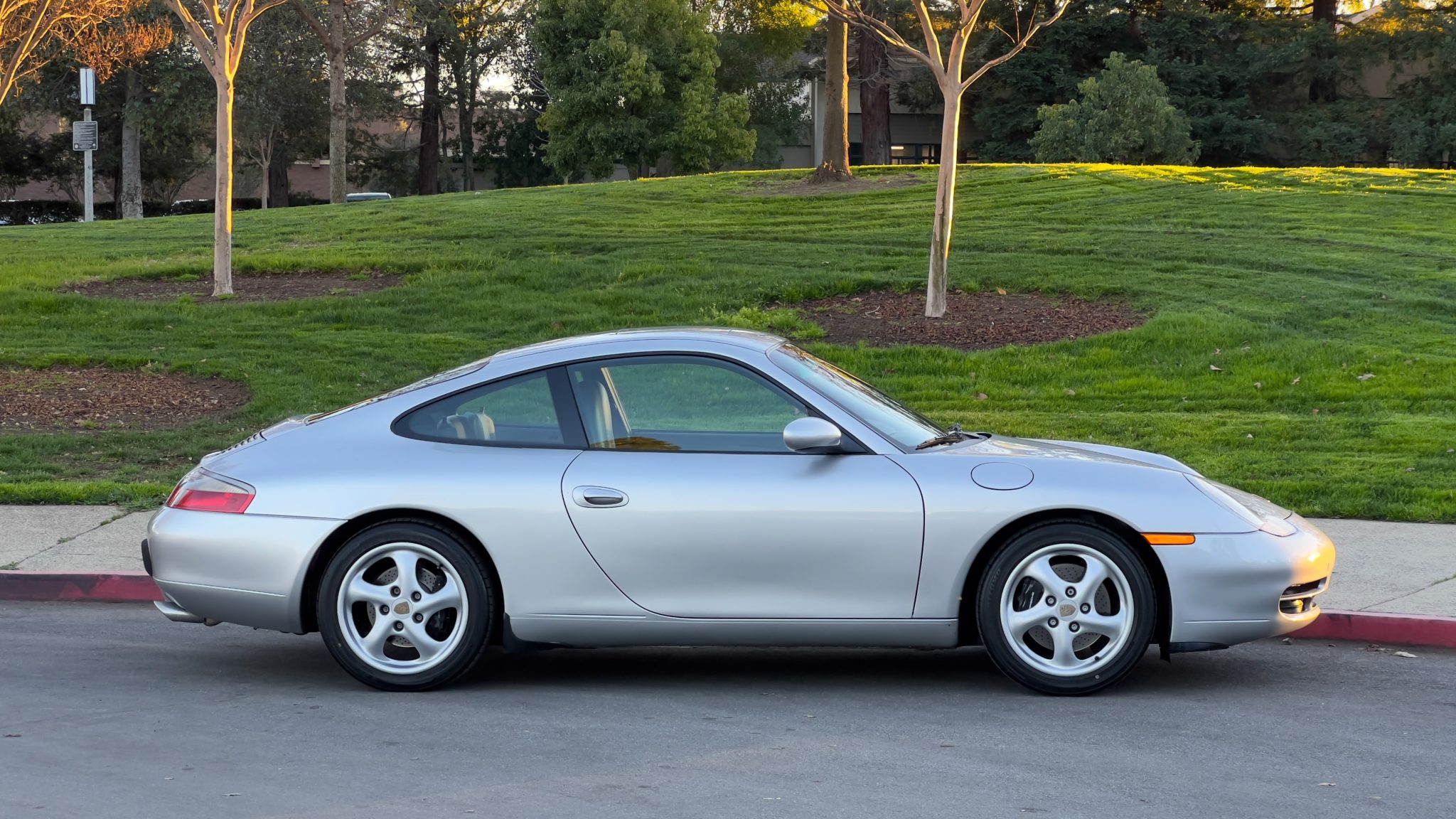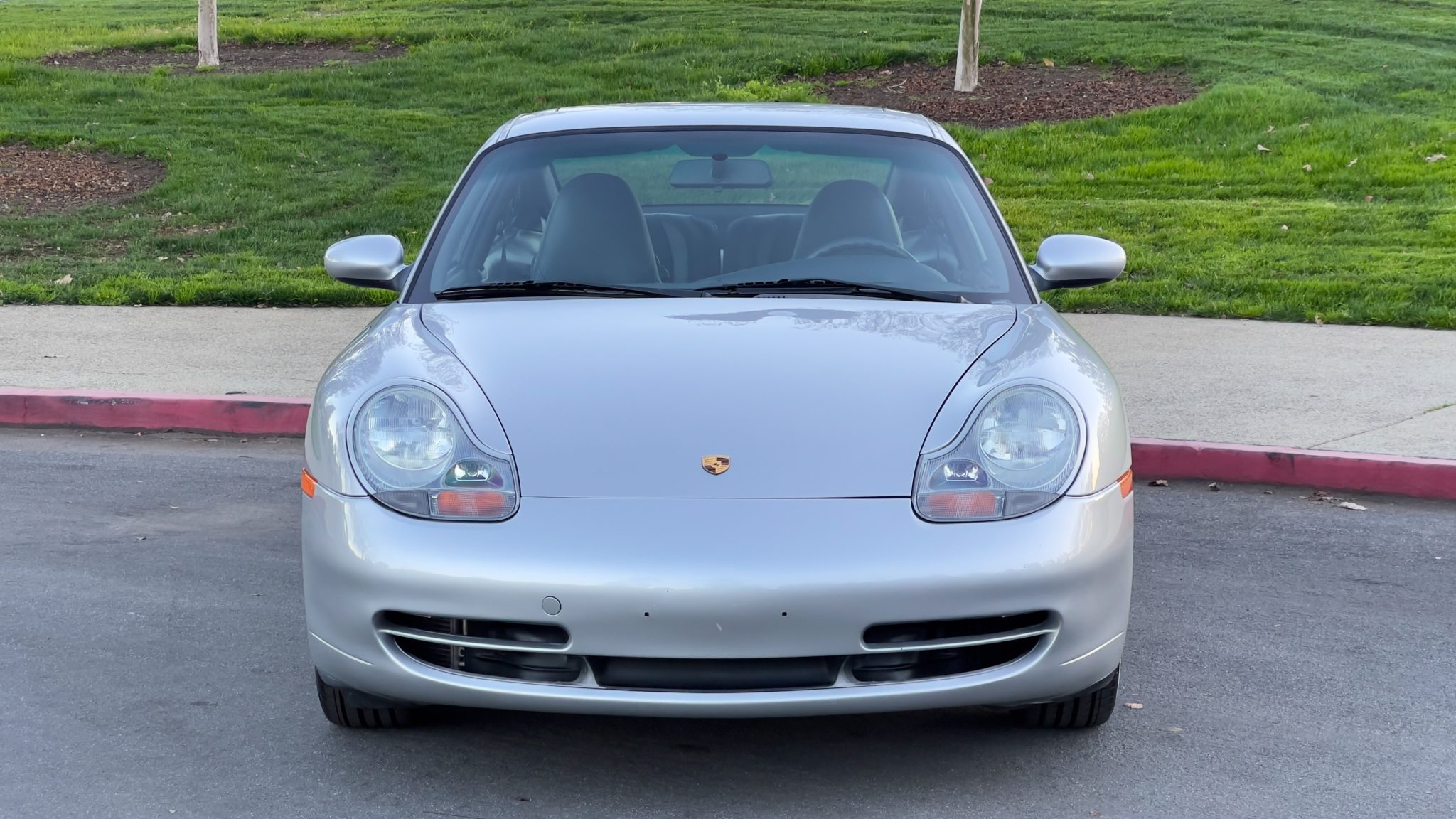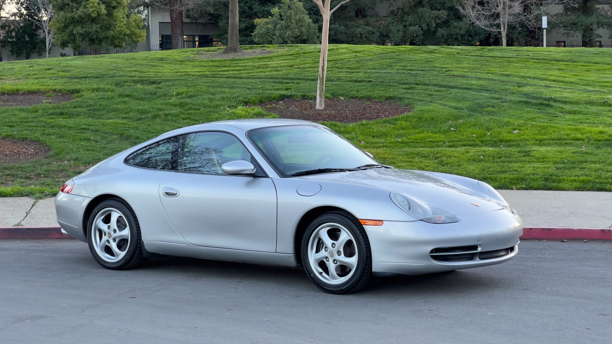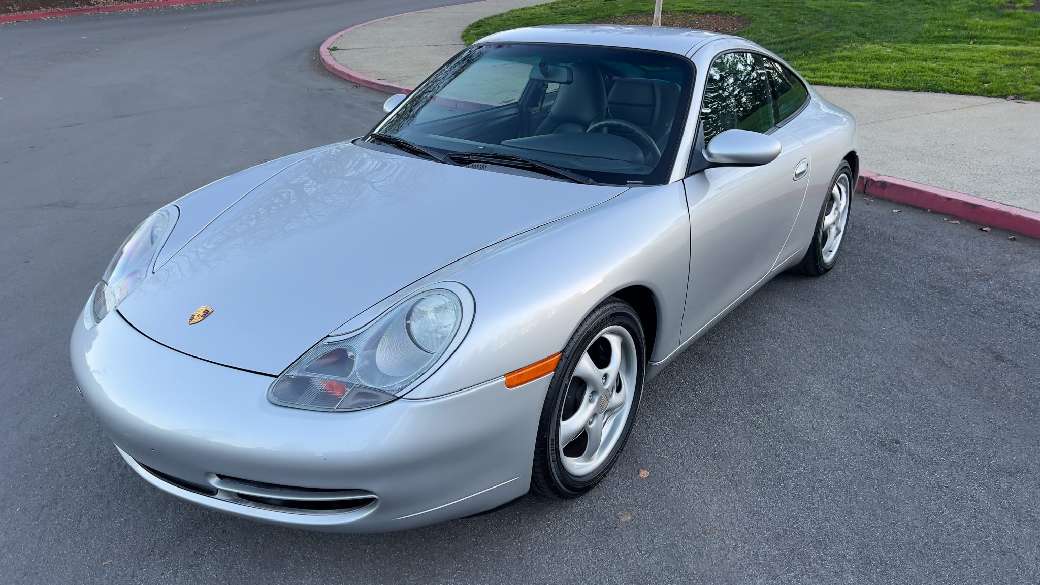 This 1999 Porsche 911 Carrera coupe was specified in Arctic Silver over Space Grey leather, and it was optioned with traction control, a limited-slip differential, and an Automatic Braking Differential (ABD). Power comes from a 3.4-liter M96 flat-six paired with a six-speed manual transaxle, while additional details include a sunroof, 17″ turbo-look alloy wheels, heated power-adjustable front seats, driver’s position memory, automatic climate control, and a touchscreen Sony head unit.