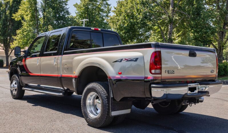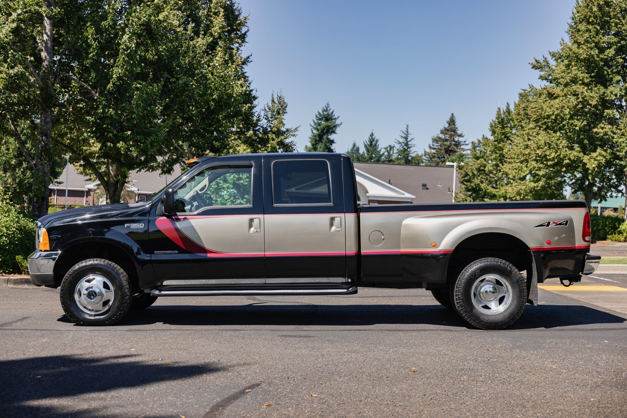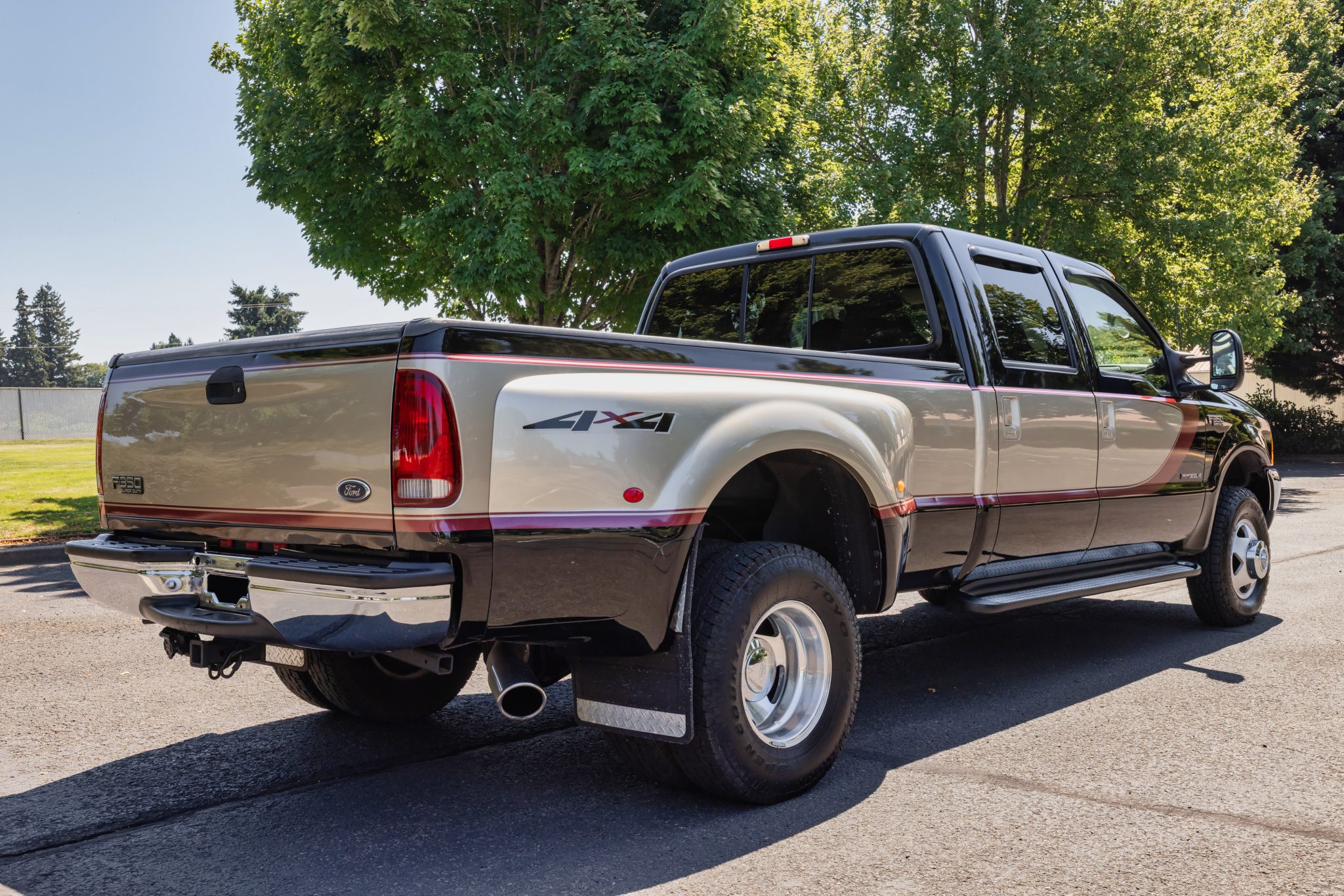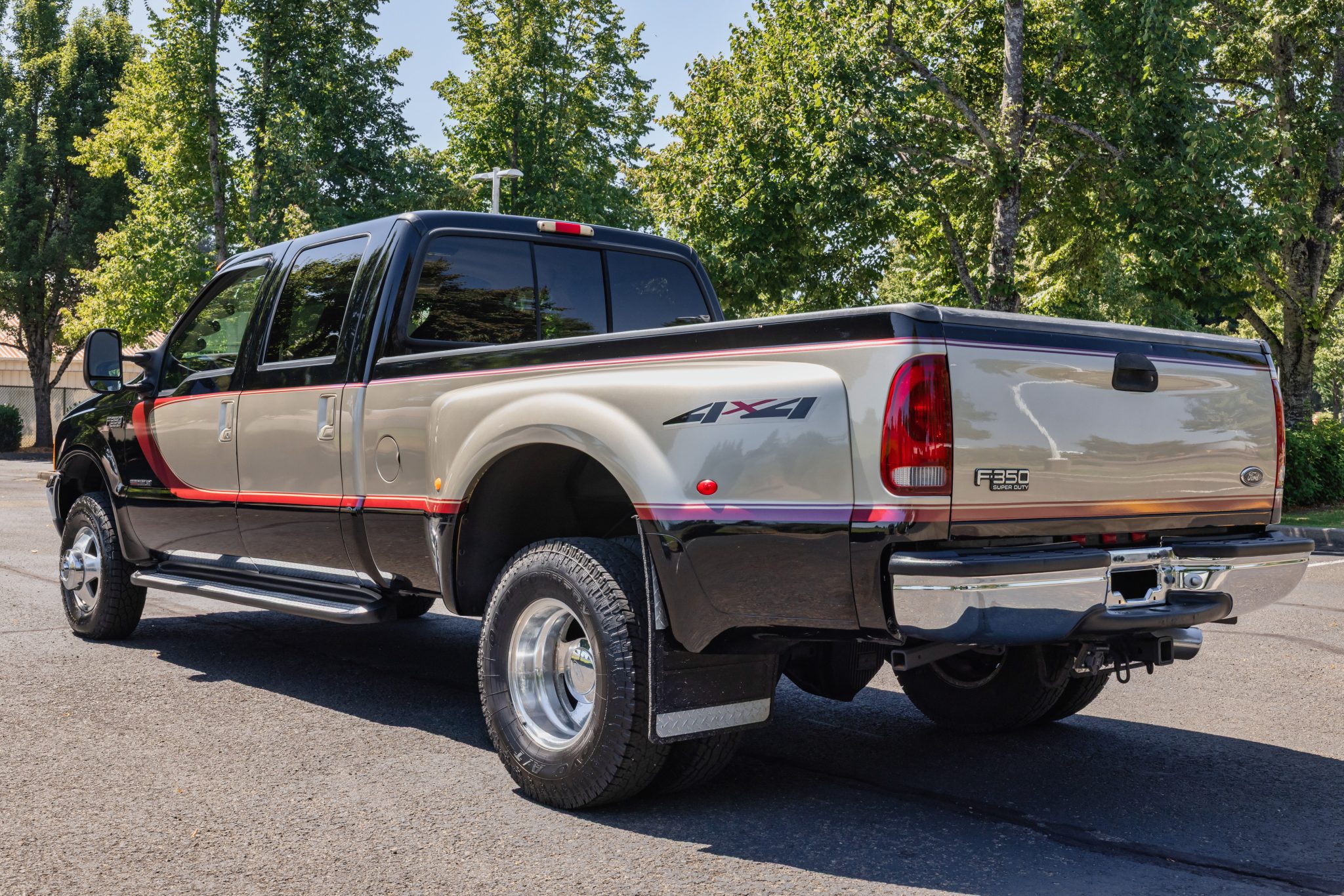 This 2000 Ford F-350 Super Duty Lariat LE is a Crew Cab long-bed 4×4 dually pickup powered by a 7.3-liter Power Stroke turbodiesel V8 that drives the rear or all four wheels through a four-speed automatic transmission and a dual-range transfer case. The truck is finished in two-tone Black Clearcoat and Harvest Gold Metallic with red accents over Medium Parchment leather, and it shows 172k miles following history in Arizona and Washington. Features include running boards, telescoping trailer mirrors, fog lights, a sliding rear window, a receiver hitch, a bed liner, a cab visor, 16″ five-spoke polished alloy wheels, a JVC head unit, cruise control, air conditioning, power-adjustable front captain’s chairs, rear captain’s chairs, front and rear center consoles, and a rear step bumper.