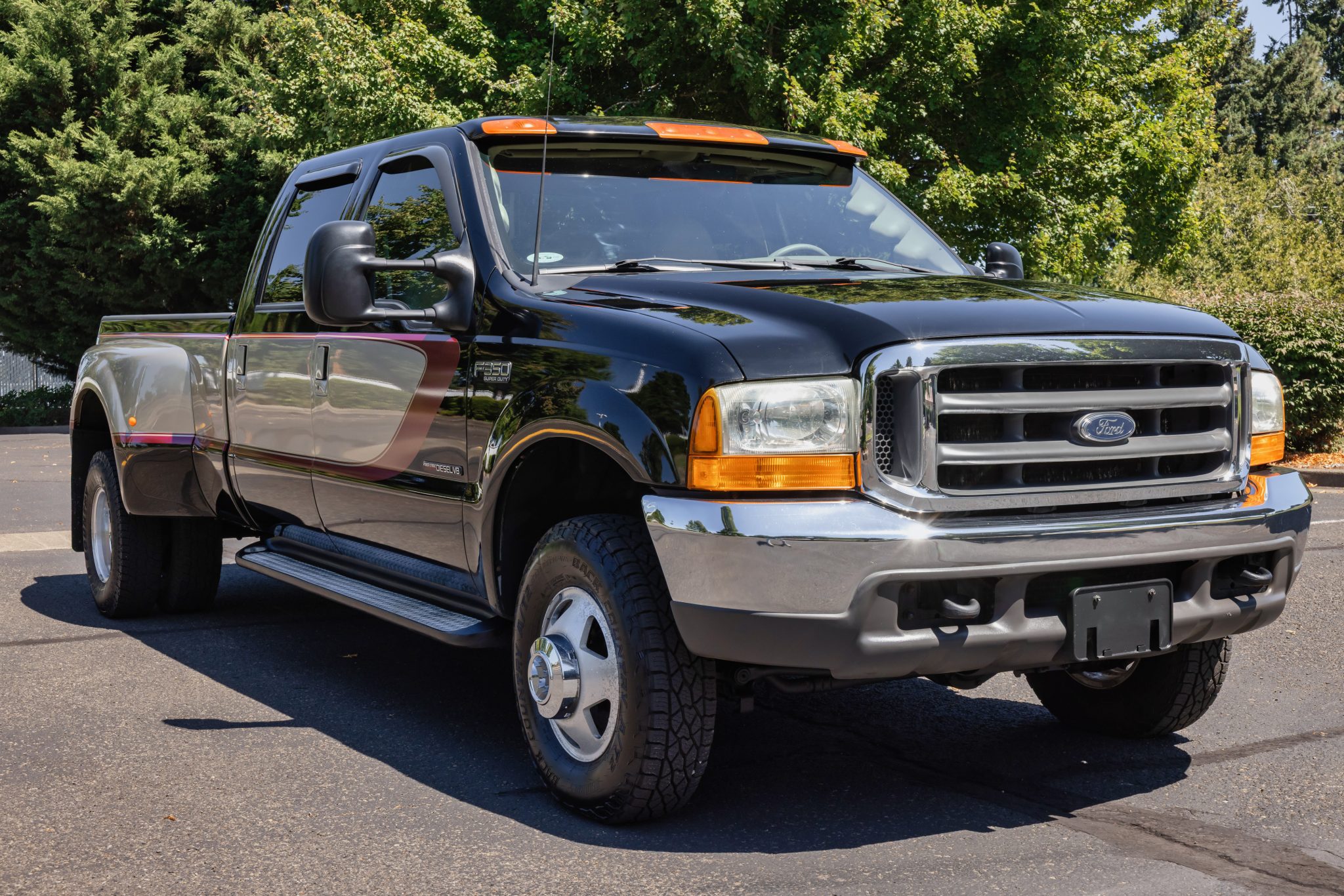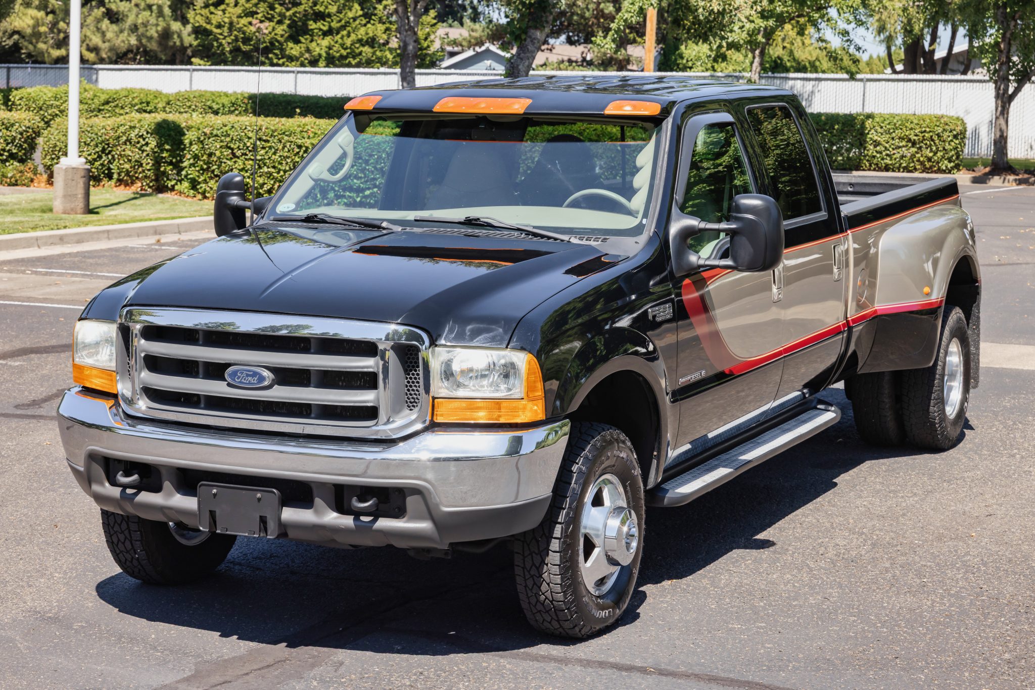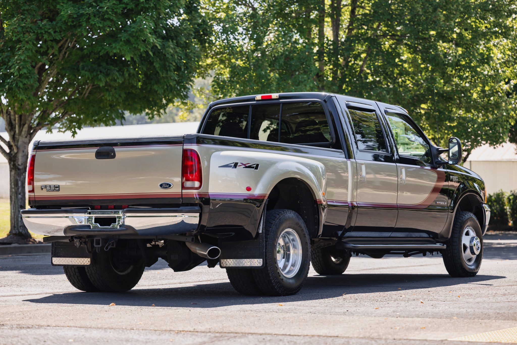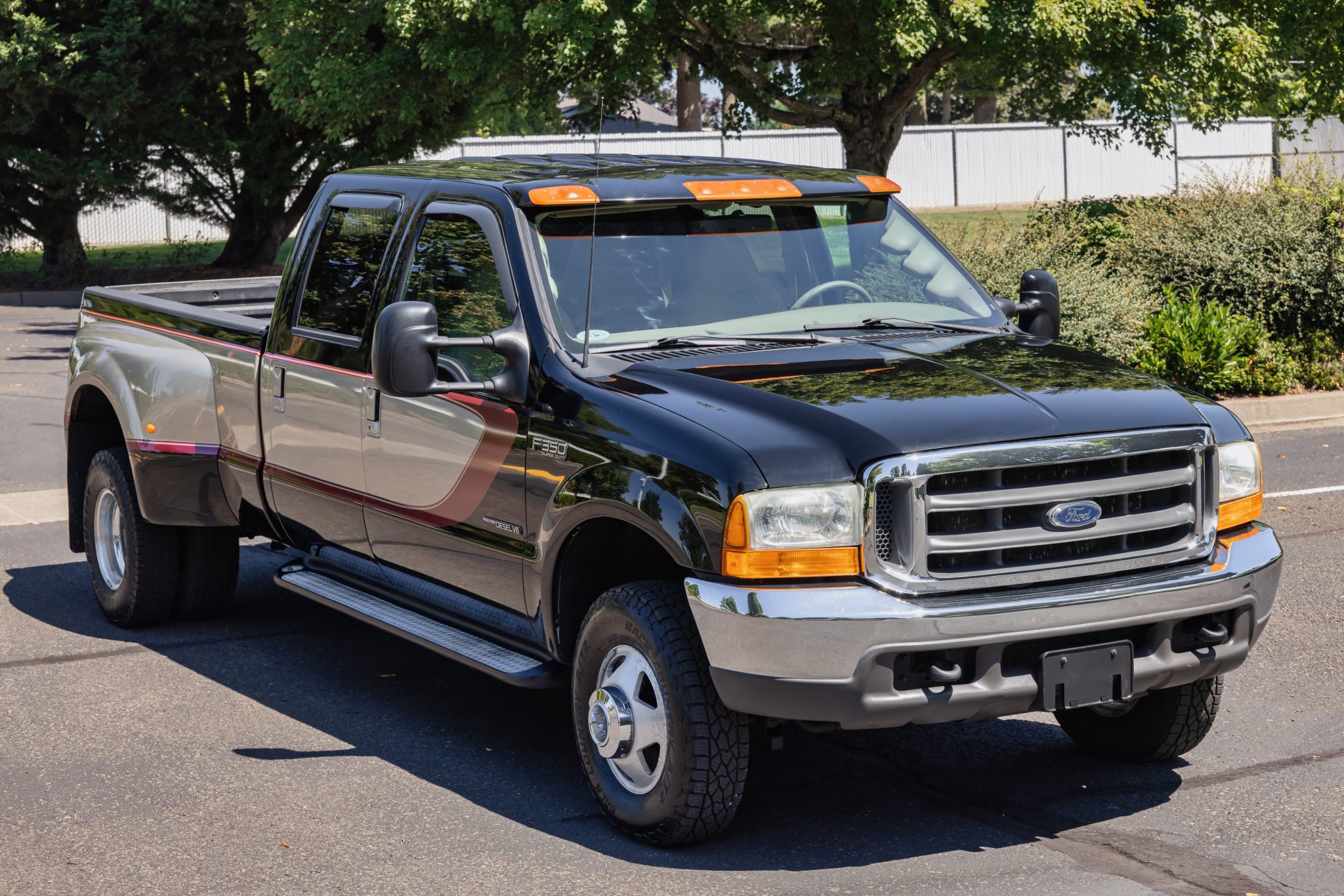 This 2000 Ford F-350 Super Duty Lariat LE is a Crew Cab long-bed 4×4 dually pickup powered by a 7.3-liter Power Stroke turbodiesel V8 that drives the rear or all four wheels through a four-speed automatic transmission and a dual-range transfer case. The truck is finished in two-tone Black Clearcoat and Harvest Gold Metallic with red accents over Medium Parchment leather, and it shows 172k miles following history in Arizona and Washington. Features include running boards, telescoping trailer mirrors, fog lights, a sliding rear window, a receiver hitch, a bed liner, a cab visor, 16″ five-spoke polished alloy wheels, a JVC head unit, cruise control, air conditioning, power-adjustable front captain’s chairs, rear captain’s chairs, front and rear center consoles, and a rear step bumper.