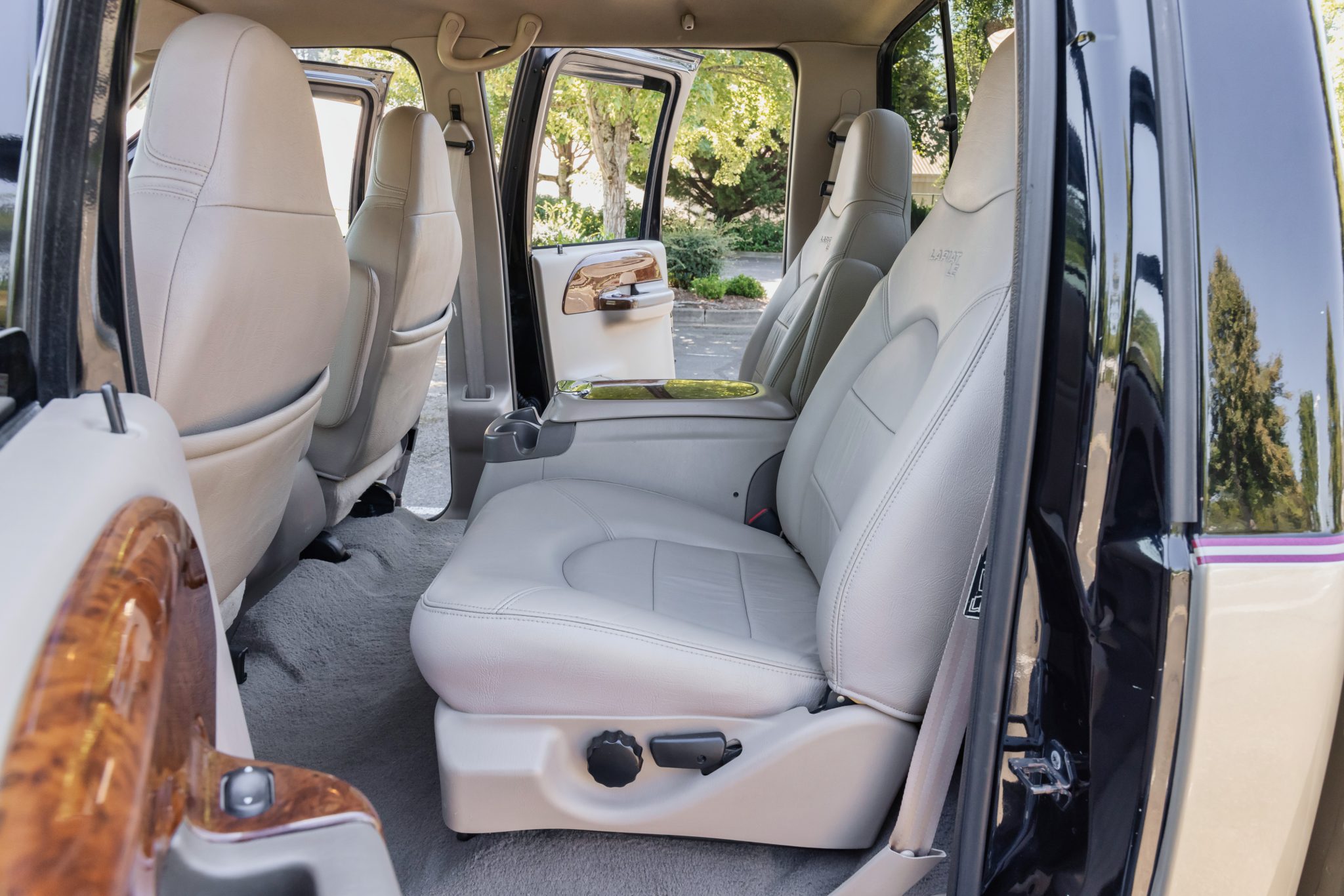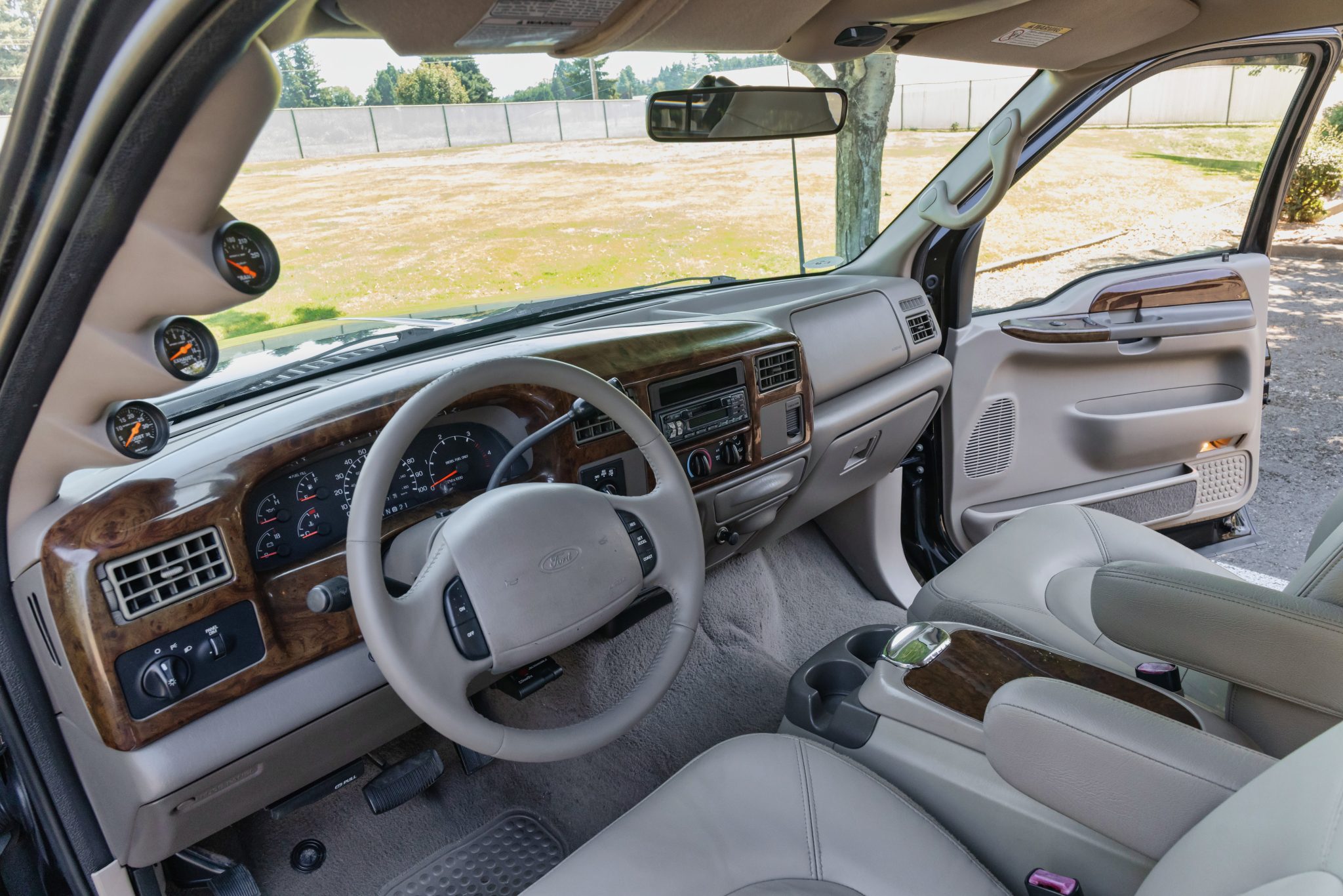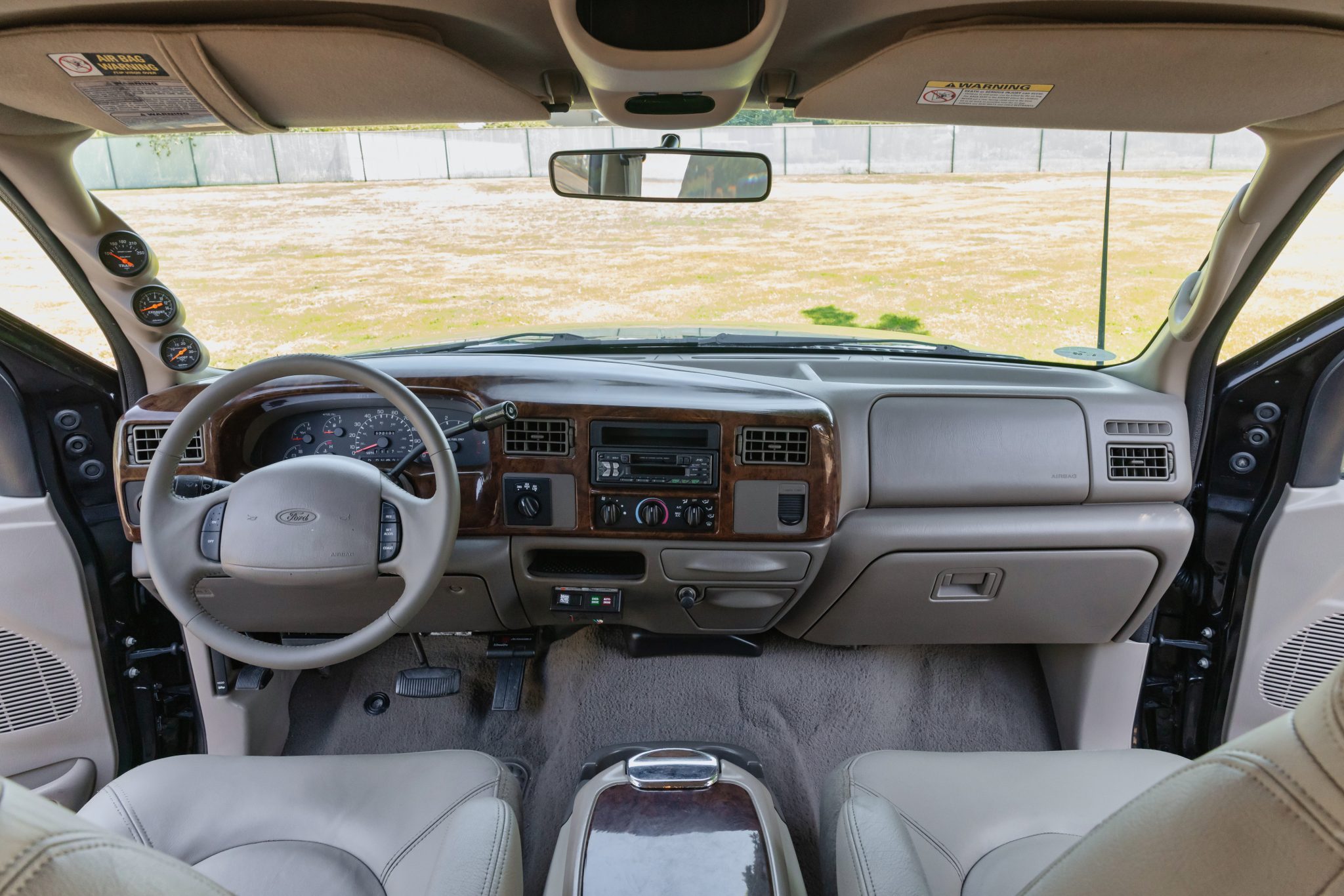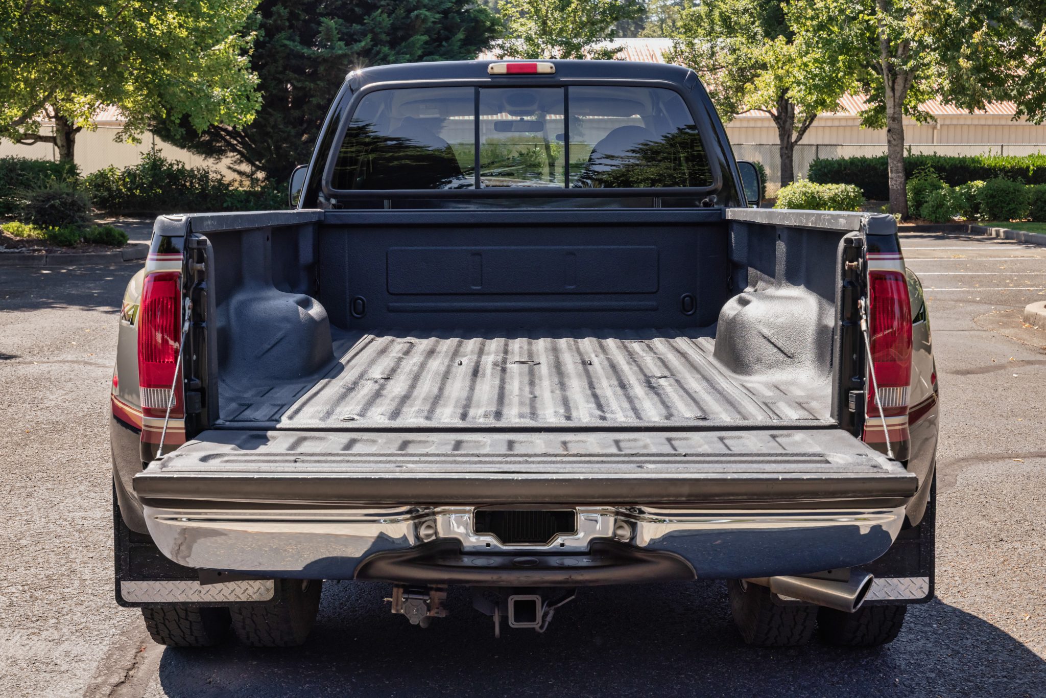This 2000 Ford F-350 Super Duty Lariat LE is a Crew Cab long-bed 4×4 dually pickup powered by a 7.3-liter Power Stroke turbodiesel V8 that drives the rear or all four wheels through a four-speed automatic transmission and a dual-range transfer case. The truck is finished in two-tone Black Clearcoat and Harvest Gold Metallic with red accents over Medium Parchment leather, and it shows 172k miles following history in Arizona and Washington. Features include running boards, telescoping trailer mirrors, fog lights, a sliding rear window, a receiver hitch, a bed liner, a cab visor, 16″ five-spoke polished alloy wheels, a JVC head unit, cruise control, air conditioning, power-adjustable front captain’s chairs, rear captain’s chairs, front and rear center consoles, and a rear step bumper.