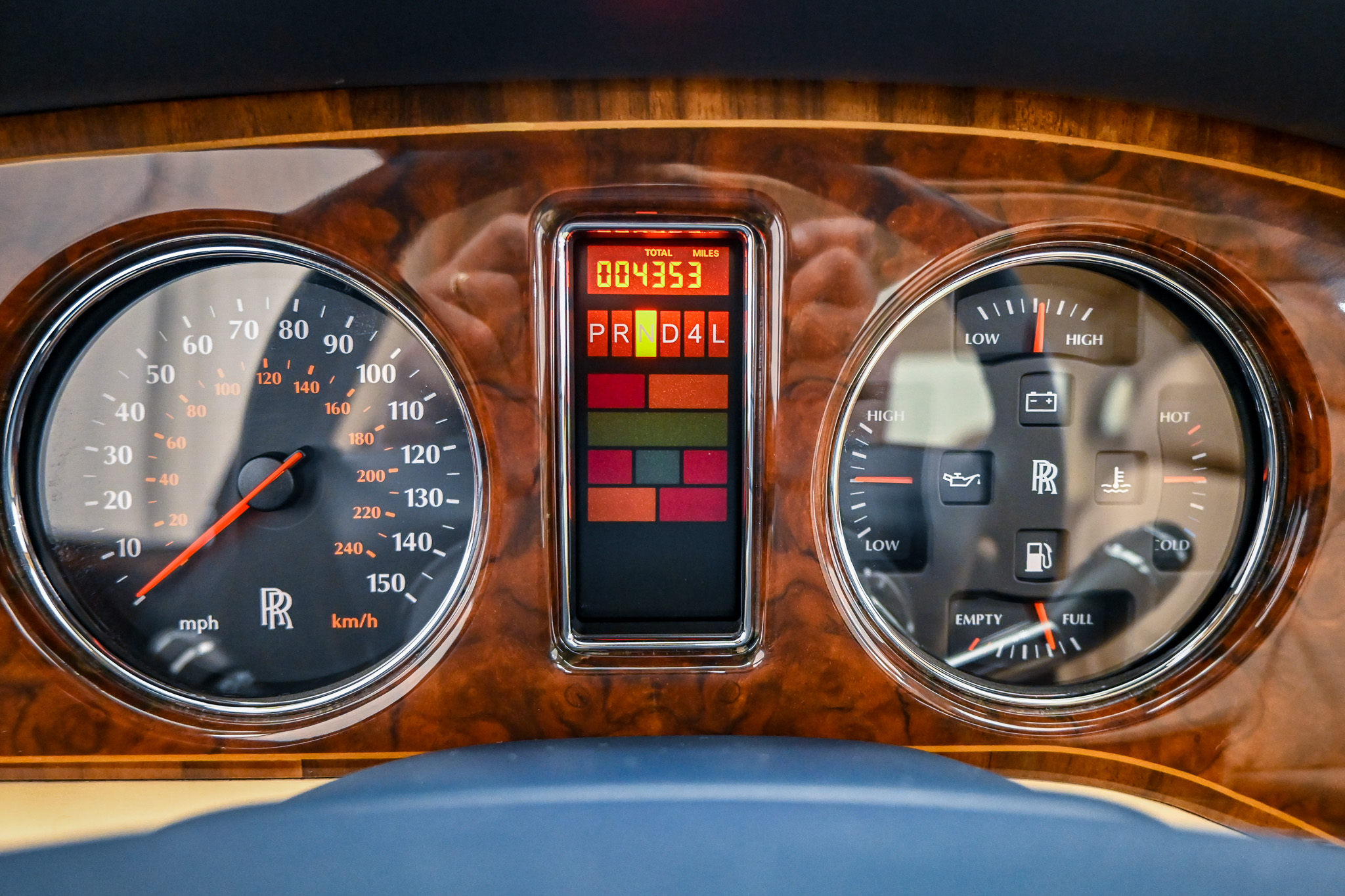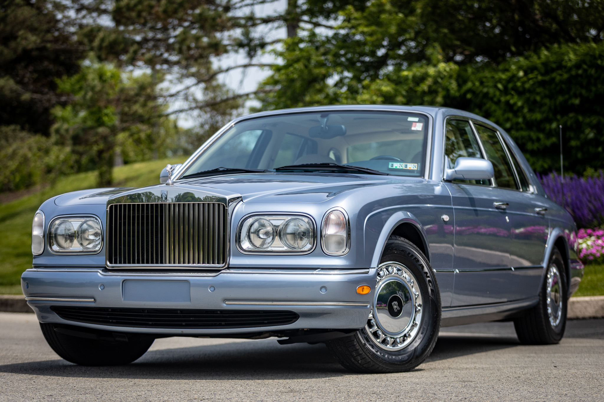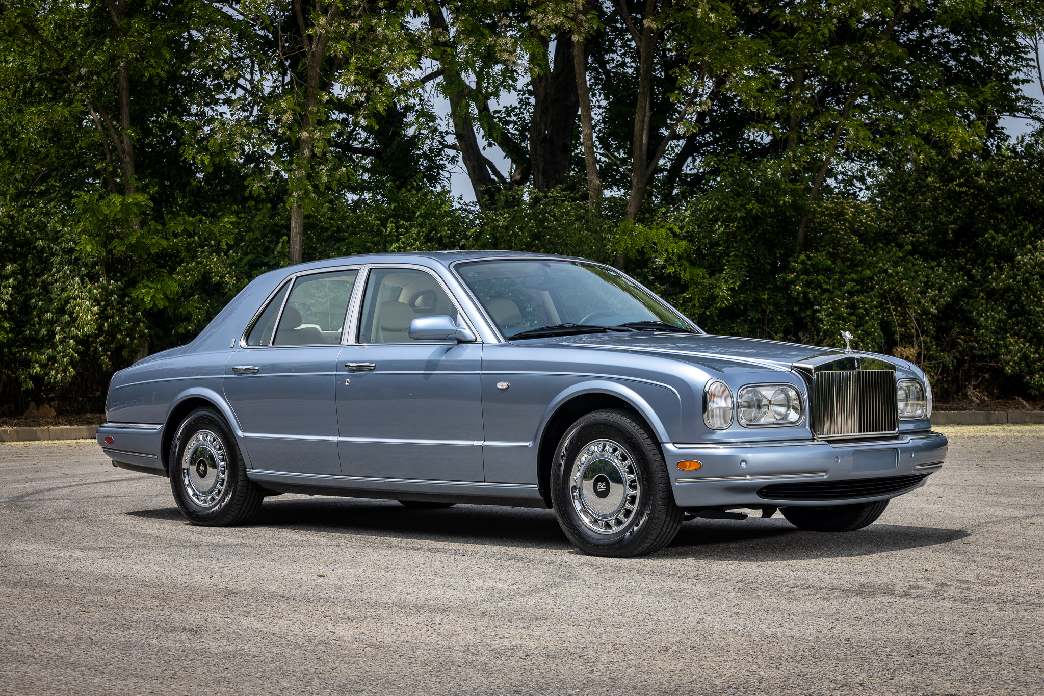 This 2000 Rolls-Royce Silver Seraph is powered by a 5.4-liter V12 paired with a five-speed automatic transmission and is finished in Grigio Silverstone Metallic over beige leather. Additional equipment includes 16″ wheels, a sunroof, parking sensors, dual-zone automatic climate control, heated seats, rear tray tables, navigation, and an Alpine cassette stereo linked to a CD changer mounted in the center console.