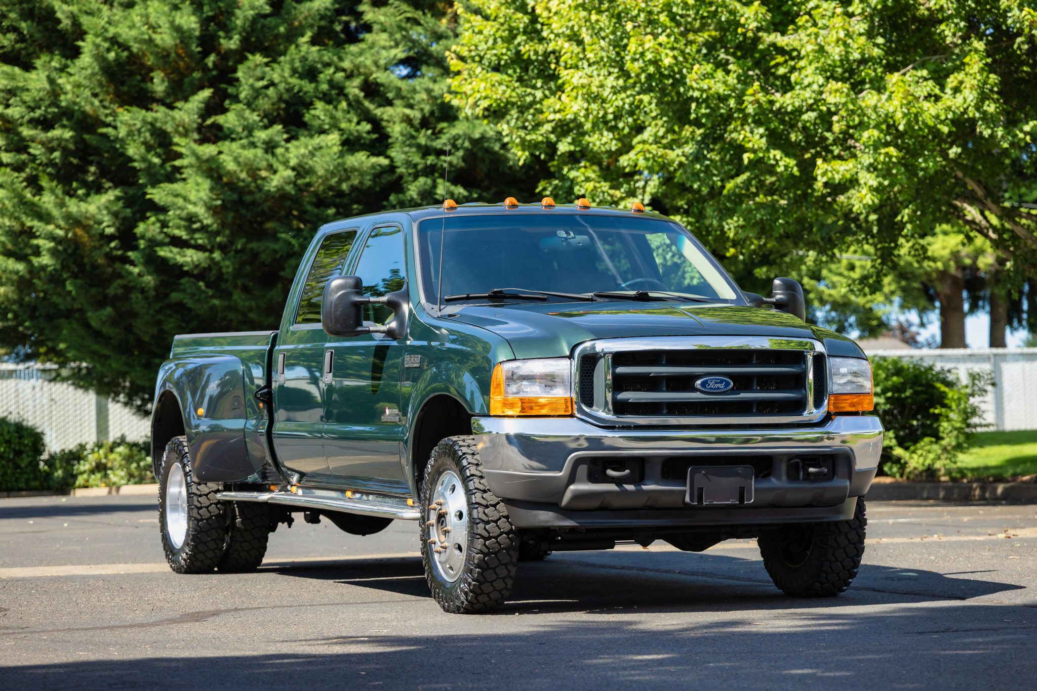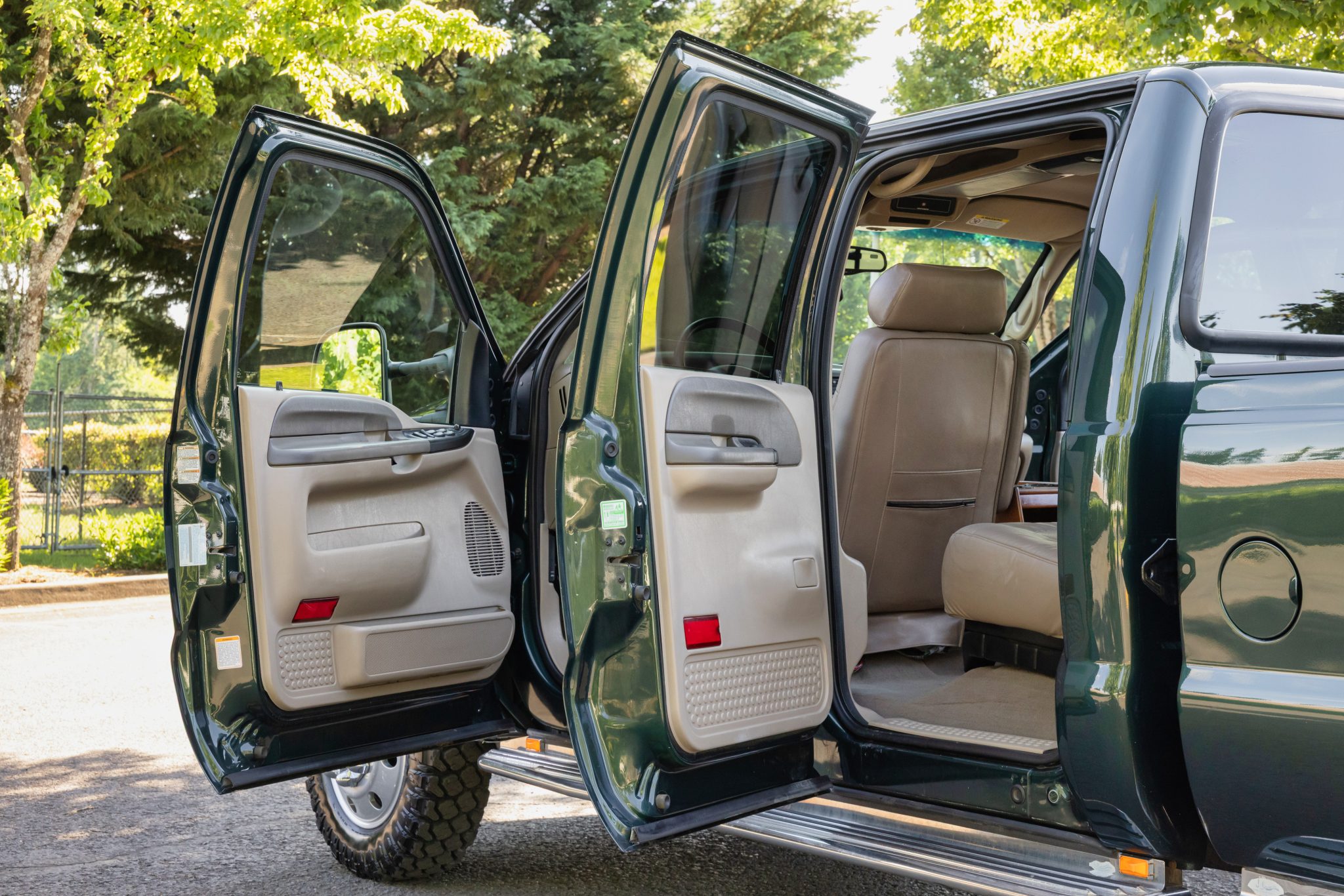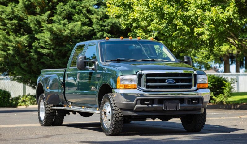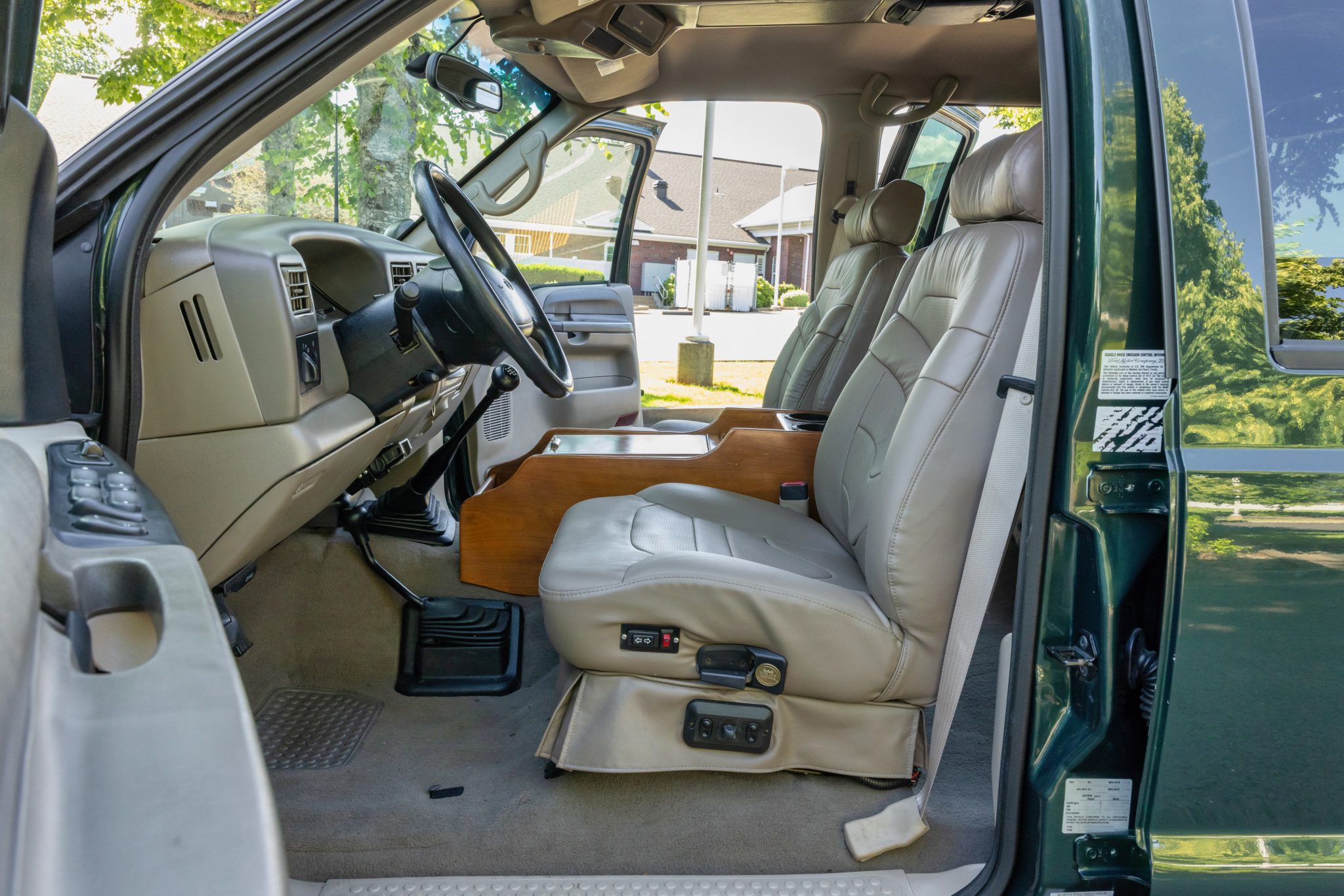 This 2001 Ford F-550 XLT Super Duty is a Crew Cab long-bed 4×4 dually example that was customized when new by Centurion and is finished in Dark Highland Metallic Green over medium parchment leather upholstery. Power is provided by a 7.3-liter Power Stroke turbodiesel V8 linked with a six-speed manual transmission and a dual-range transfer case and equipment includes a maple wood center console, Wieland Designs heated front captains chairs, a rear seat entertainment system, air conditioning, a trailer brake controller, in-dash six-disc CD stereo, illuminated running boards, 19.5″ aluminum wheels, manually locking front hubs, four-wheel disc brakes, and a sliding rear window.