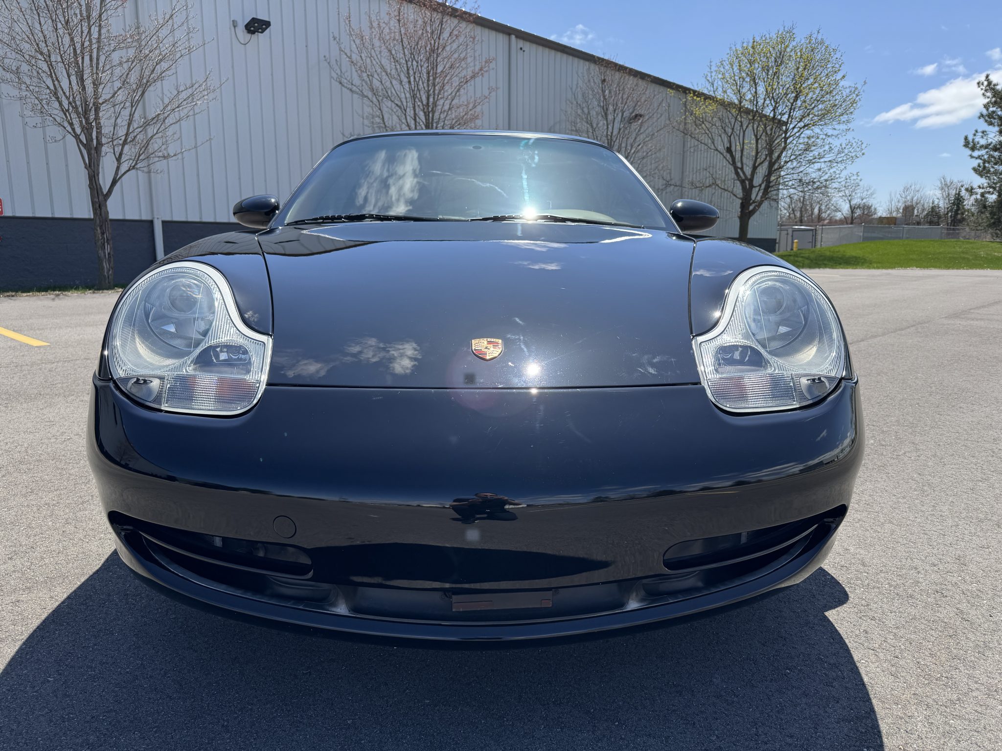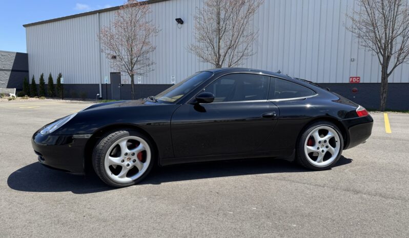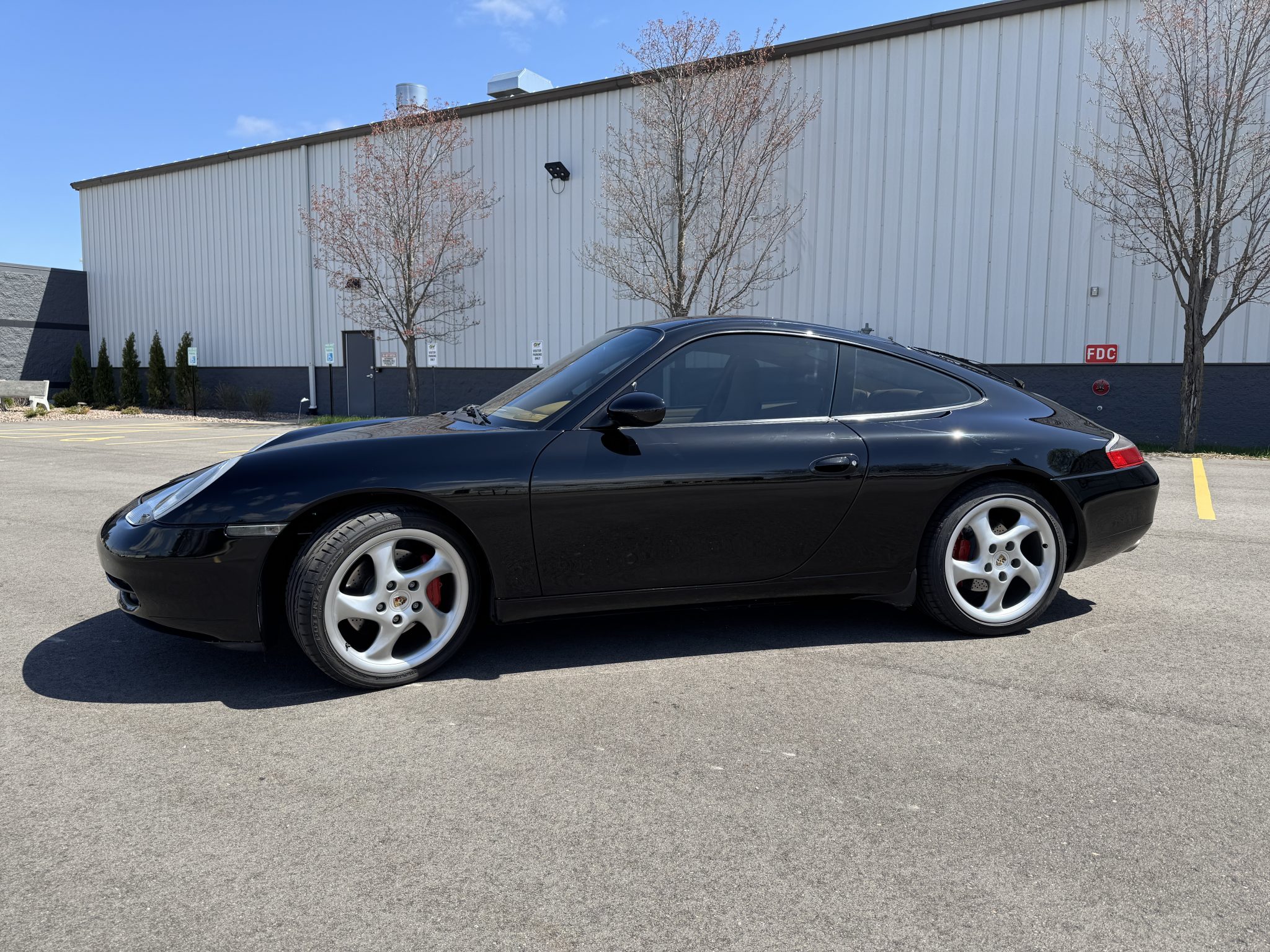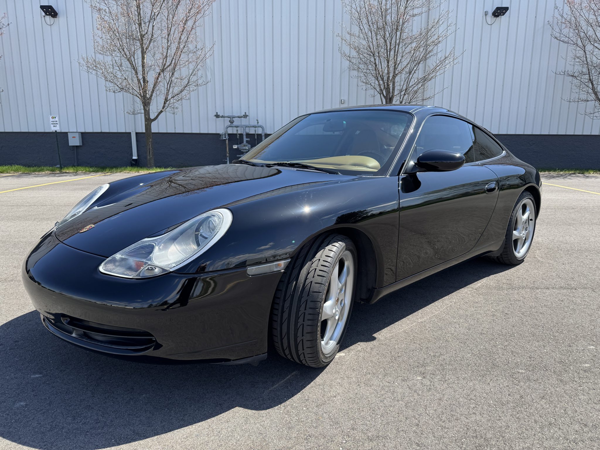 This 2001 Porsche 911 Carrera 4 coupe is finished in black over Savannah Beige leather and is powered by a 3.4-liter M96 flat-six that drives all four wheels through a six-speed manual transaxle. Features include a speed-activated rear spoiler, a sunroof, xenon headlights, fog lights, 18″ Turbo-look wheels, heated power-adjustable front seats, a short-throw shifter, wood interior trim, and automatic climate control.