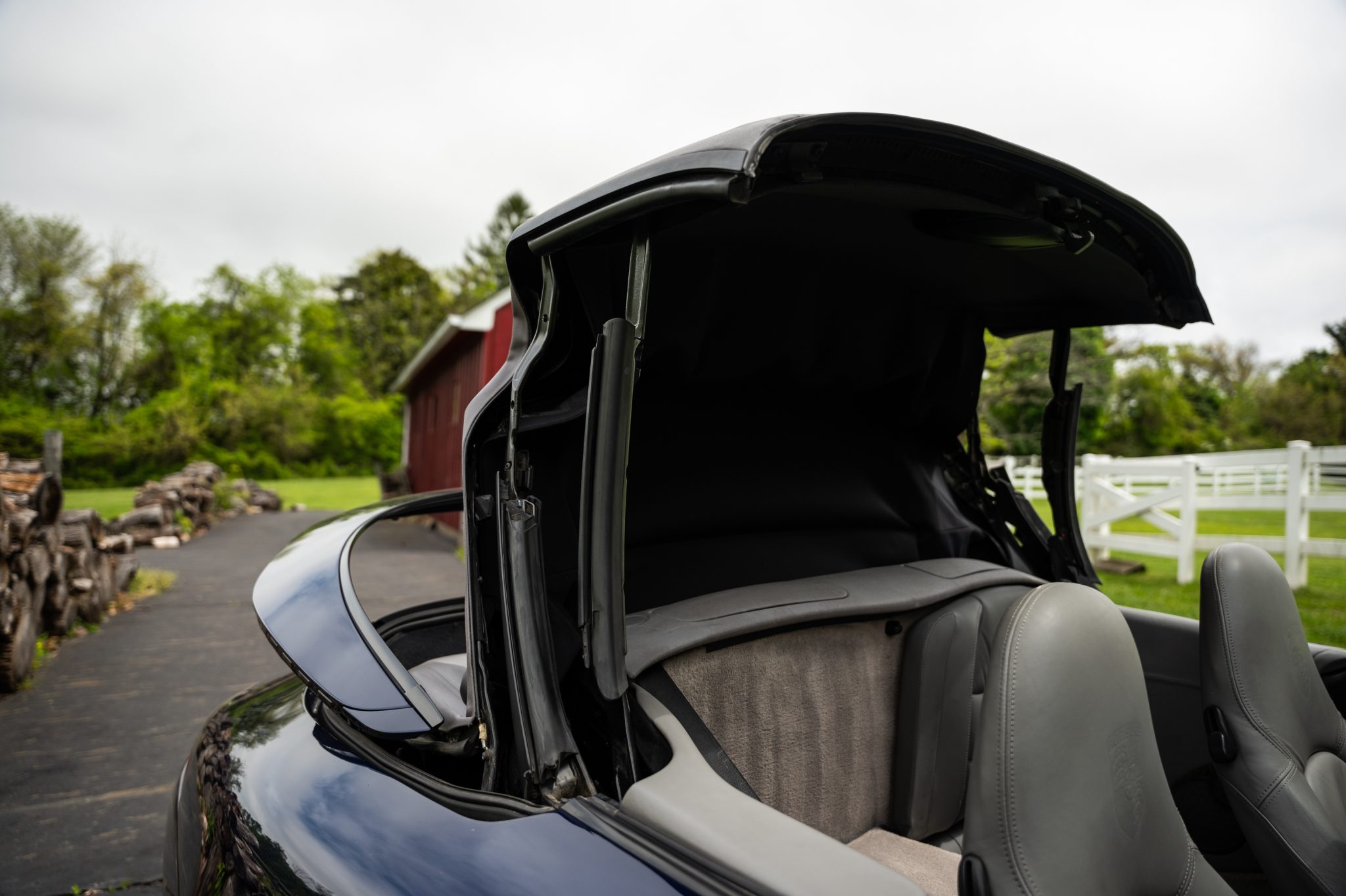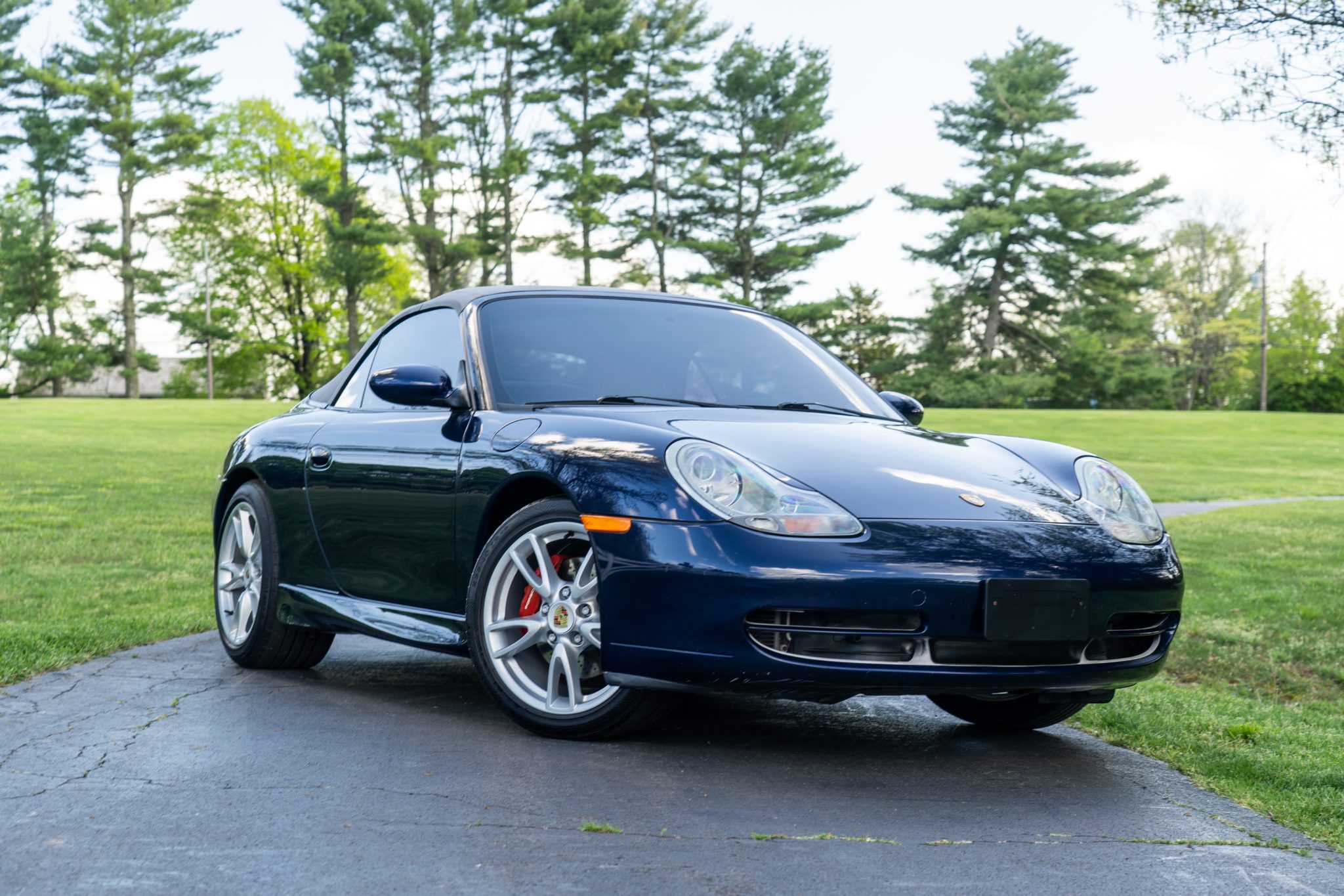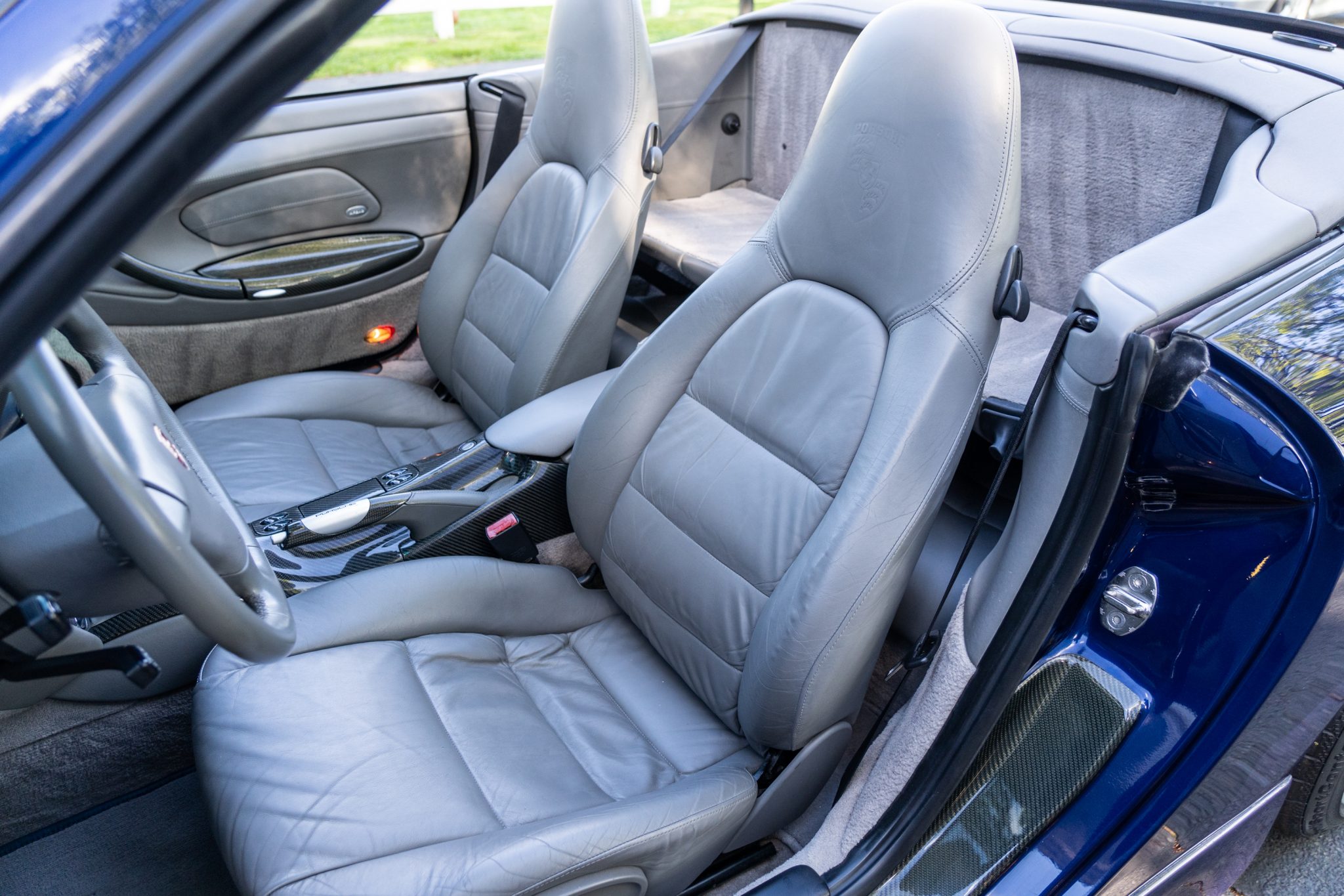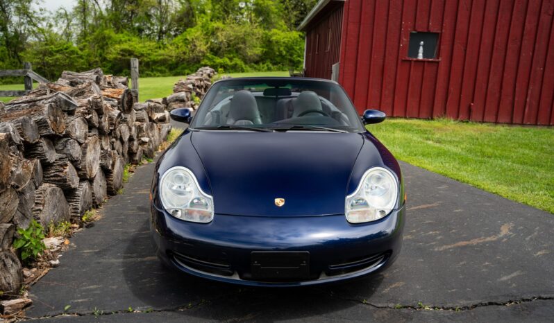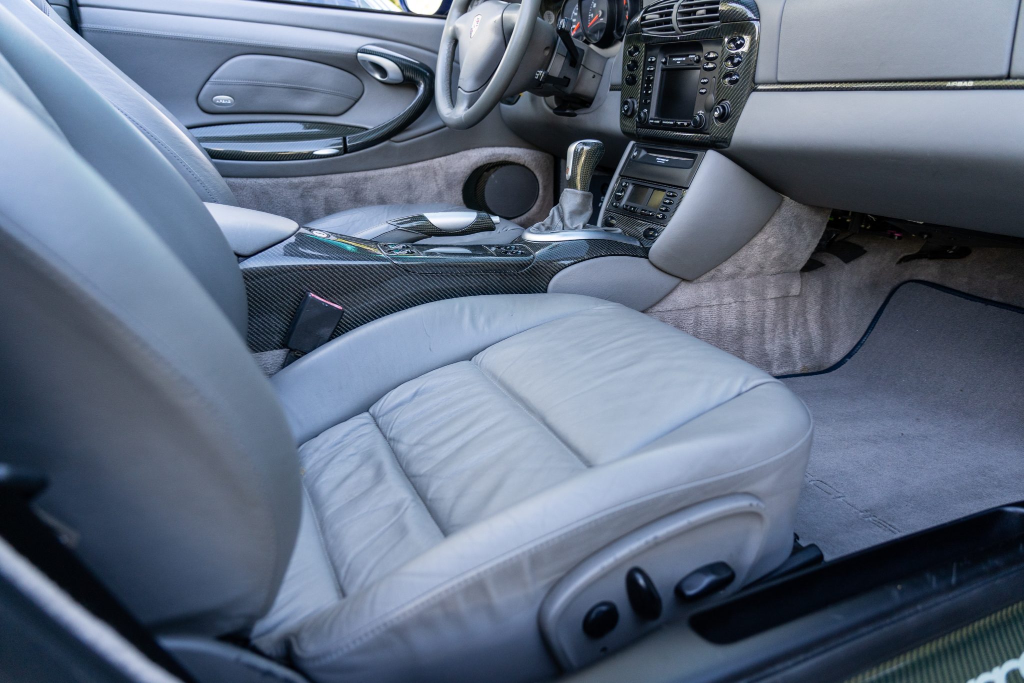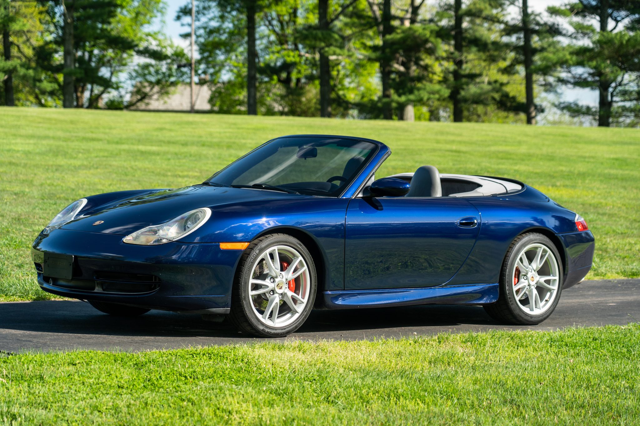 This 2001 Porsche 911 Carrera cabriolet is finished in Lapis Blue Metallic over Graphite Gray full leather and is powered by a 3.4-liter flat-six paired with a six-speed manual transaxle. Equipment includes a gray soft top, 18″ alloy wheels, a deployable rear spoiler, xenon headlights, integrated fog lights, automatic climate control, cruise control, an interior Carbon Package, front-seat power lumbar support, and a PCM 1 screen with navigation and a cassette-tape player.