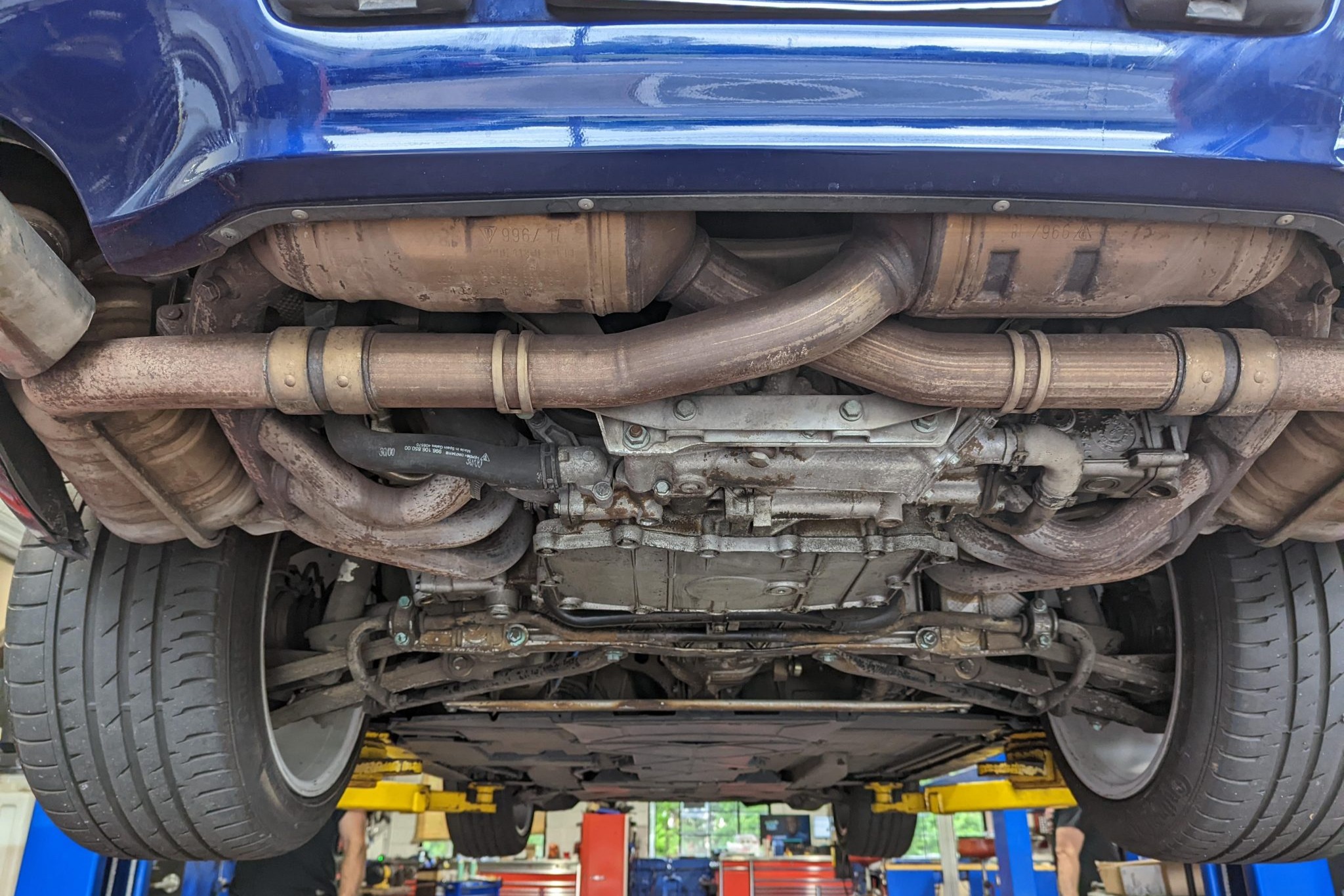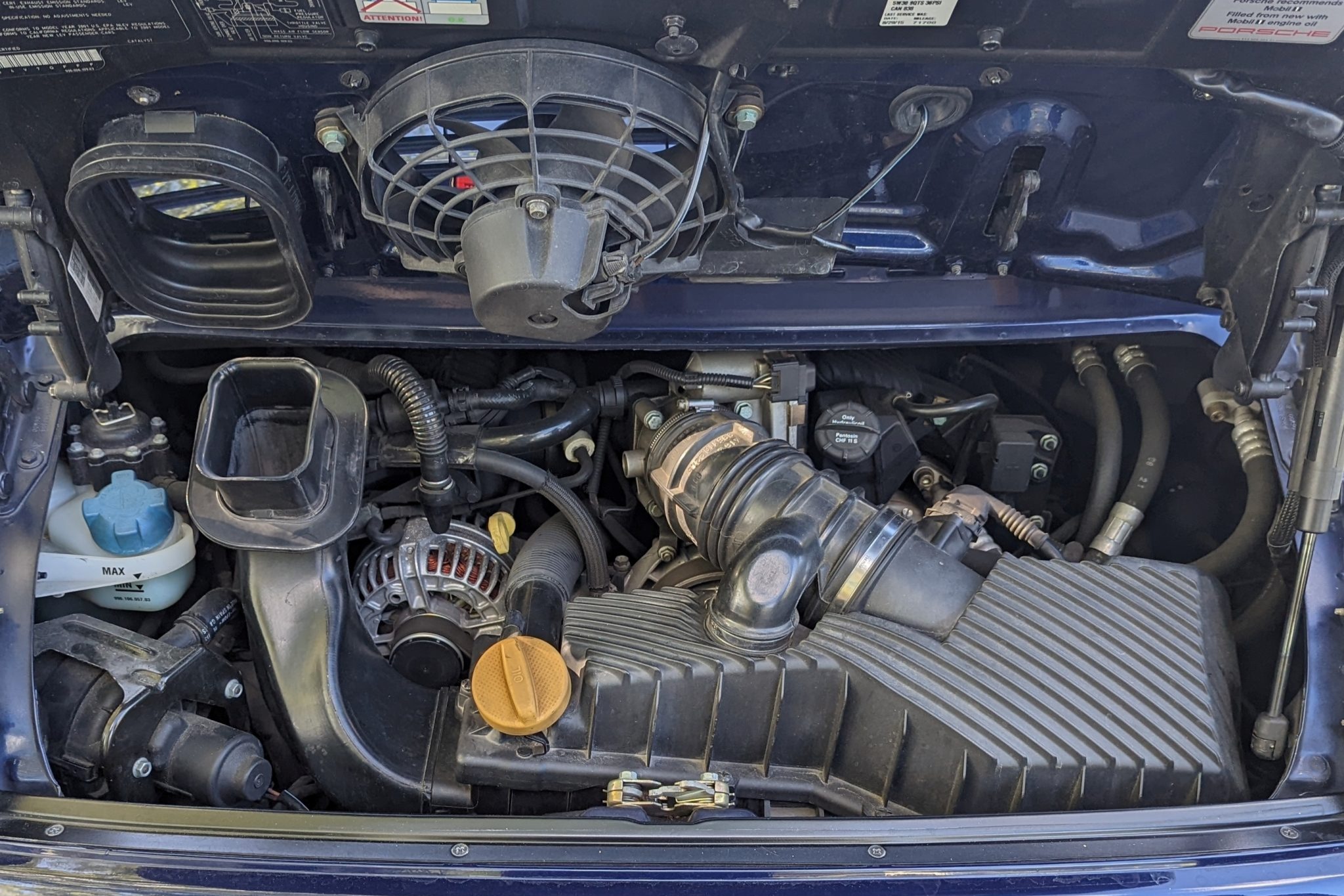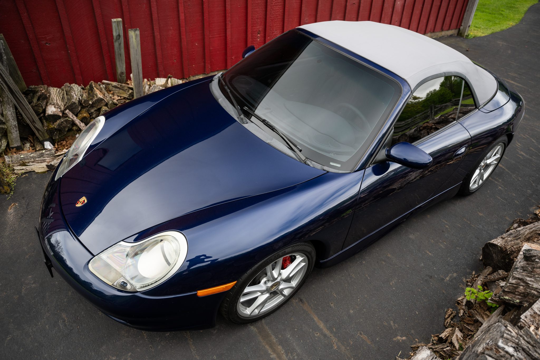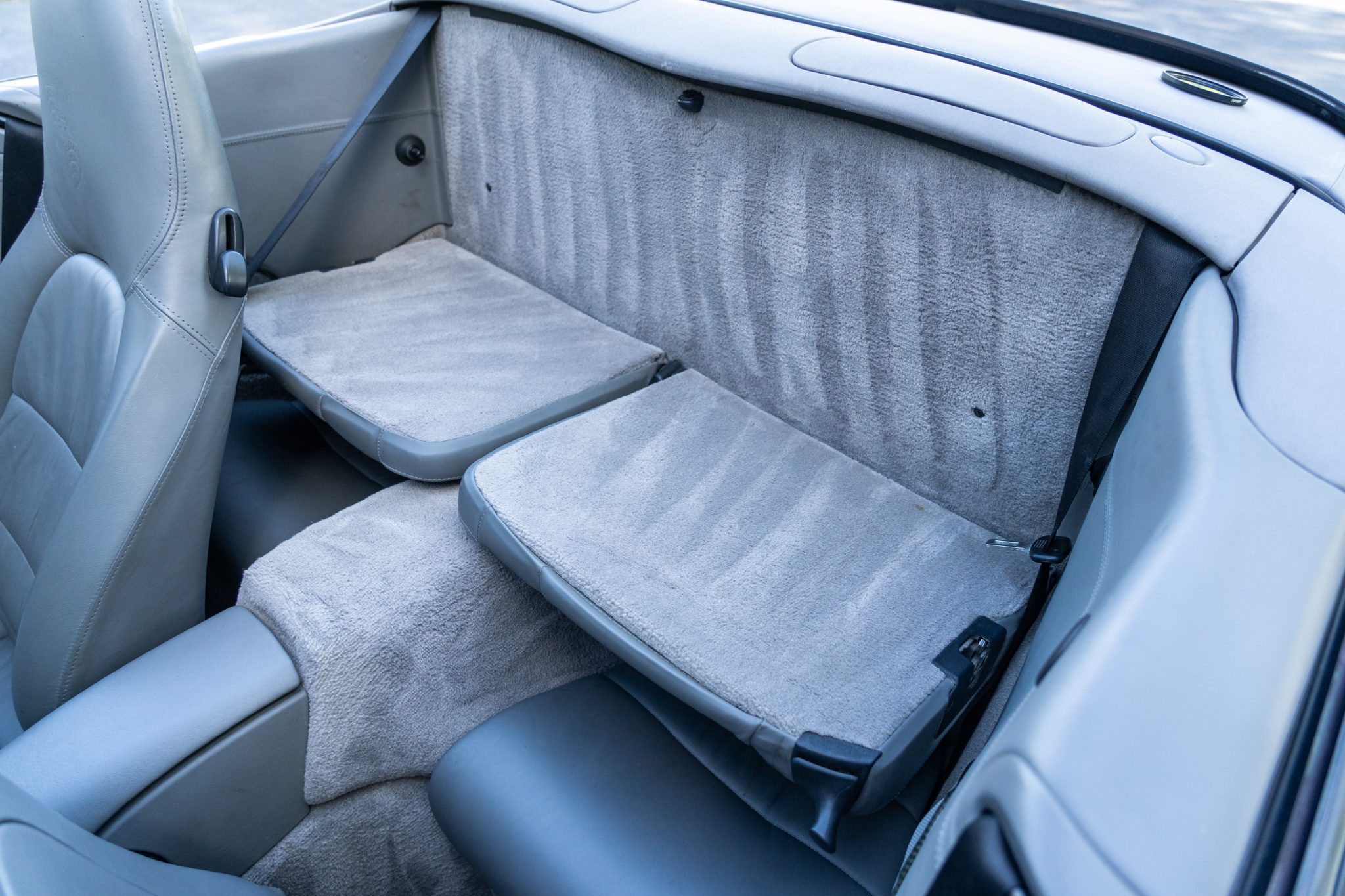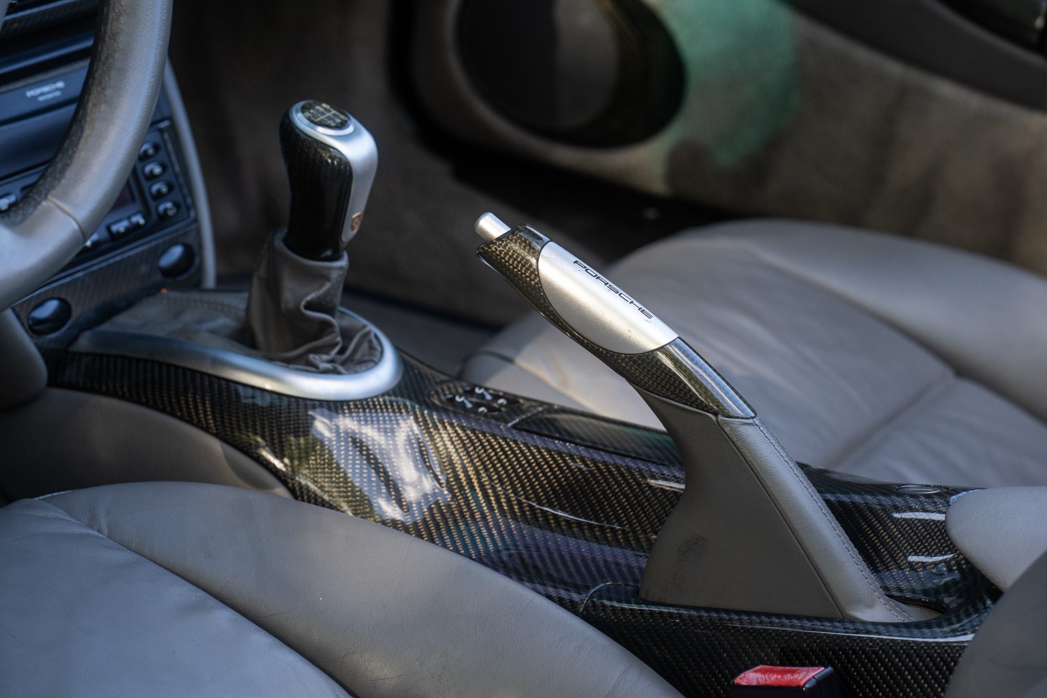 This 2001 Porsche 911 Carrera cabriolet is finished in Lapis Blue Metallic over Graphite Gray full leather and is powered by a 3.4-liter flat-six paired with a six-speed manual transaxle. Equipment includes a gray soft top, 18″ alloy wheels, a deployable rear spoiler, xenon headlights, integrated fog lights, automatic climate control, cruise control, an interior Carbon Package, front-seat power lumbar support, and a PCM 1 screen with navigation and a cassette-tape player.