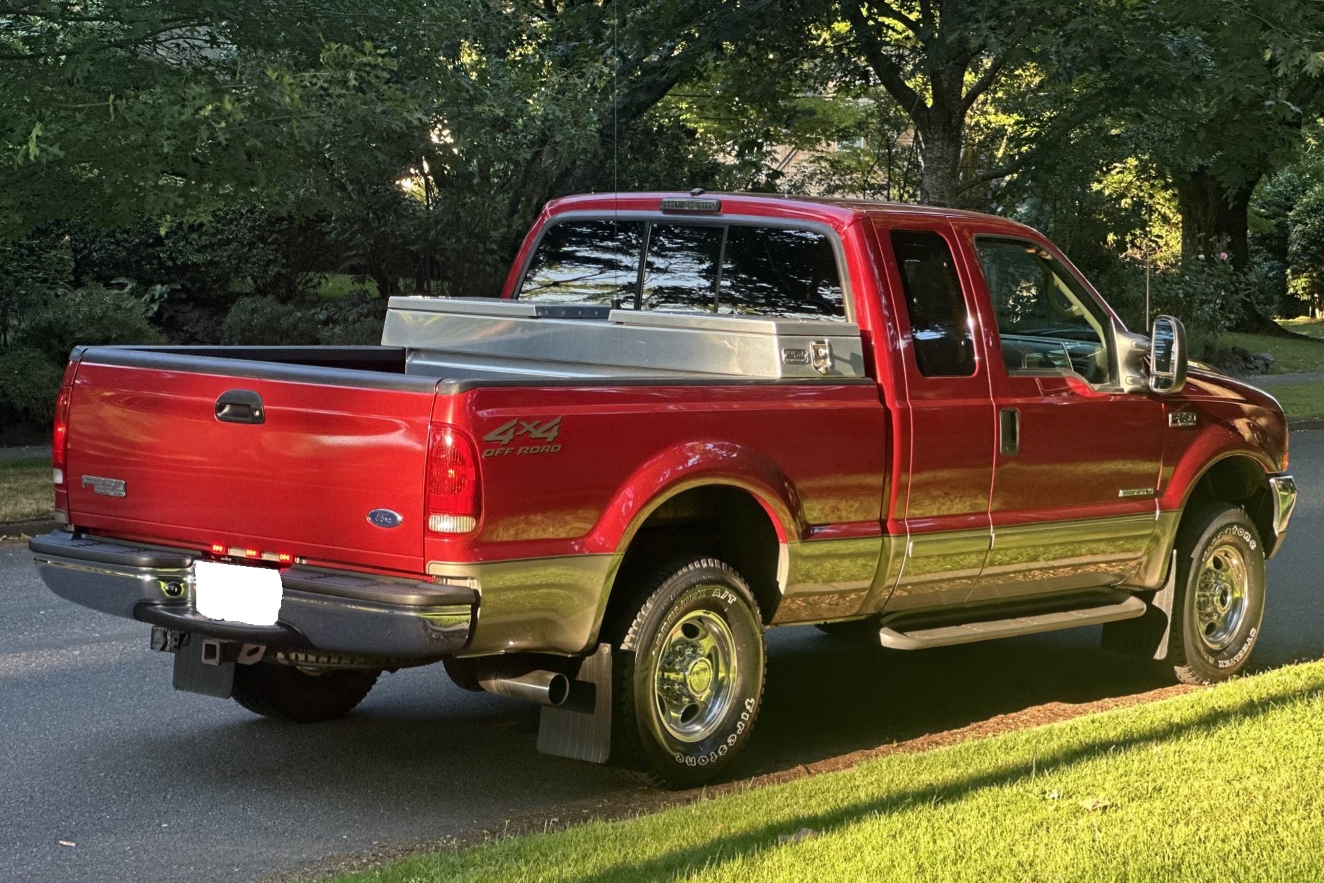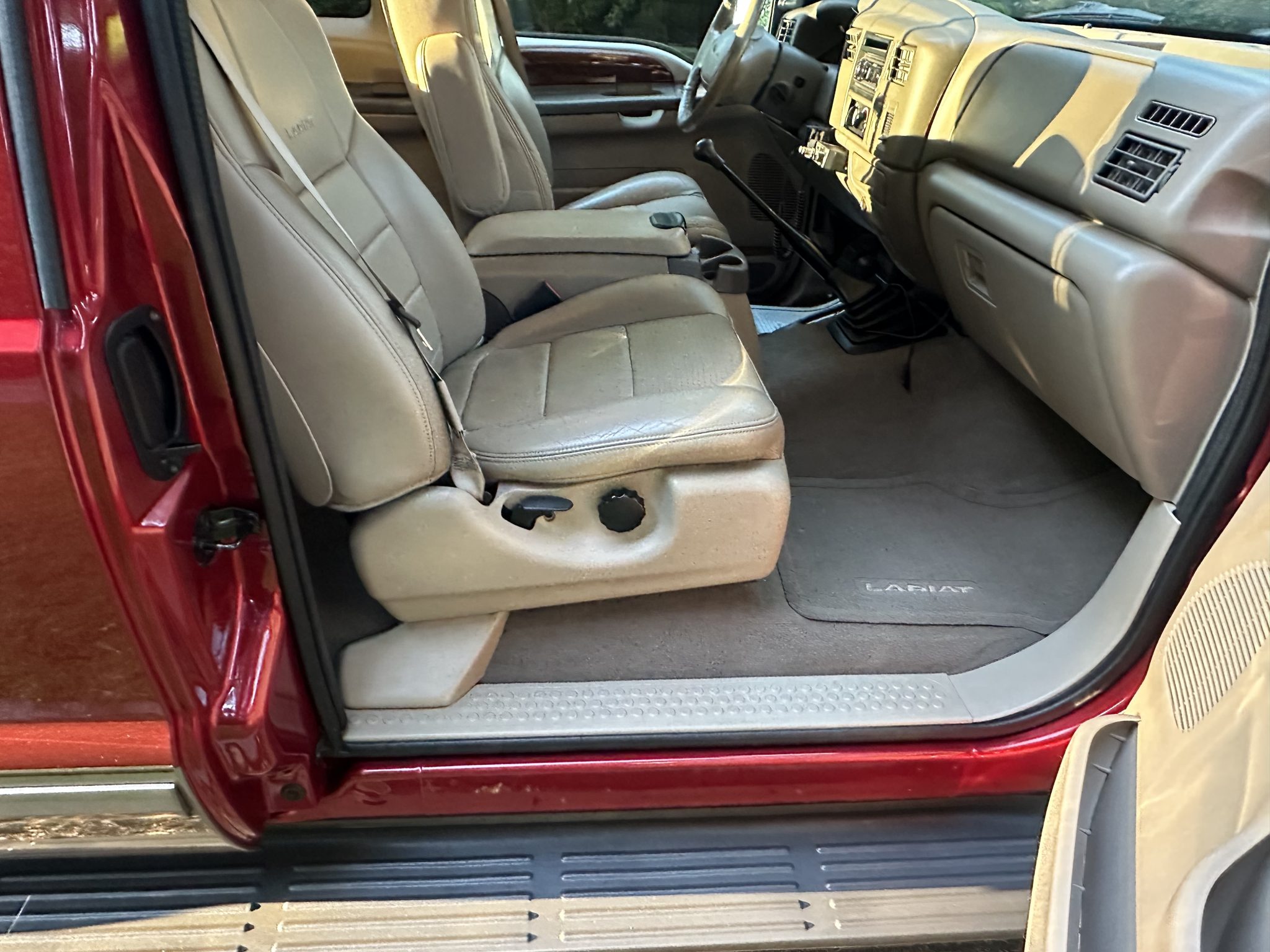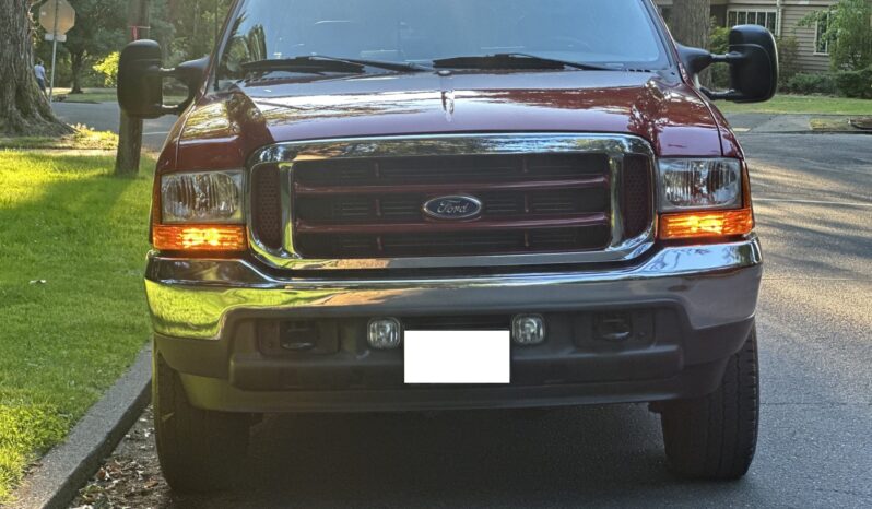 This 2002 Ford F-250 Super Duty Lariat is a SuperCab short-bed 4×4 pickup with 60k miles The truck is finished in Toreador Red Clearcoat Metallic over Medium Parchment leather, and it is powered by a 7.3-liter Power Stroke turbodiesel V8 that drives the rear or all four wheels through a six-speed manual transmission, a dual-range transfer case, and a limited-slip rear differential. Features include running boards, a bed liner, an in-bed toolbox, a sliding rear window, a receiver hitch, 16″ five-hole alloy wheels, front captain’s chairs, a Uniden CB radio, air conditioning, and a Pioneer head unit.