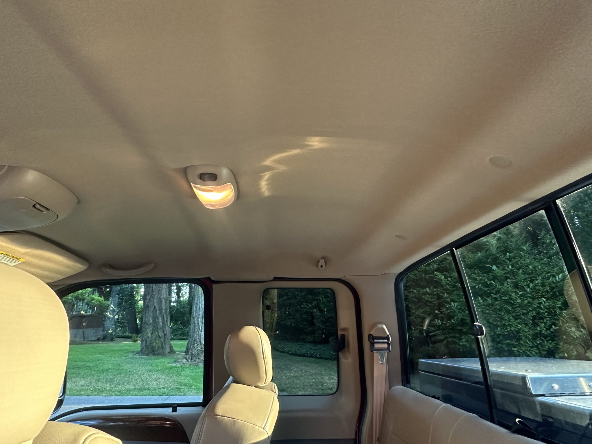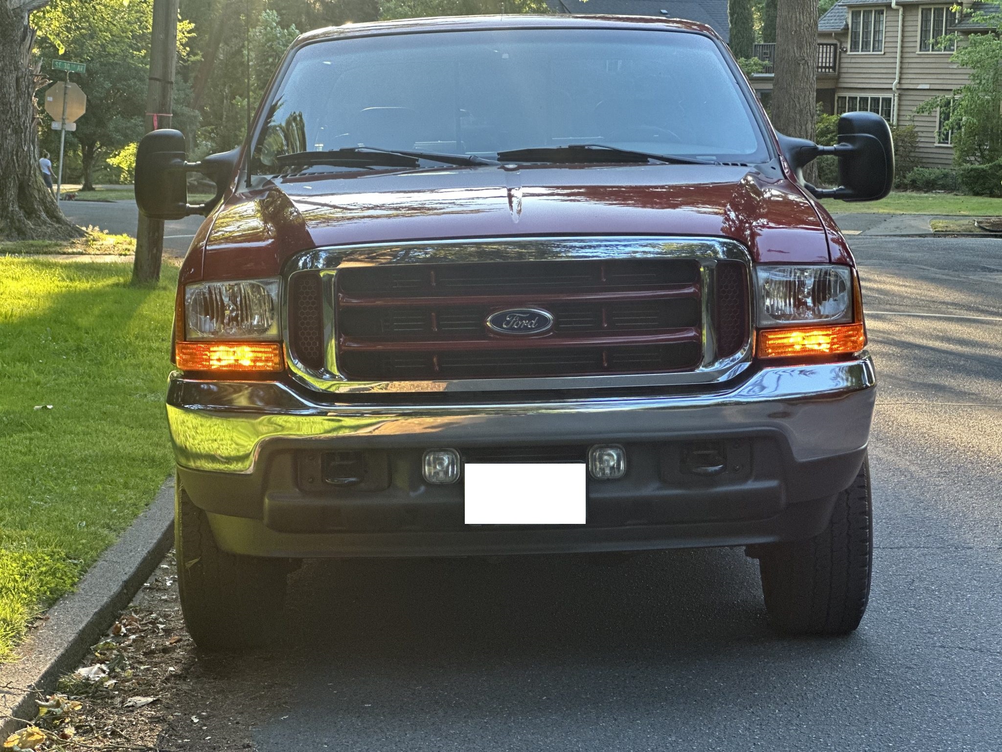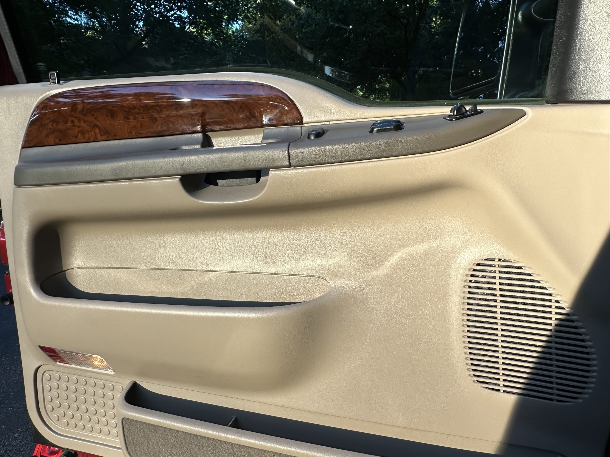 This 2002 Ford F-250 Super Duty Lariat is a SuperCab short-bed 4×4 pickup with 60k miles The truck is finished in Toreador Red Clearcoat Metallic over Medium Parchment leather, and it is powered by a 7.3-liter Power Stroke turbodiesel V8 that drives the rear or all four wheels through a six-speed manual transmission, a dual-range transfer case, and a limited-slip rear differential. Features include running boards, a bed liner, an in-bed toolbox, a sliding rear window, a receiver hitch, 16″ five-hole alloy wheels, front captain’s chairs, a Uniden CB radio, air conditioning, and a Pioneer head unit.