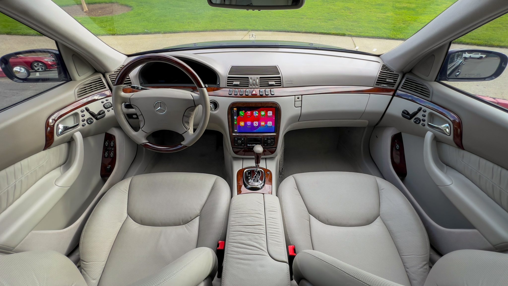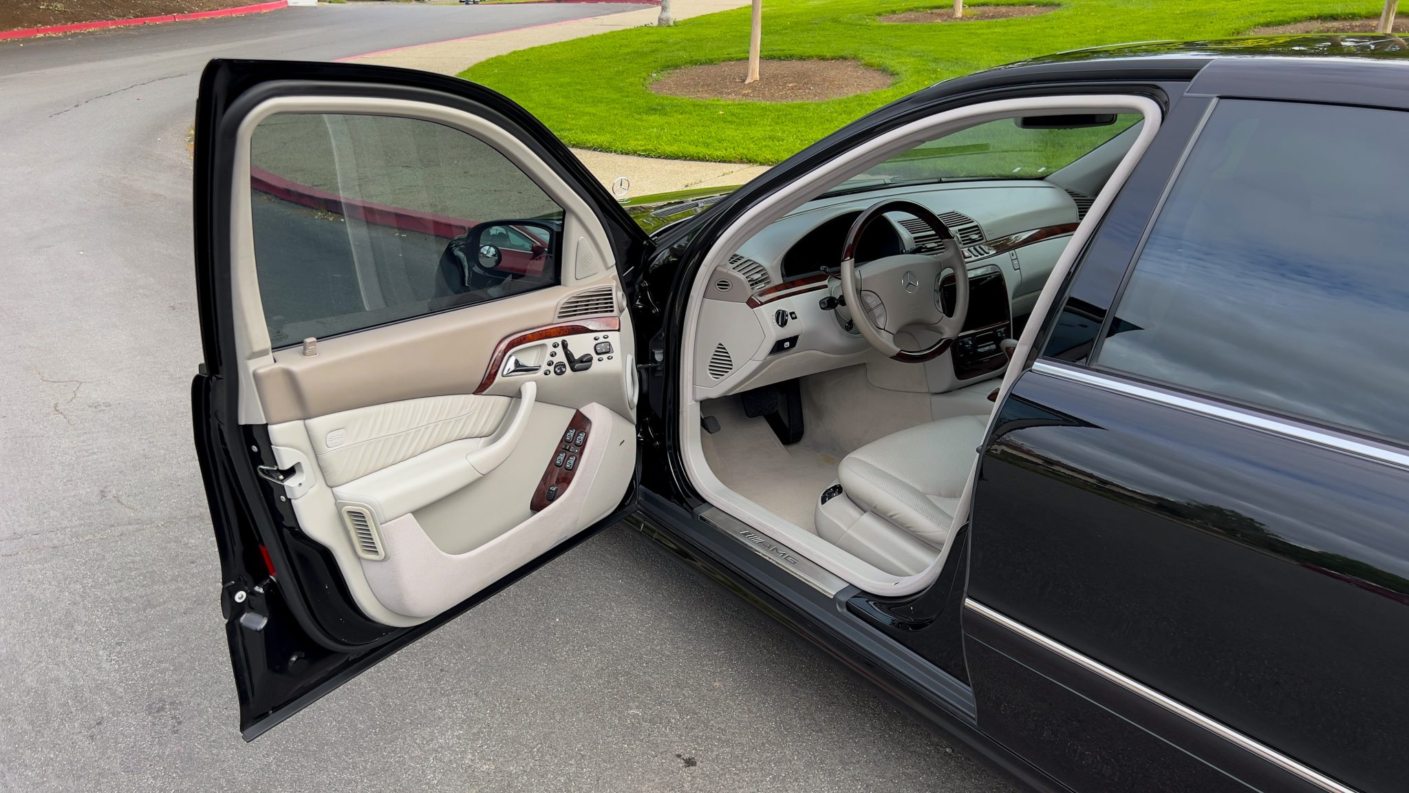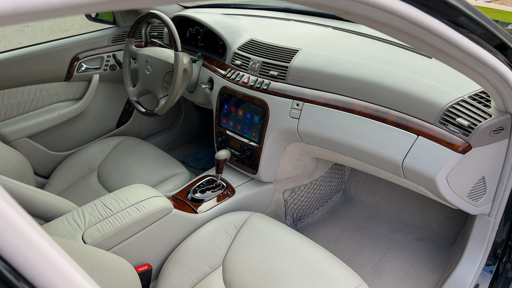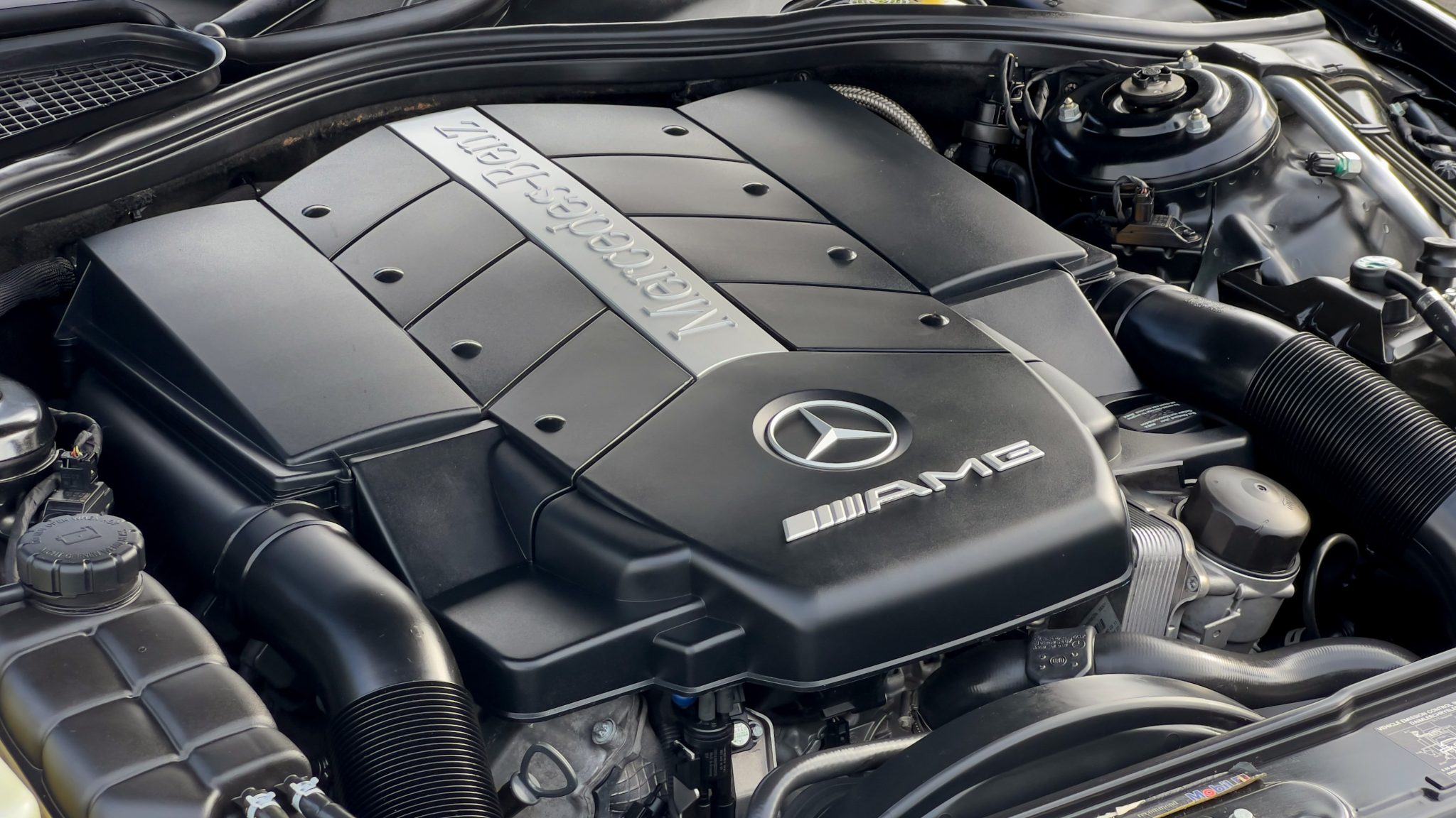 The car is powered by a 5.4-liter V8 paired with a five-speed automatic transmission and is finished in Obsidian Black over beige leather upholstery. Equipment includes 18″ AMG Monoblock wheels, a sunroof, bi-xenon headlights, a Bose sound system, and an aftermarket infotainment system with Apple CarPlay and an integrated backup camera.