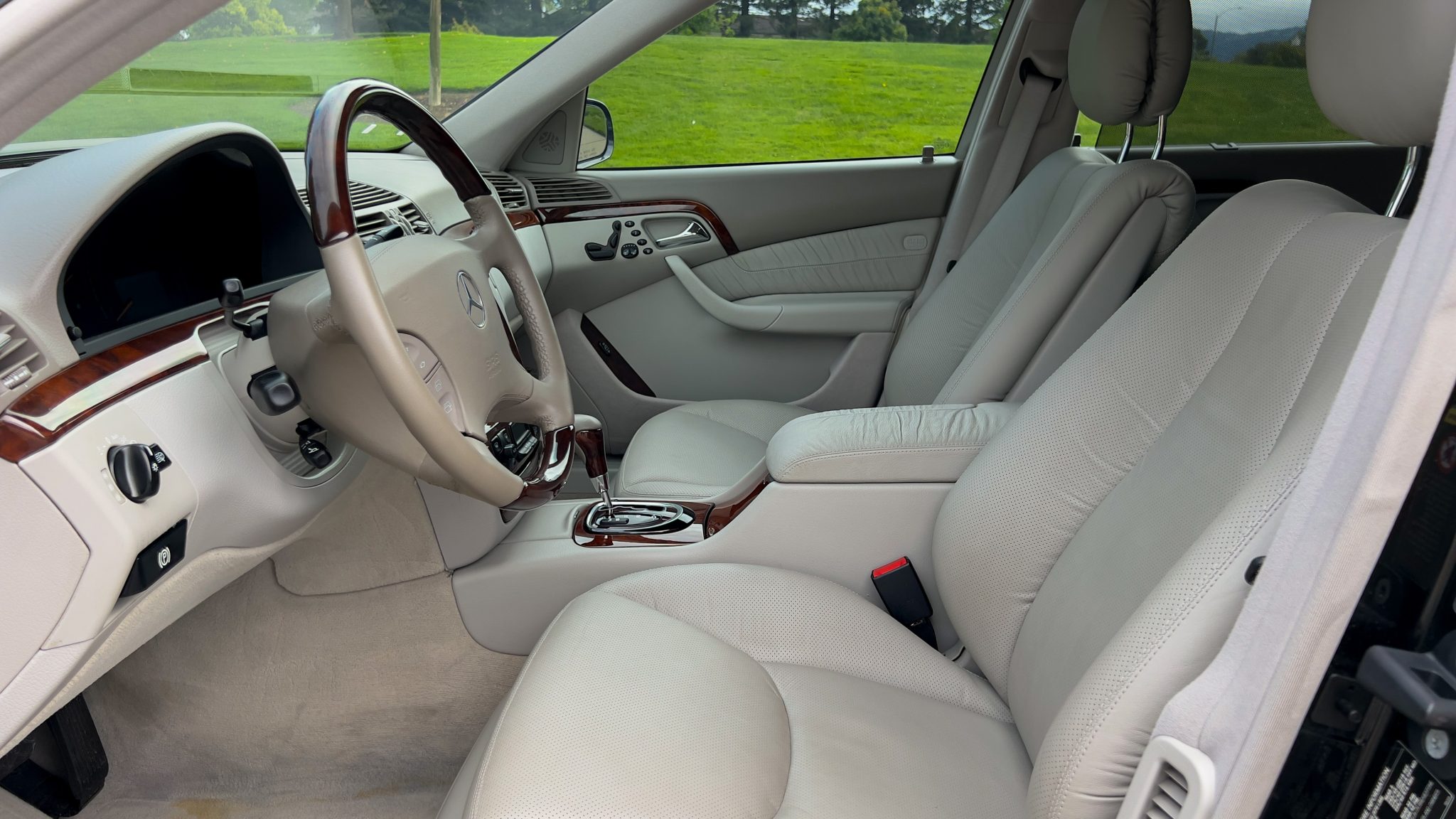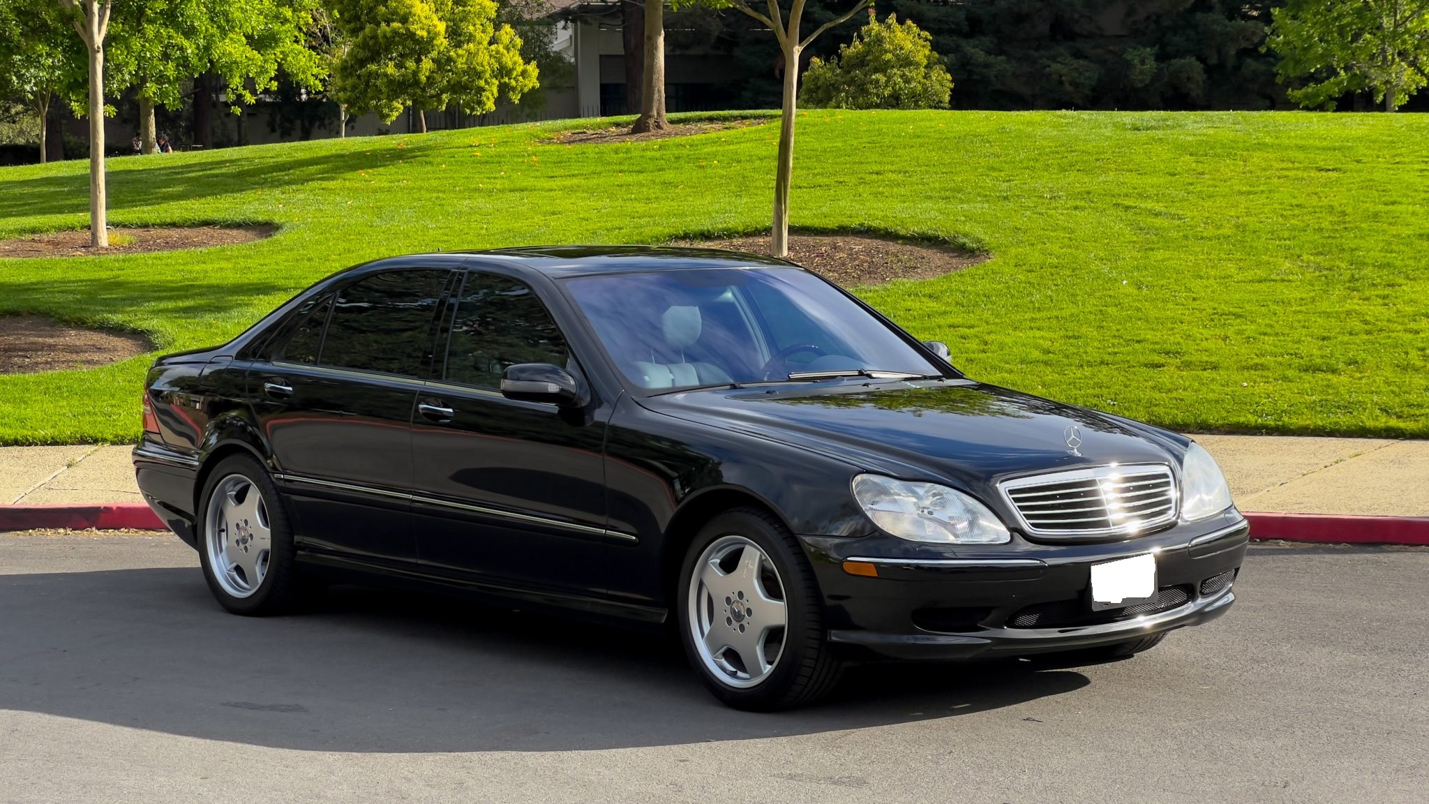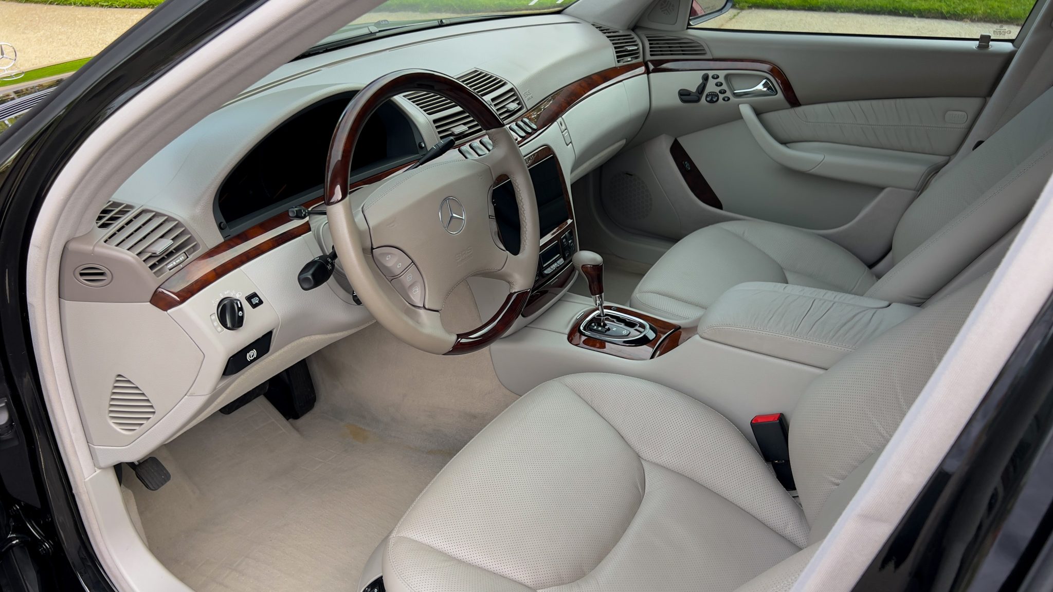 The car is powered by a 5.4-liter V8 paired with a five-speed automatic transmission and is finished in Obsidian Black over beige leather upholstery. Equipment includes 18″ AMG Monoblock wheels, a sunroof, bi-xenon headlights, a Bose sound system, and an aftermarket infotainment system with Apple CarPlay and an integrated backup camera.