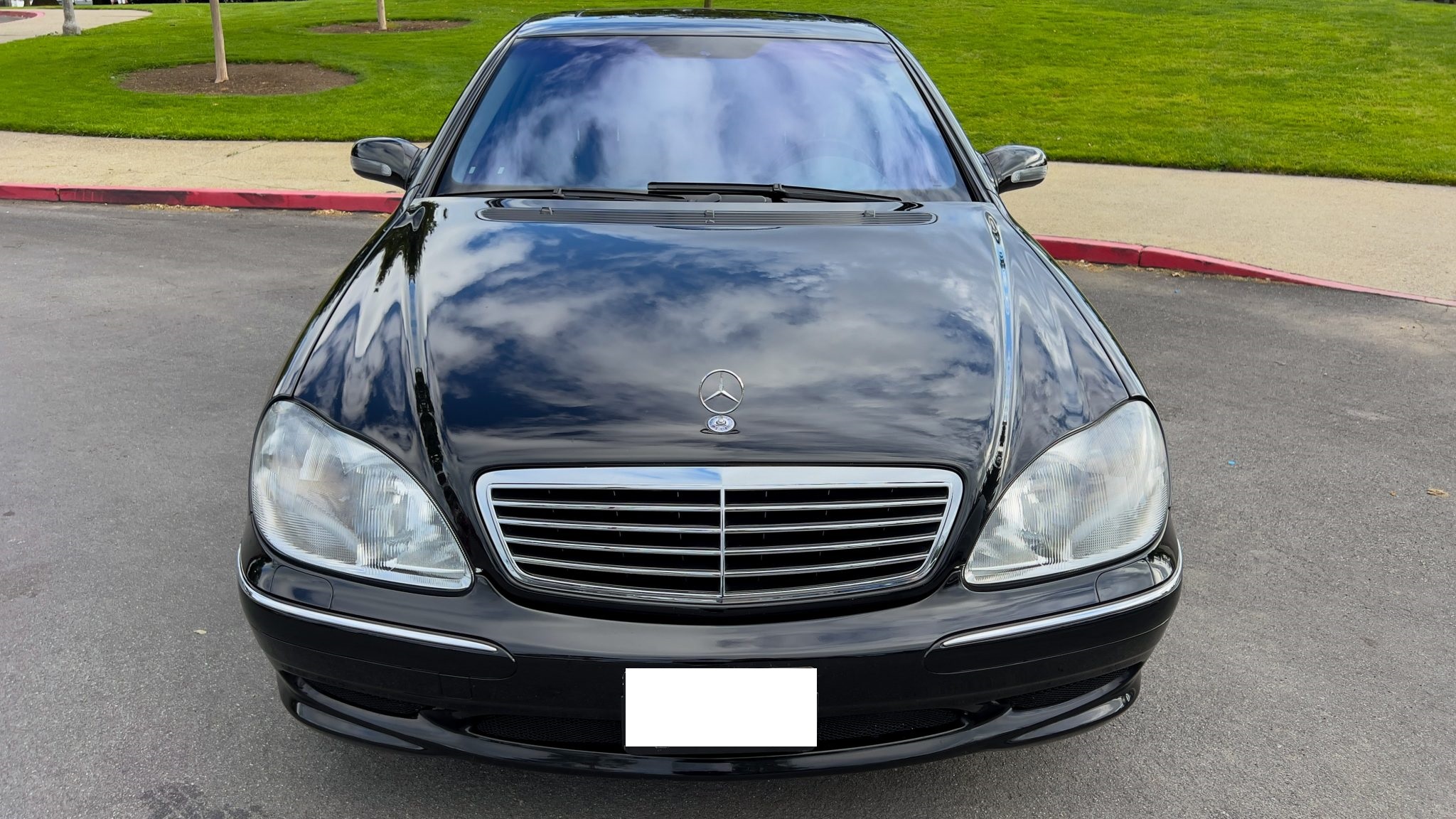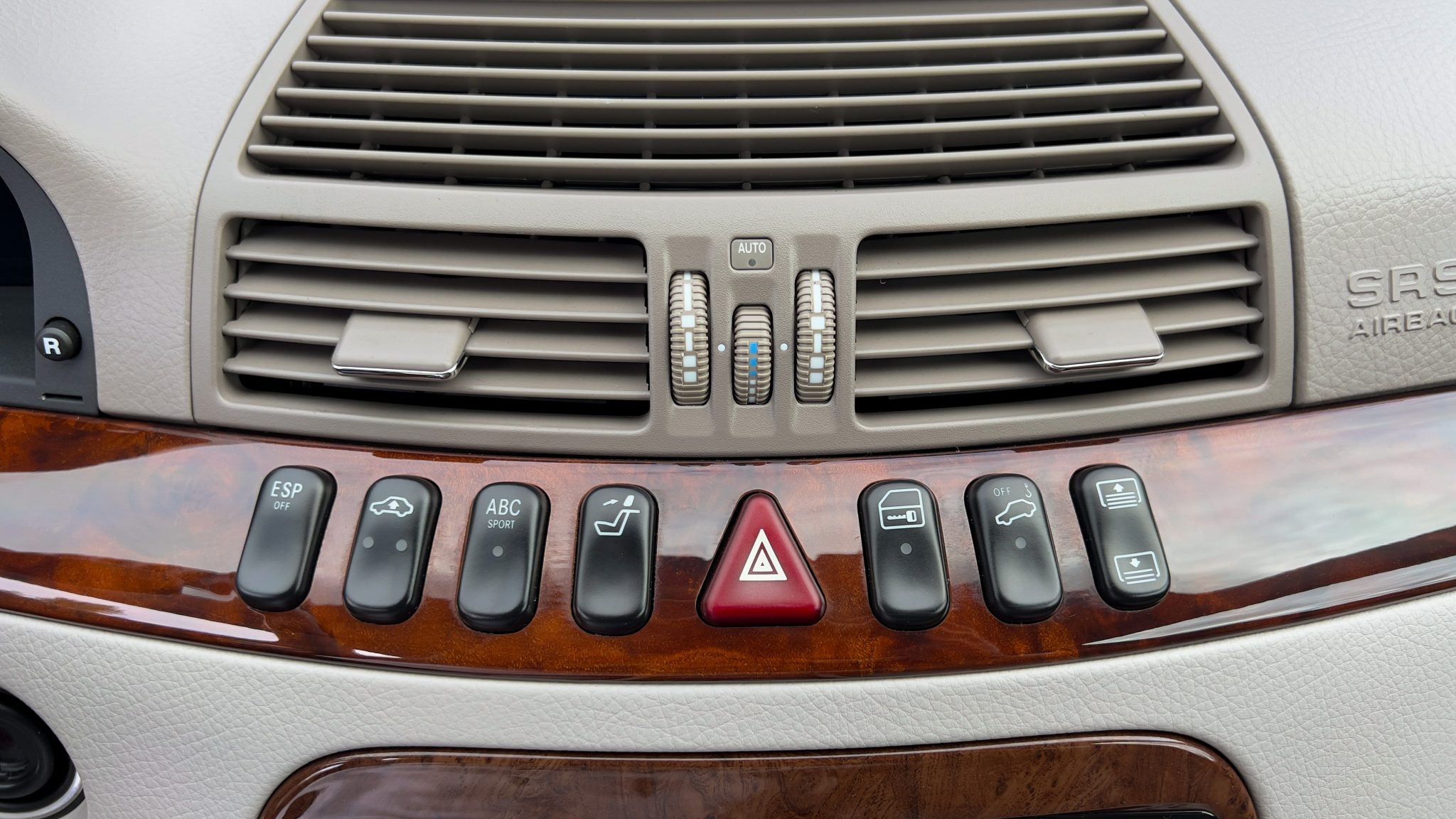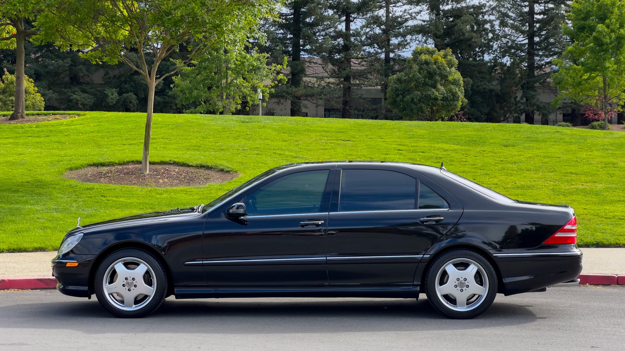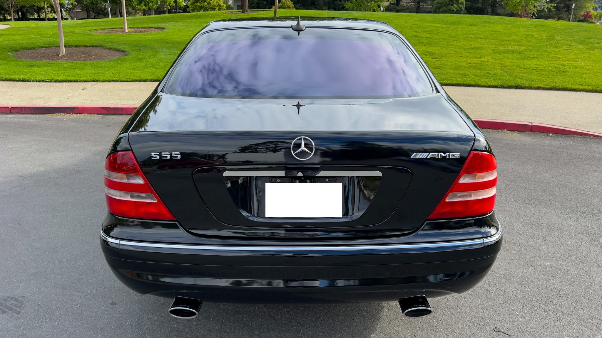 The car is powered by a 5.4-liter V8 paired with a five-speed automatic transmission and is finished in Obsidian Black over beige leather upholstery. Equipment includes 18″ AMG Monoblock wheels, a sunroof, bi-xenon headlights, a Bose sound system, and an aftermarket infotainment system with Apple CarPlay and an integrated backup camera.