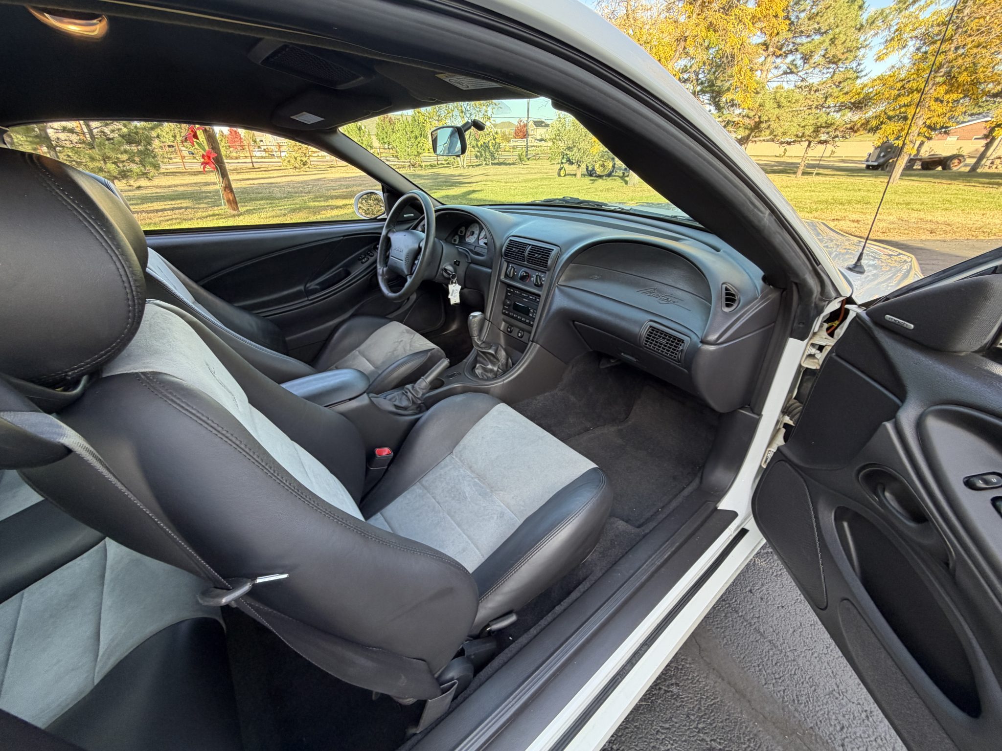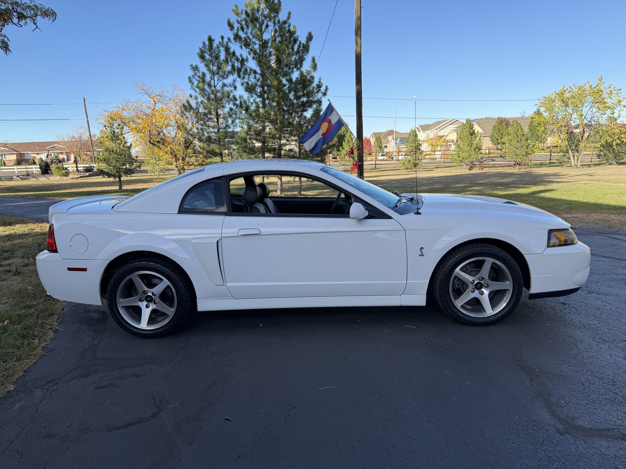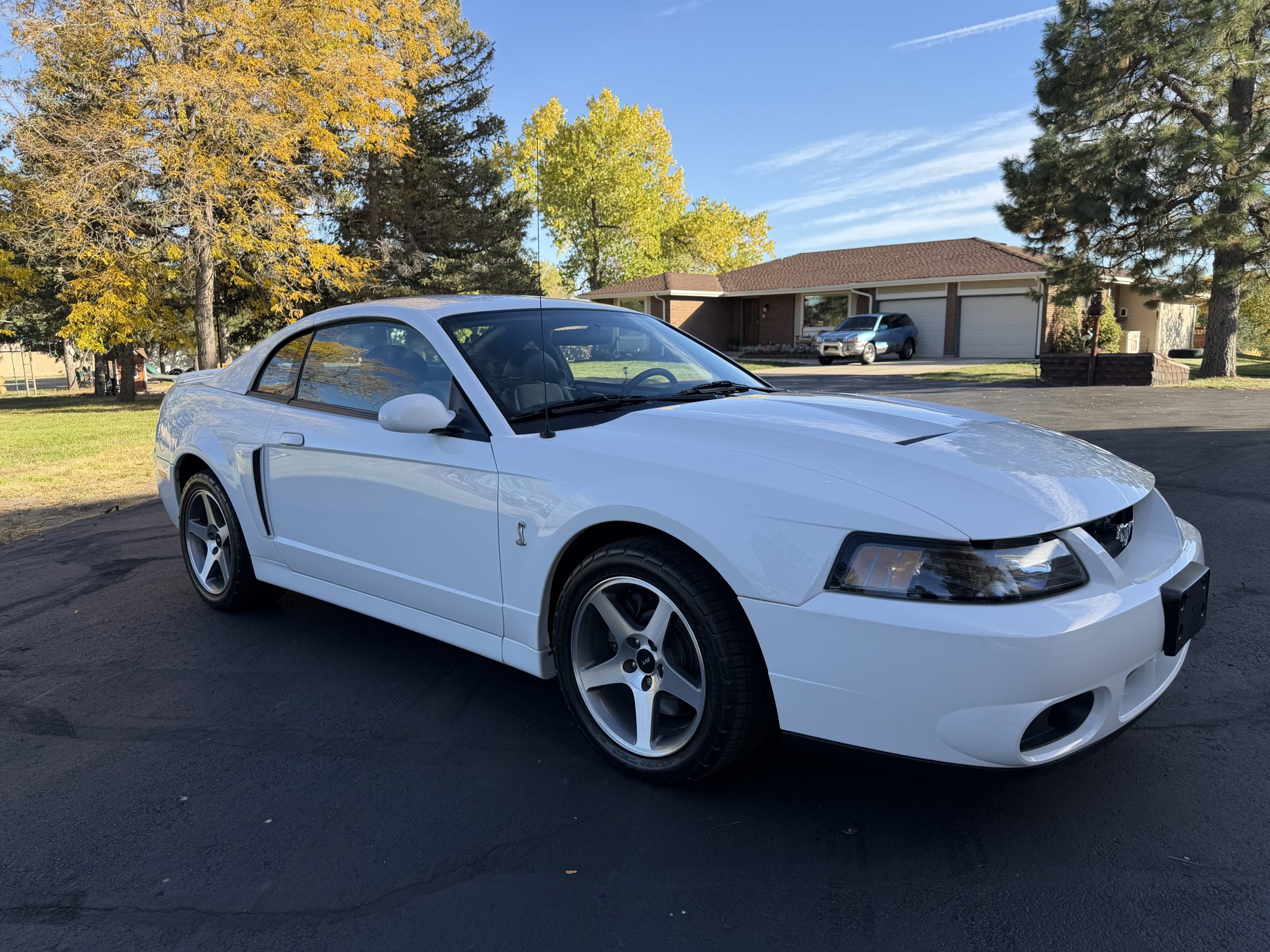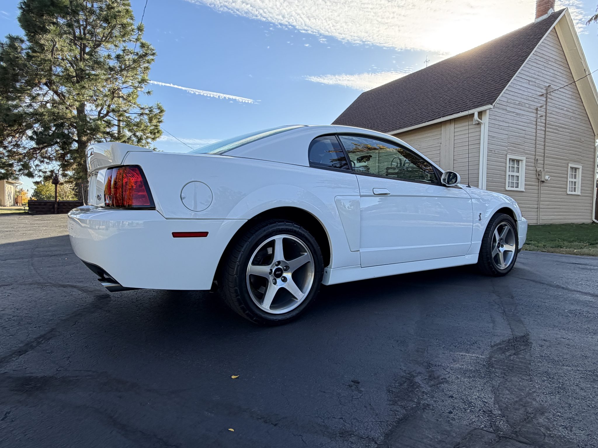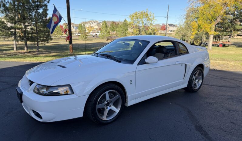 This 2003 Ford Mustang SVT Cobra coupe it now has 17k miles. It is finished in Oxford White Clearcoat over Dark Charcoal Nudo leather. The car is powered by a supercharged 4.6-liter DOHC V8 linked with a six-speed manual transmission, and equipment includes a limited-slip differential, 17″ chrome five-spoke wheels, an independent rear suspension, a vented hood, a rear spoiler, fog lights, articulated front sport seats, an aftermarket air intake system, Flowmaster mufflers, a Mach 460 AM/FM/cassette stereo, a CD changer, remote keyless entry, cruise control, air conditioning, and power windows, mirrors, and locks.