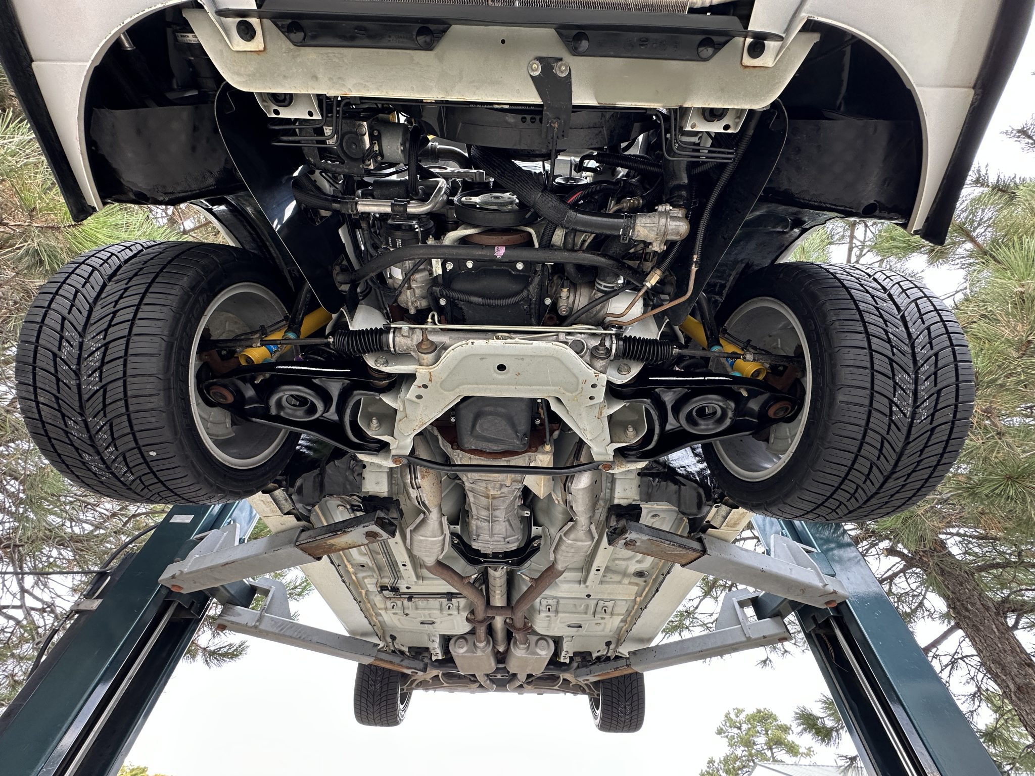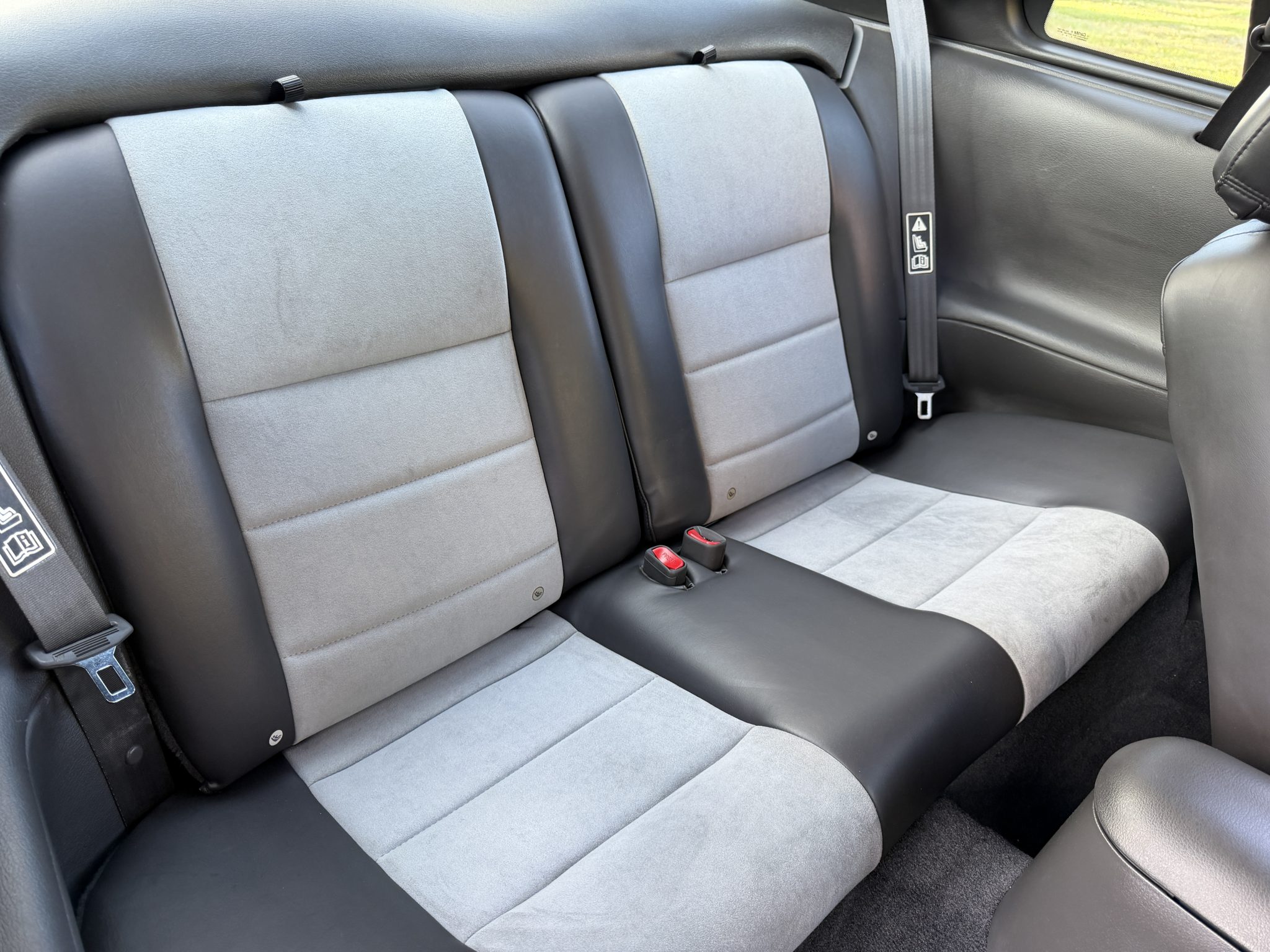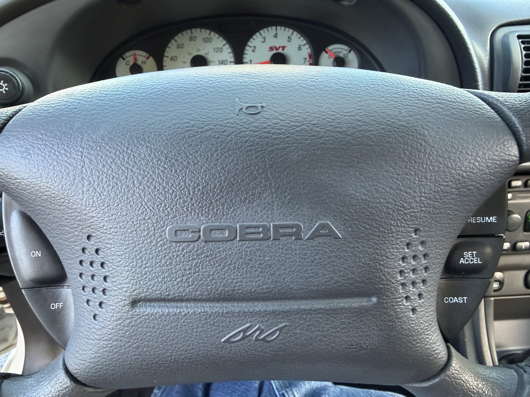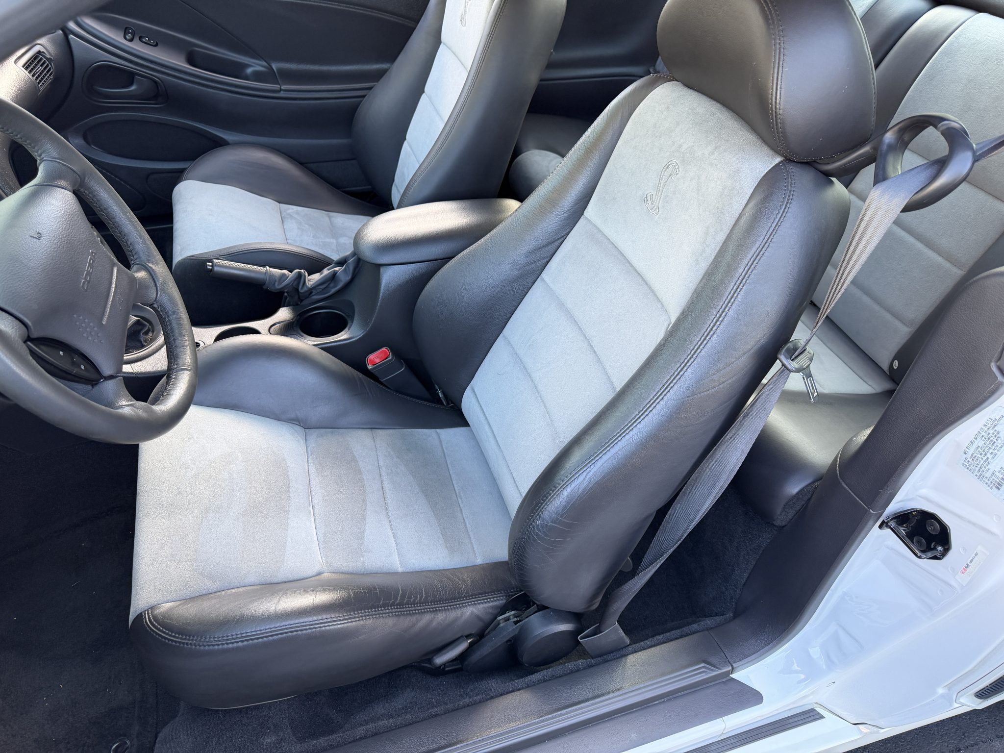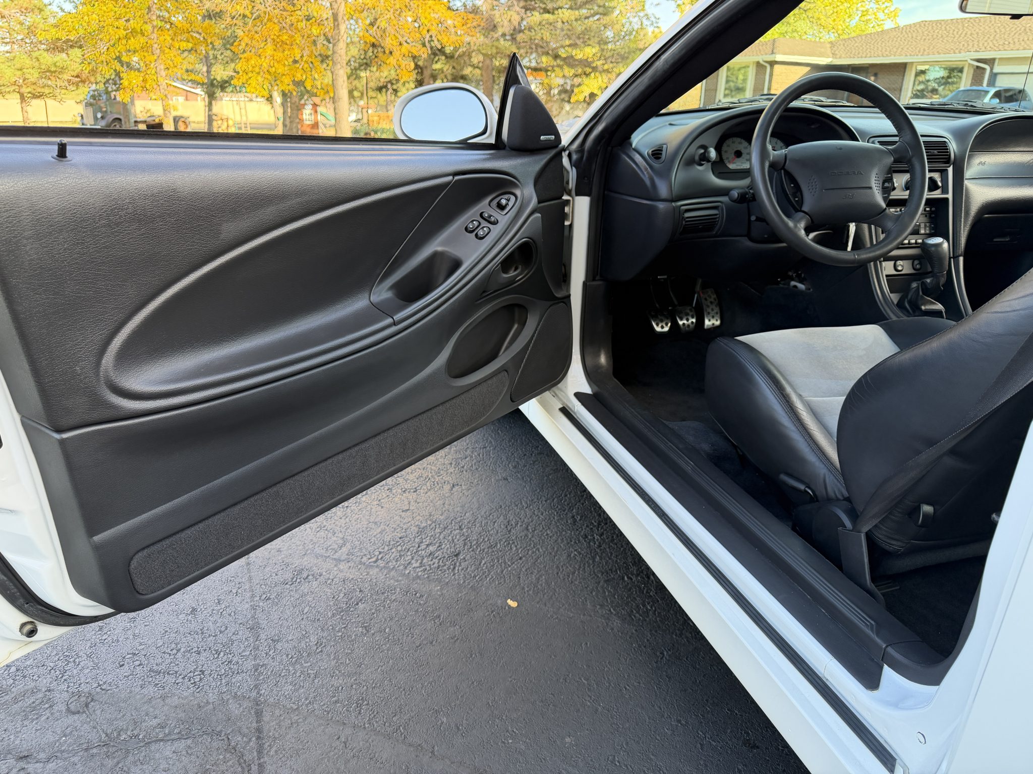 This 2003 Ford Mustang SVT Cobra coupe it now has 17k miles. It is finished in Oxford White Clearcoat over Dark Charcoal Nudo leather. The car is powered by a supercharged 4.6-liter DOHC V8 linked with a six-speed manual transmission, and equipment includes a limited-slip differential, 17″ chrome five-spoke wheels, an independent rear suspension, a vented hood, a rear spoiler, fog lights, articulated front sport seats, an aftermarket air intake system, Flowmaster mufflers, a Mach 460 AM/FM/cassette stereo, a CD changer, remote keyless entry, cruise control, air conditioning, and power windows, mirrors, and locks.