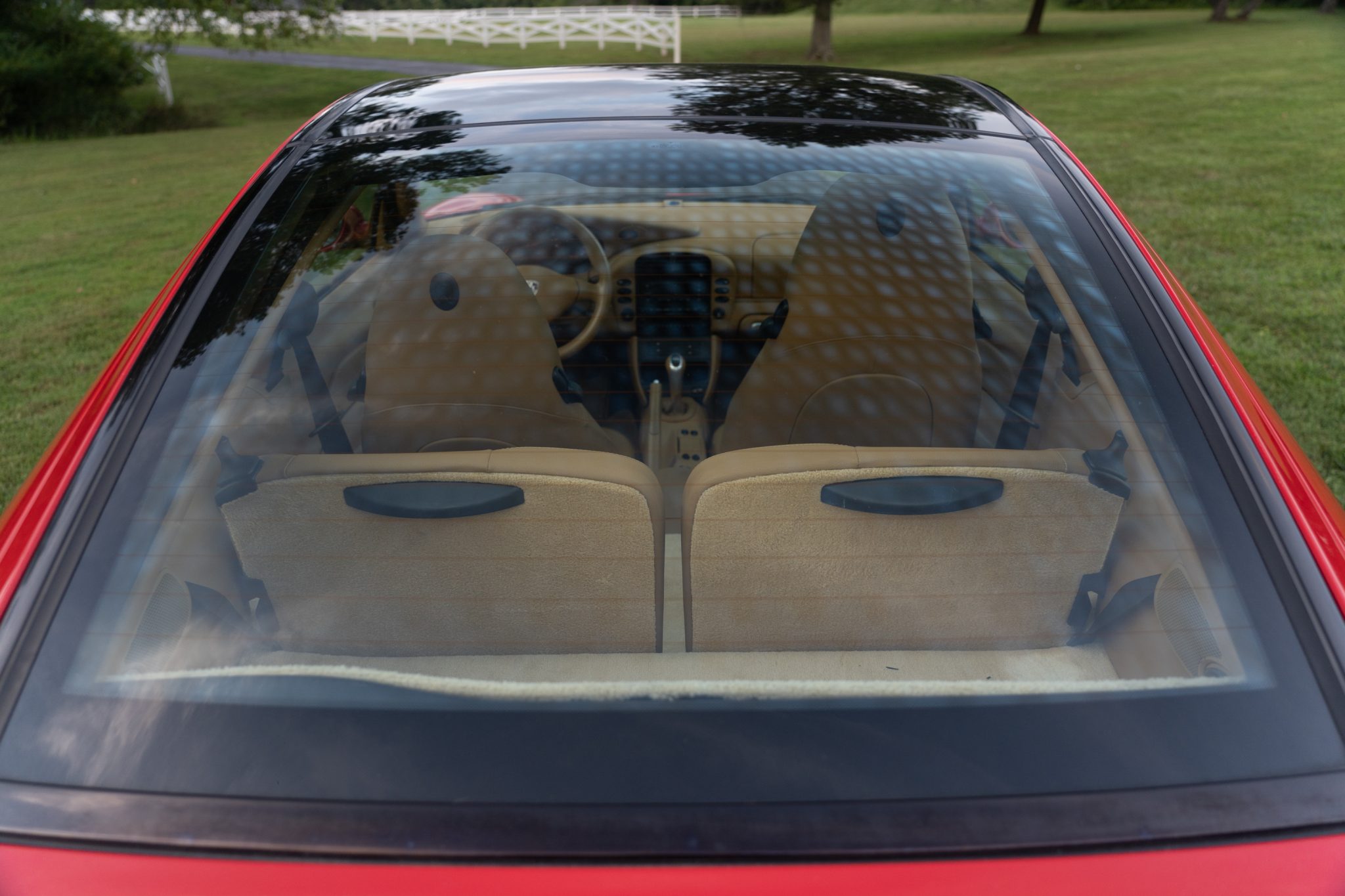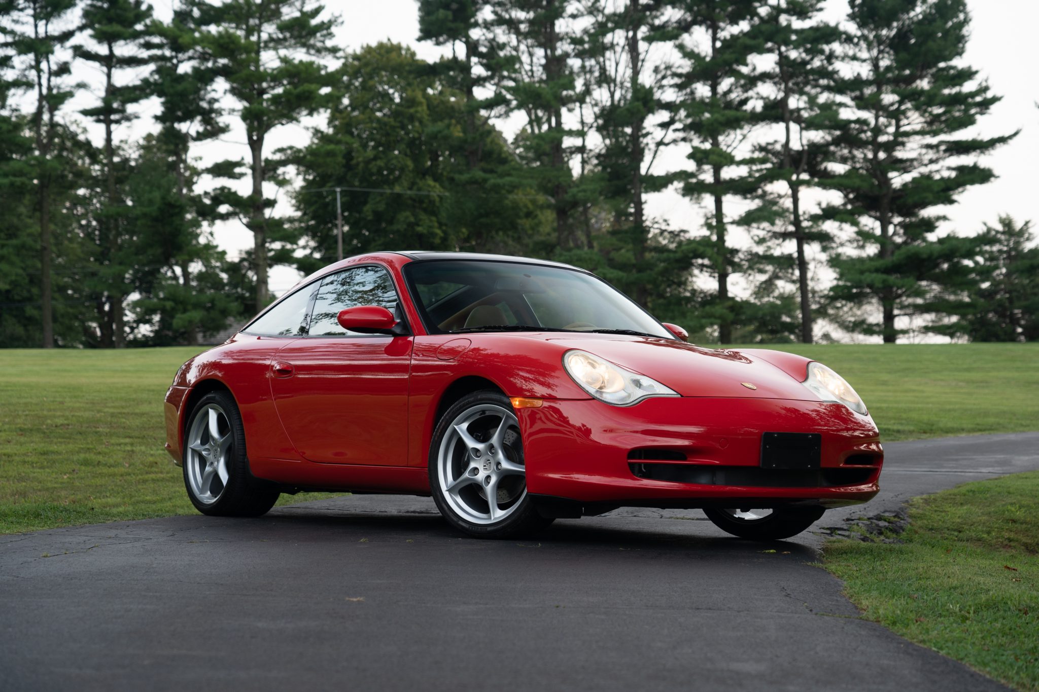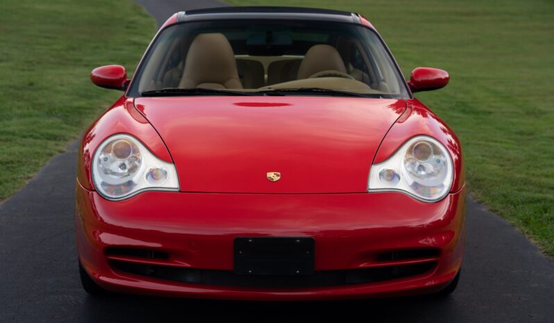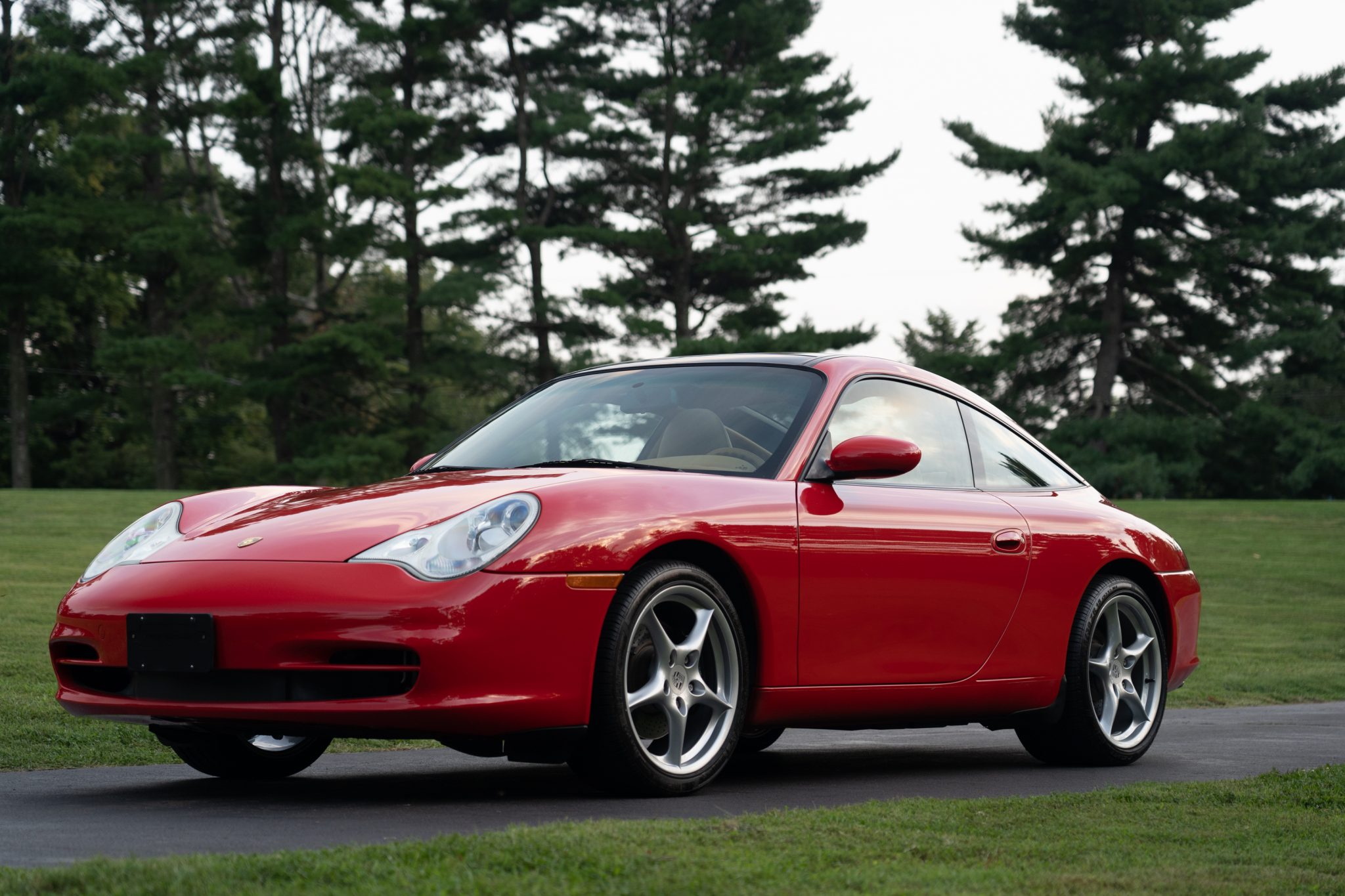 This 2003 Porsche 911 Targa is finished in Guards Red over Savannah Beige leather and powered by a 3.6-liter flat-six paired with a six-speed manual transaxle. Equipment includes a sliding glass roof panel, 18″ wheels, automatic climate control, and Porsche Stability Management.