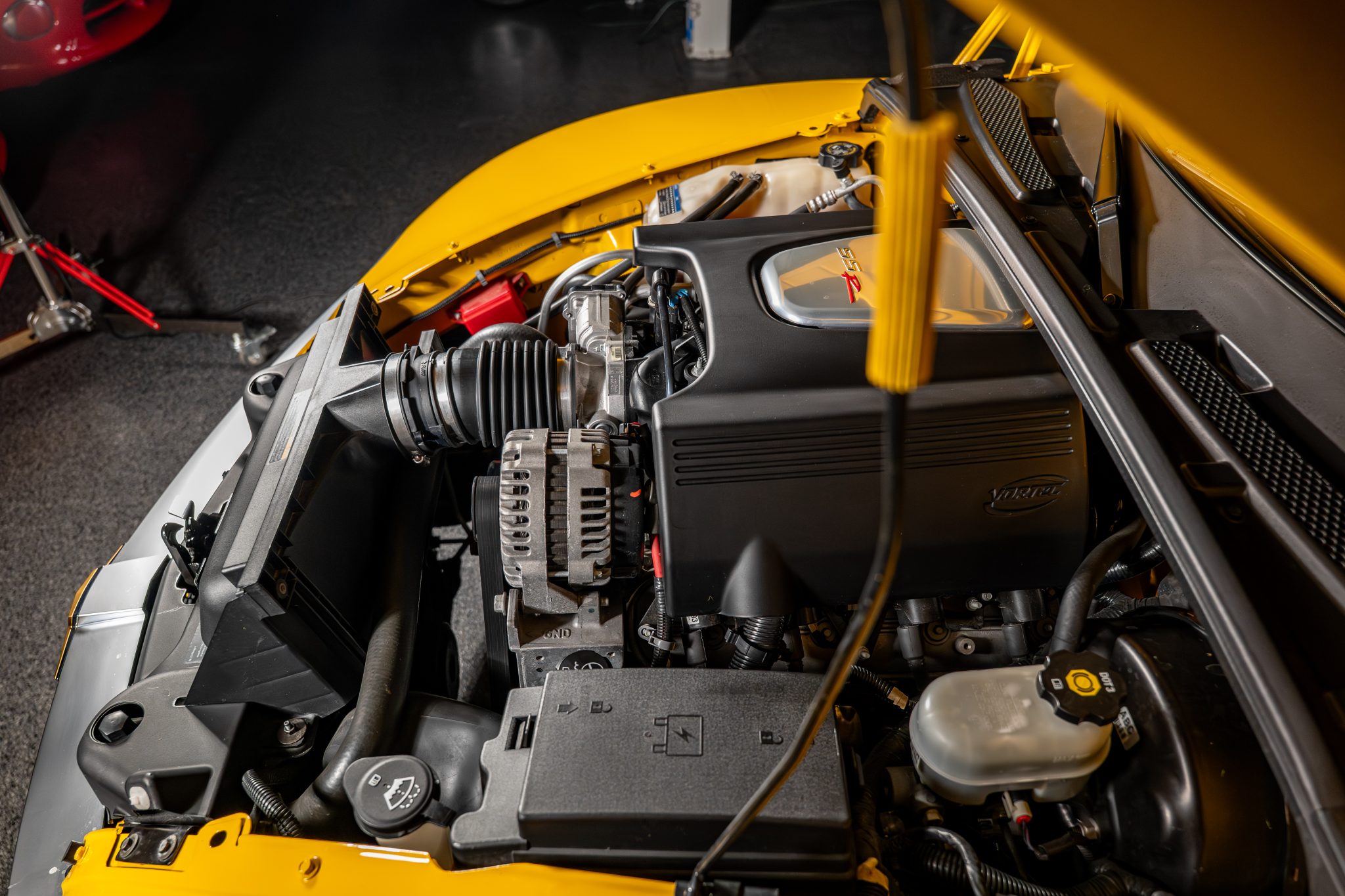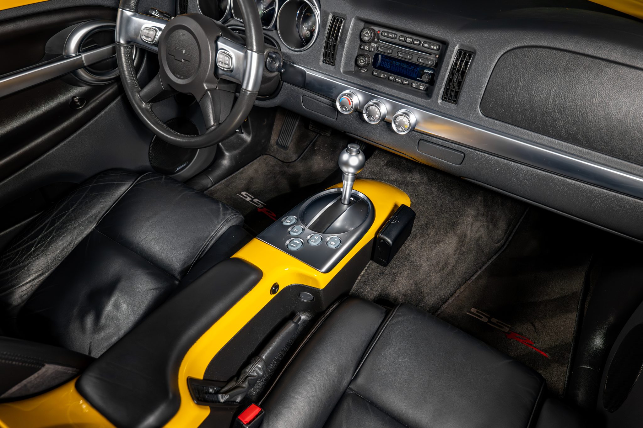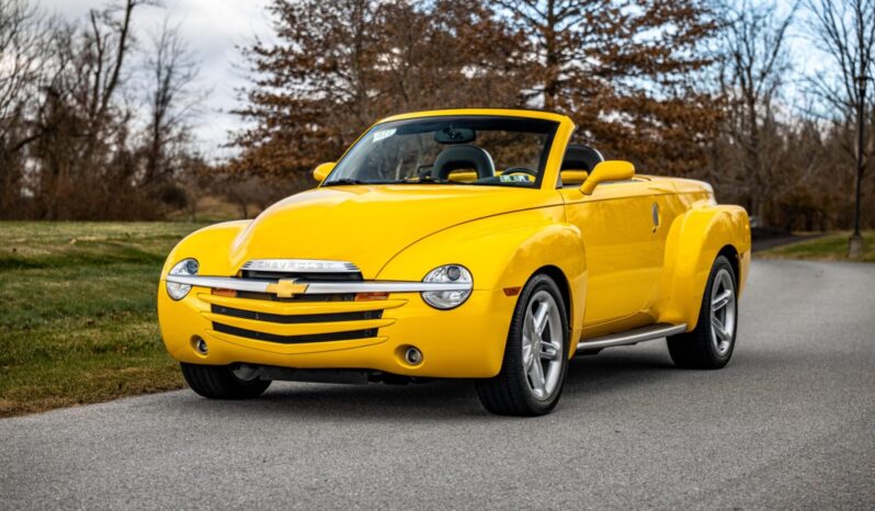 This 2004 Chevrolet SSR is a Slingshot Yellow convertible powered by a 5.3-liter V8 linked to a four-speed automatic transmission and a limited-slip differential. Equipment includes a power-folding hardtop, satin chrome running boards, wood cargo floor rub strips, a sport suspension, staggered-diameter cast-aluminum wheels, and heated power-adjustable twin bucket seats with Ebony leather upholstery as well as remote keyless entry, cruise control, and air conditioning.