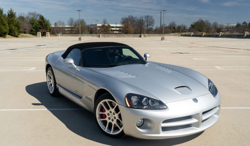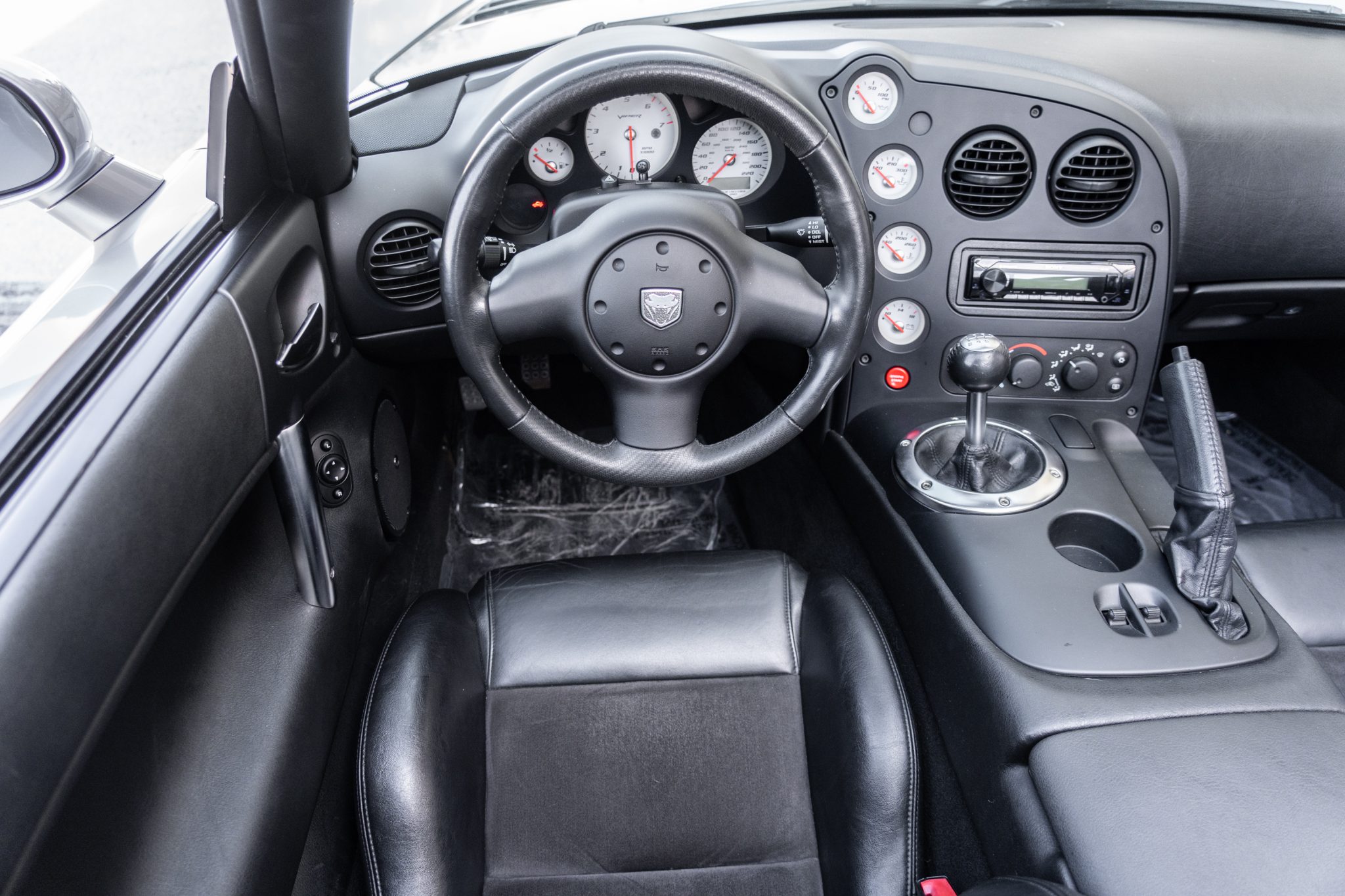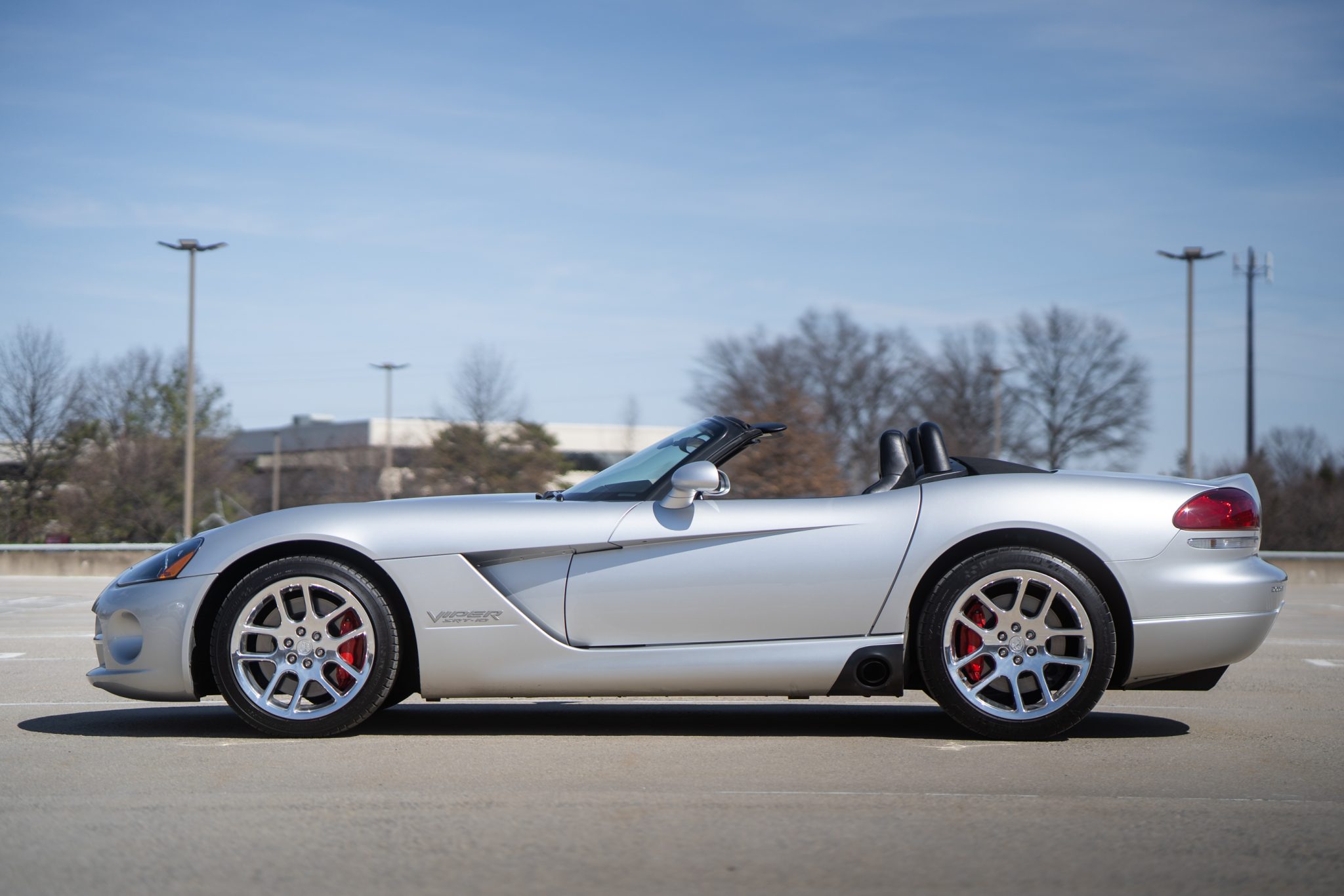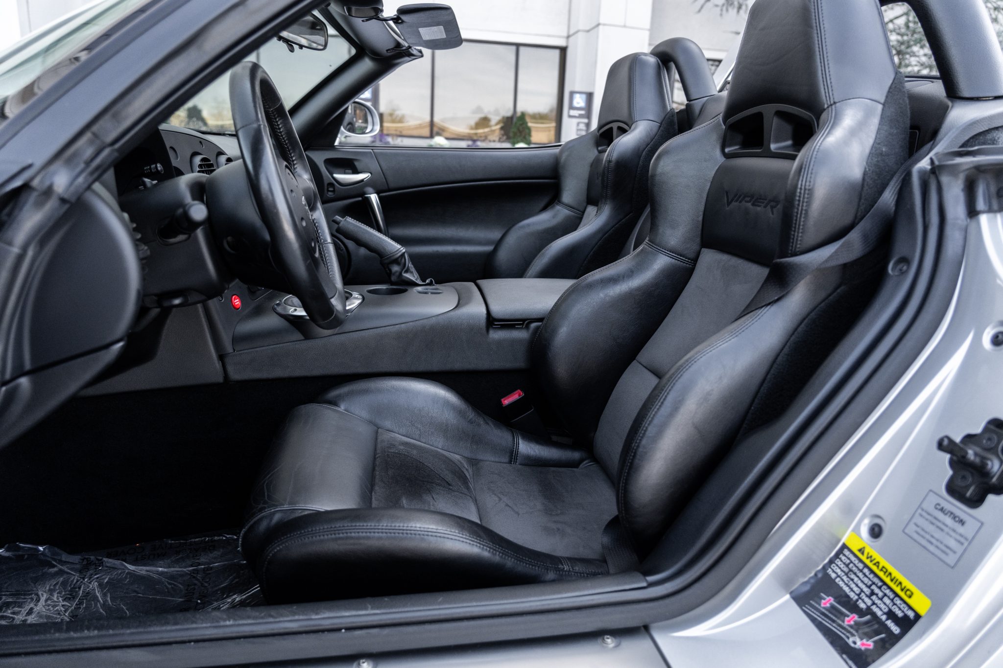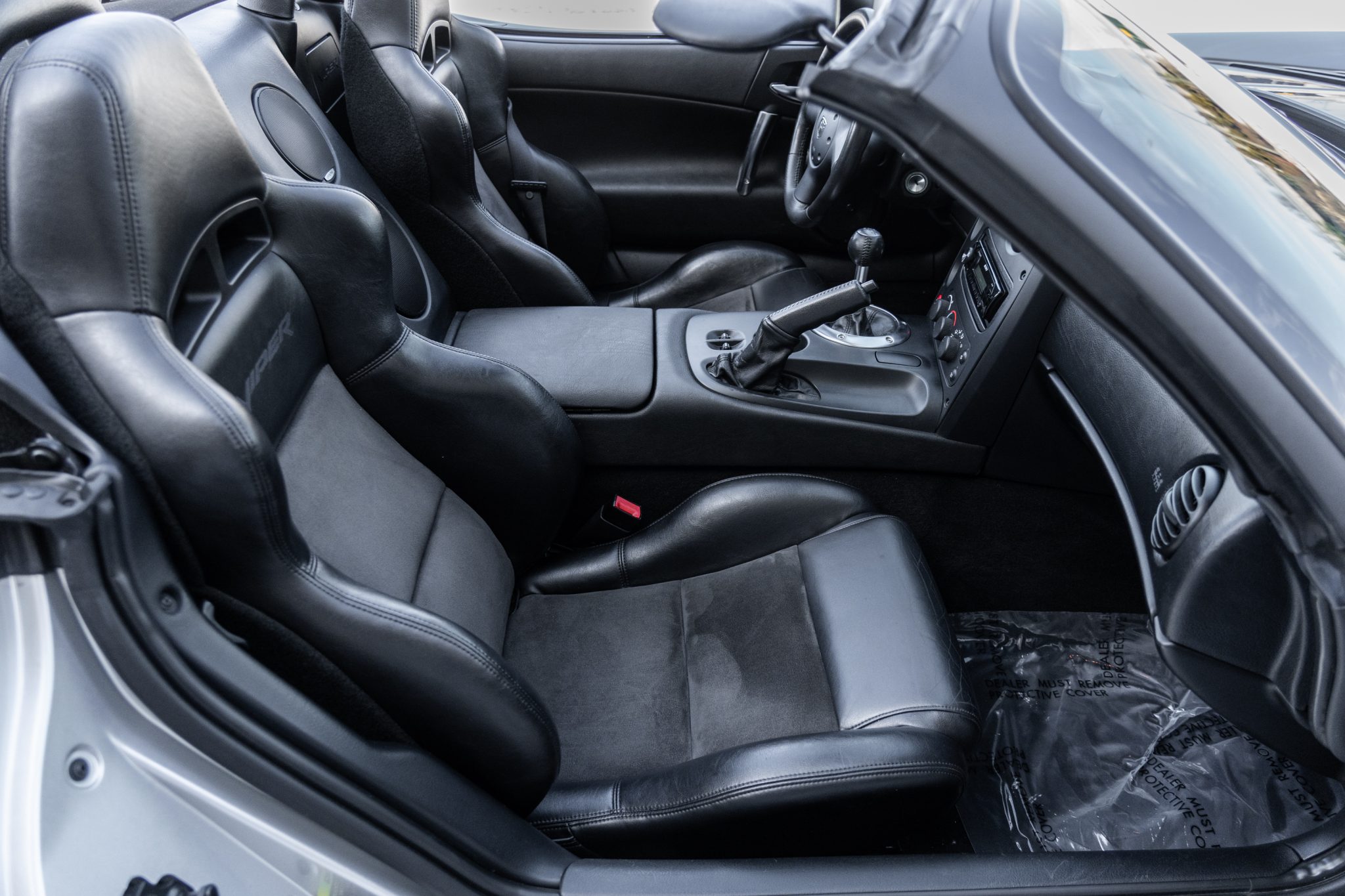 The car is finished in Viper Bright Silver Metallic over black leather and is powered by an 8.3-liter V10 paired with a Tremec T56 six-speed manual transmission. Features include a limited-slip differential, a black soft top, staggered-diameter wheels, air conditioning, and a Sony stereo.