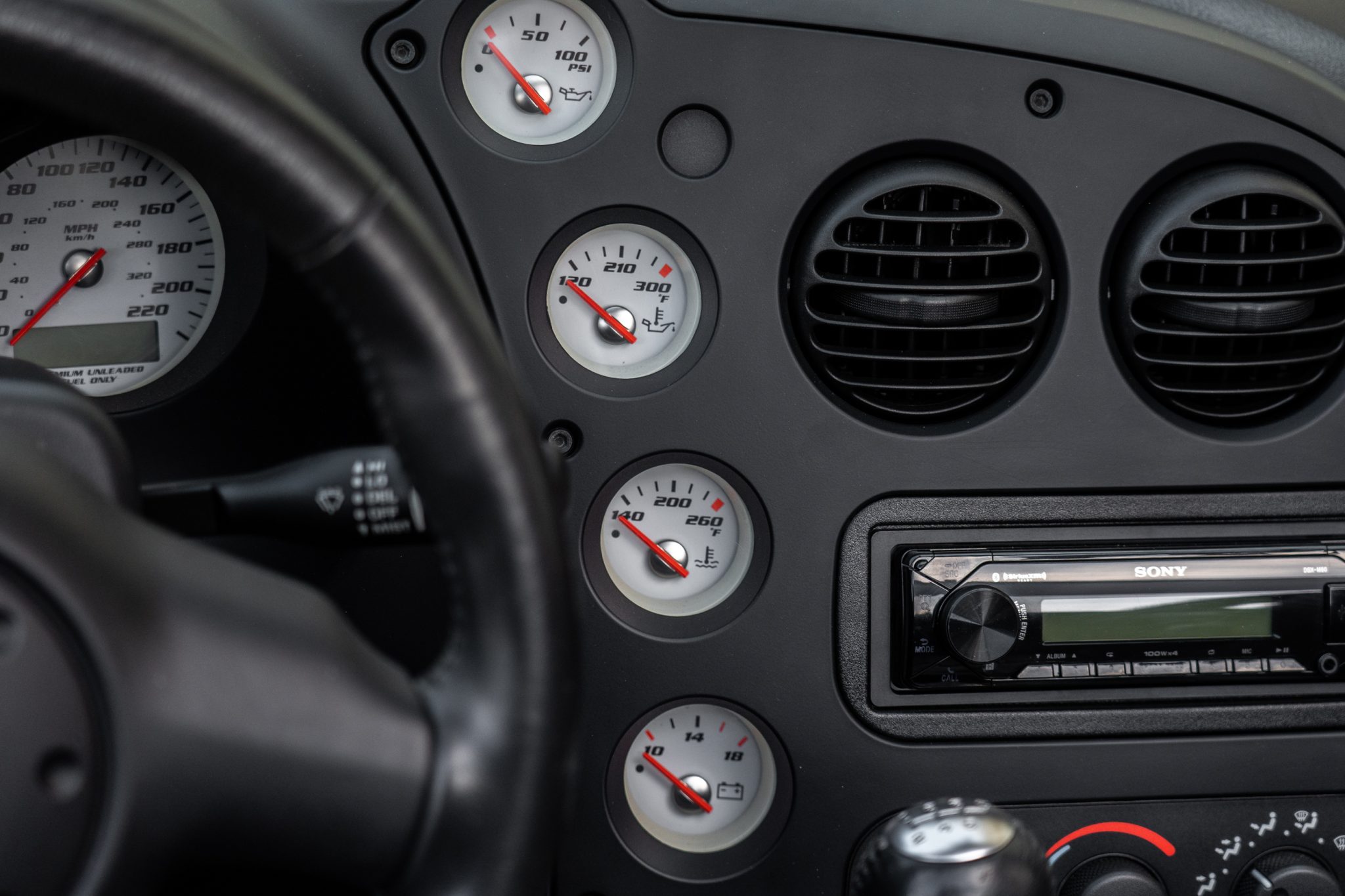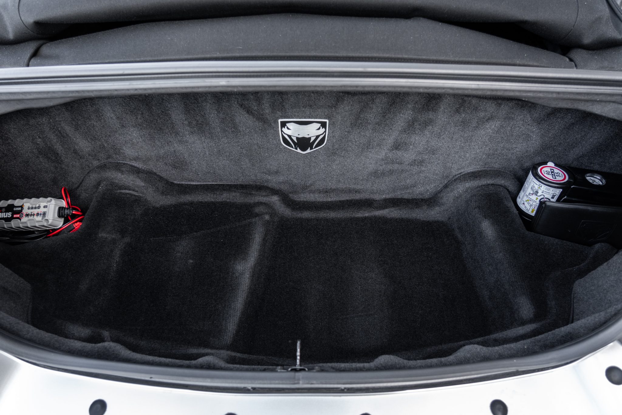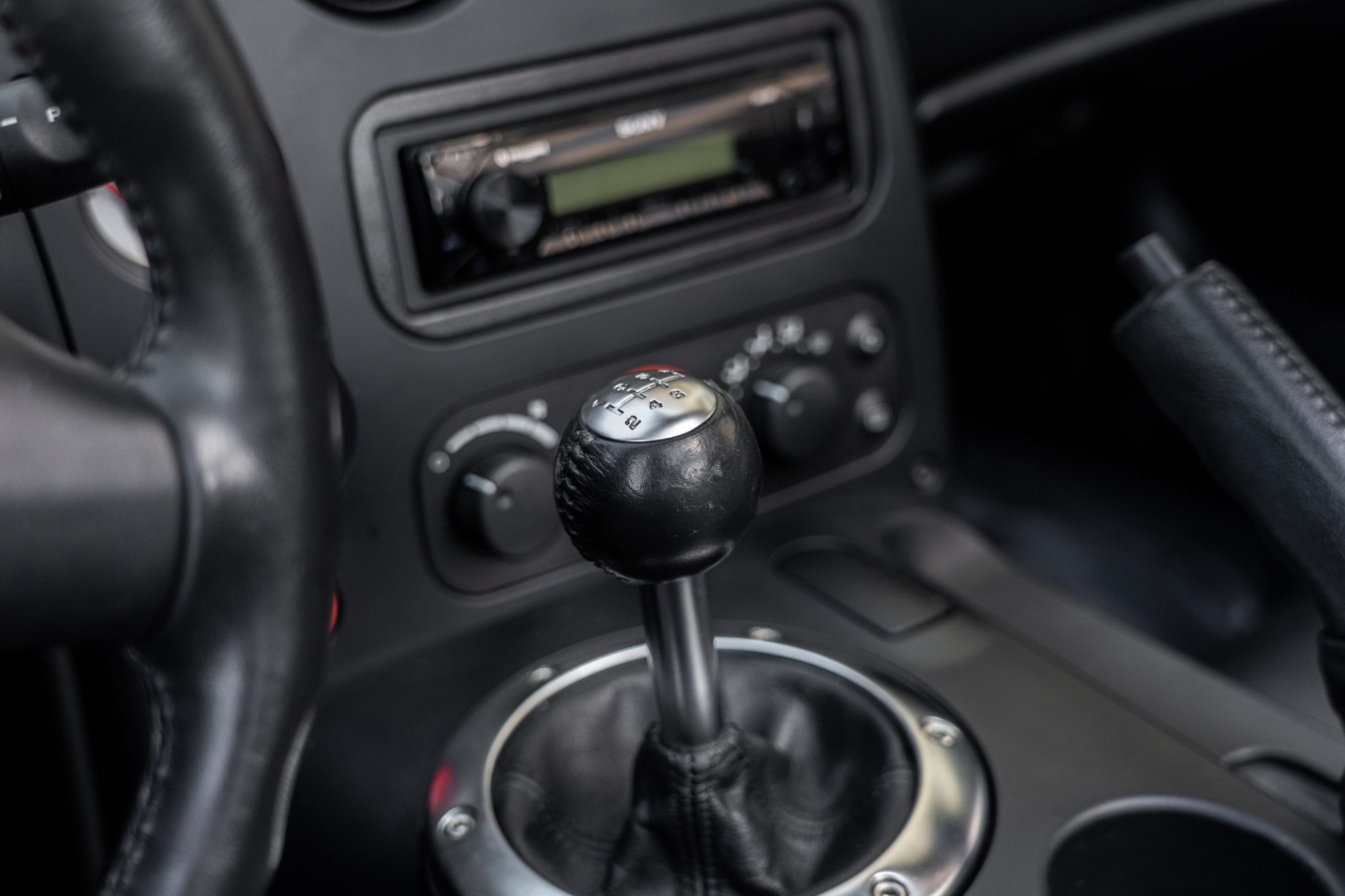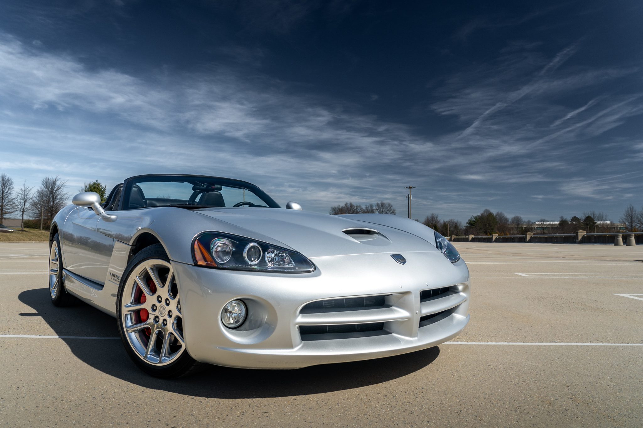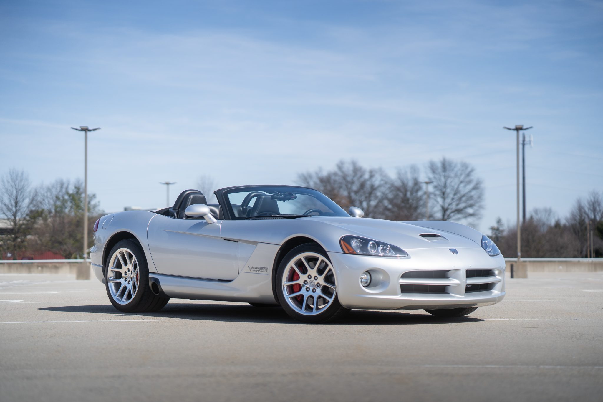 The car is finished in Viper Bright Silver Metallic over black leather and is powered by an 8.3-liter V10 paired with a Tremec T56 six-speed manual transmission. Features include a limited-slip differential, a black soft top, staggered-diameter wheels, air conditioning, and a Sony stereo.