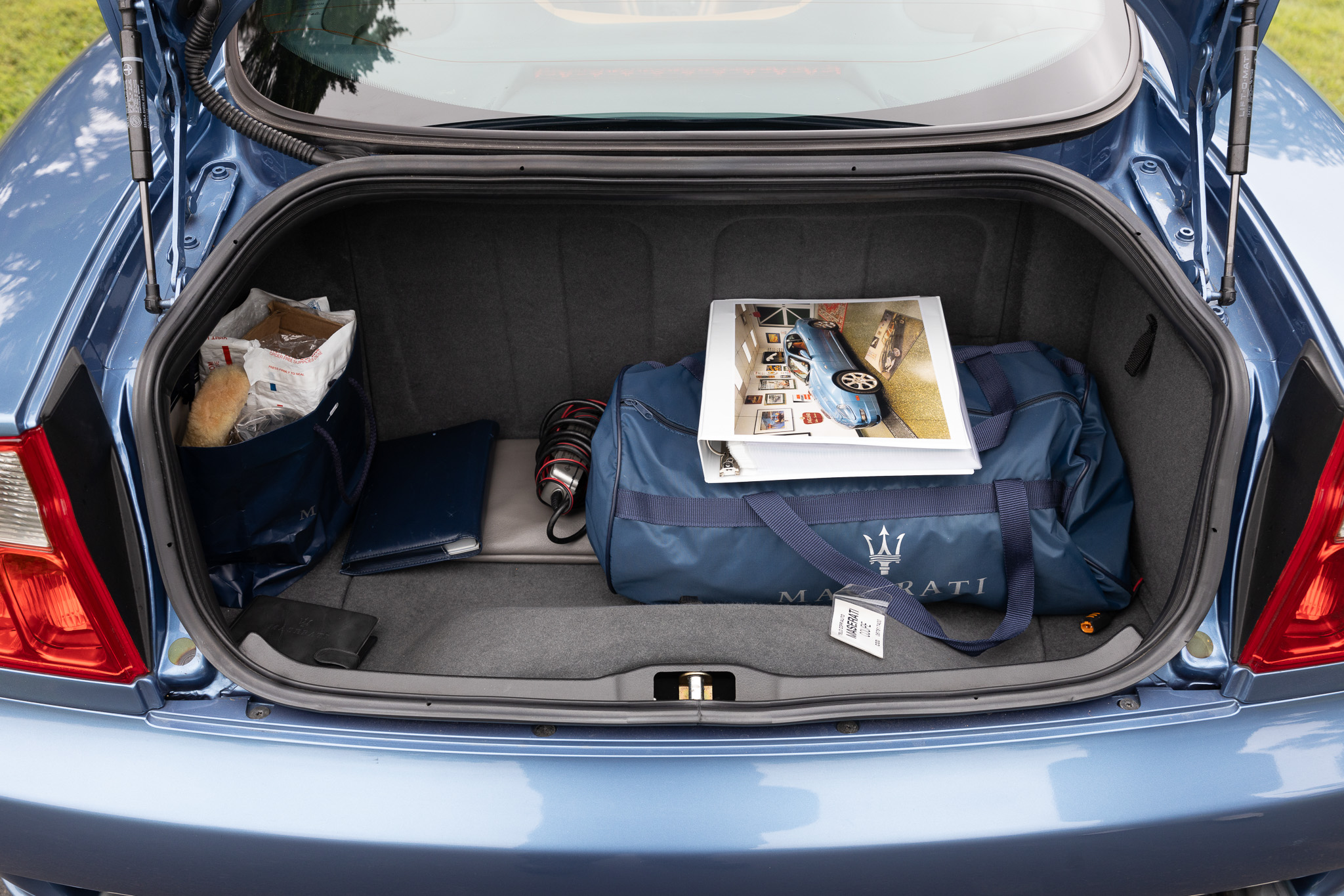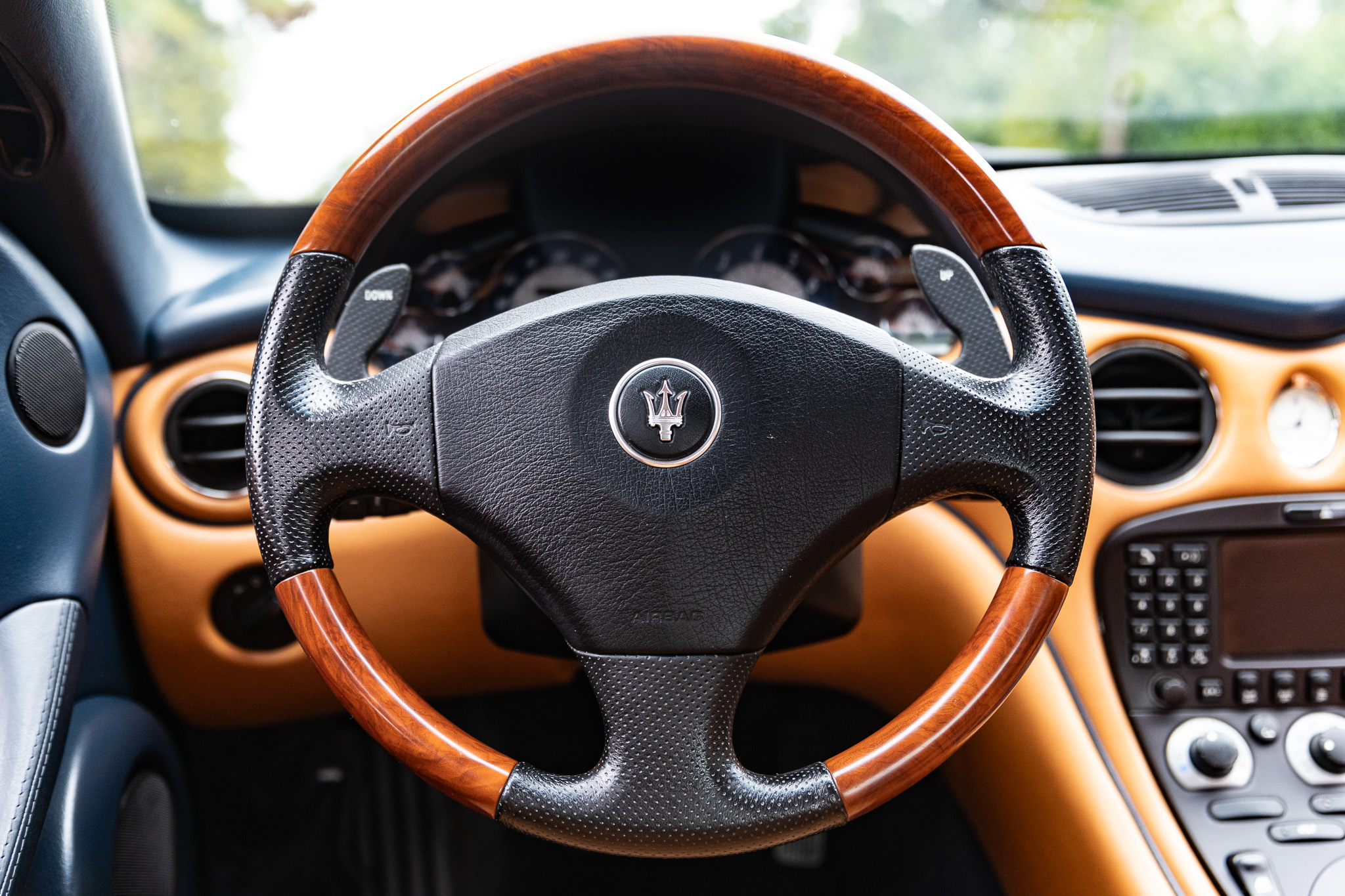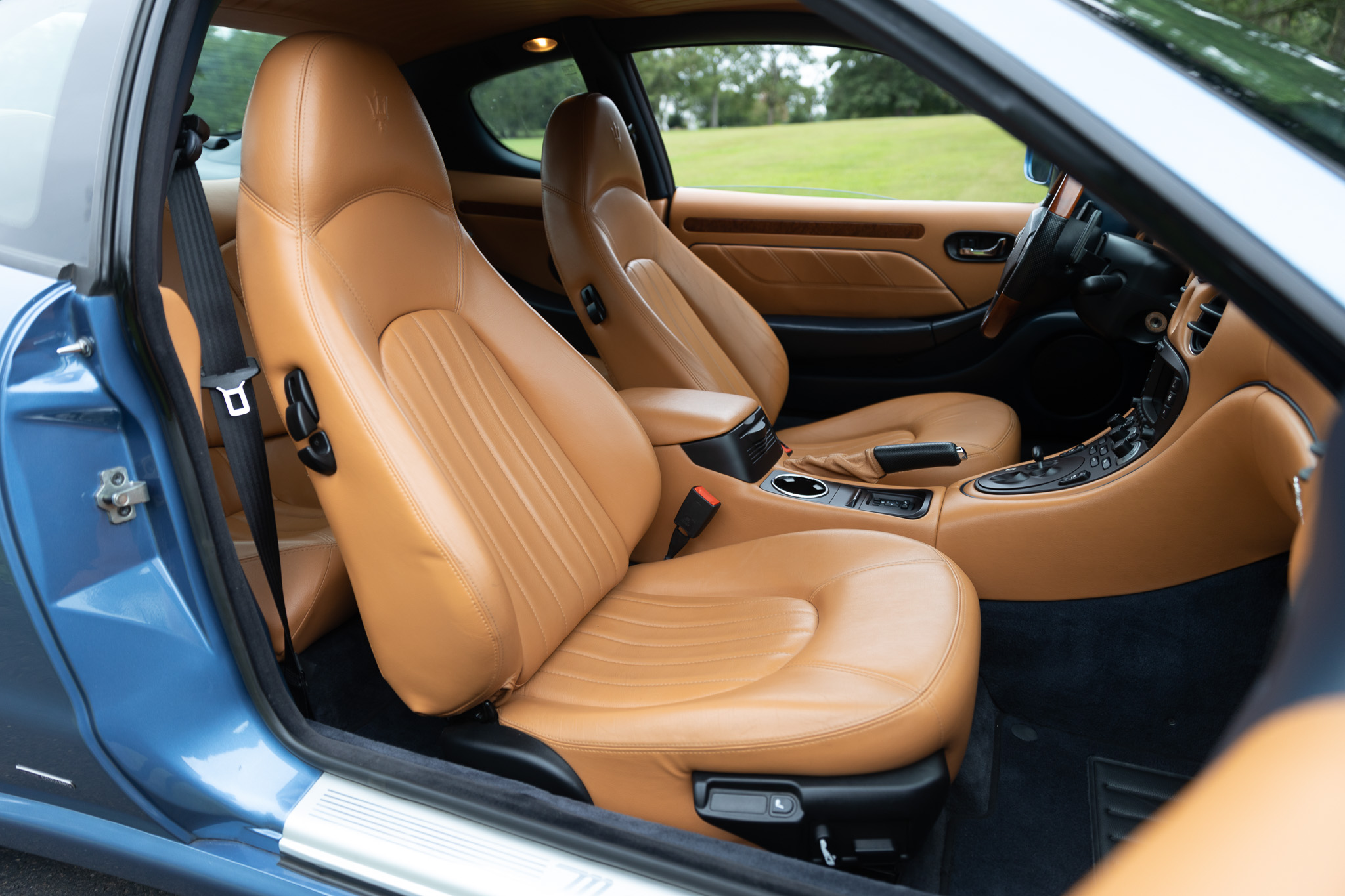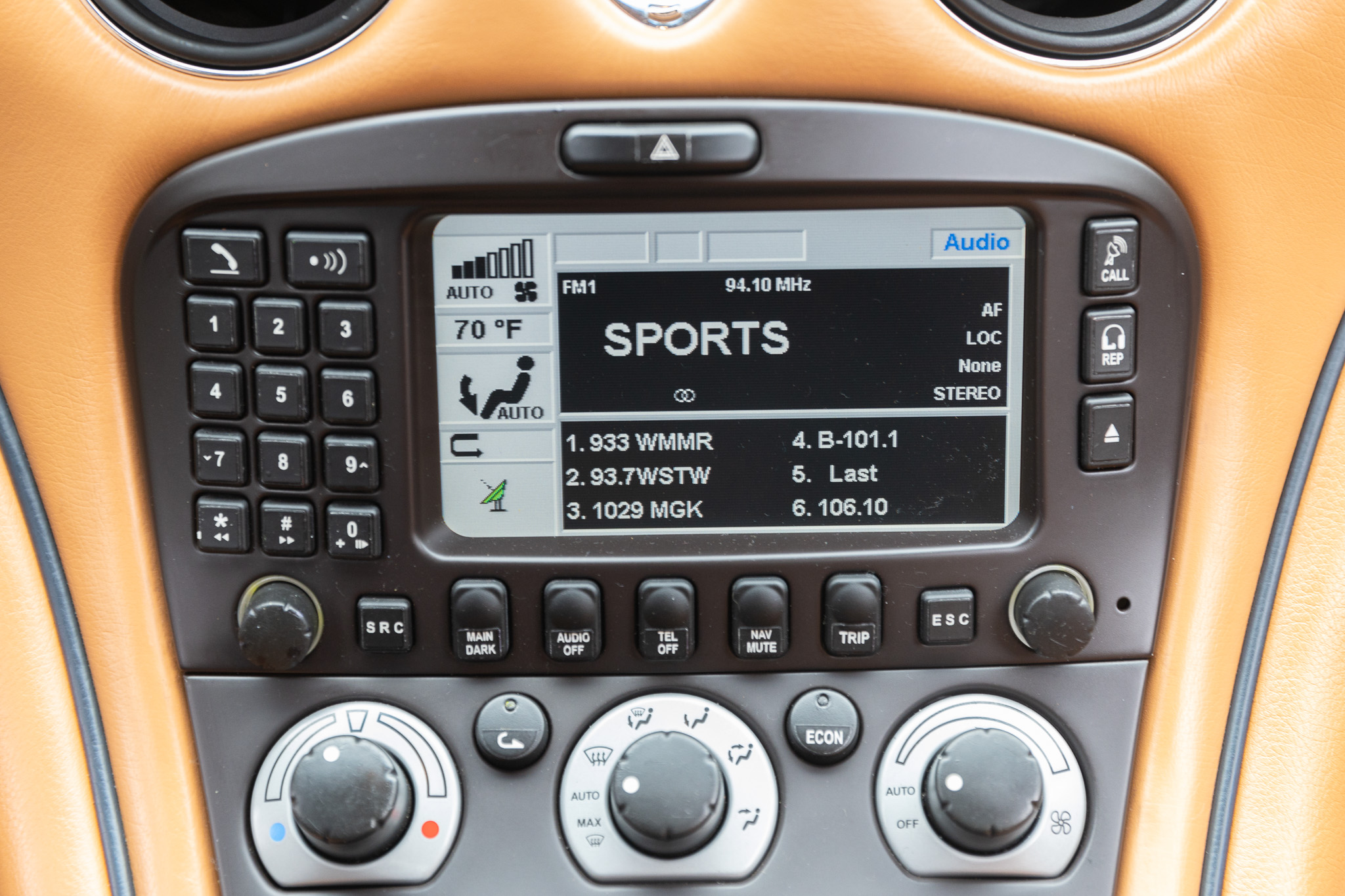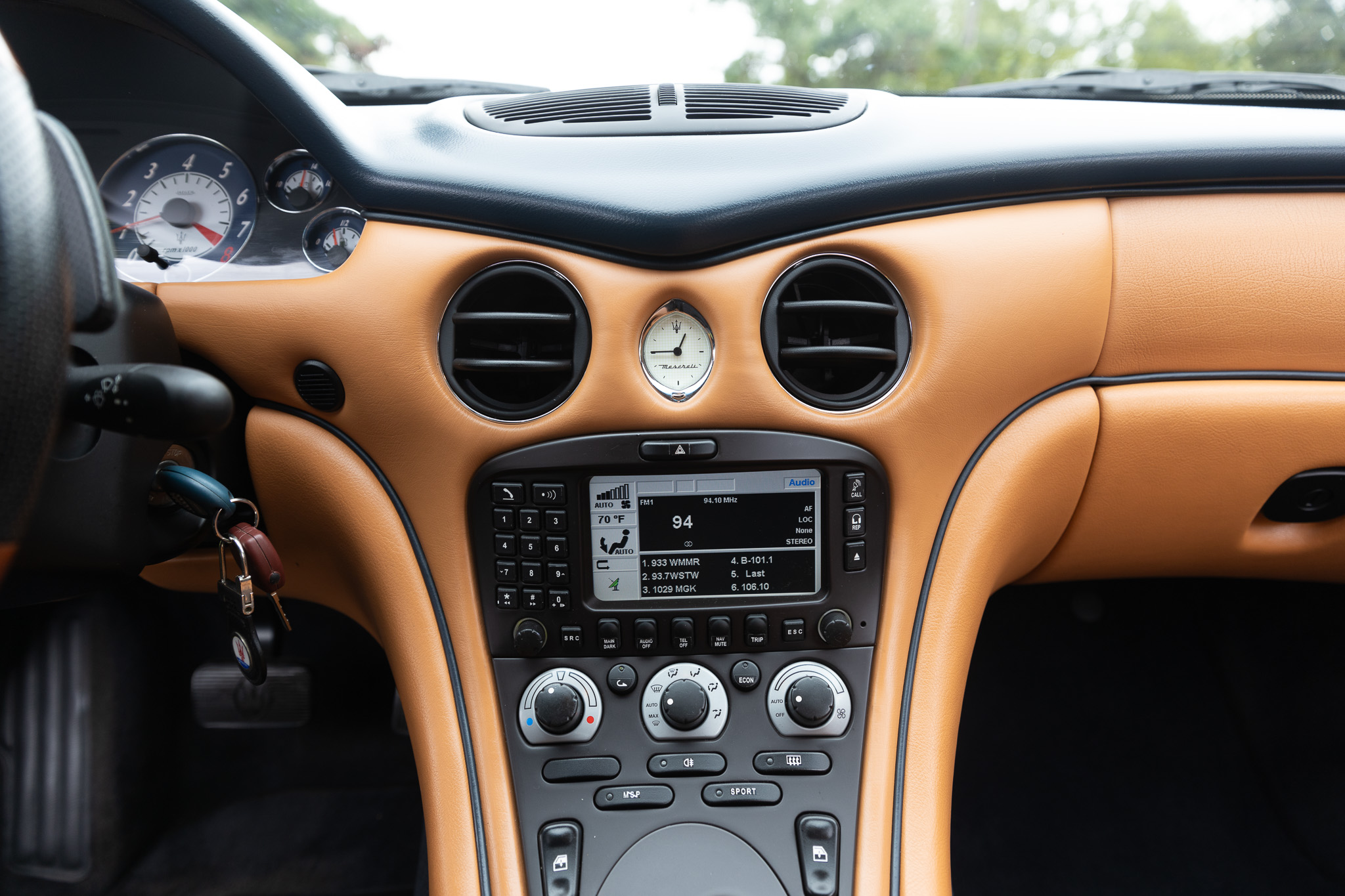 The car was ordered with over $10k in optional equipment including a Skyhook adjustable suspension, xenon headlights, heated front seats, a navigation system, a leather headliner, and a blue-leather-covered upper dashboard and door panel accents. The car is powered by a 4.2-liter V8 connected to a Cambiocorsa six-speed automated transaxle, and additional appointments include Azzurro Argentina Metallizzato-finished bodywork, Cuoio leather upholstery, 18″ seven-spoke alloy wheels, cruise control, and automatic climate control.